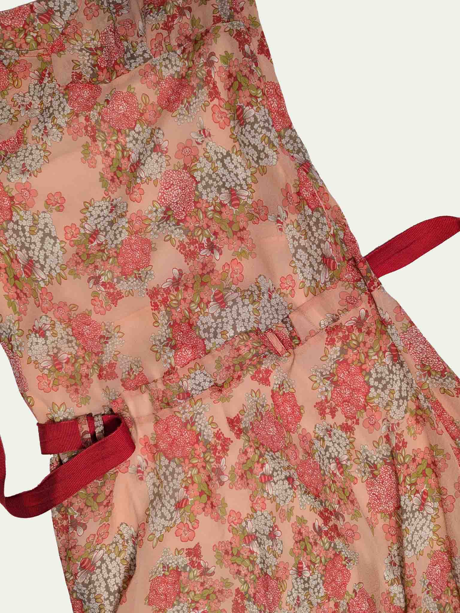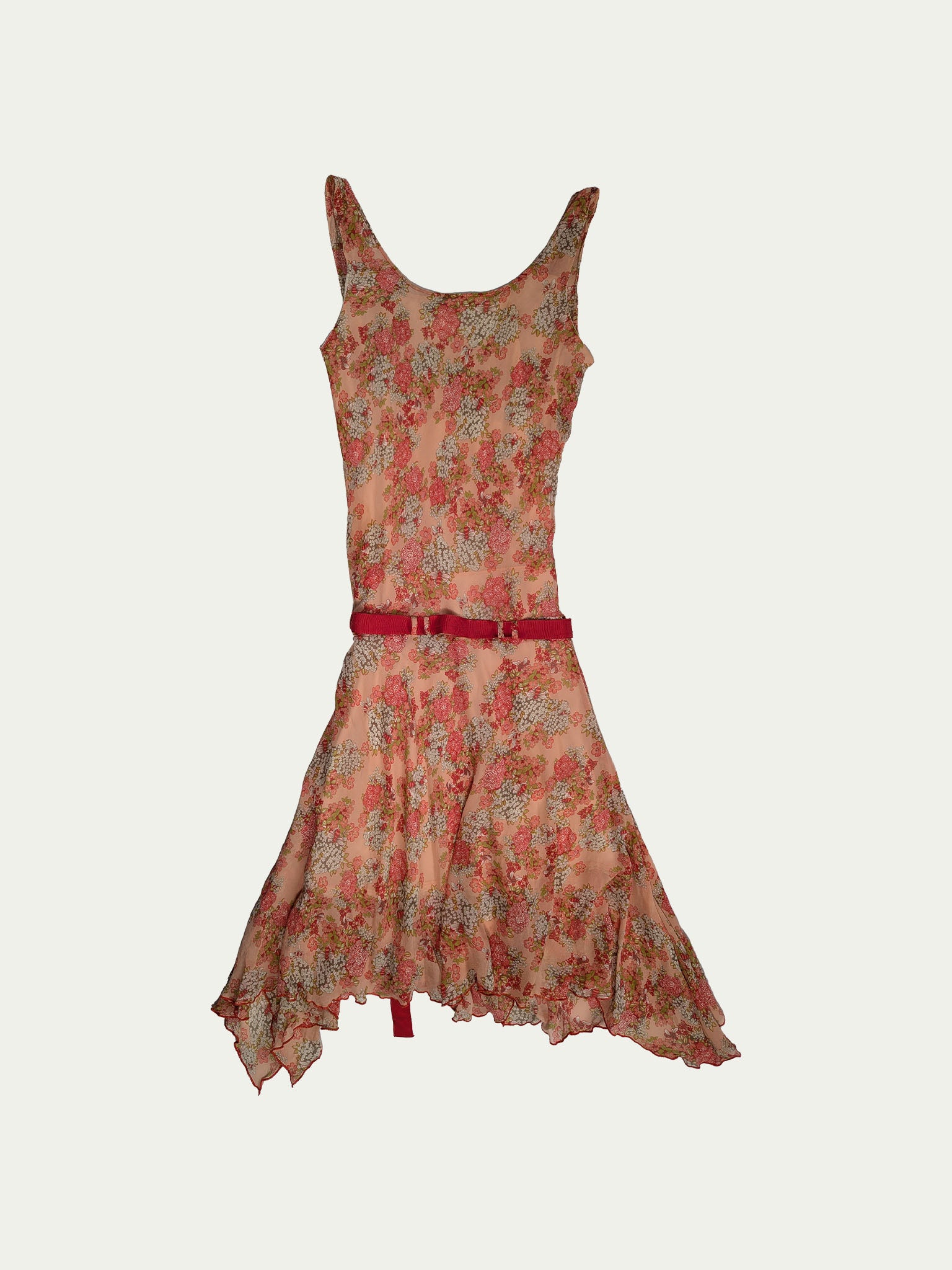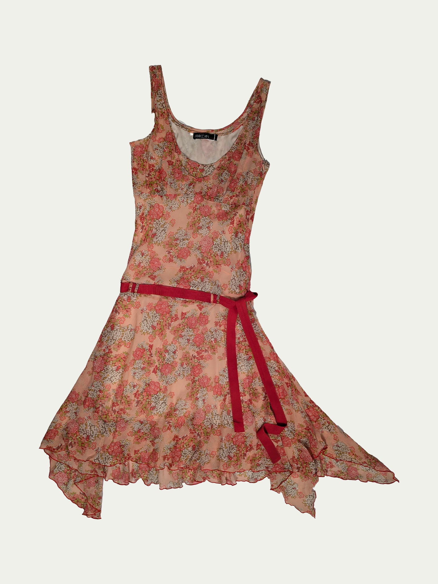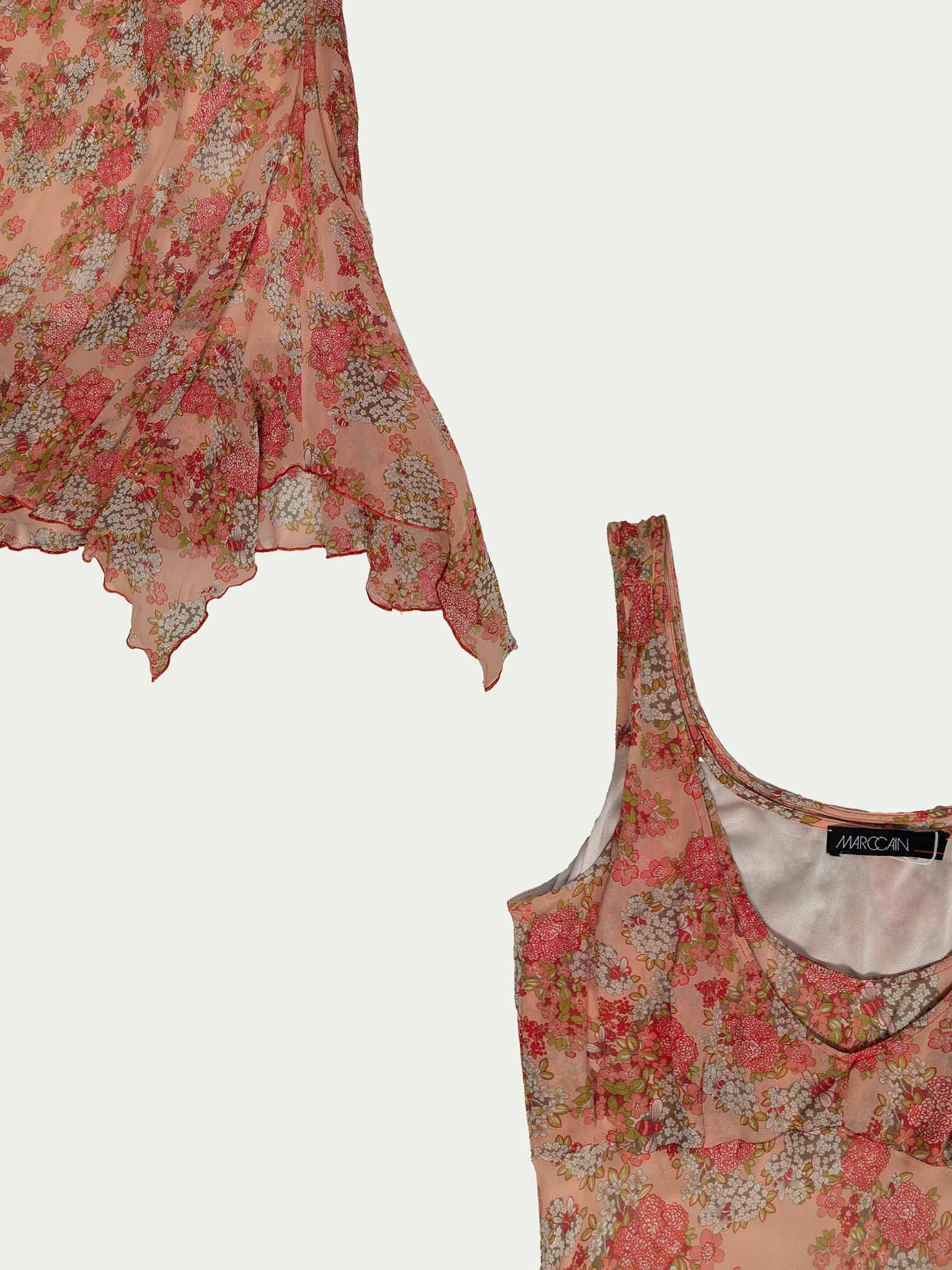 Y2K Marc Cain asymmetrical silk dress, in pink-peach tones, slightly sheer with a mini-length creamy opaque lining.