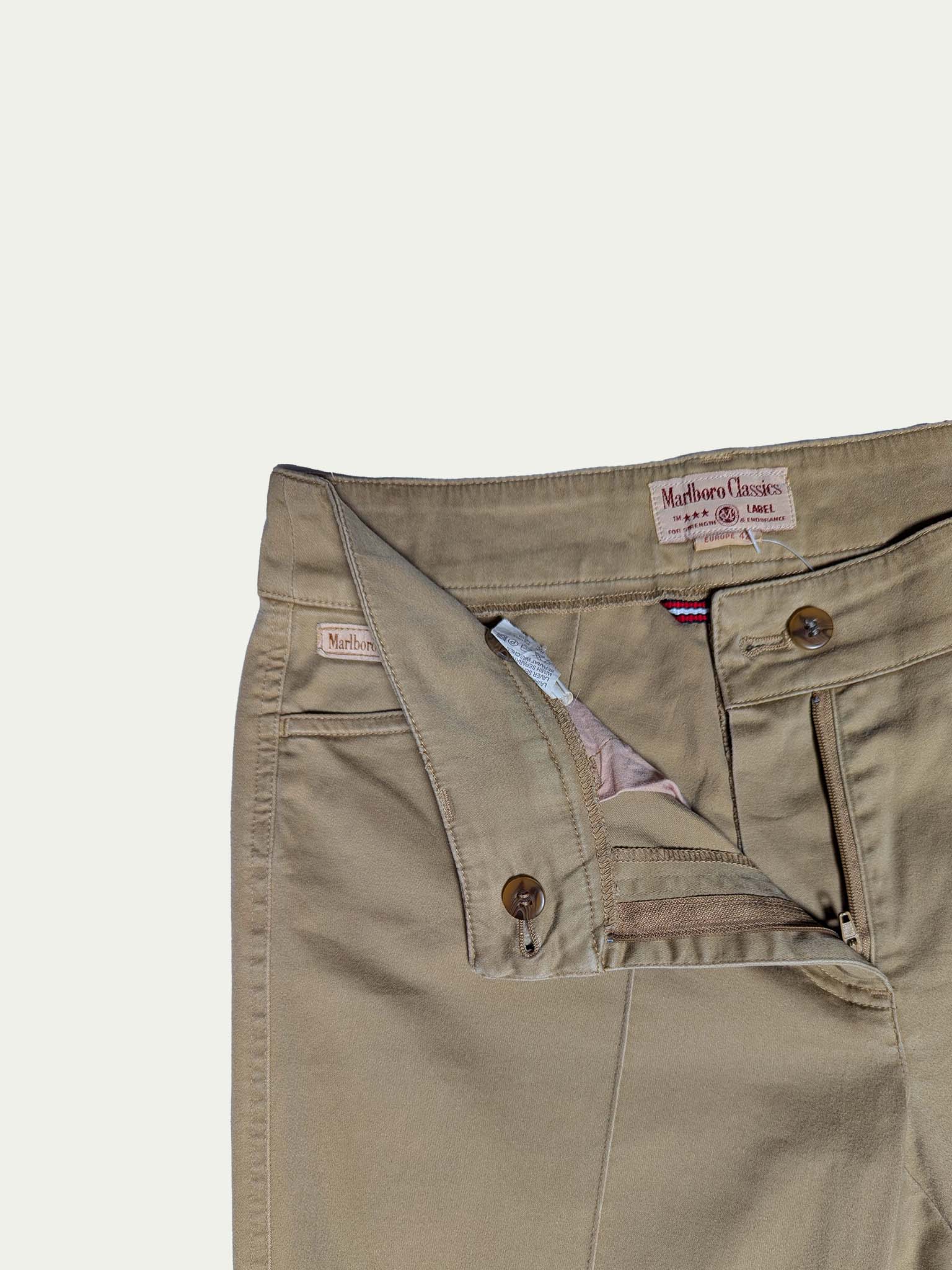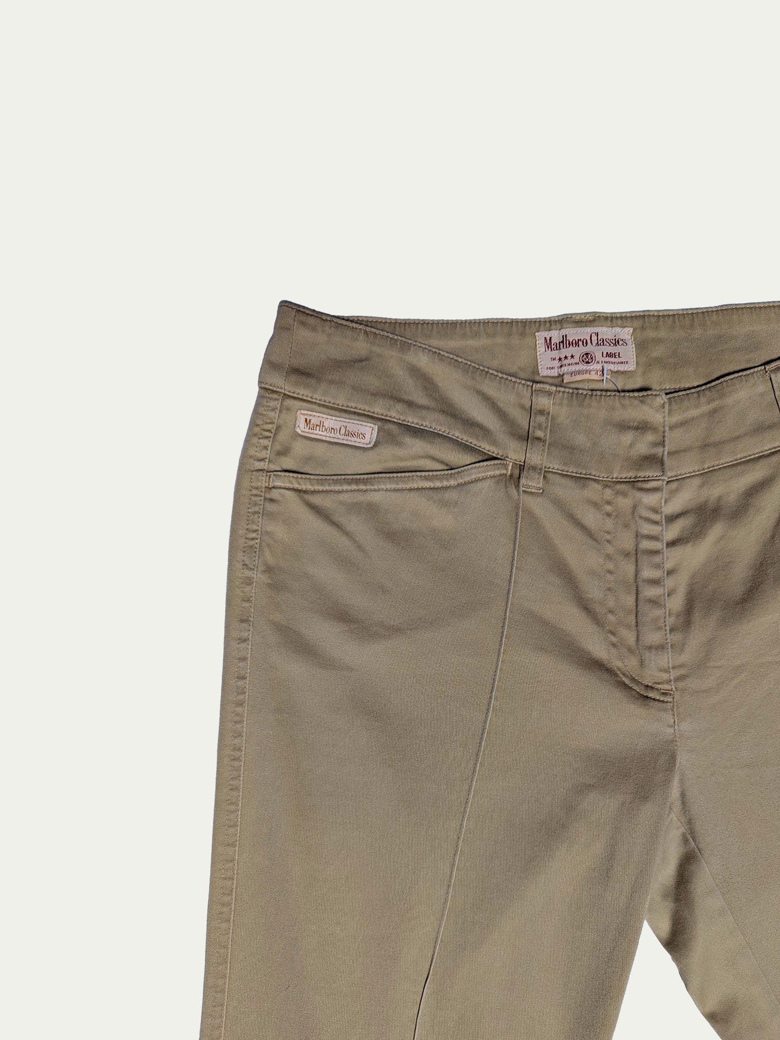 90's Marlboro Classics mid-waisted khaki pants, in a tight gently-flared cut.