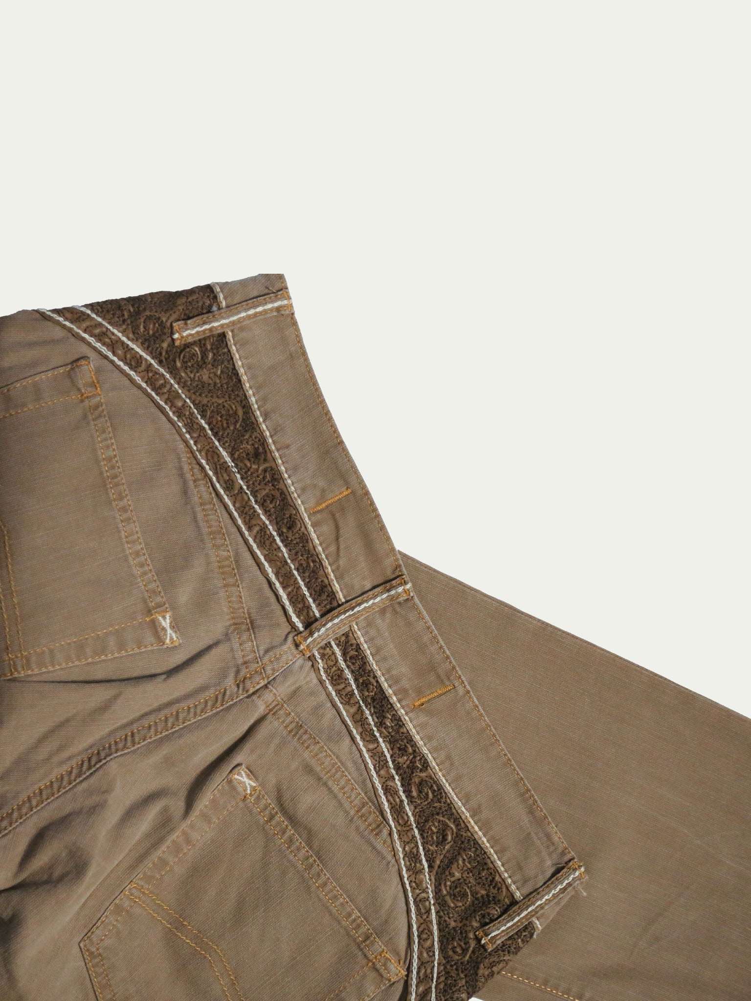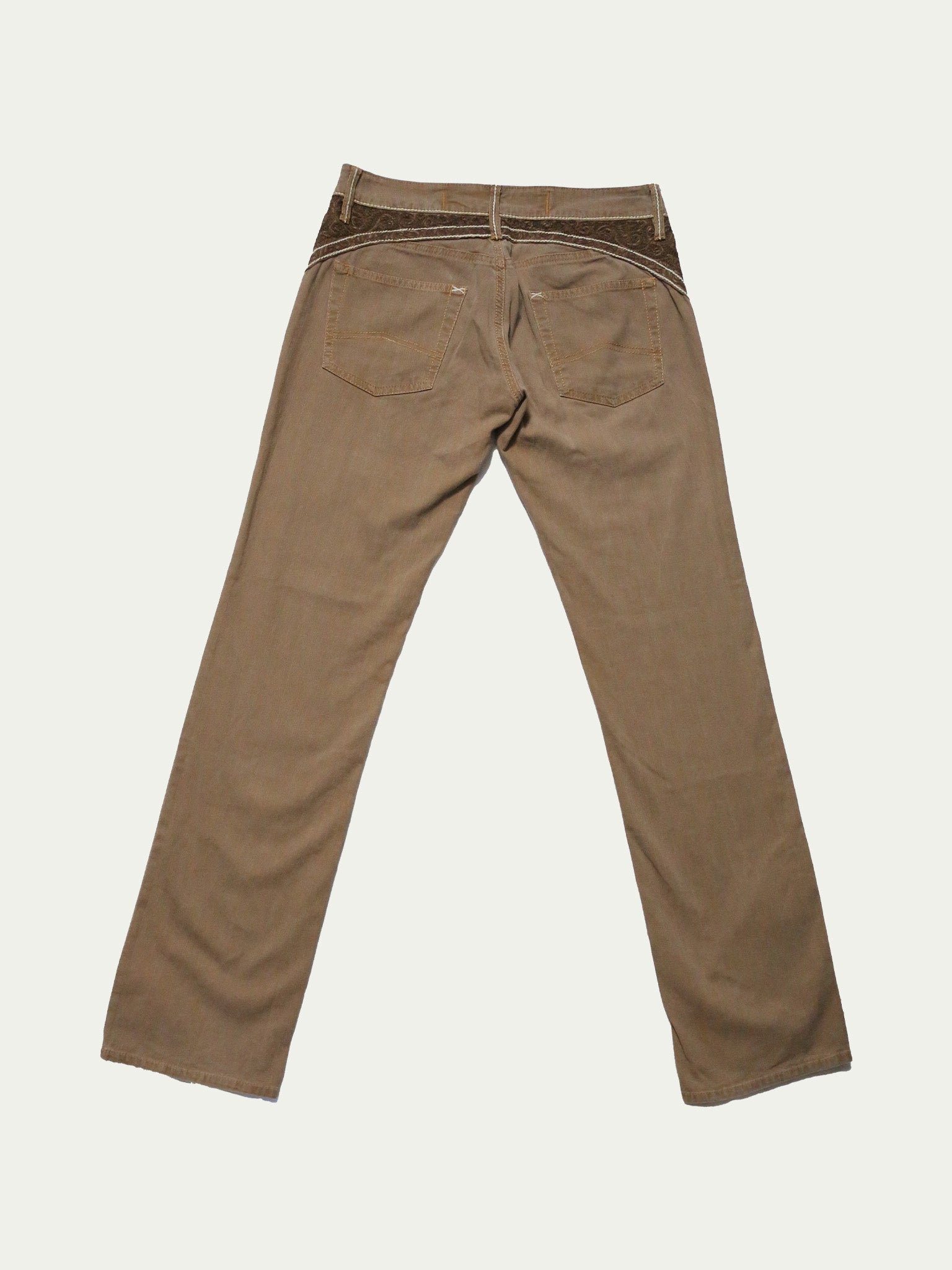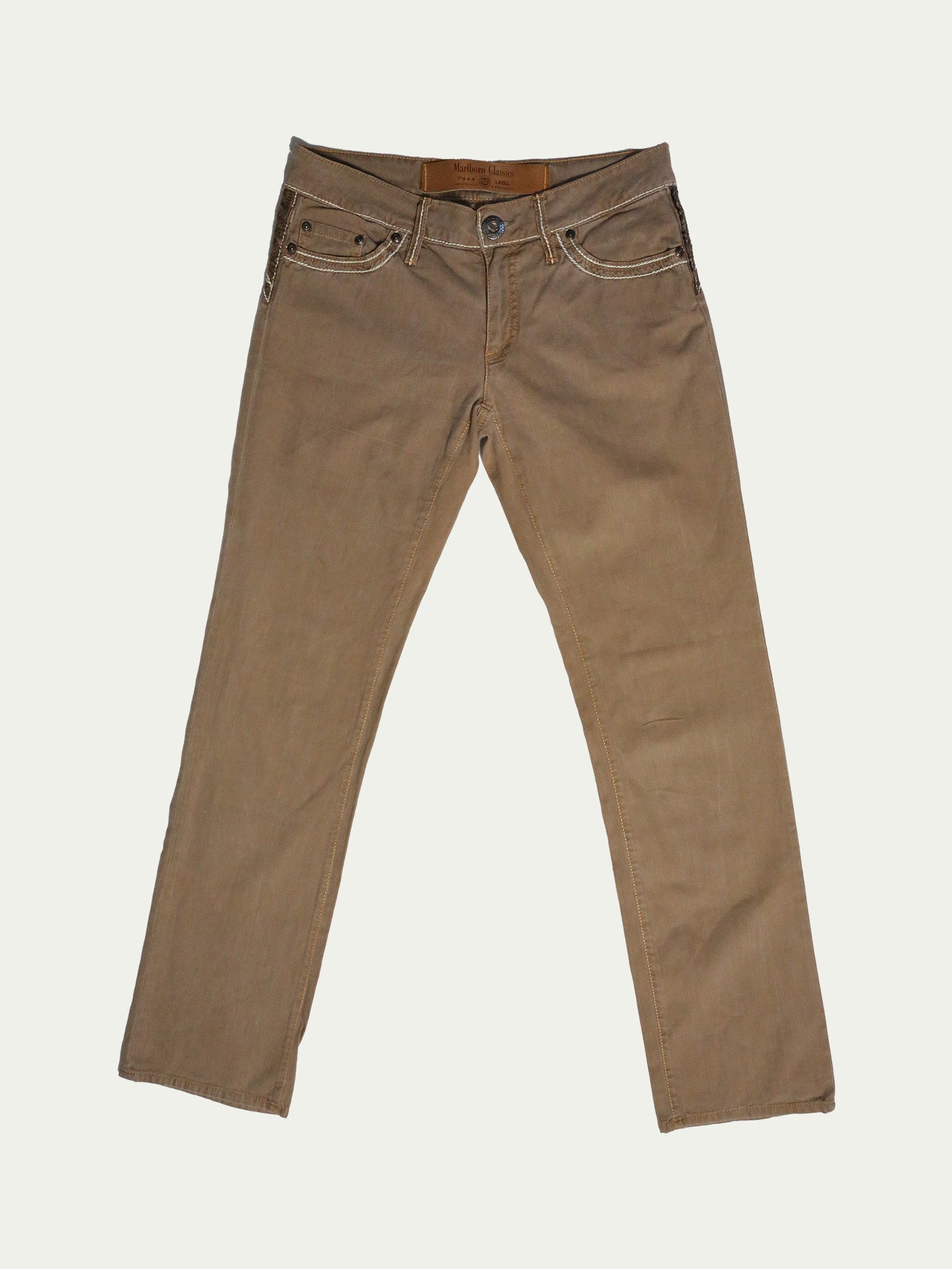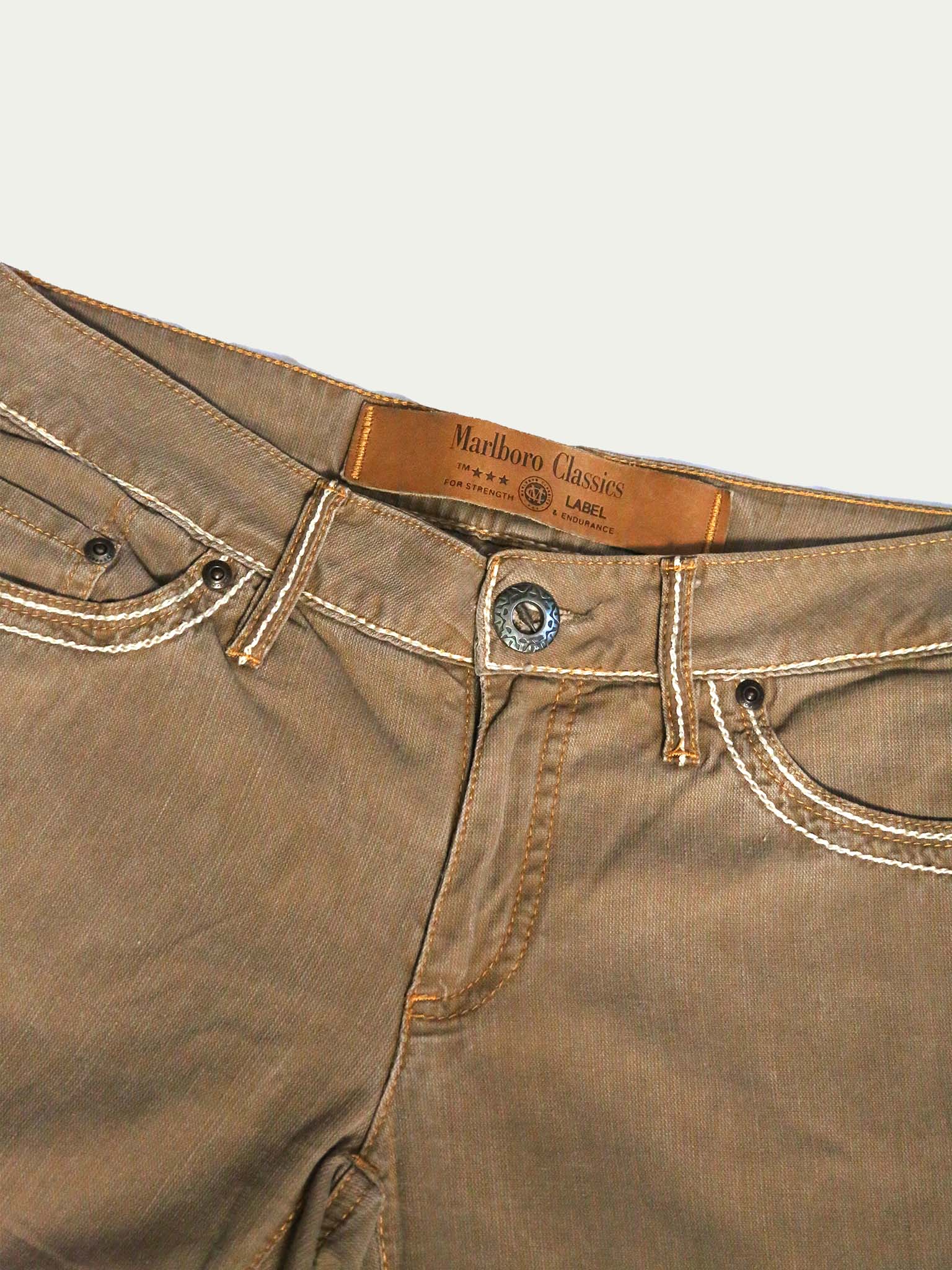 90's Marlboro Classics khaki-brown pants, mid-waist & straight-leg cut, with unique details, typical of this brand, such as the back leather & embroidery application.