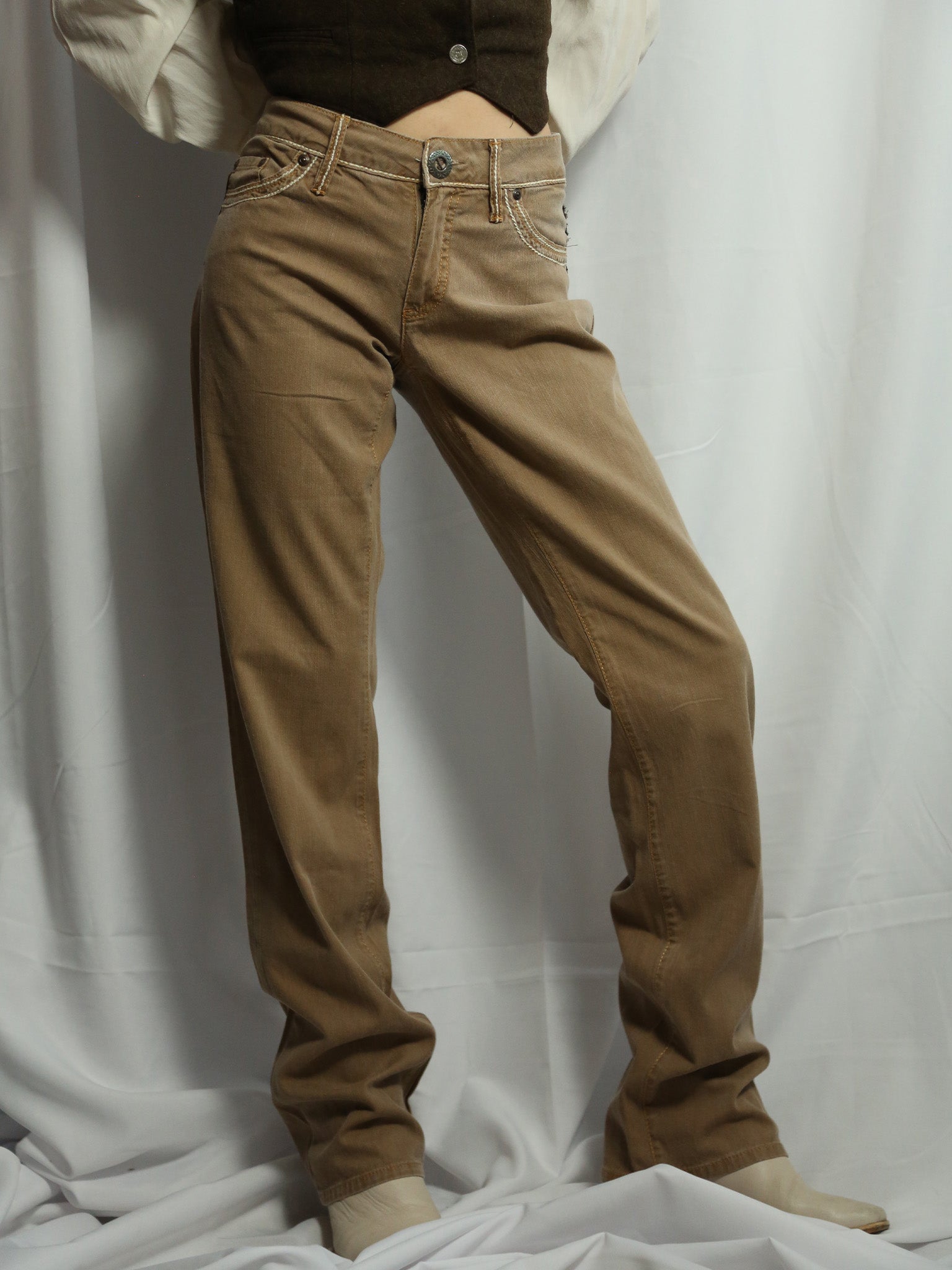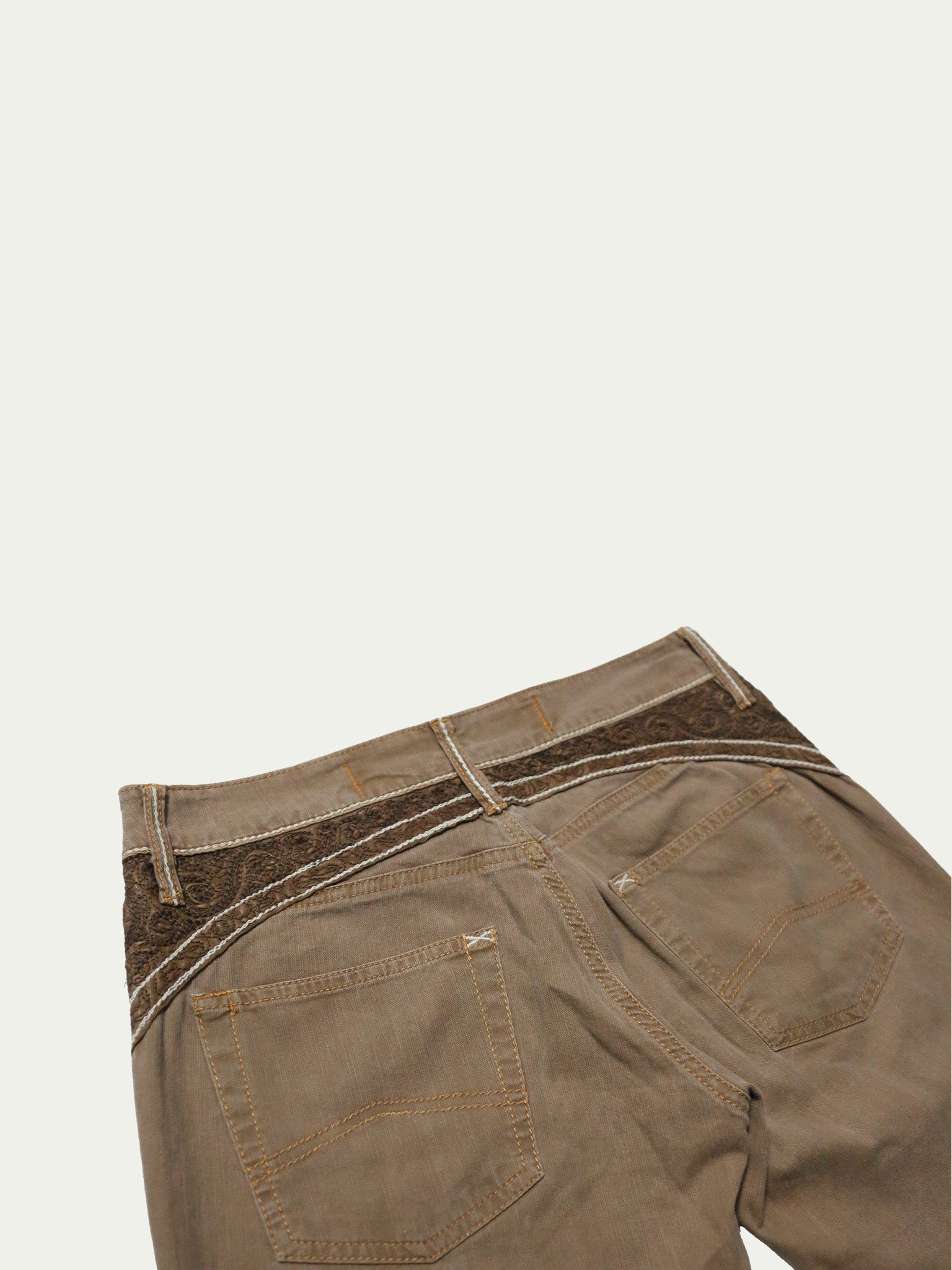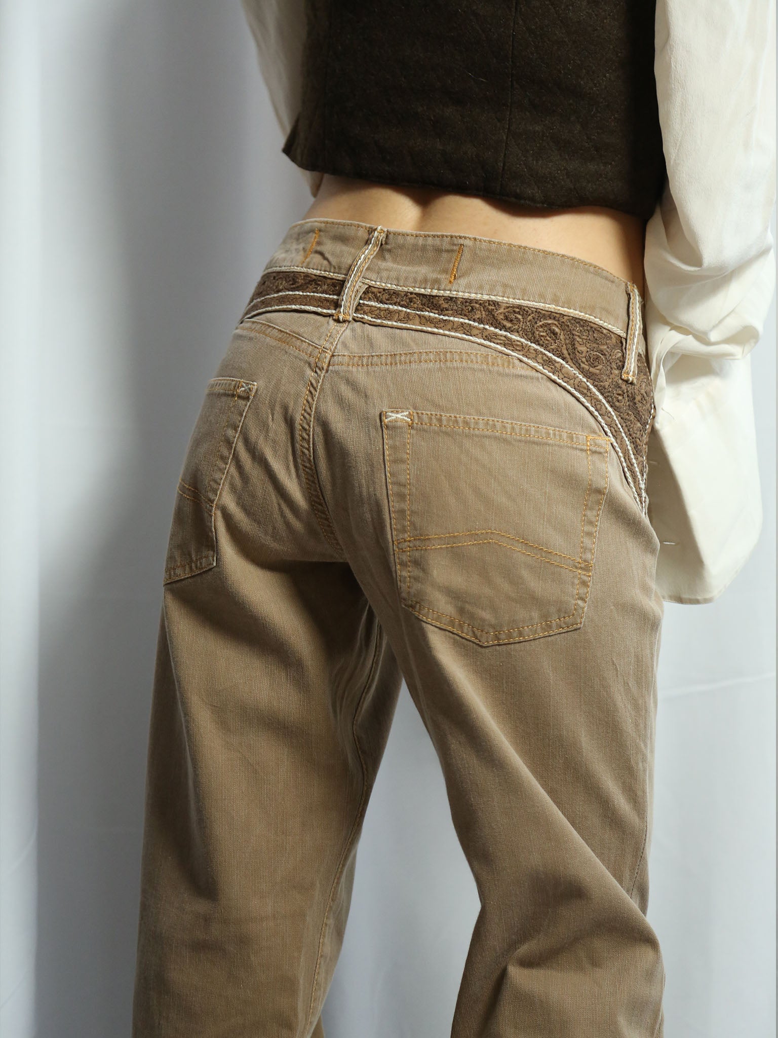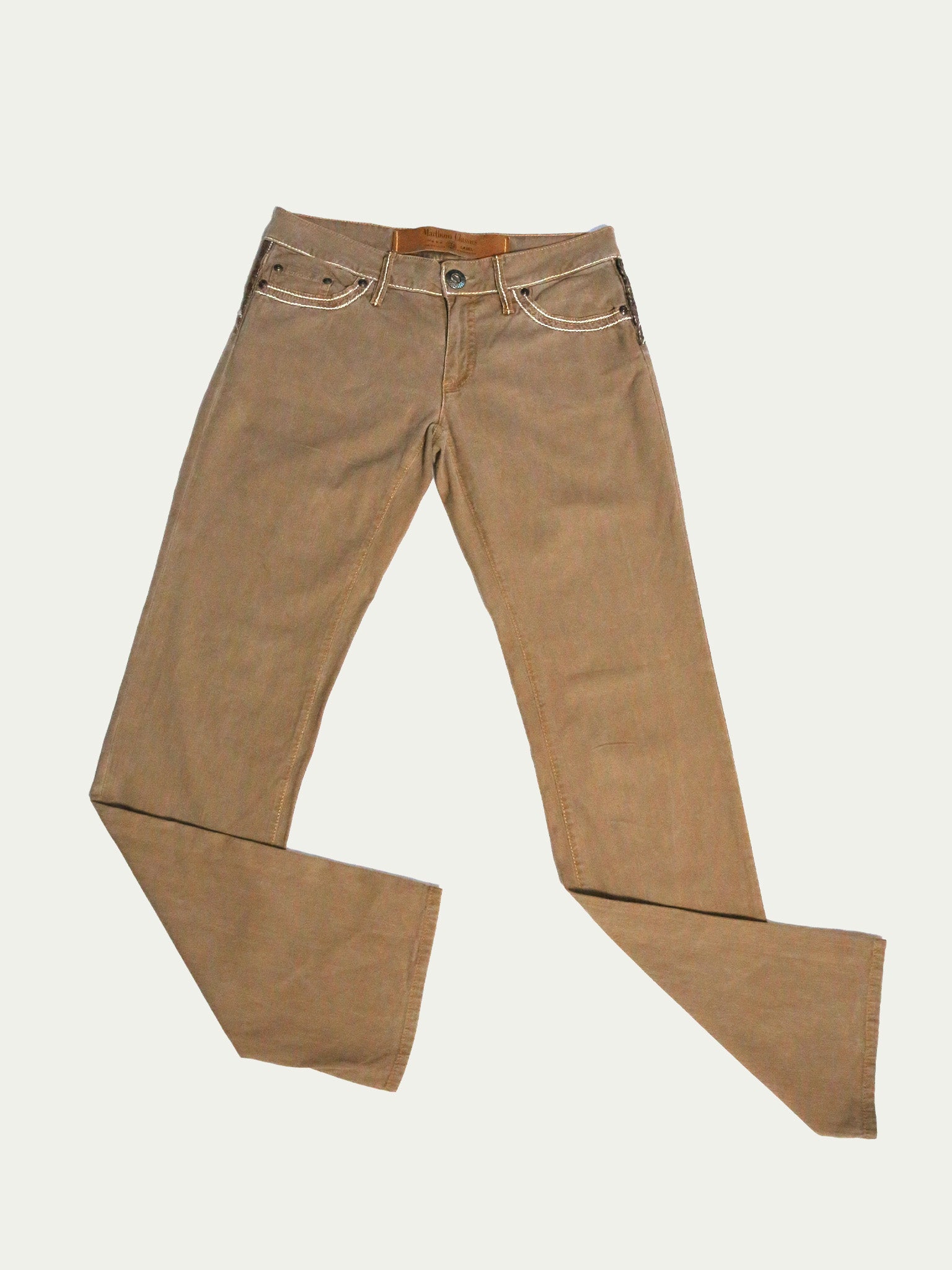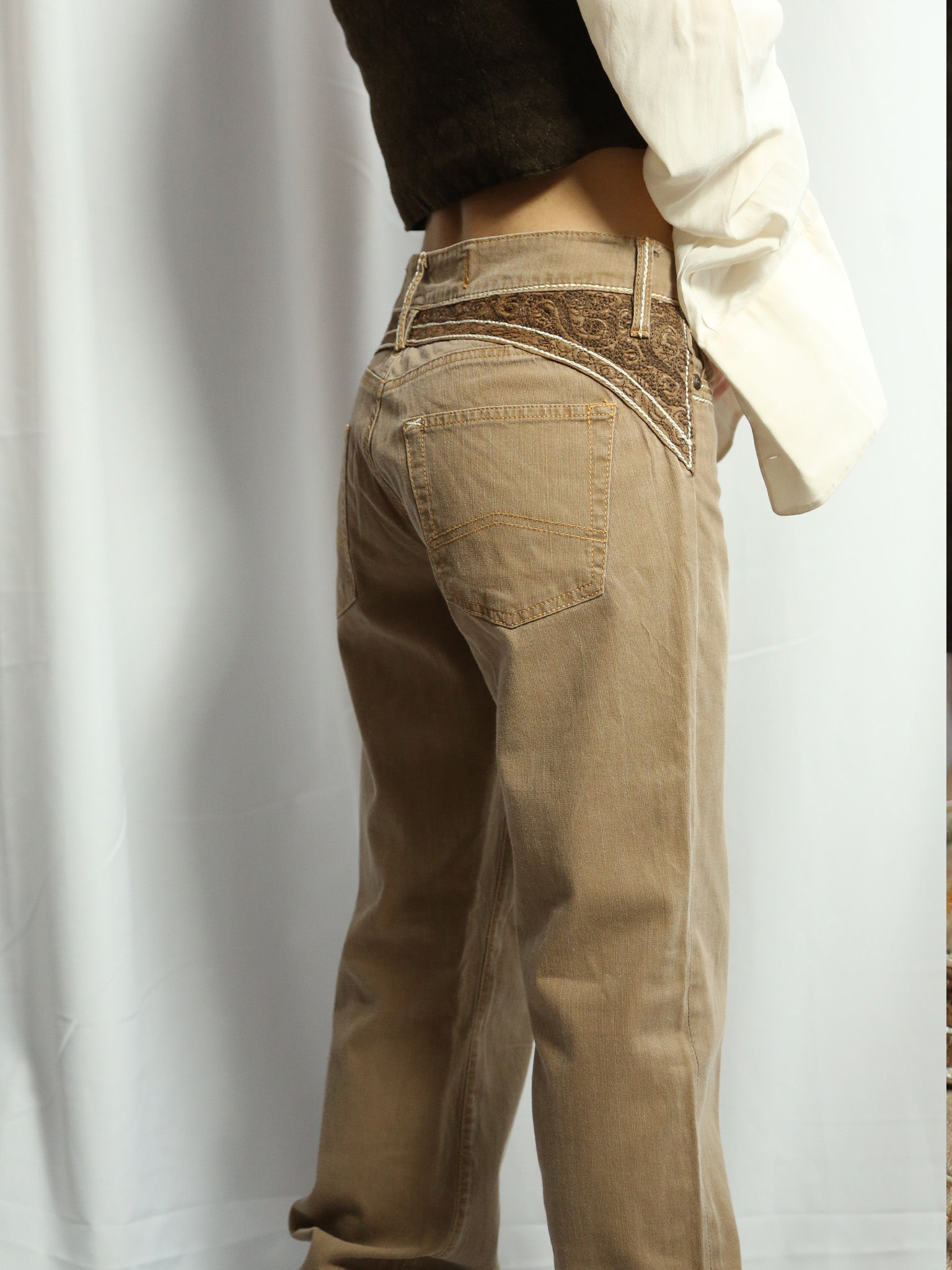 90's Marlboro Classics khaki-brown pants, mid-waist & straight-leg cut, with unique details, typical of this brand, such as the back leather & embroidery application.