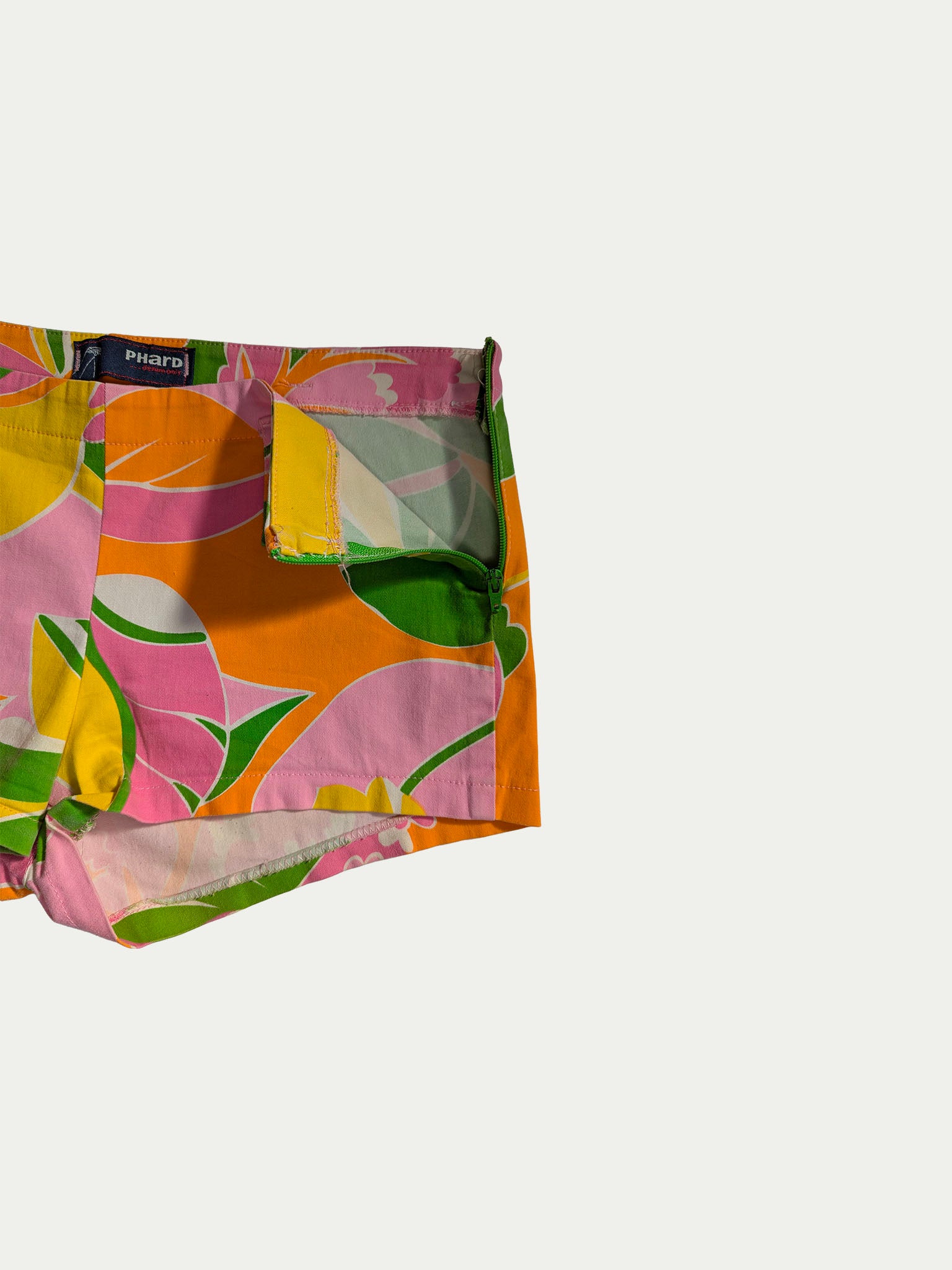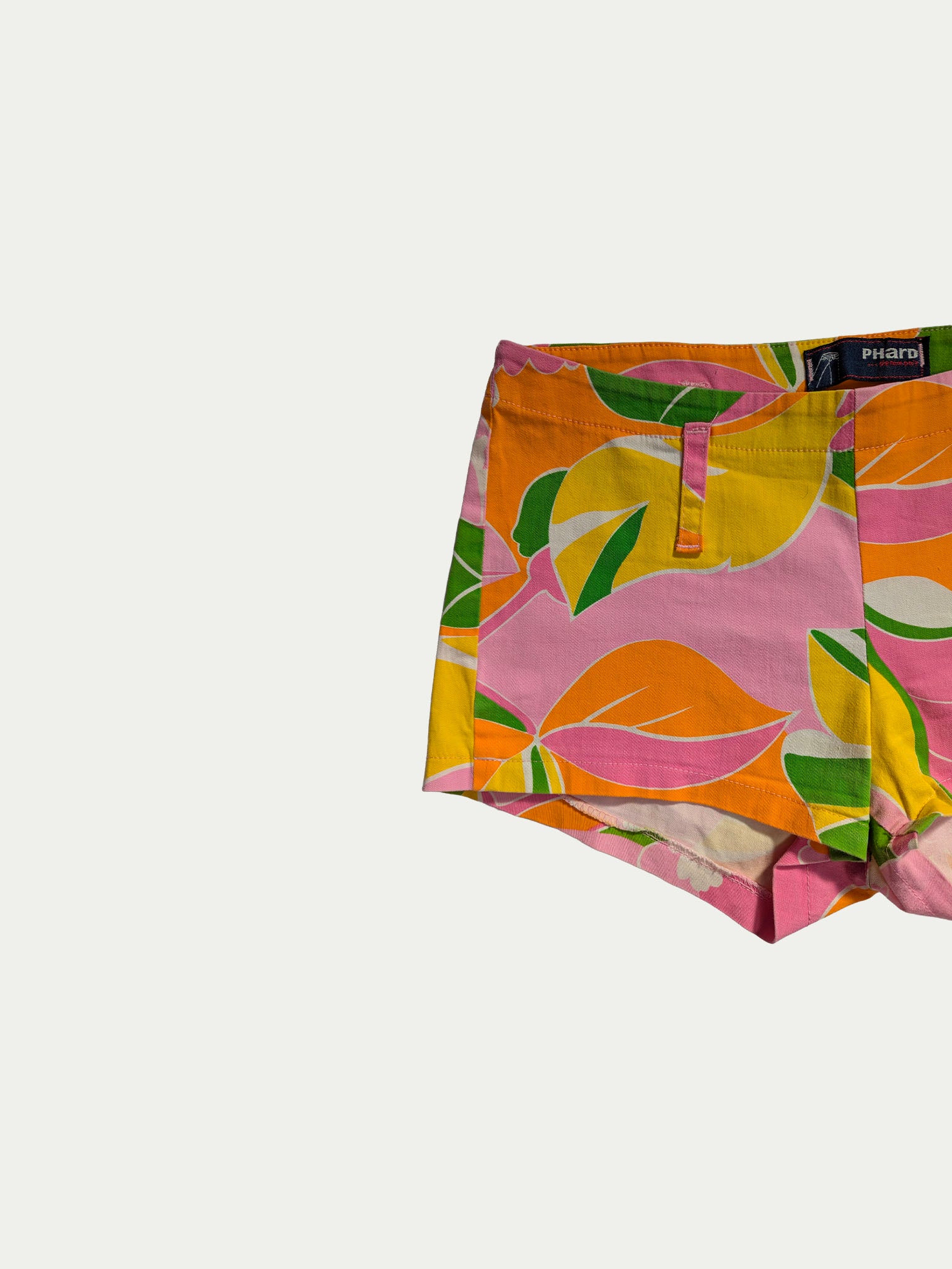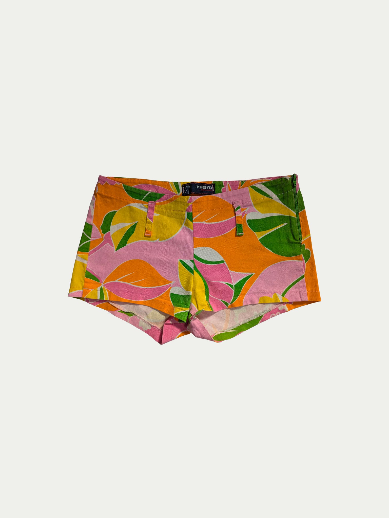 Y2K micro mini shorts with a Hawaiian-style colorful print, low waisted, crafted from elastic cotton-lycra for a snug and playful fit. Designed with wide belt loops and a side zipper closure.