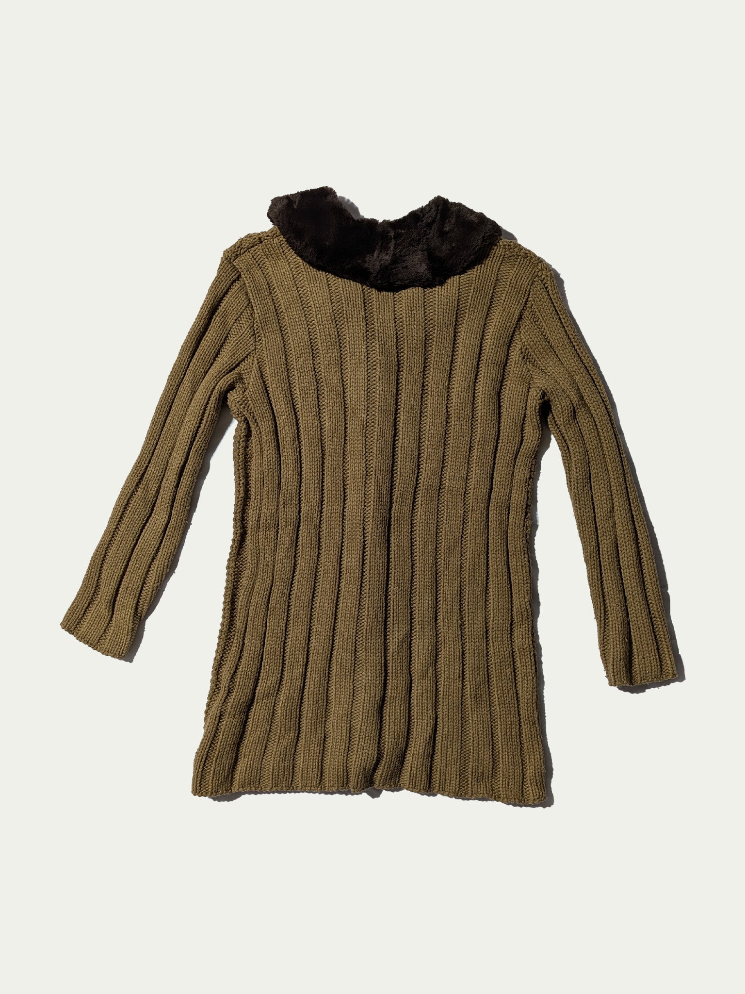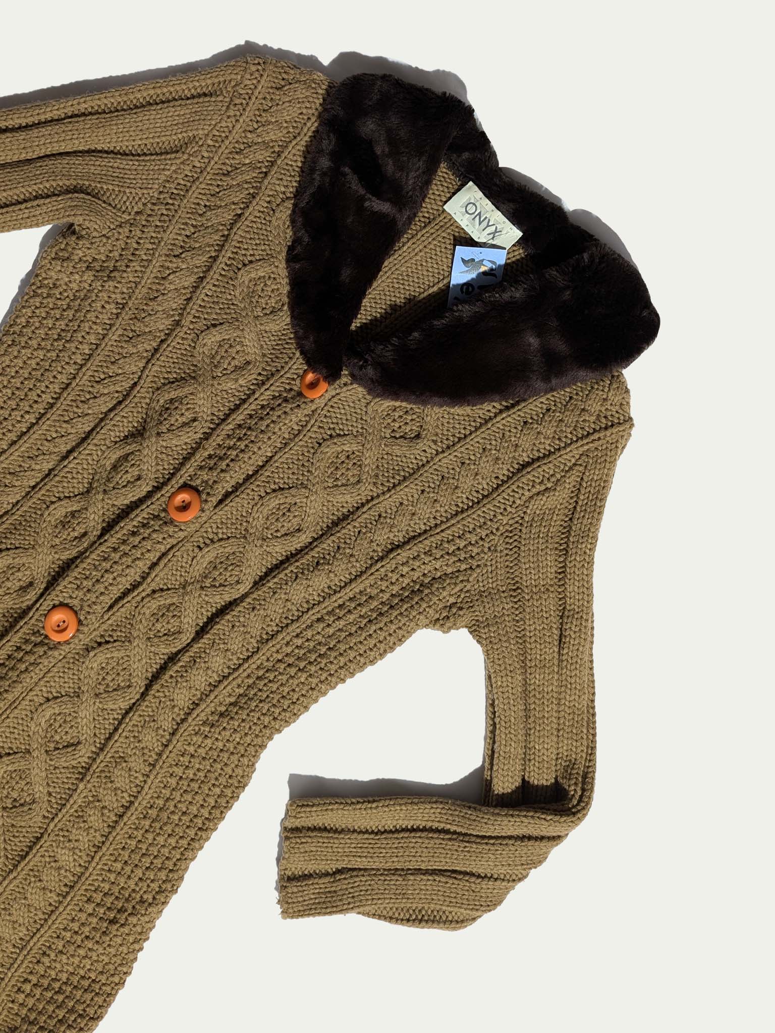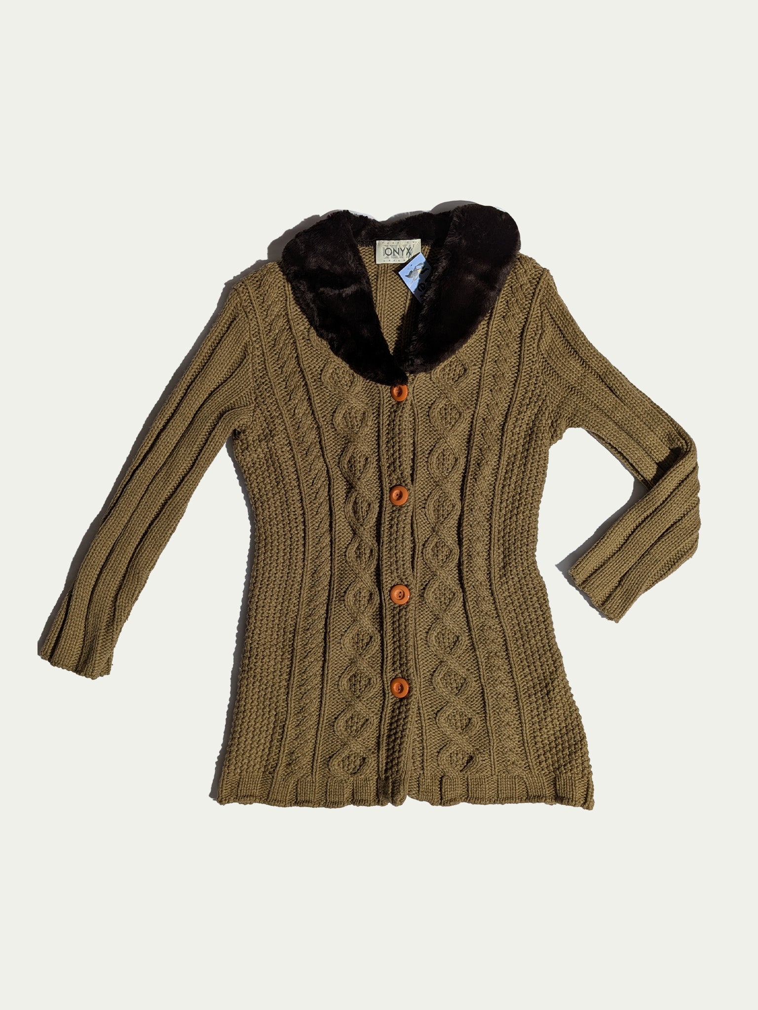 Y2K Onyx long knitted cardigan, with a fur-like collar, 2 front packets and a buttons closure.