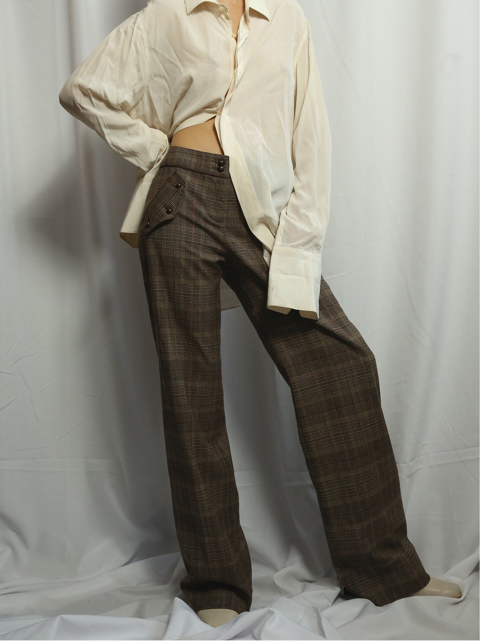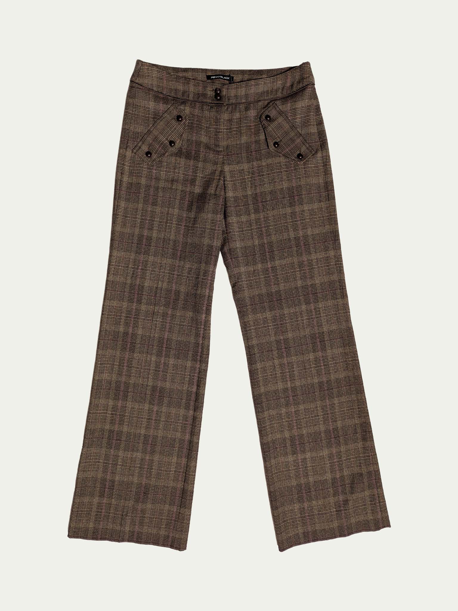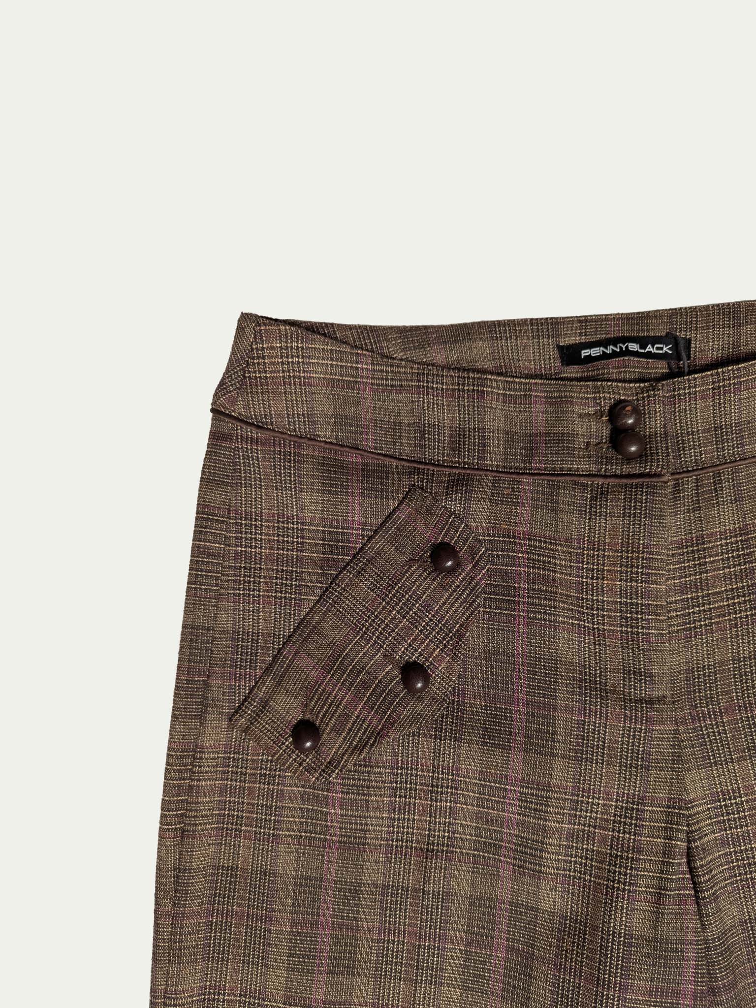 Penny Black Y2K plaid pants, in a wide straight-leg low/mid-waist cut, with round metal buttons details.