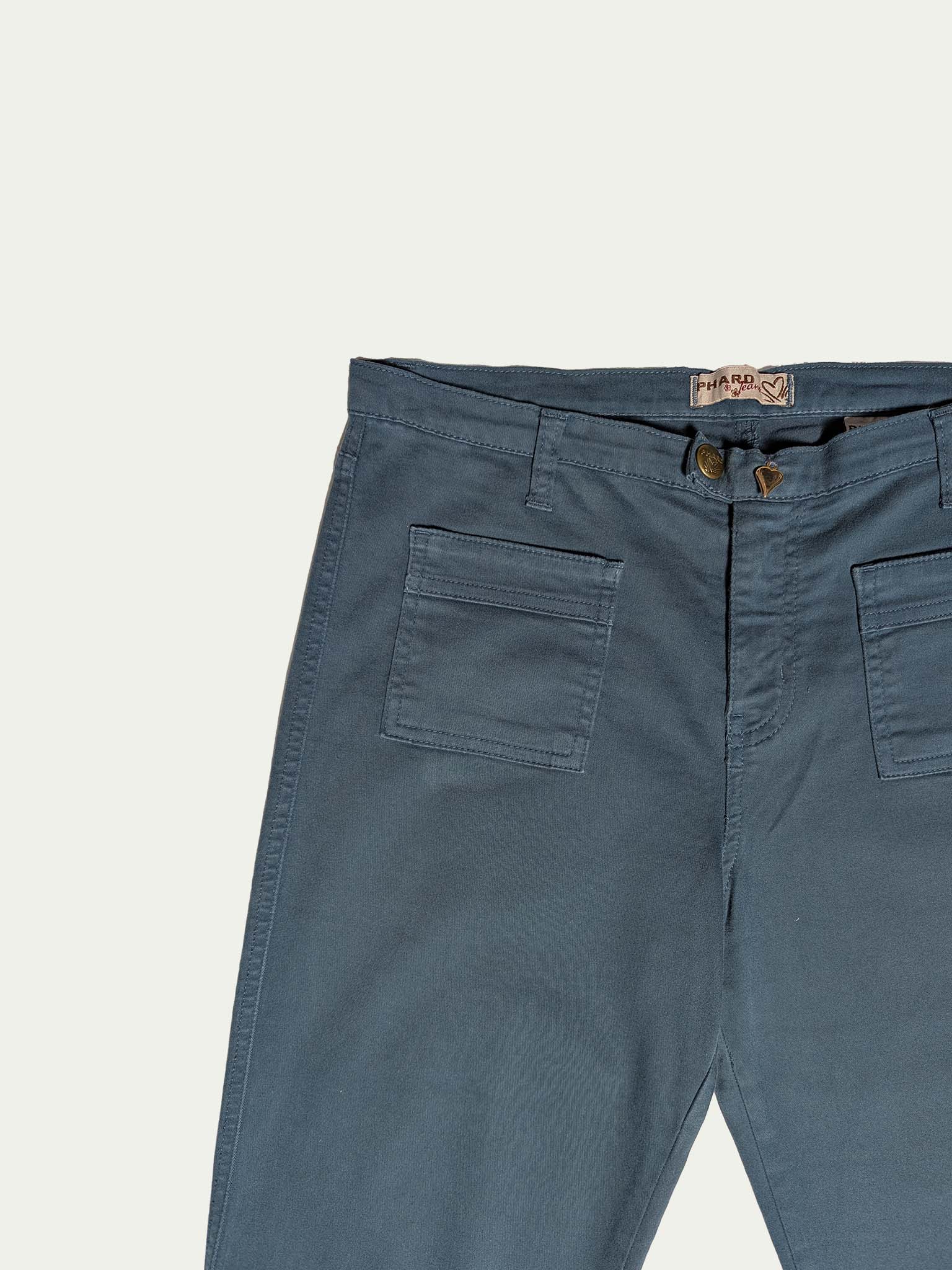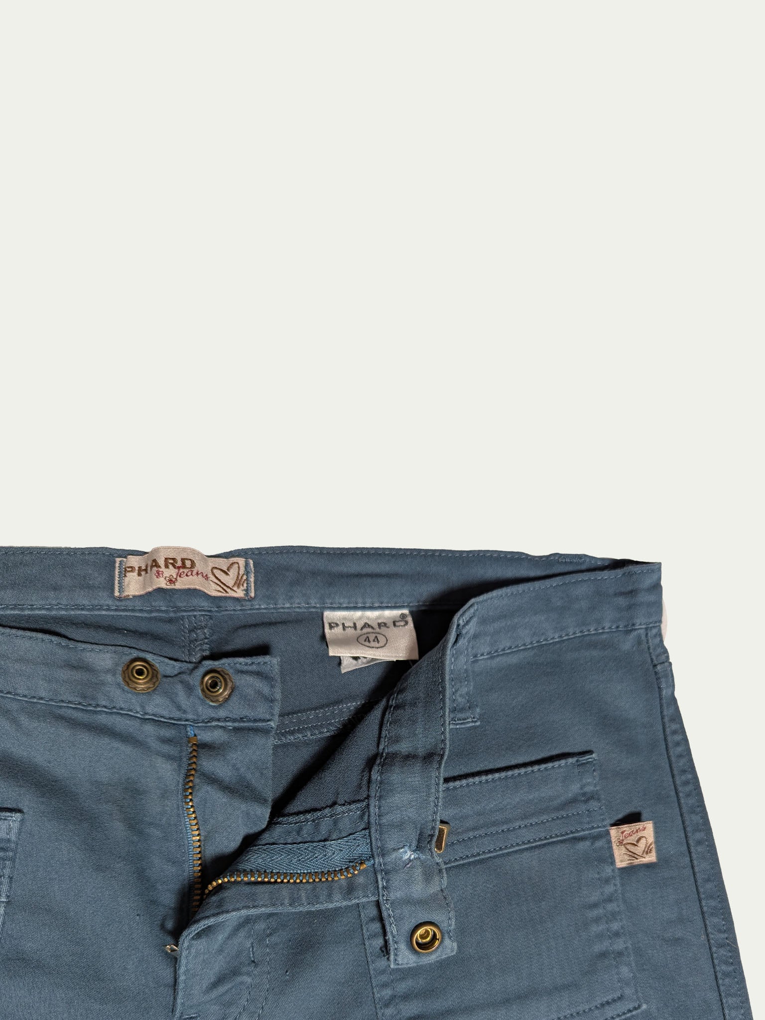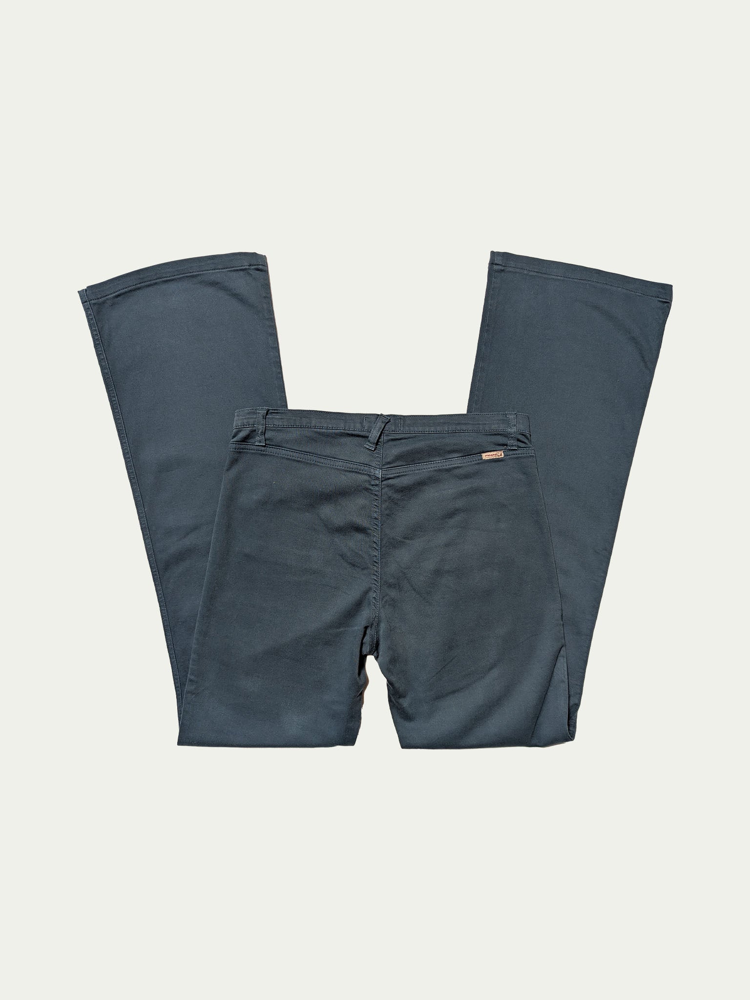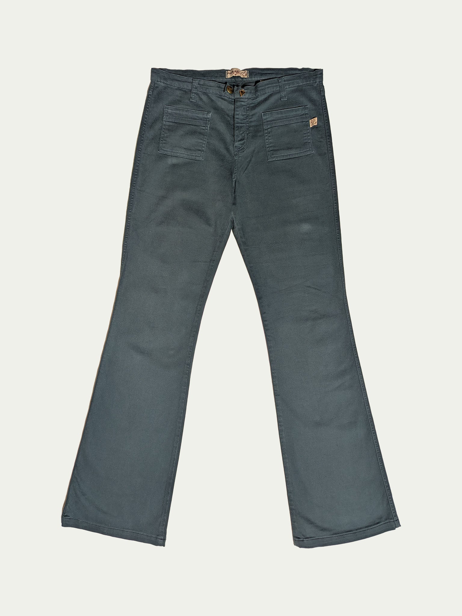 Phard Y2K mid-waisted flared pants, in a dark smokey turquoise shade.