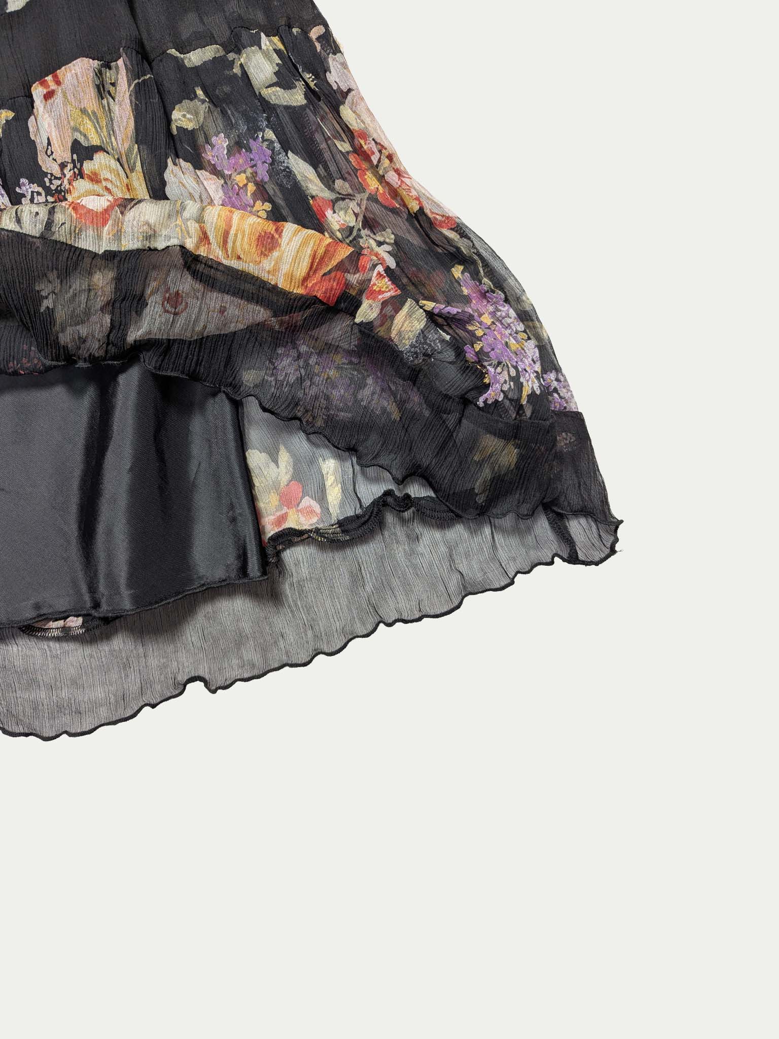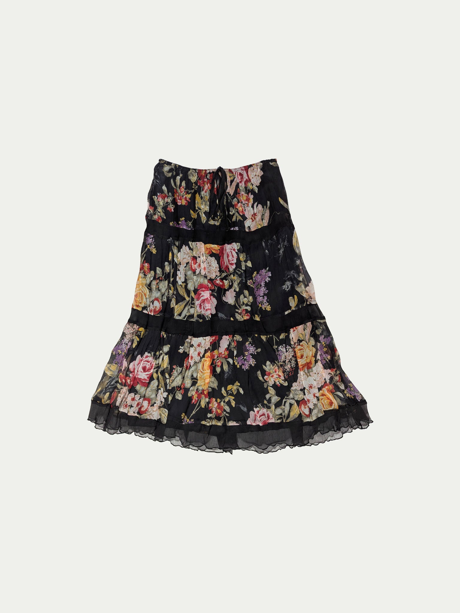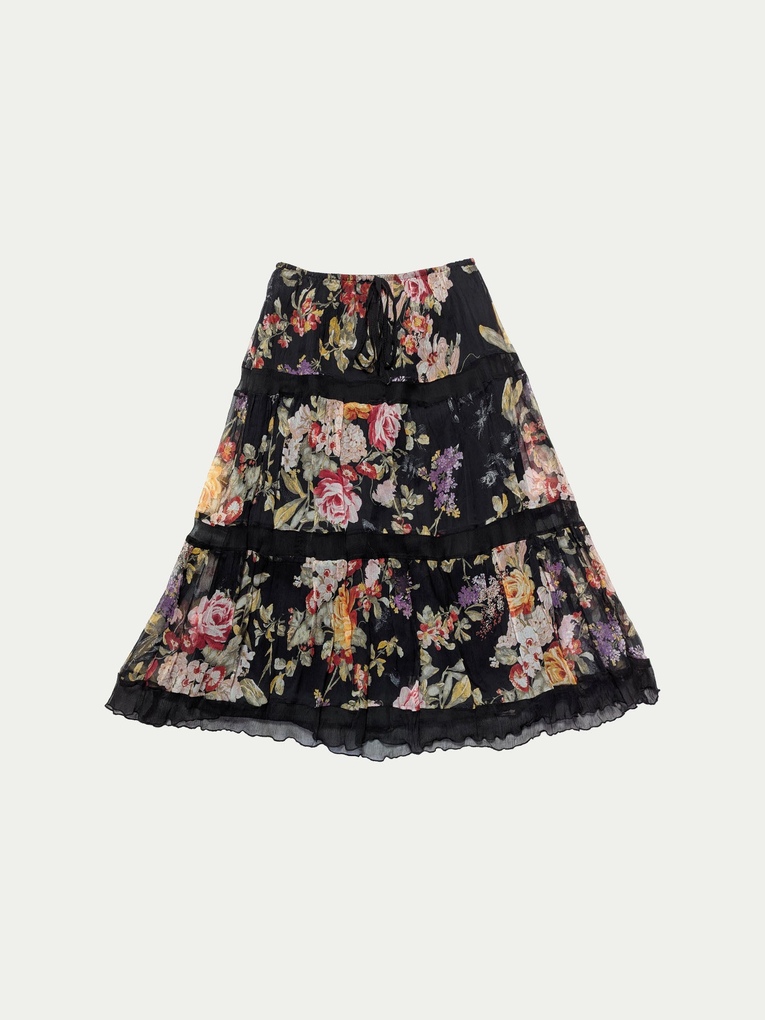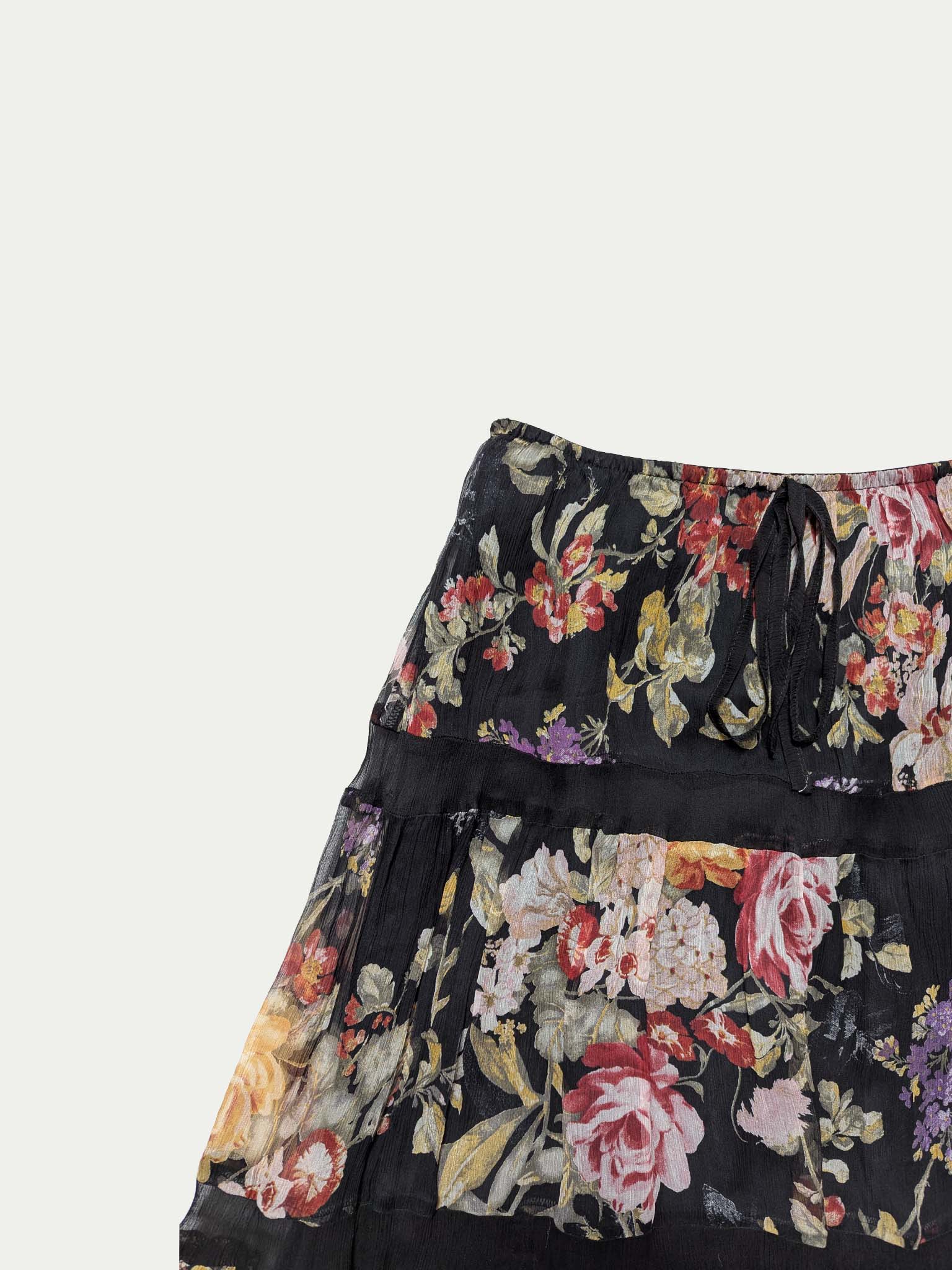 90s tiered maxi skirt with gypsy vibes and a classic timeless floral print. Made of pure silk, with an elastic waist band and laces, full of fabric, Sheer with an opaque lining. an amazing romantic piece in perfect condition.