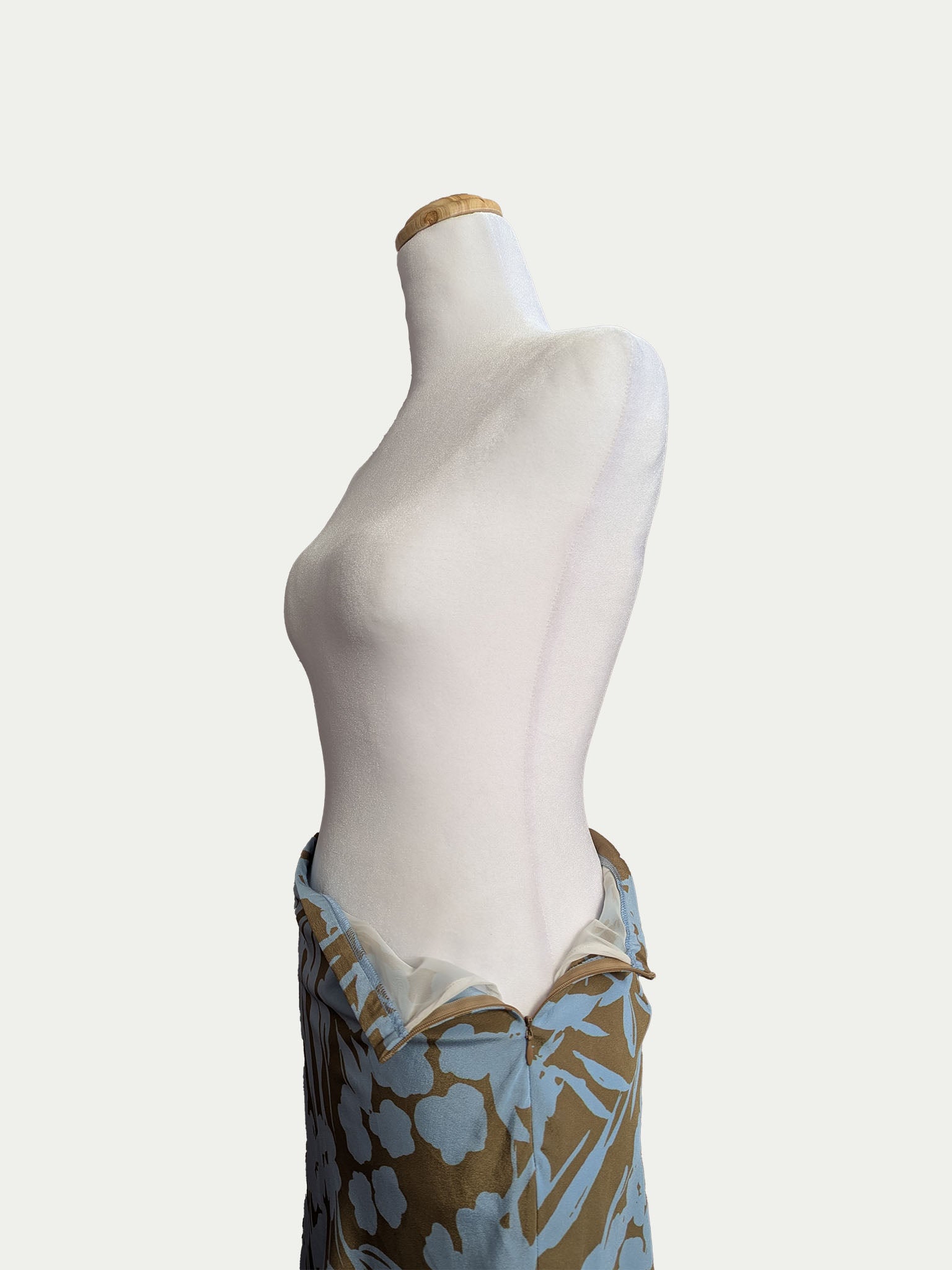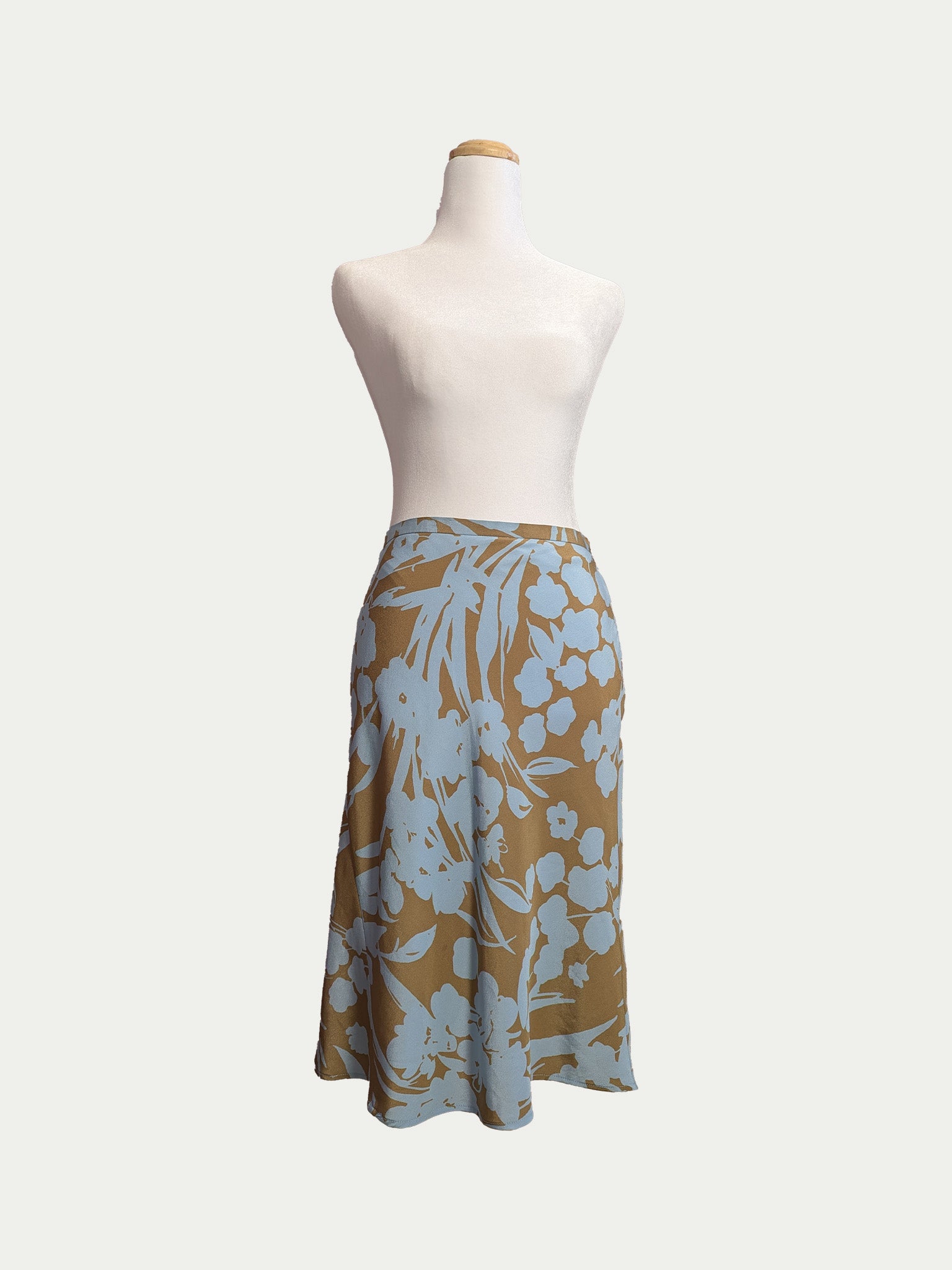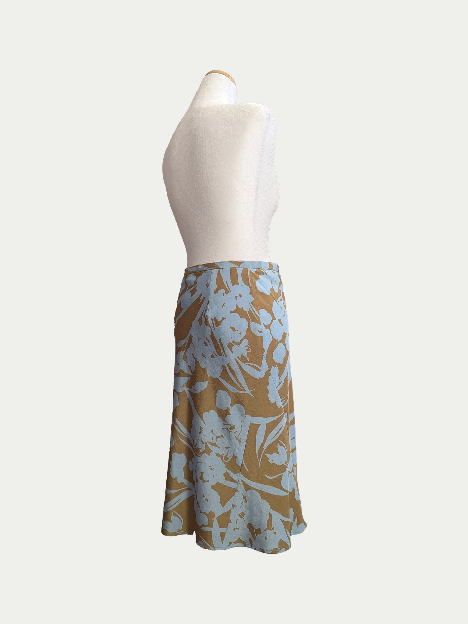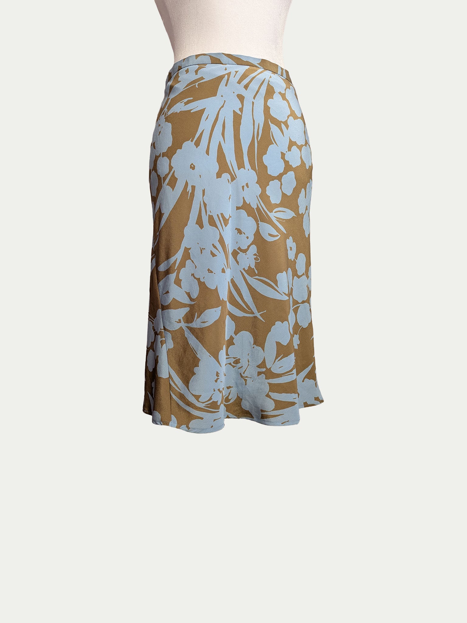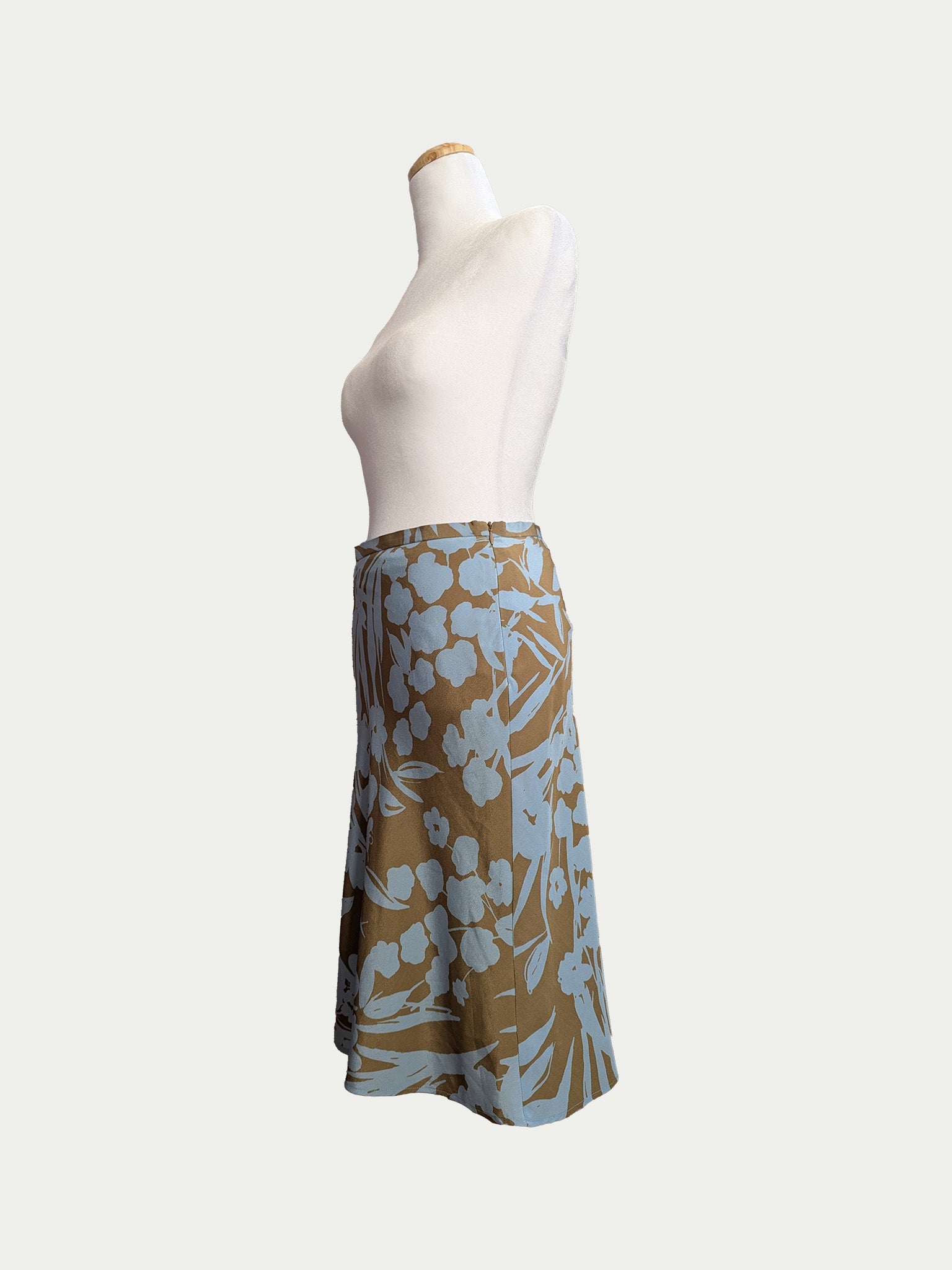 Early 2000s Stefanel midi skirt - classic and elegant, featuring a unique floral two-tone print in sky blue and subtle khaki-brown. Made of high-quality polyester with a soft silk-like touch and gentle sheen. Side hidden zipper closure. Includes an extra thin, sheer white lining.