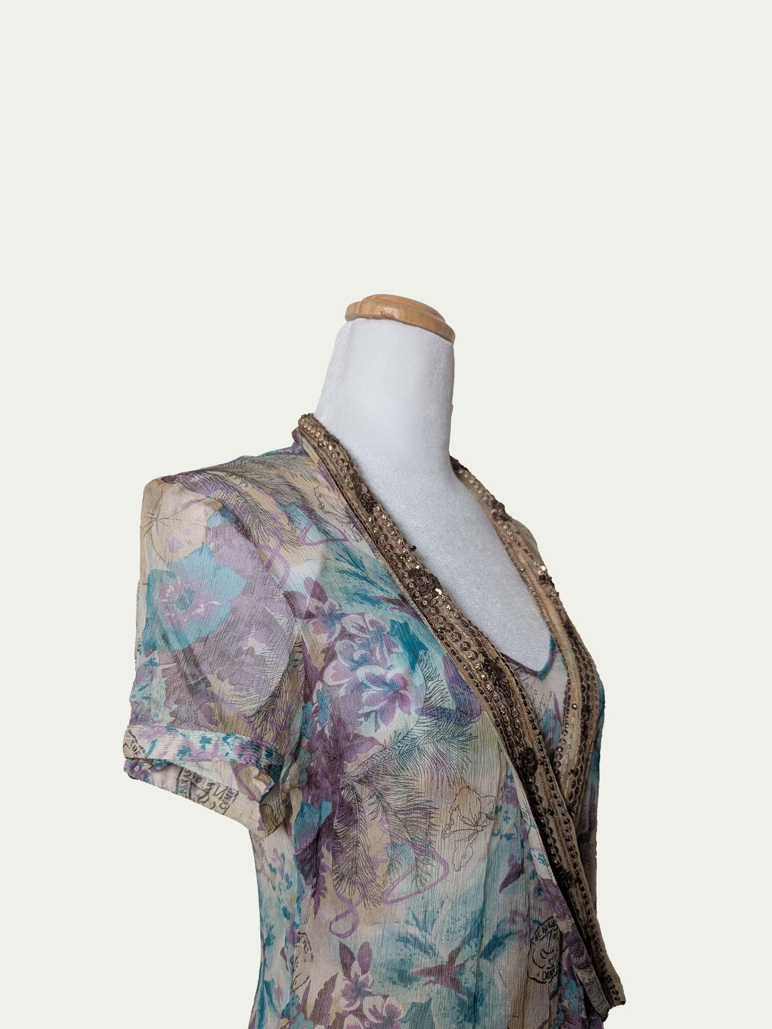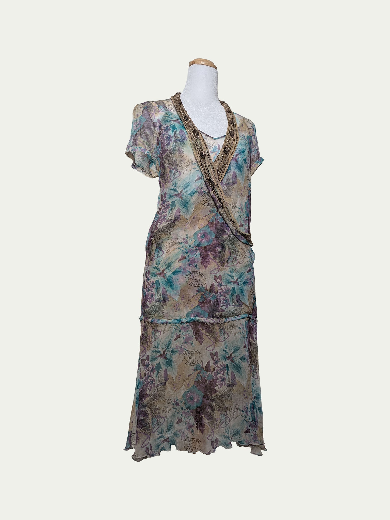 Early 2000s two-part silk dress by Liu-Jo. Features a mini slip lining with a visible silk chest part and a hidden polyester skirt for opacity. The outer dress is designed in a 1920s-inspired fit, with a wrap-shaped chest, trimmed with mesh, golden metal beads, and sequins. Low-waist lacing and a loose fit.