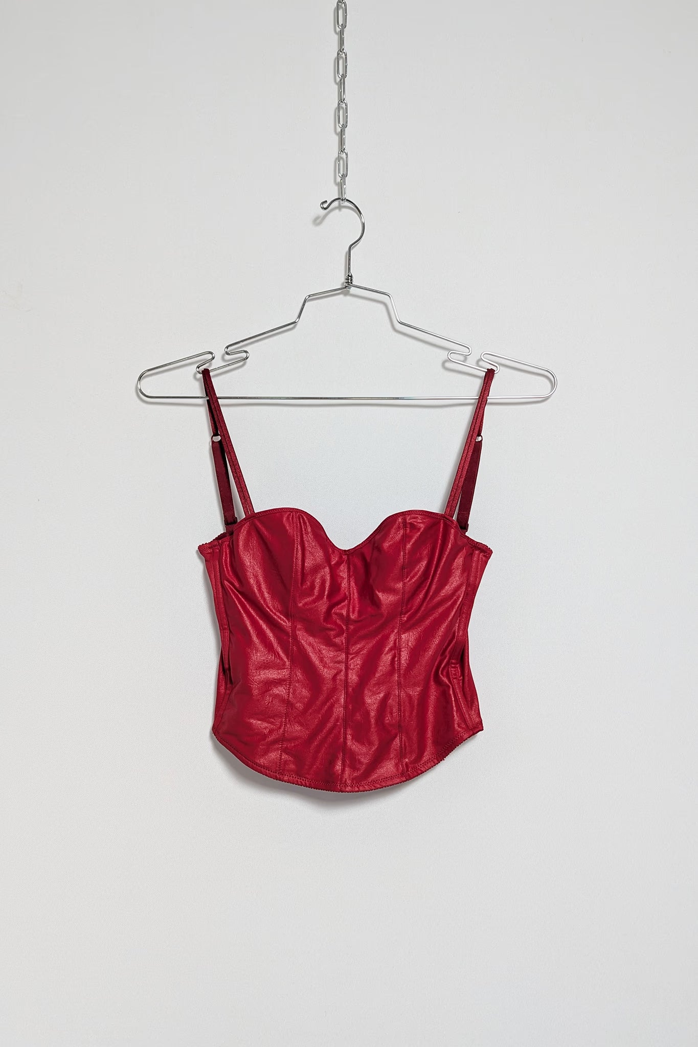 90s red leather-like textured corset with a cotton lining, adjustable straps, and a unique open-back hooks closure with three levels of adjustment. Suitable for cup 70A.