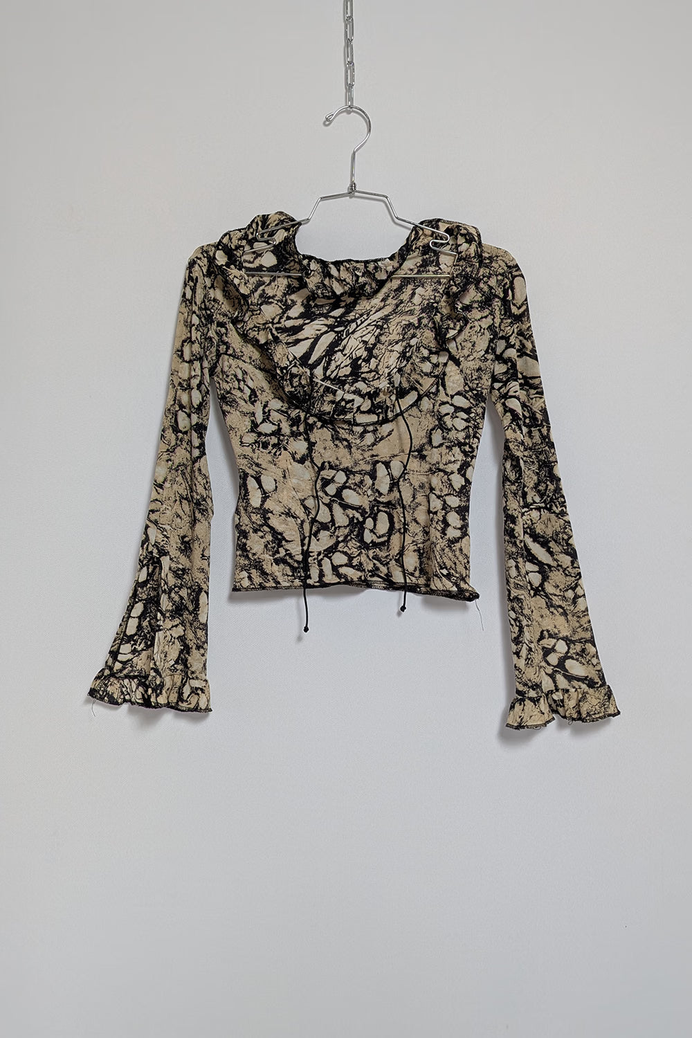 Stretchy ruffled top in an abstract print, designed with cleavage lacing, slitted wide cuffs, and a cropped fit.