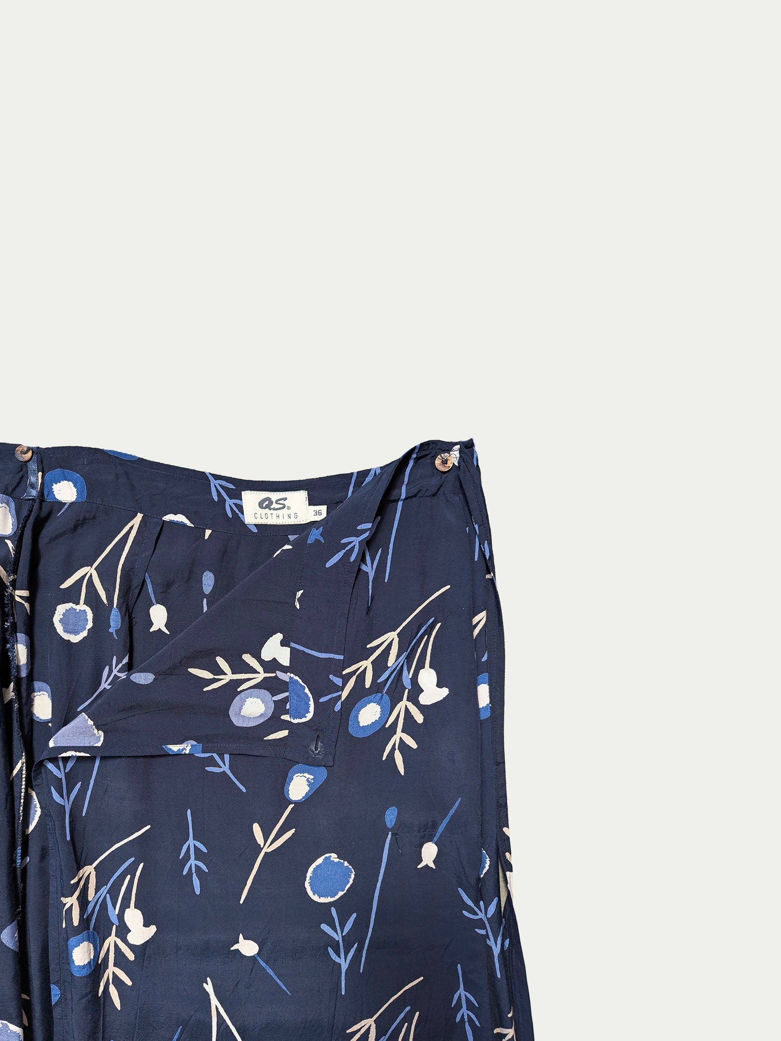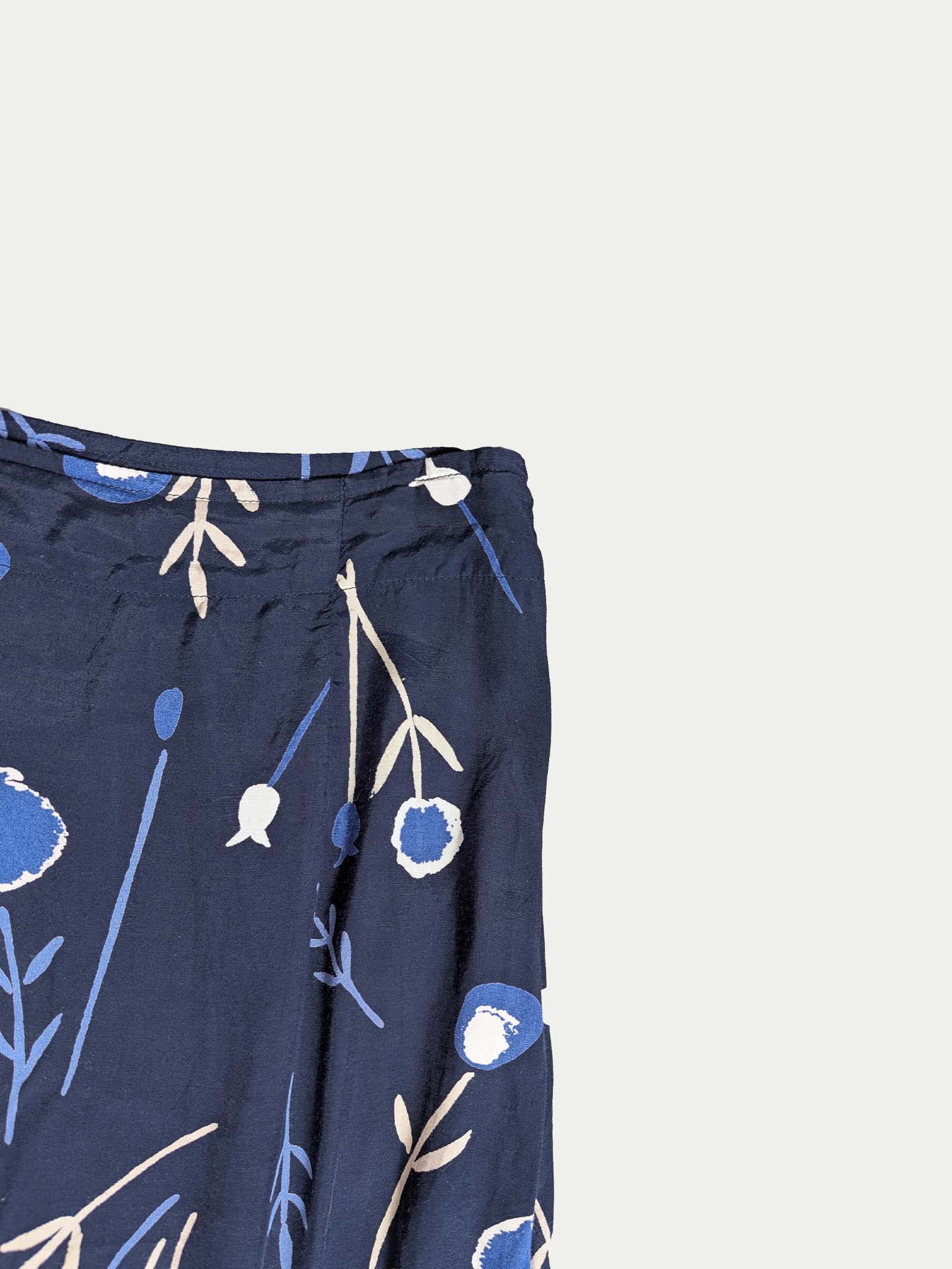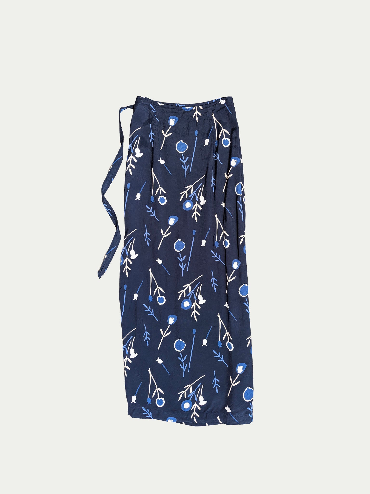 Classic 90s wrap skirt made of satin-like viscose with a soft, gentle shine, in dark blue with a charming small floral symbol print.
