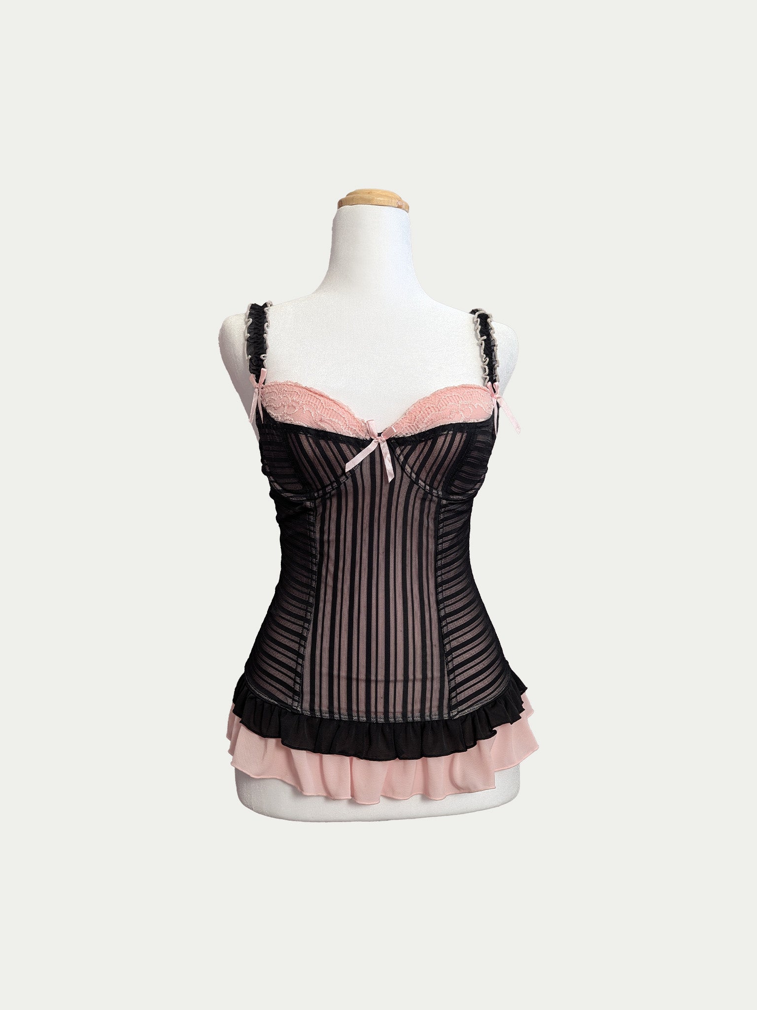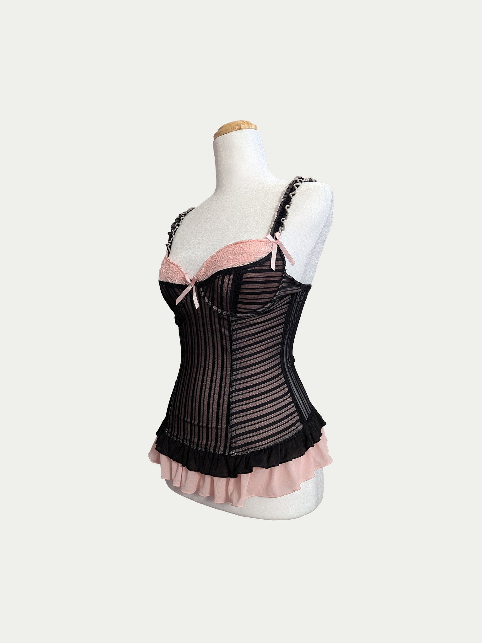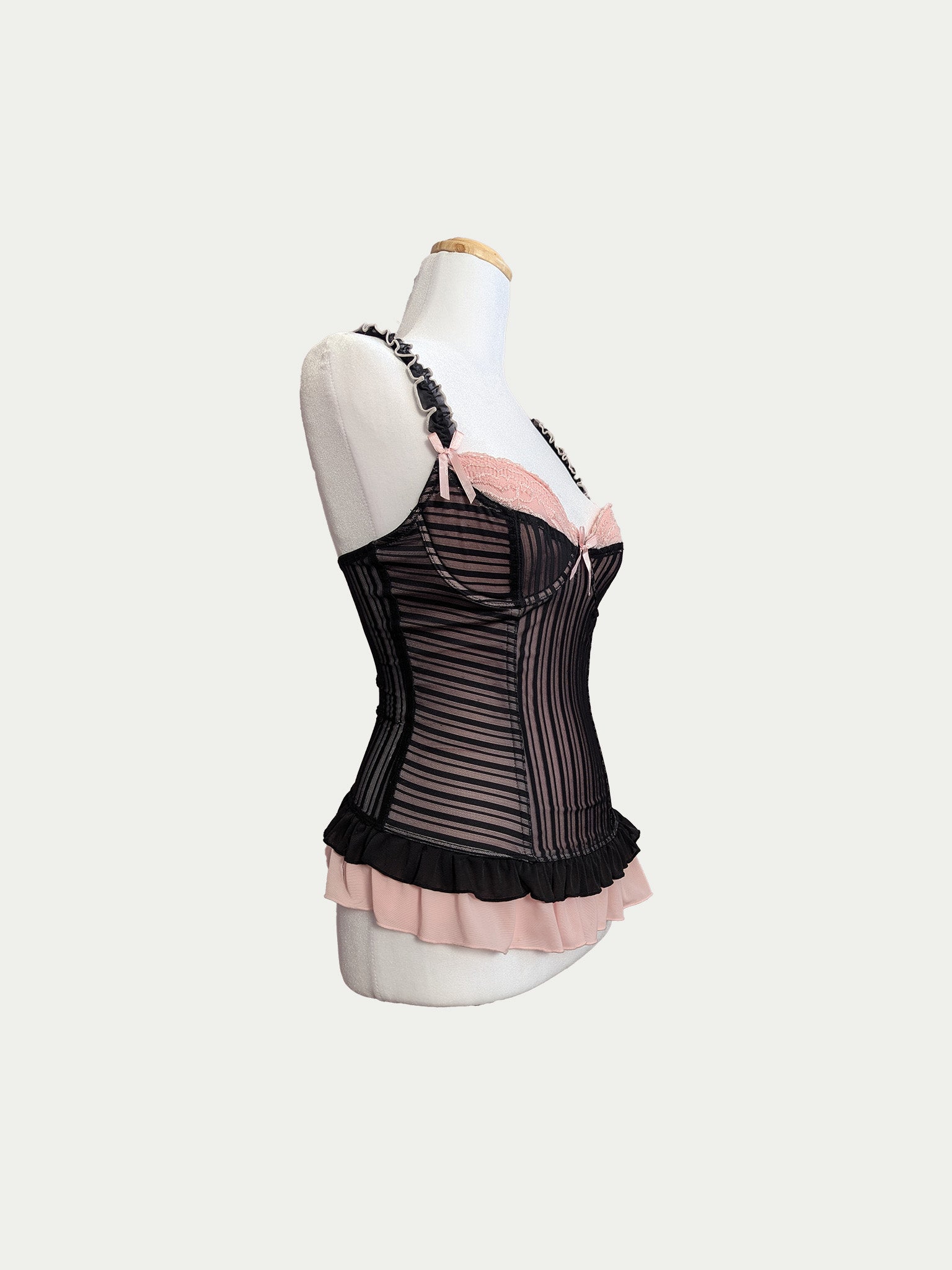 Early 2000s mesh corset in baby-pink and black with cabaret vibes. Features a double peplum hem, soft padded cups, adjustable straps, and classic all-along back hooks closure with three sizing options. Finished with lace, ruffles and bow details.