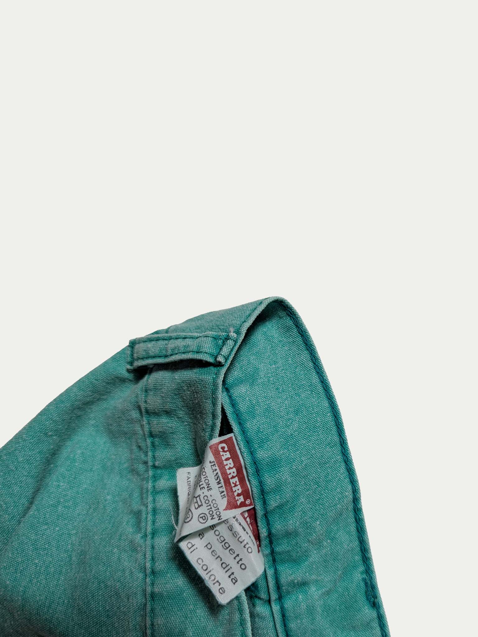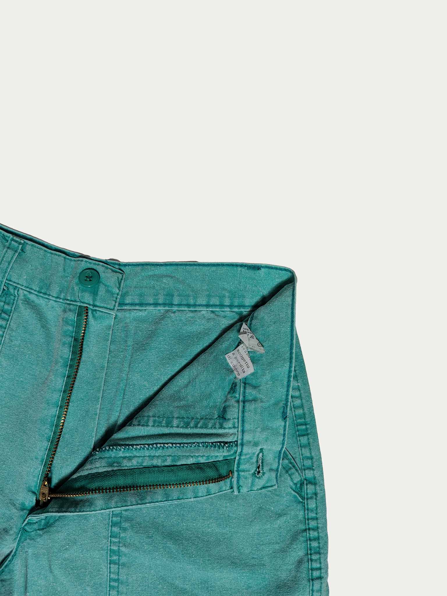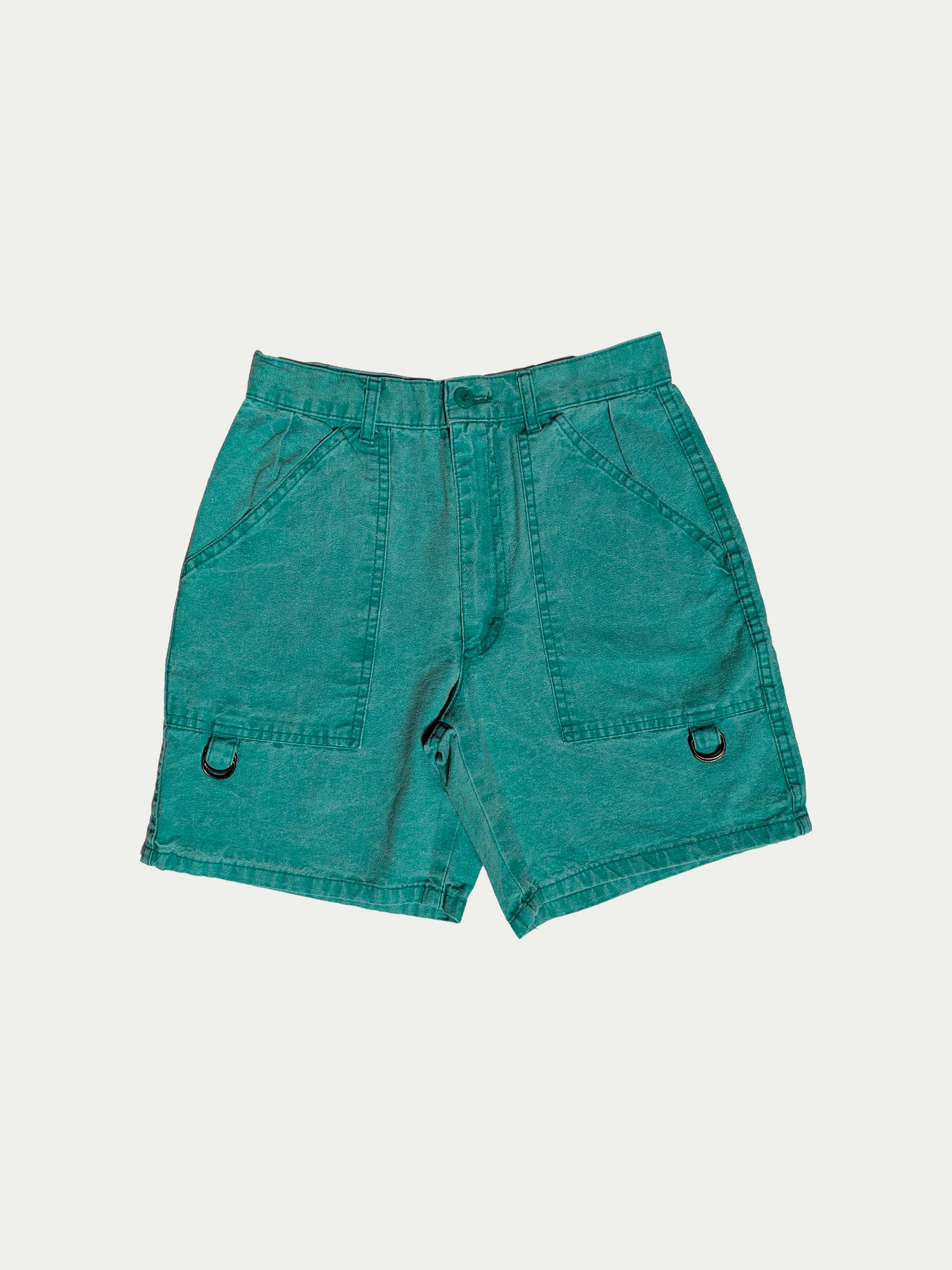 Early 90s mid-rise, tight-fit turquoise shorts by Carrera, featuring two front pockets and one back pocket, with funky metal ring details at the bottom of the pockets. Designed with belt loops and a button and zipper closure for a structured, flattering silhouette.