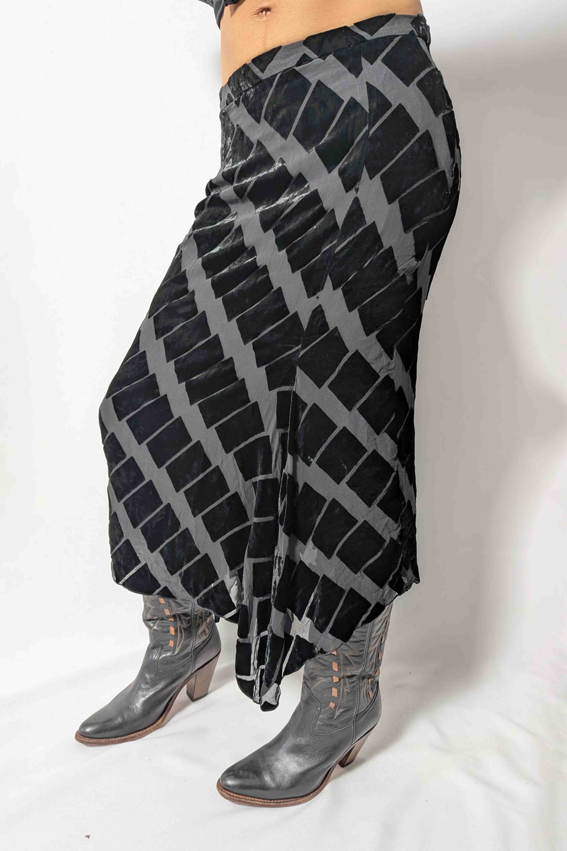 Chiffon and velvet skirt made of viscose and silk blend, featuring an asymmetrical hem, opaque lining, and a hidden side zipper closure. A high-end, rare 90s piece.