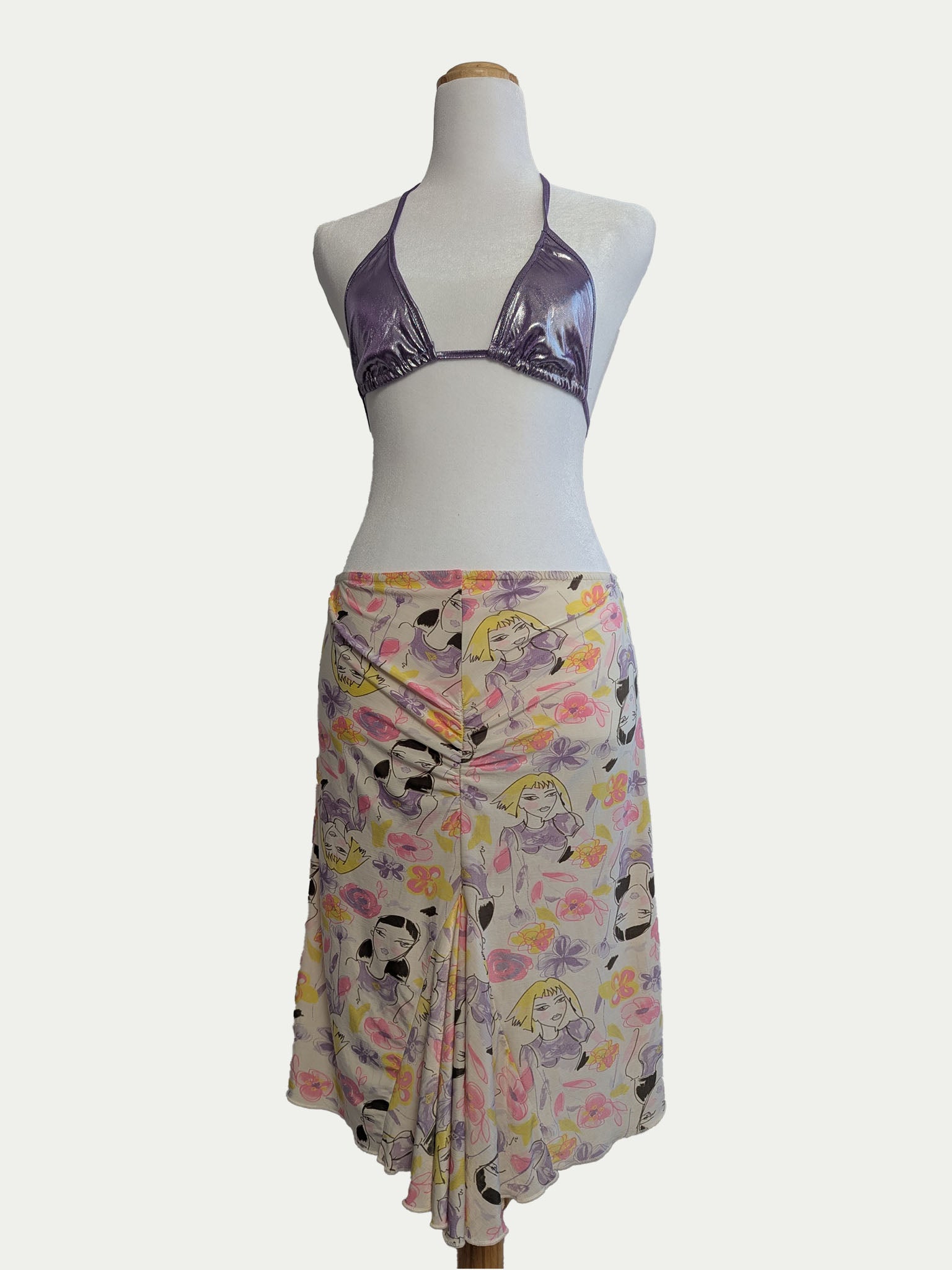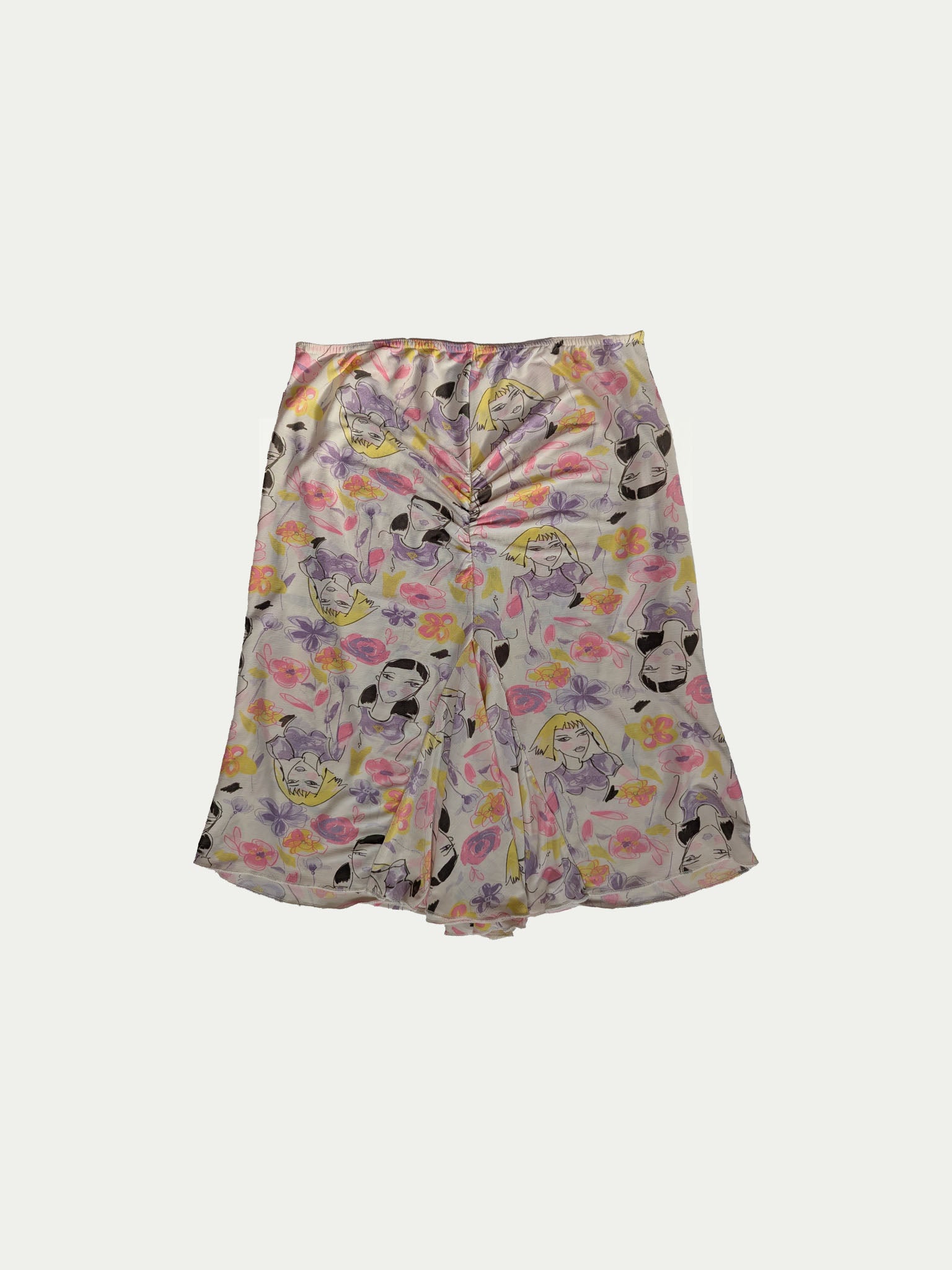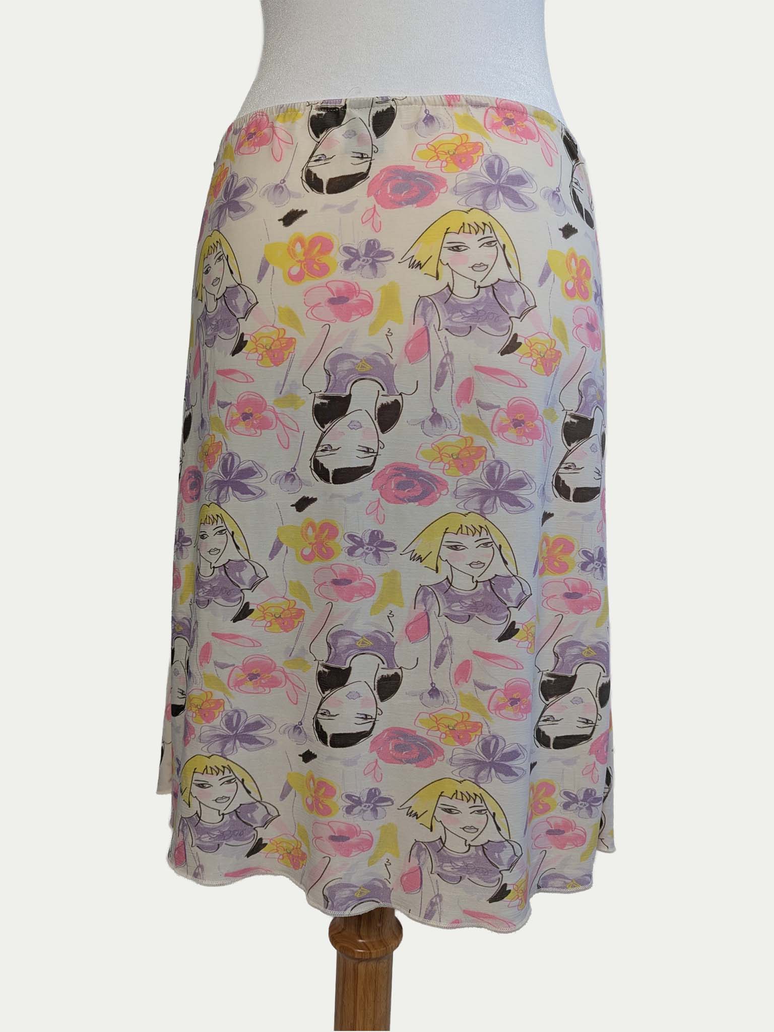 Early 2000s elastic midi skirt with a funky comics-style print in sweet pastel shades.