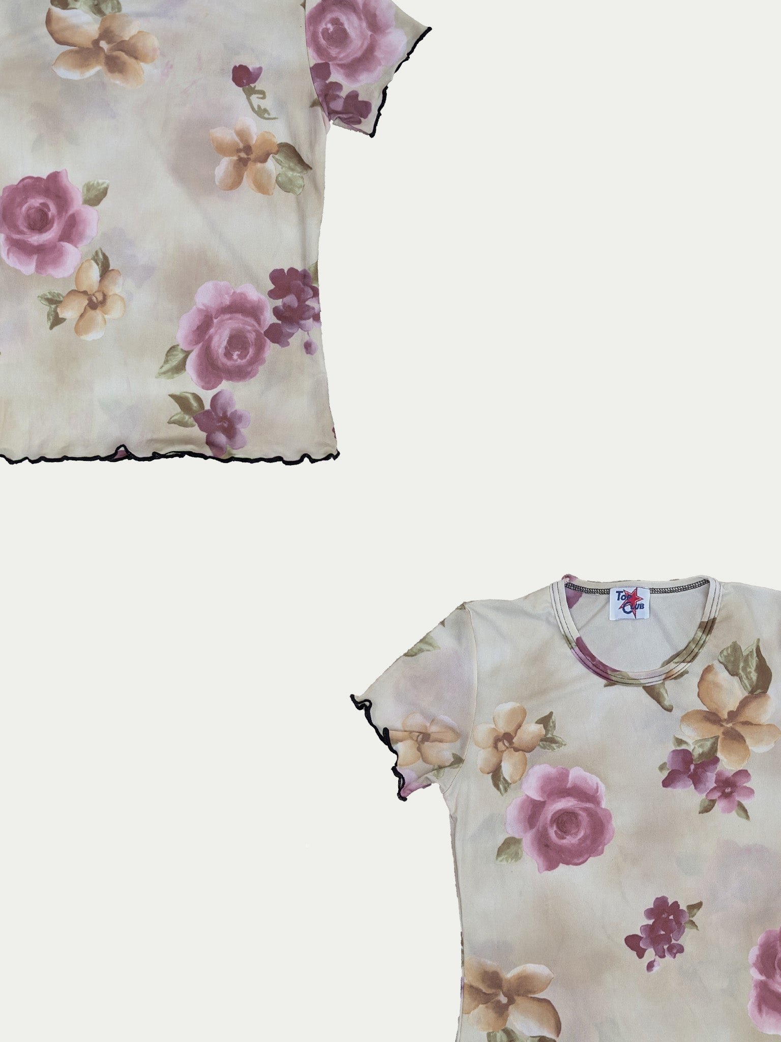 Late 90s mesh T-shirt with a pastel, dreamy floral print. Finished with black ruffled seams for a soft contrast and delicate edge.