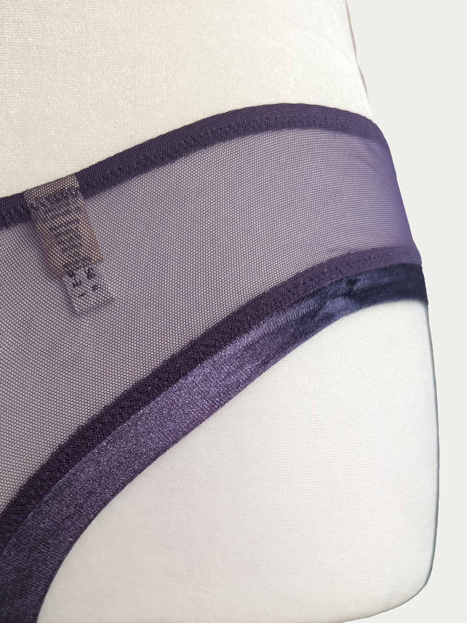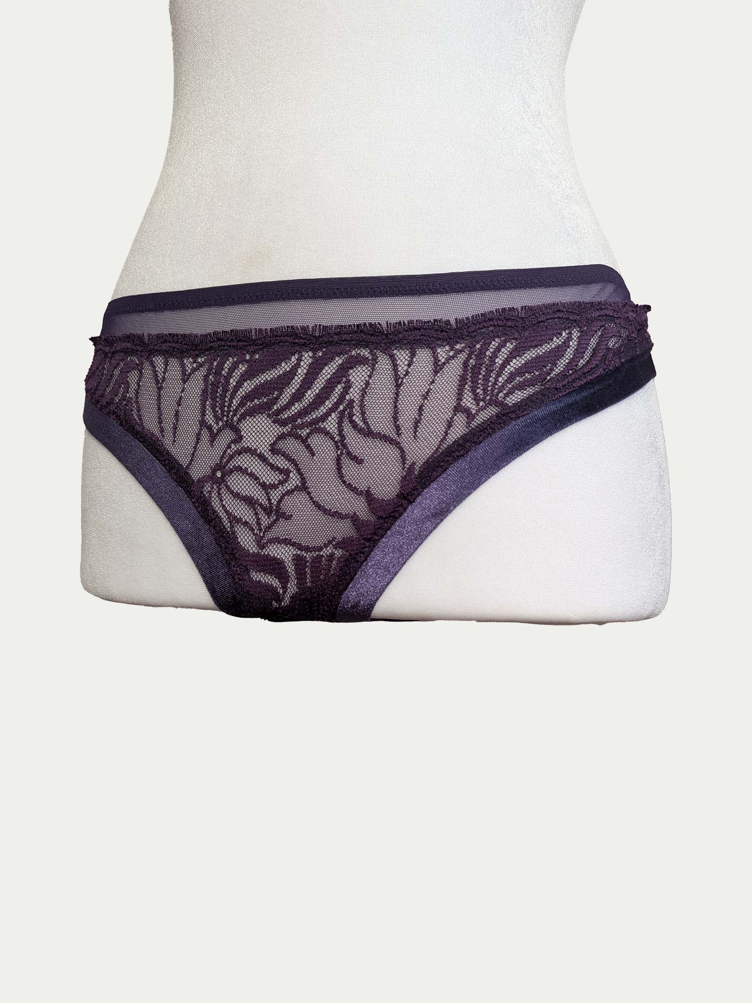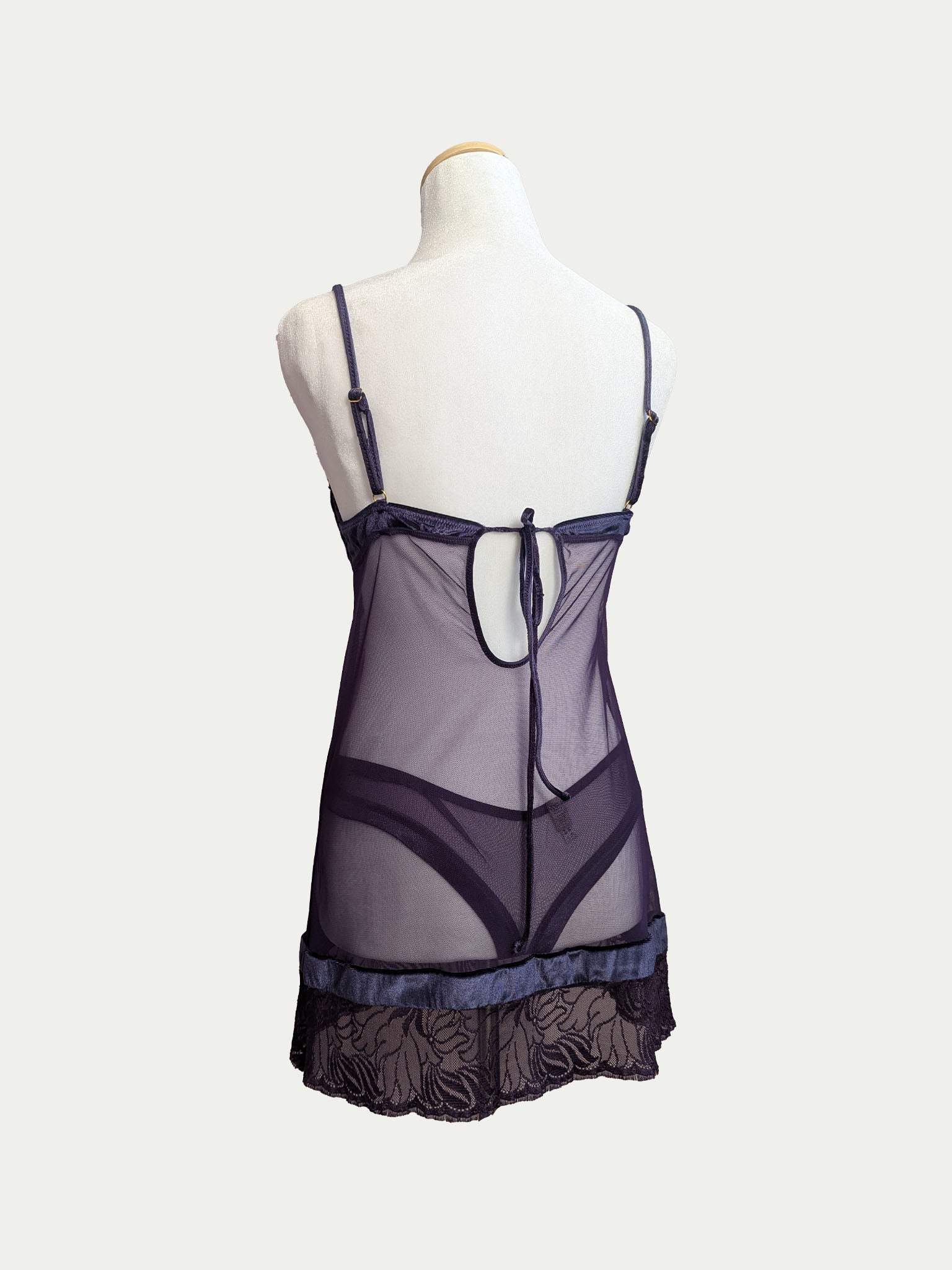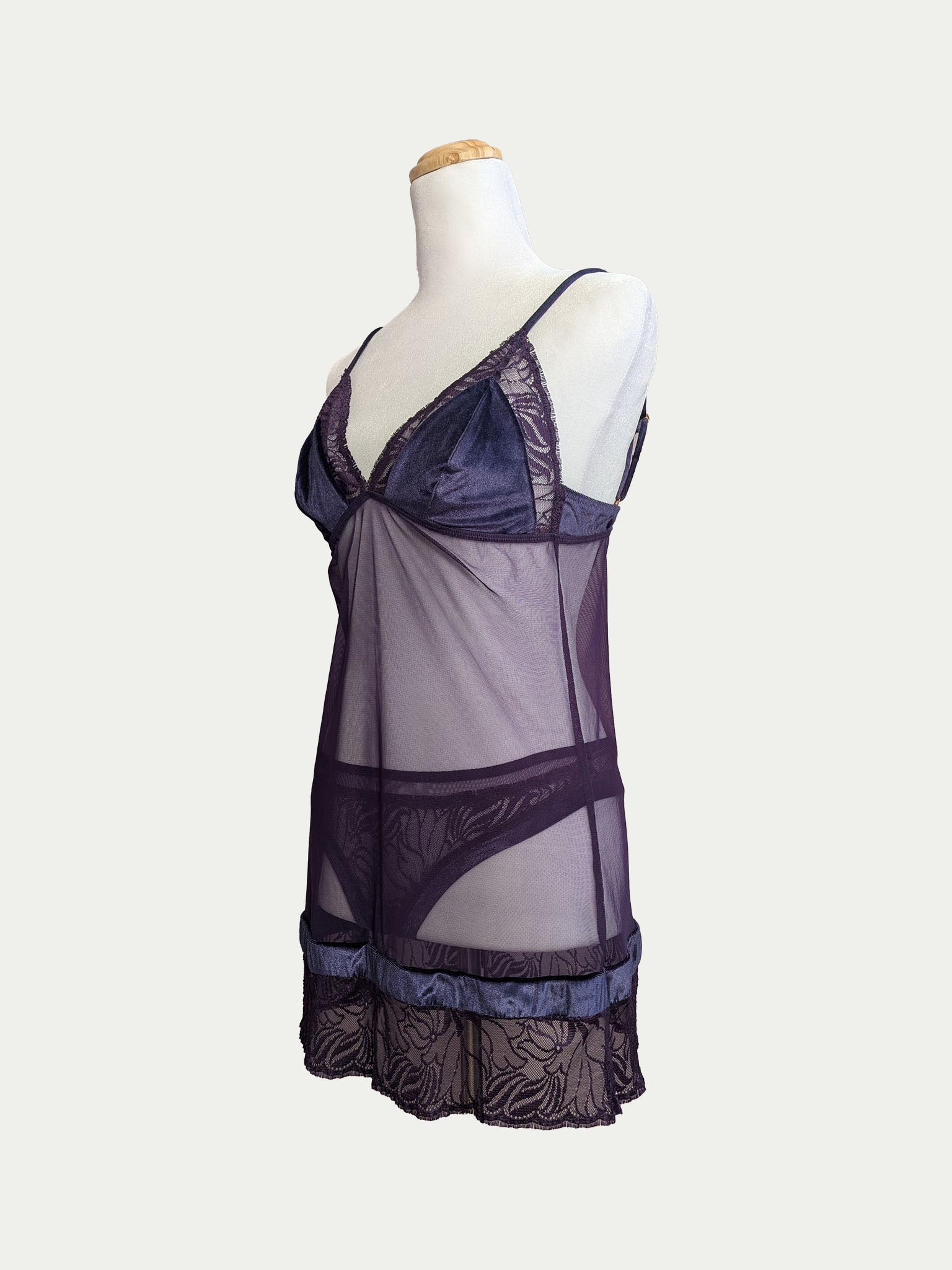 90s lingerie set consisting of a babydoll tank and matching panties, made of lace, mesh, and velvet in a deep eggplant purple. The top features adjustable straps, back lacing detail, and opaque cups - allowing it to be worn as a standalone top. Paired with Brazilian-style low-mid rise bottoms.