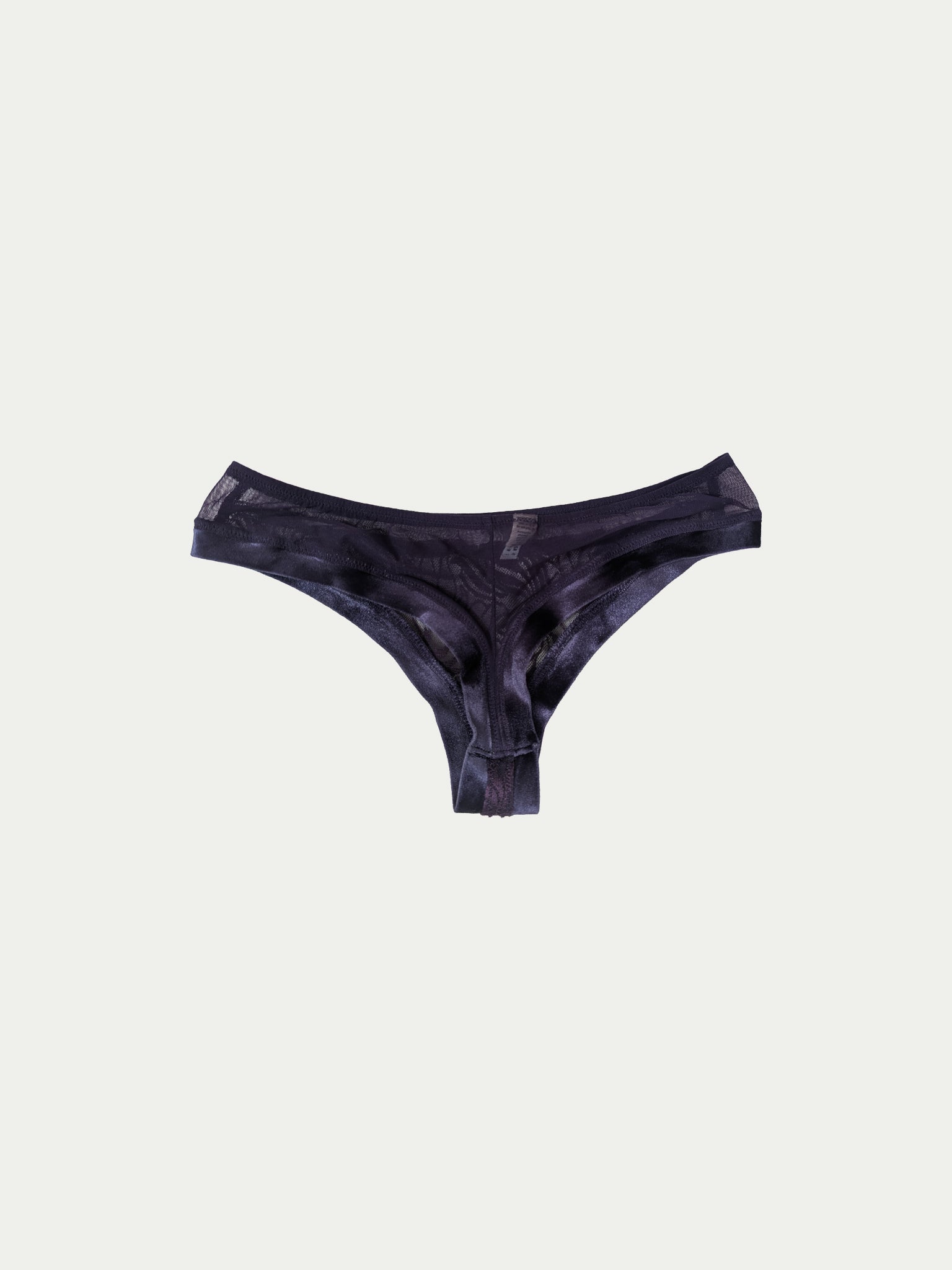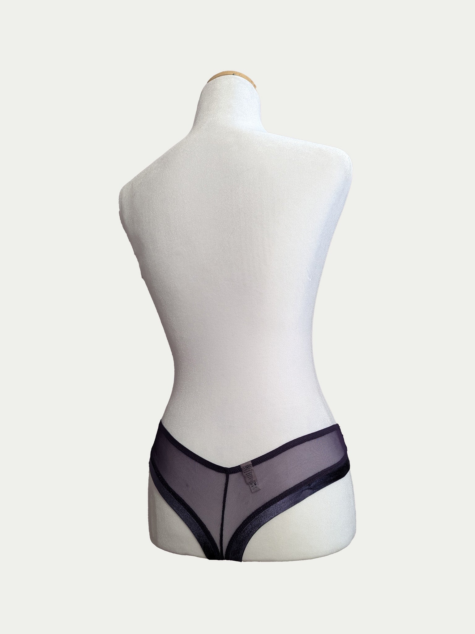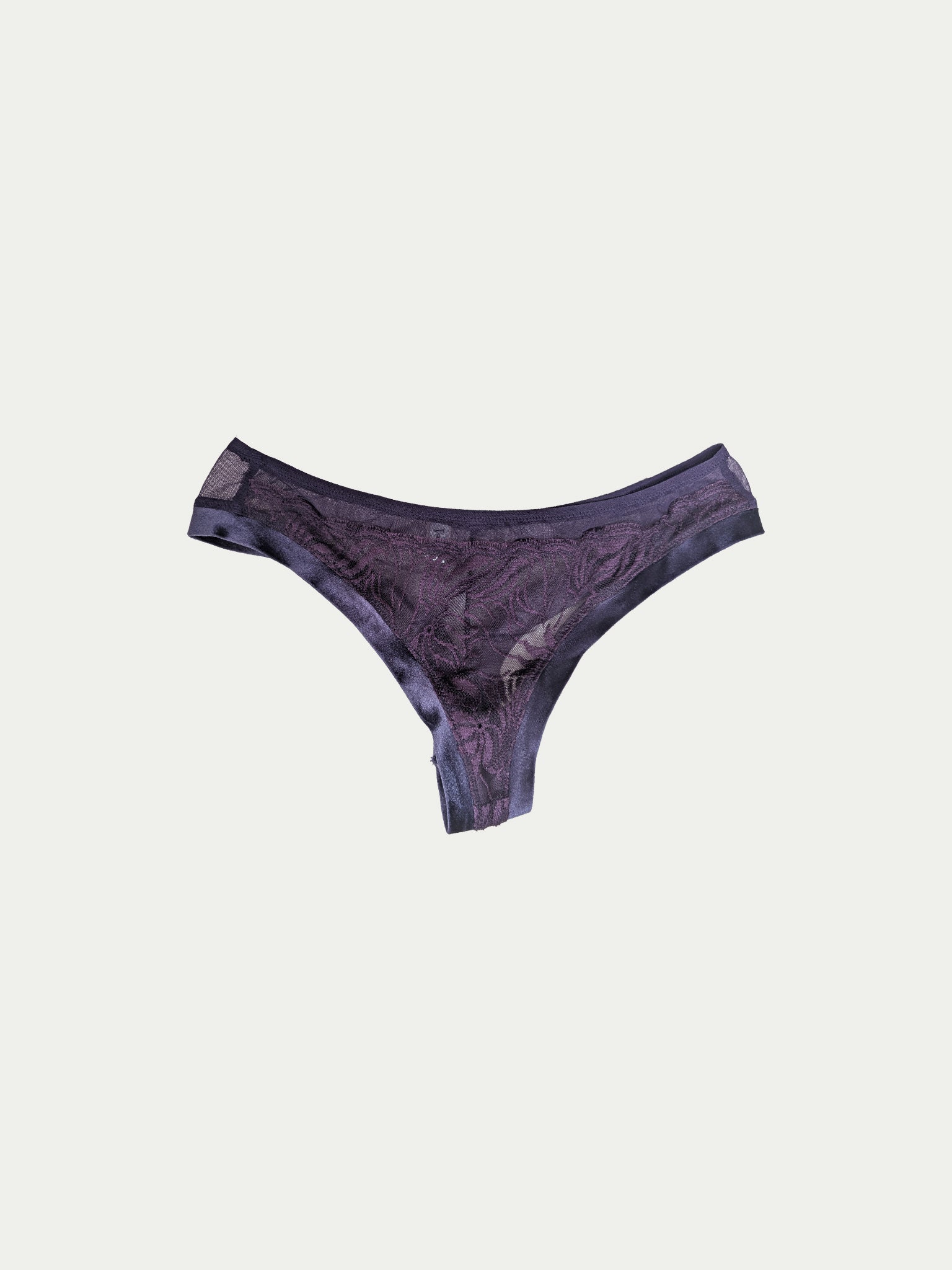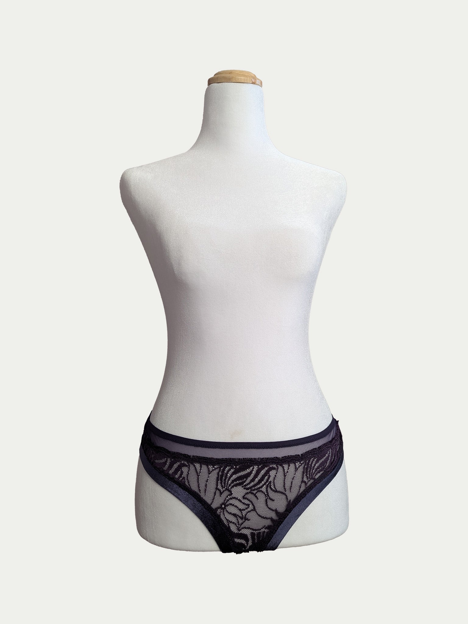 90s lingerie set consisting of a babydoll tank and matching panties, made of lace, mesh, and velvet in a deep eggplant purple. The top features adjustable straps, back lacing detail, and opaque cups - allowing it to be worn as a standalone top. Paired with Brazilian-style low-mid rise bottoms.