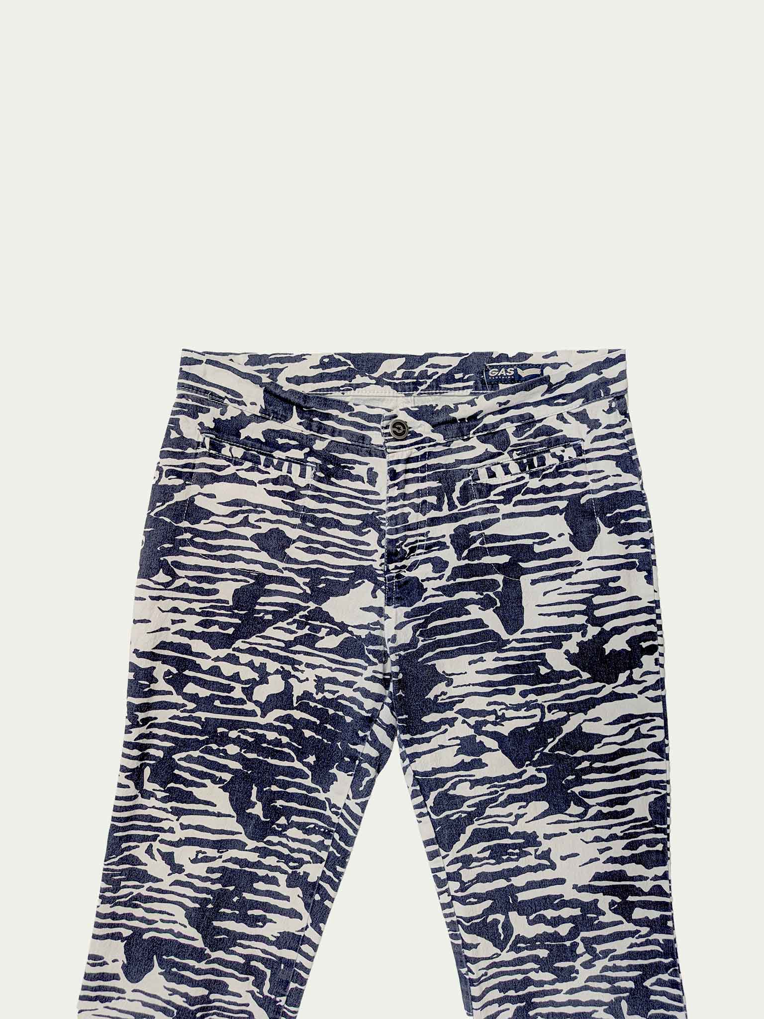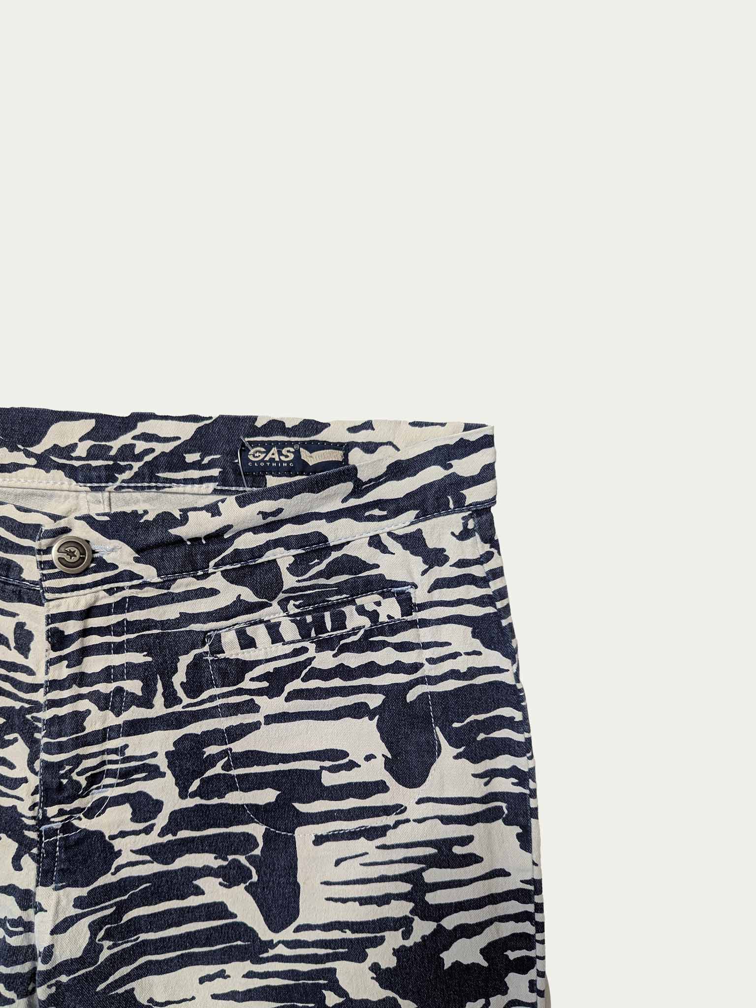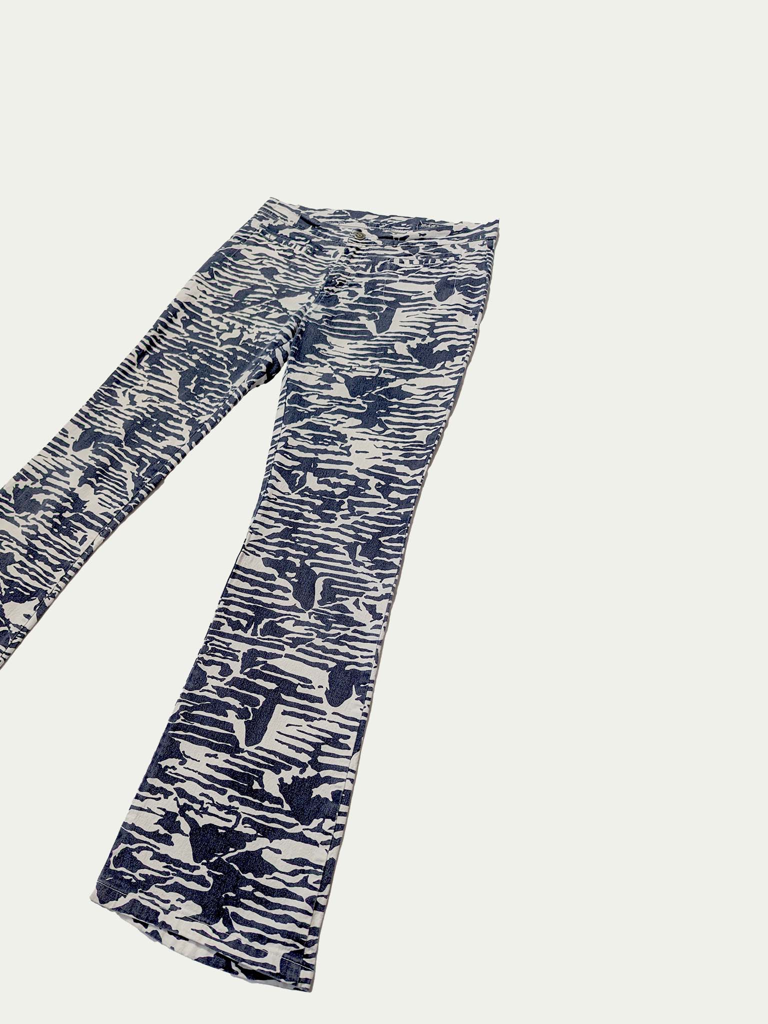 Late 90s GAS jeans in a blue and white animal print, mid-rise with a slight flare. In excellent pre-loved condition.