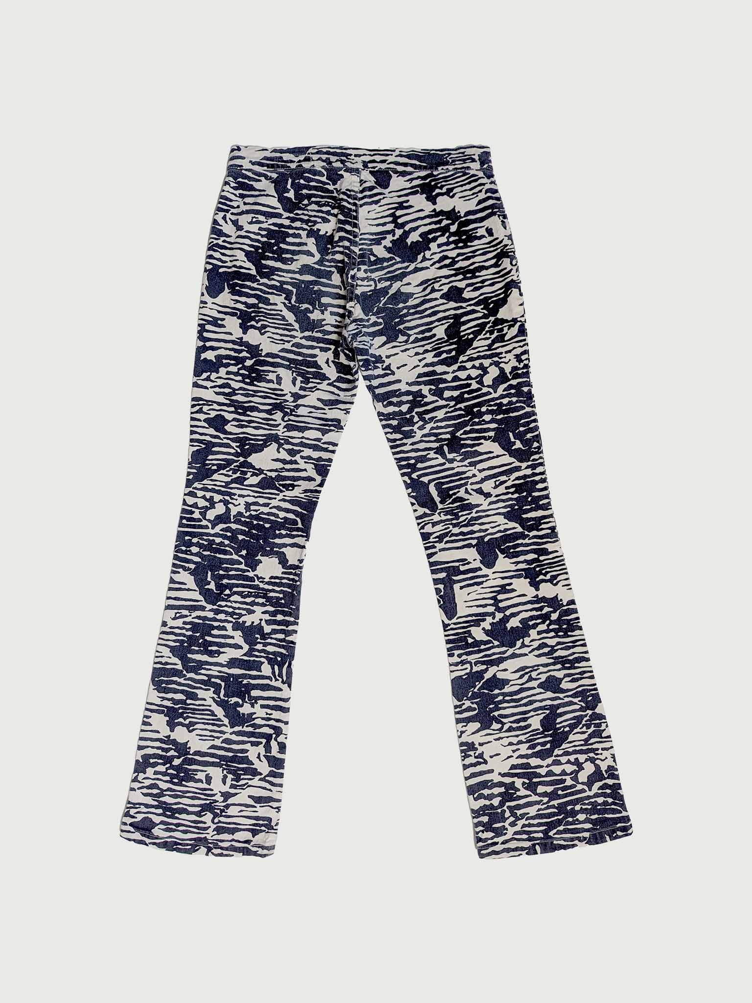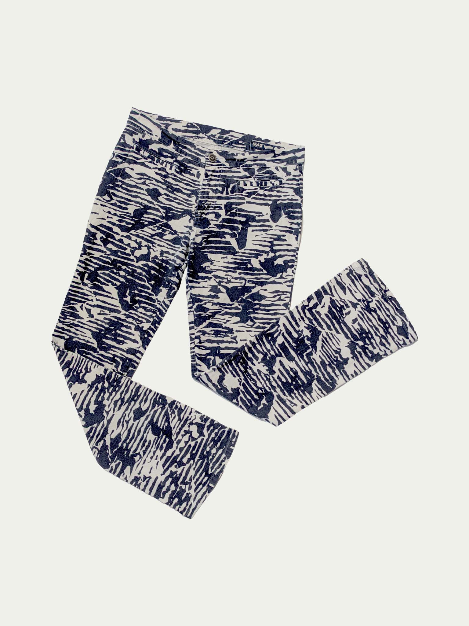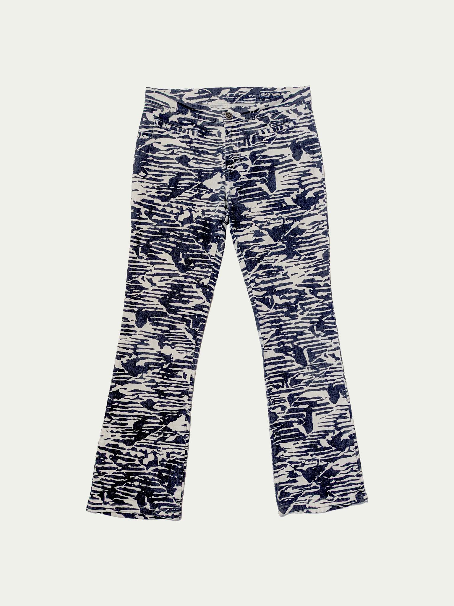 Late 90s GAS jeans in a blue and white animal print, mid-rise with a slight flare. In excellent pre-loved condition.