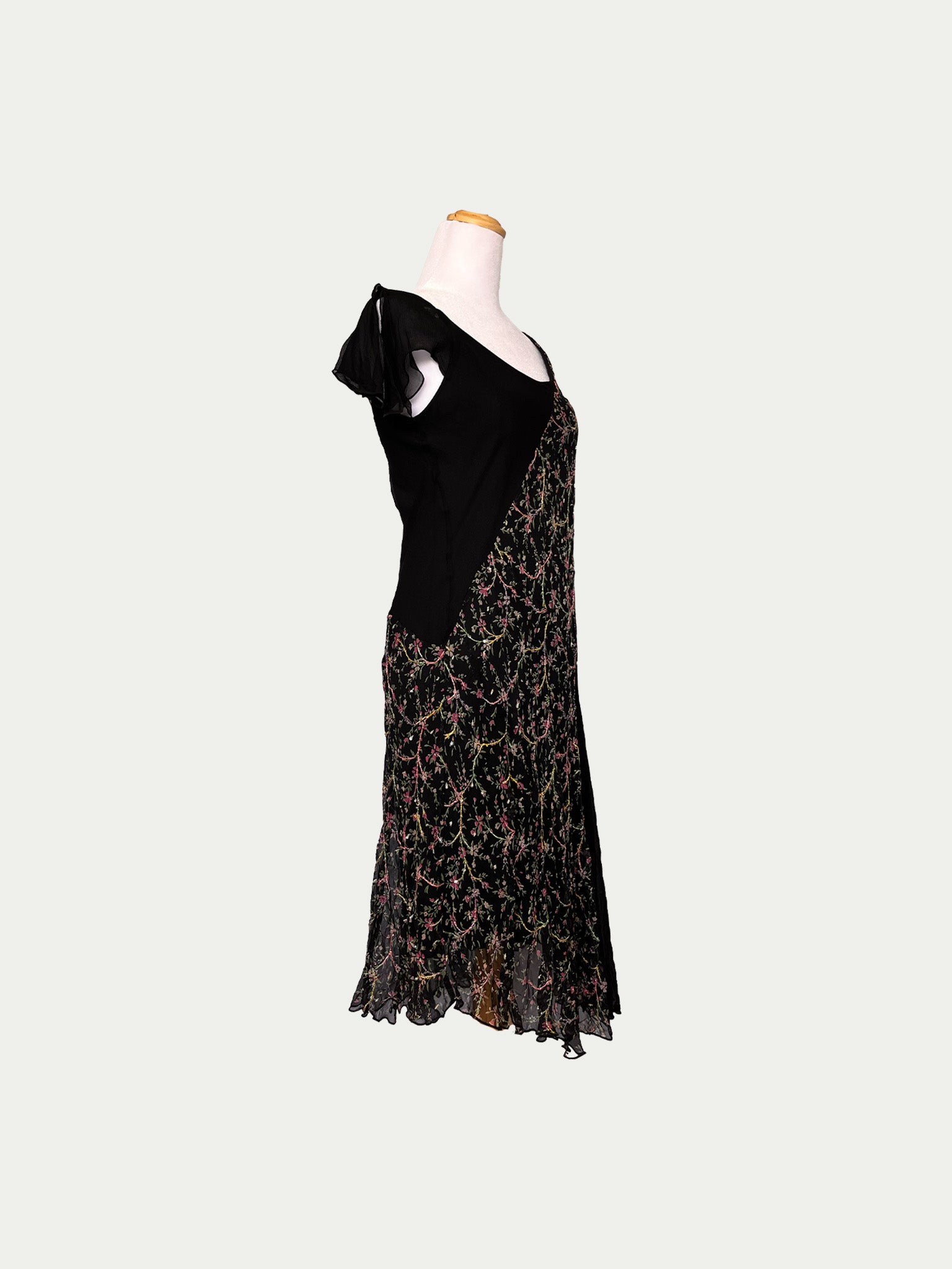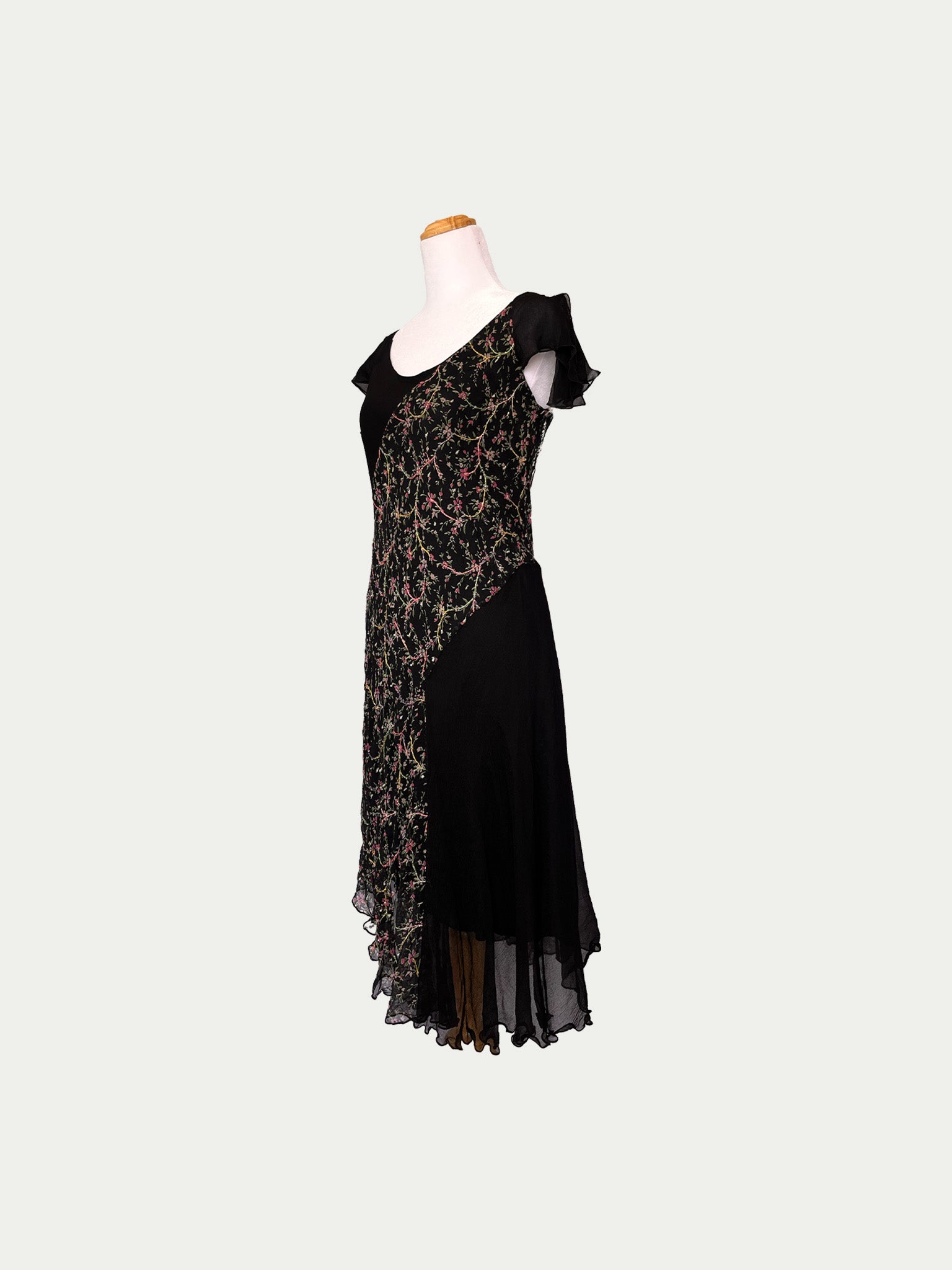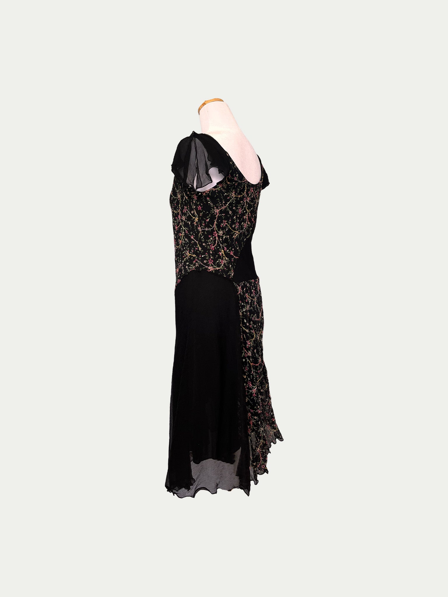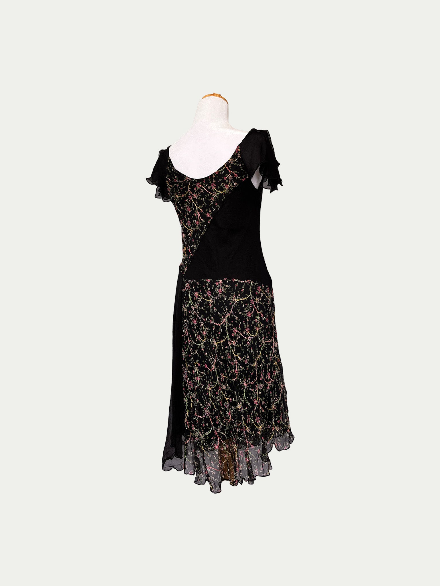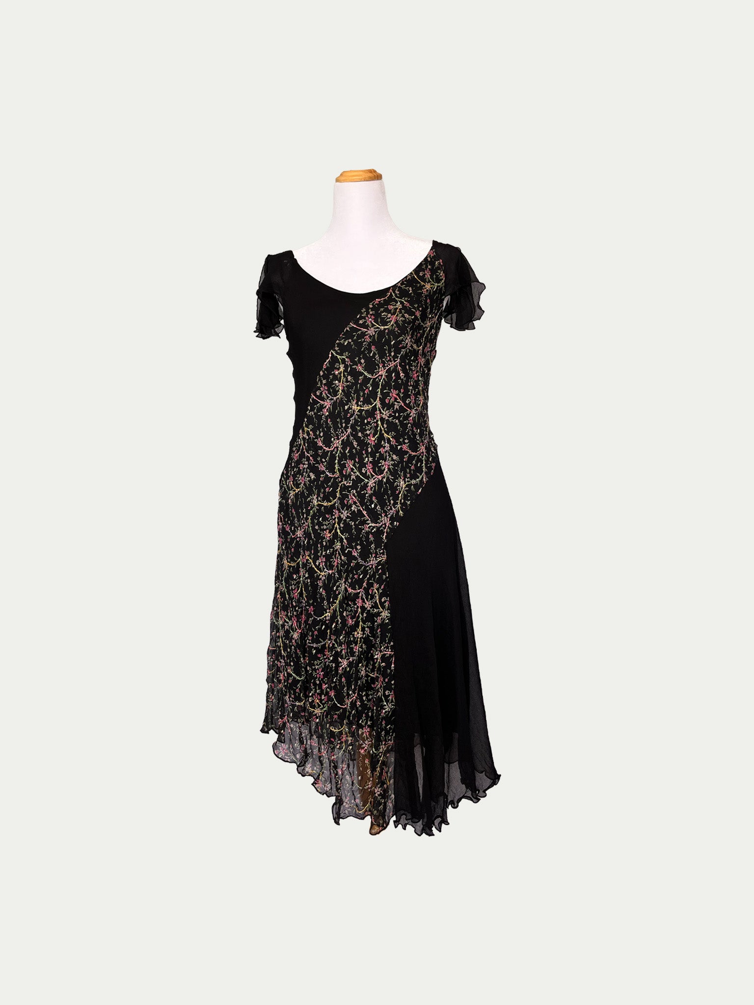 Late 90s silk fairy evening dress by Simona Barbieri for Twin-Set. A rare piece combining two different silk fabrics: plain black chiffon and another black chiffon with a delicate pink-green floral print, a glittery embroidery and tiny sequins. Features an asymmetrical hem, diagonal cuts, and ruffled layered straps. Fully lined for opacity.