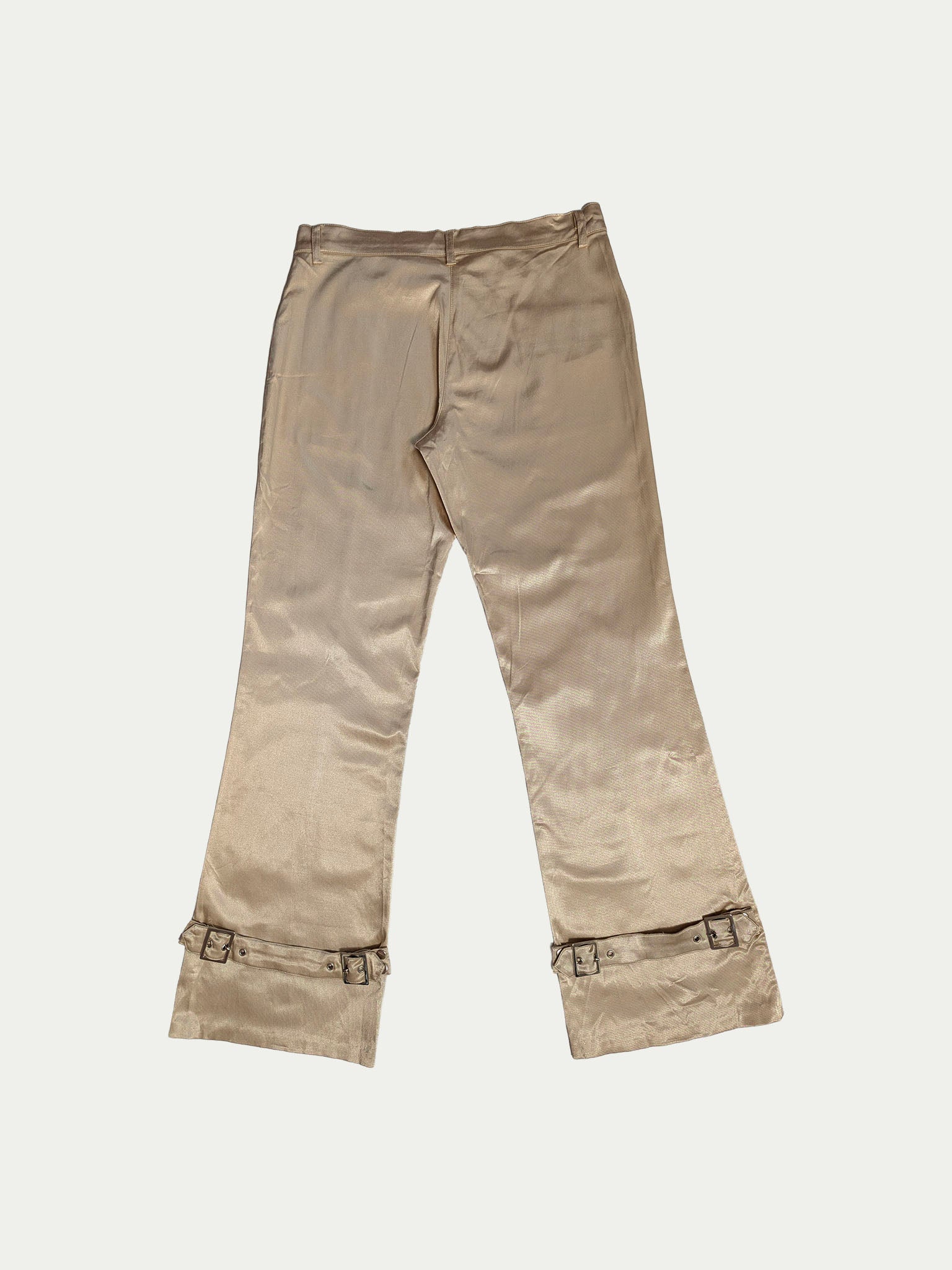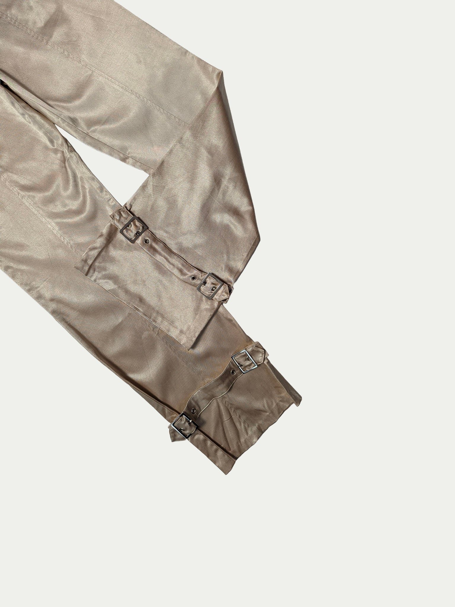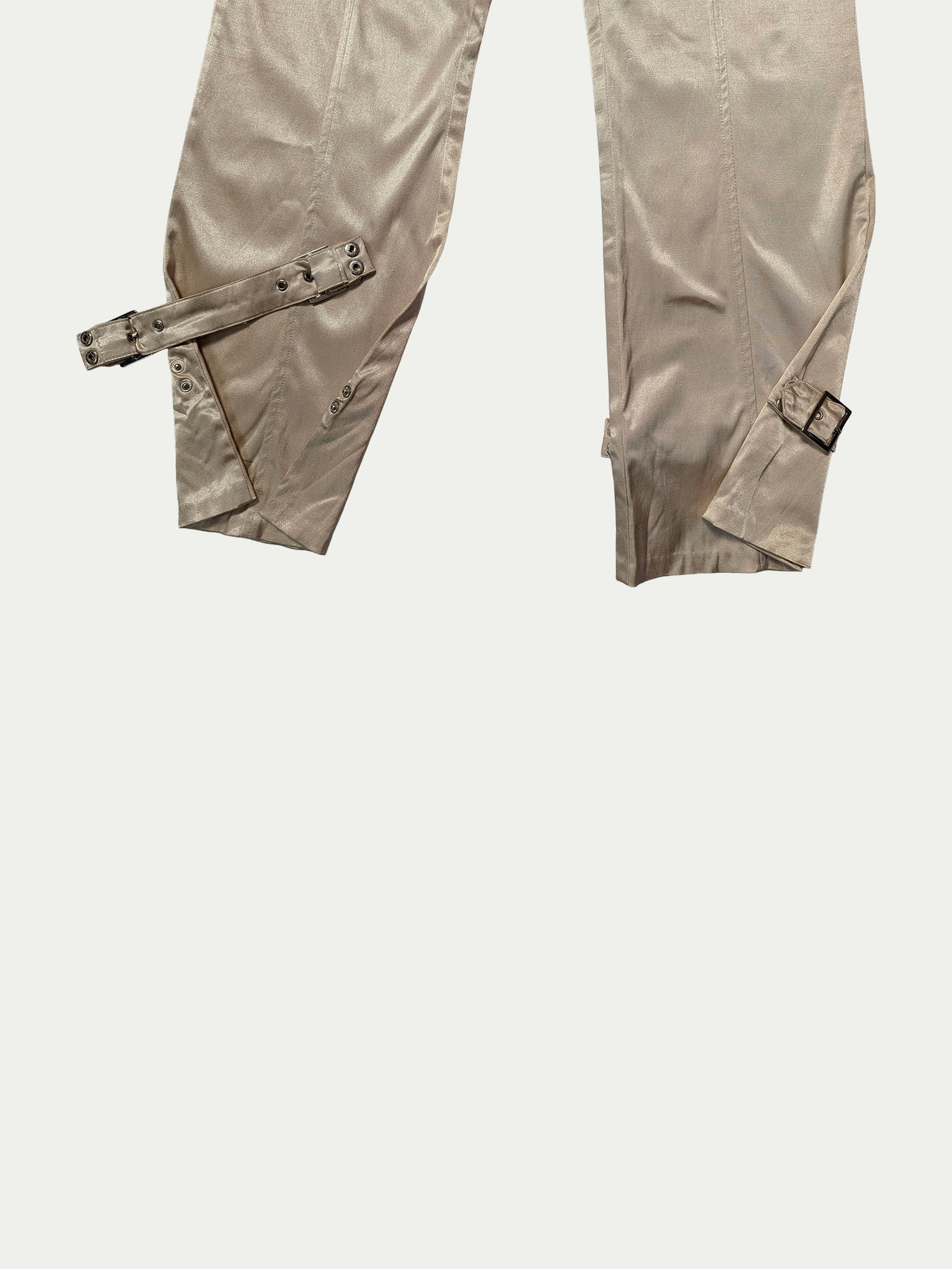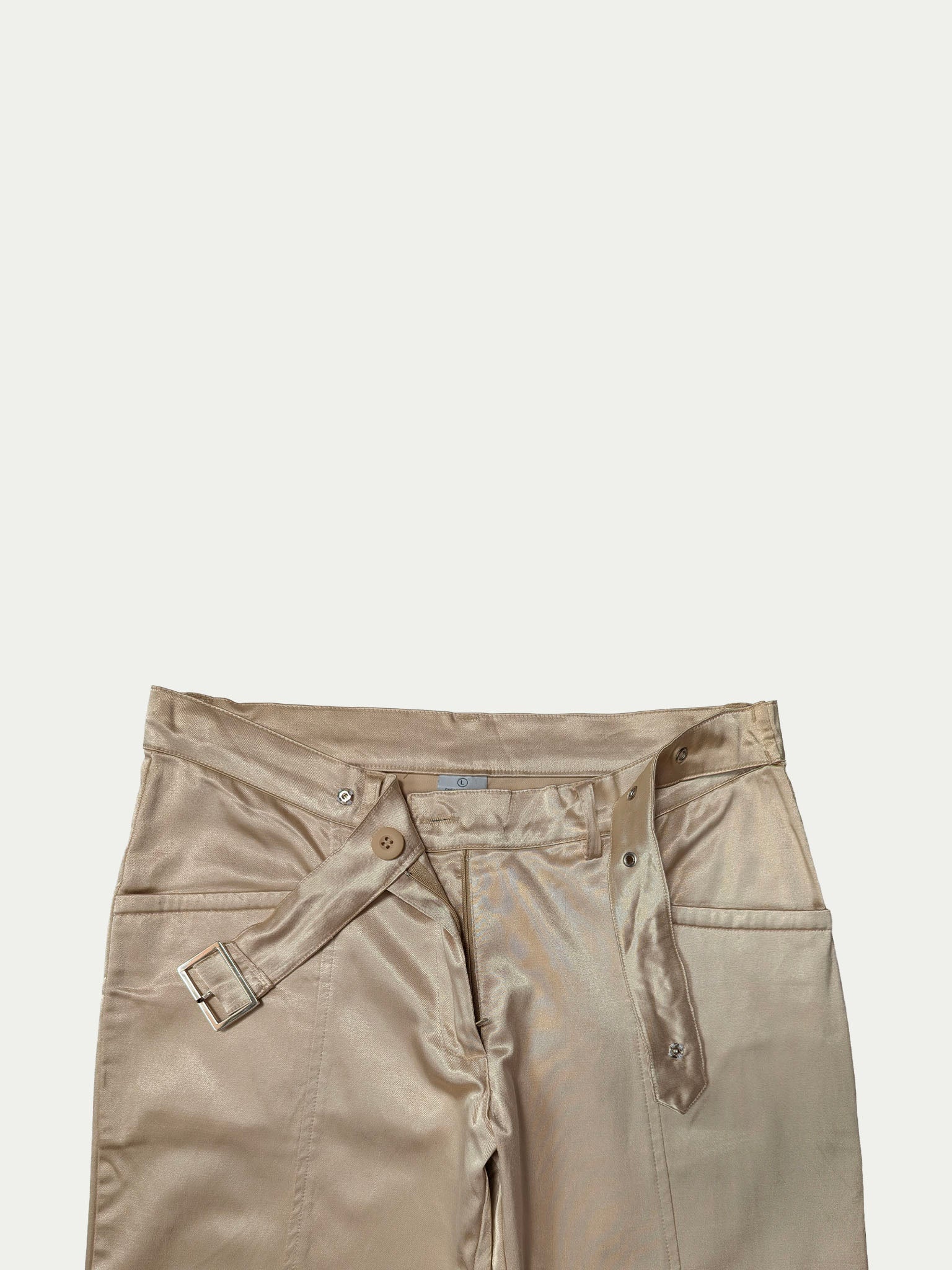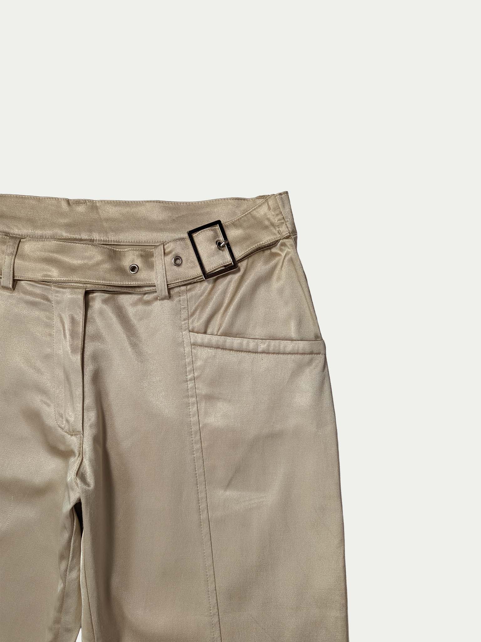 Late 90s low-rise cargo pants made of golden satin fabric, featuring detailed pockets and adjustable belts at the waist and leg hems, which can be removed or placed at the front or back, and tightened or loosened for a customizable fit.