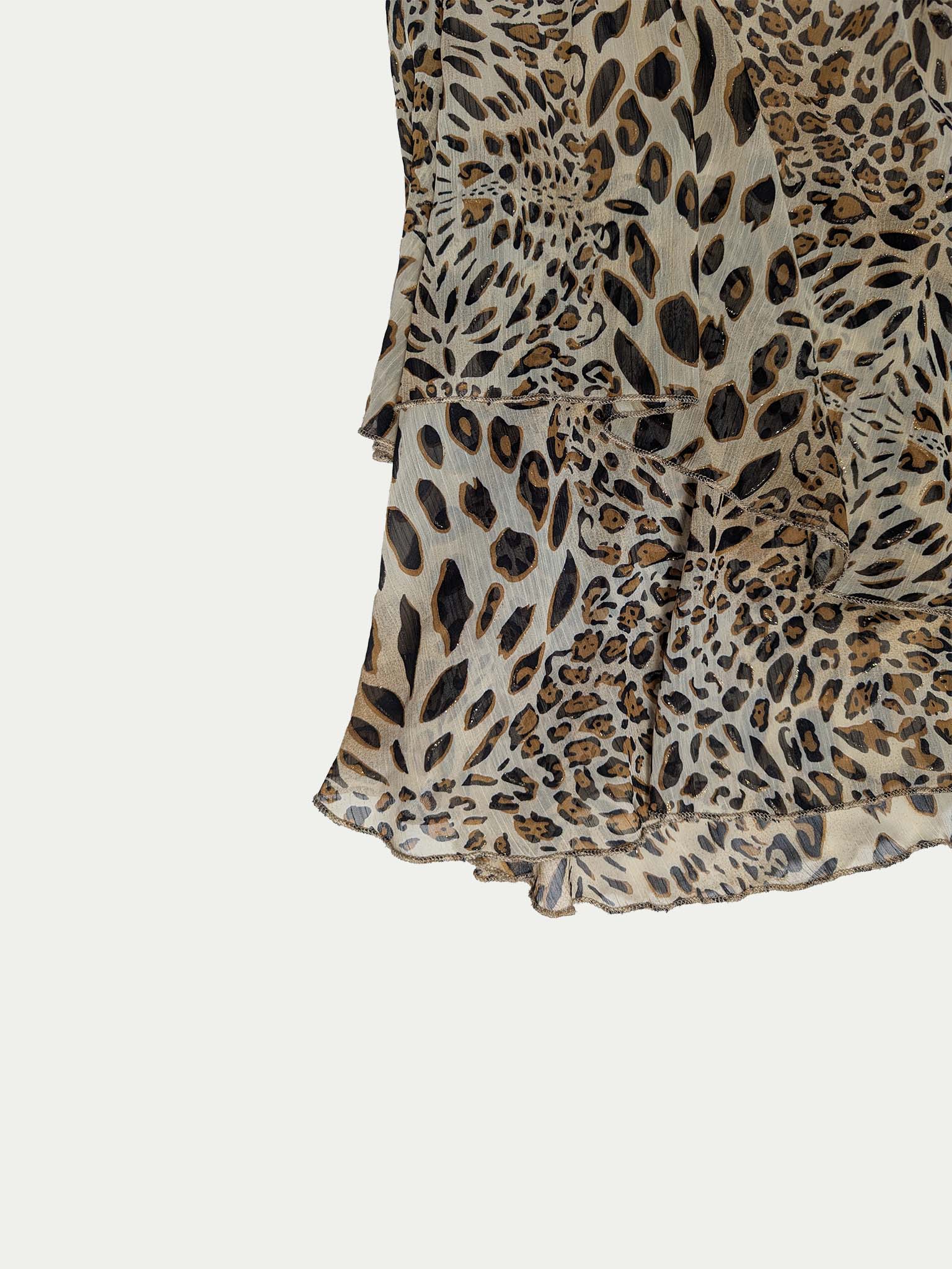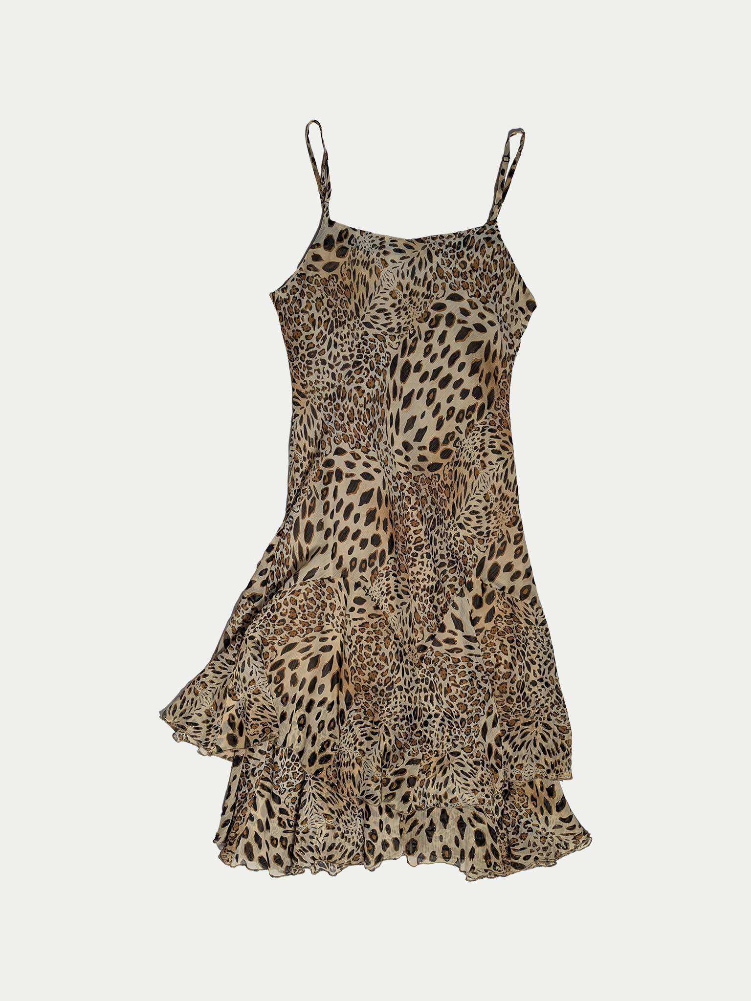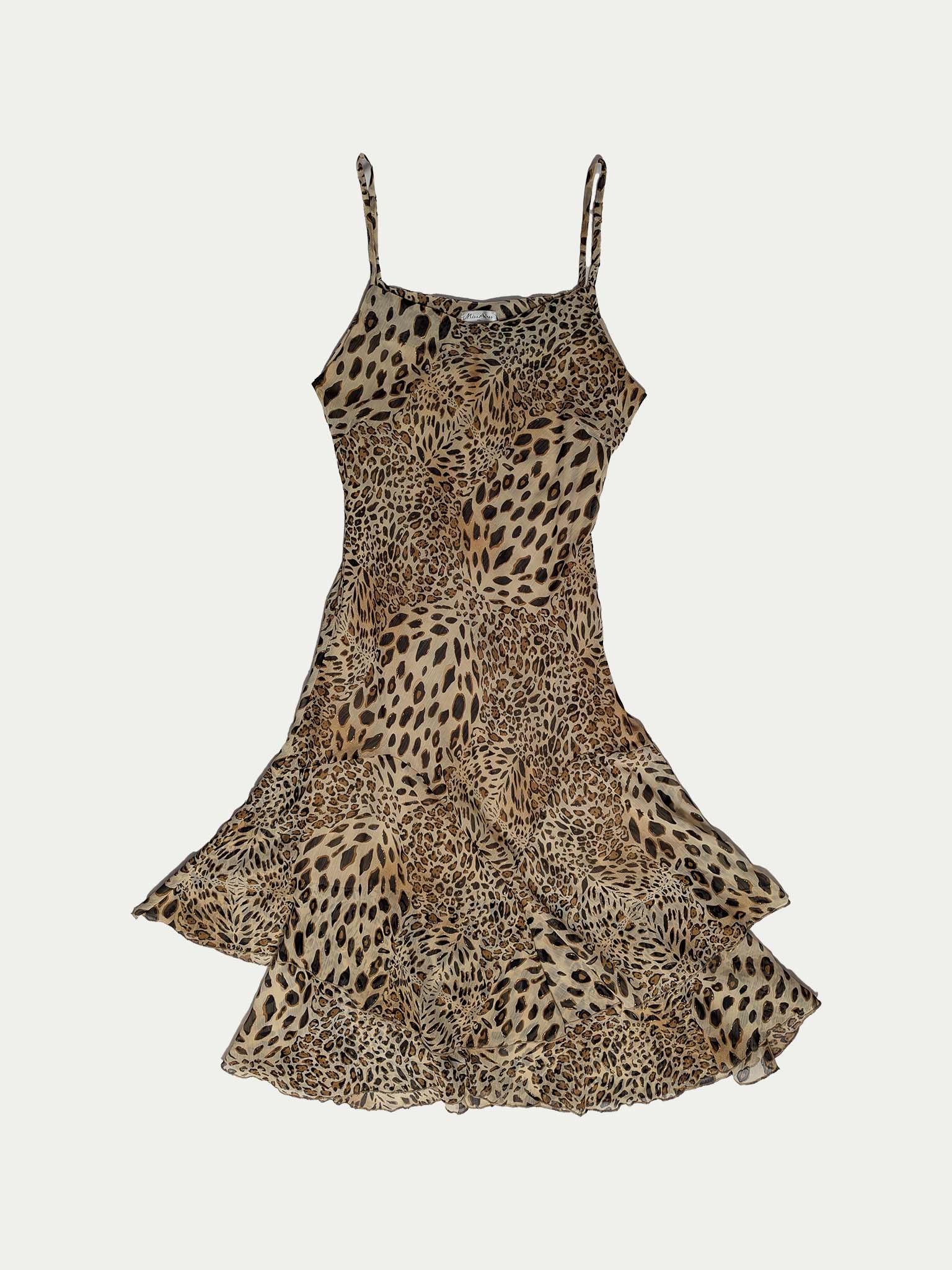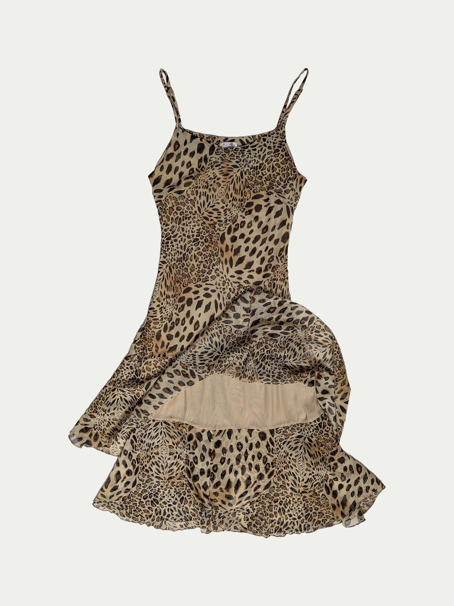 Late 90s asymmetrical midi/maxi dress in leopard print with a golden touch, crafted from lightweight chiffon fabric. Features a layered asymmetrical hemline, flattering diagonal cuts, and adjustable straps. Slightly sheer with a lining.