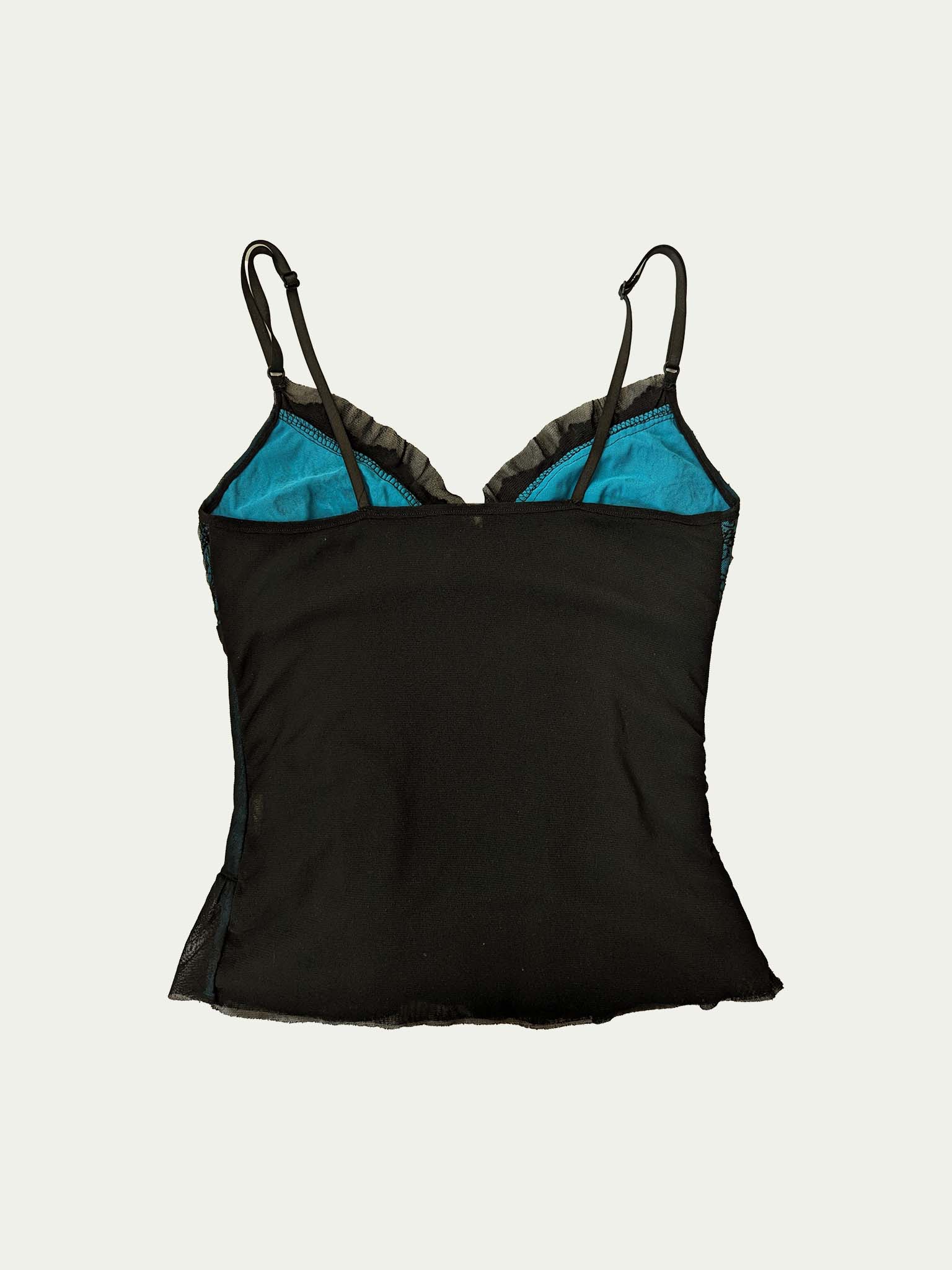 Y2K corset-style camisole top, in turquoise & black. Features various details and textures, a front double tightening option, and a sheer mesh back.