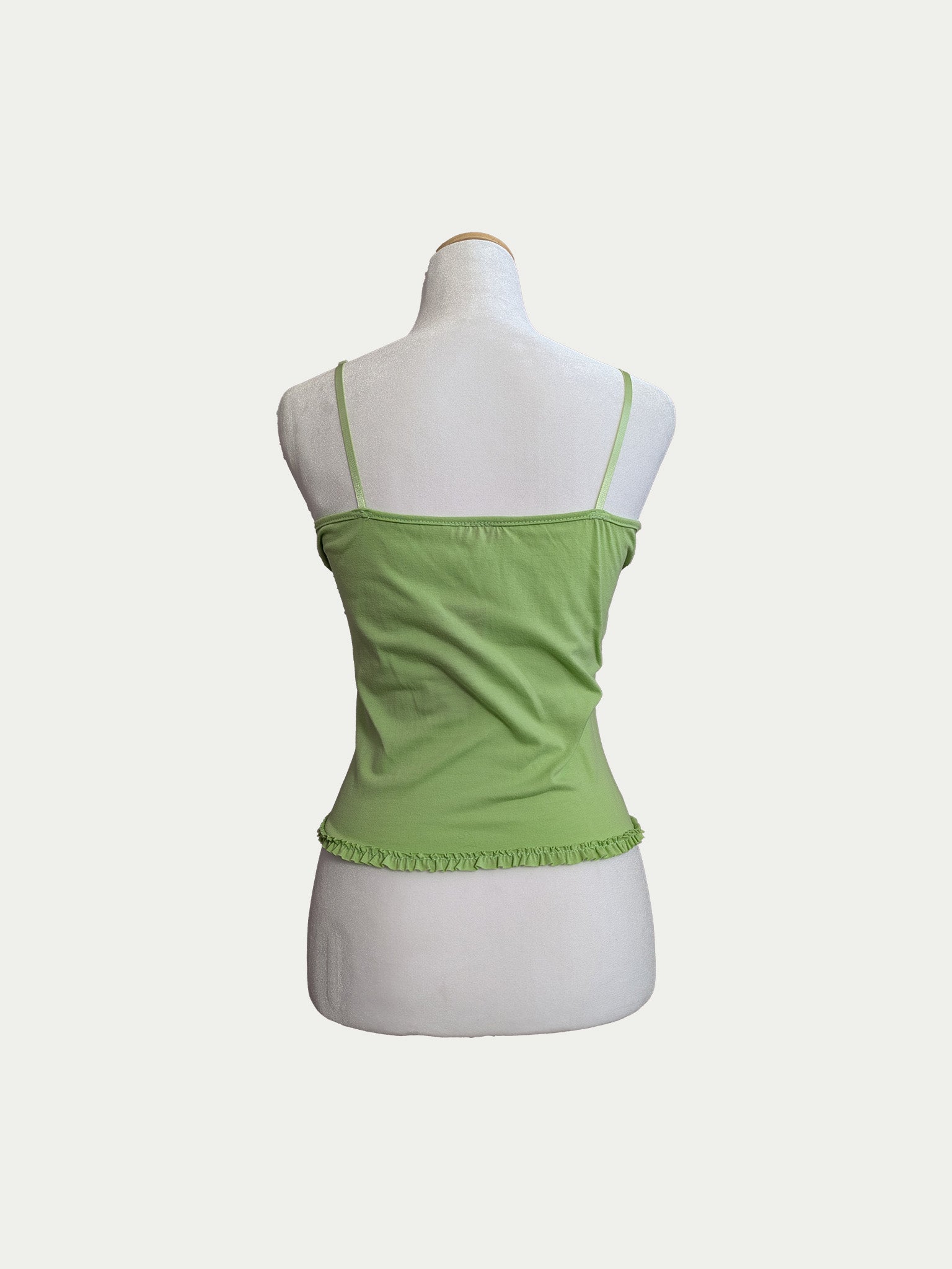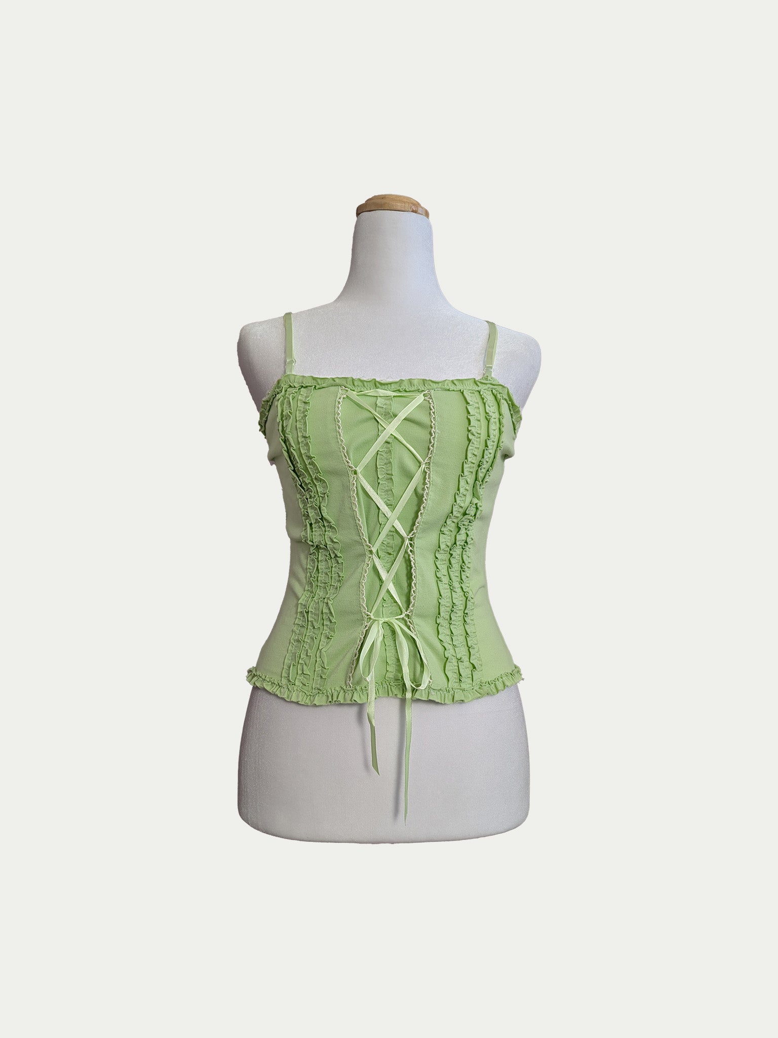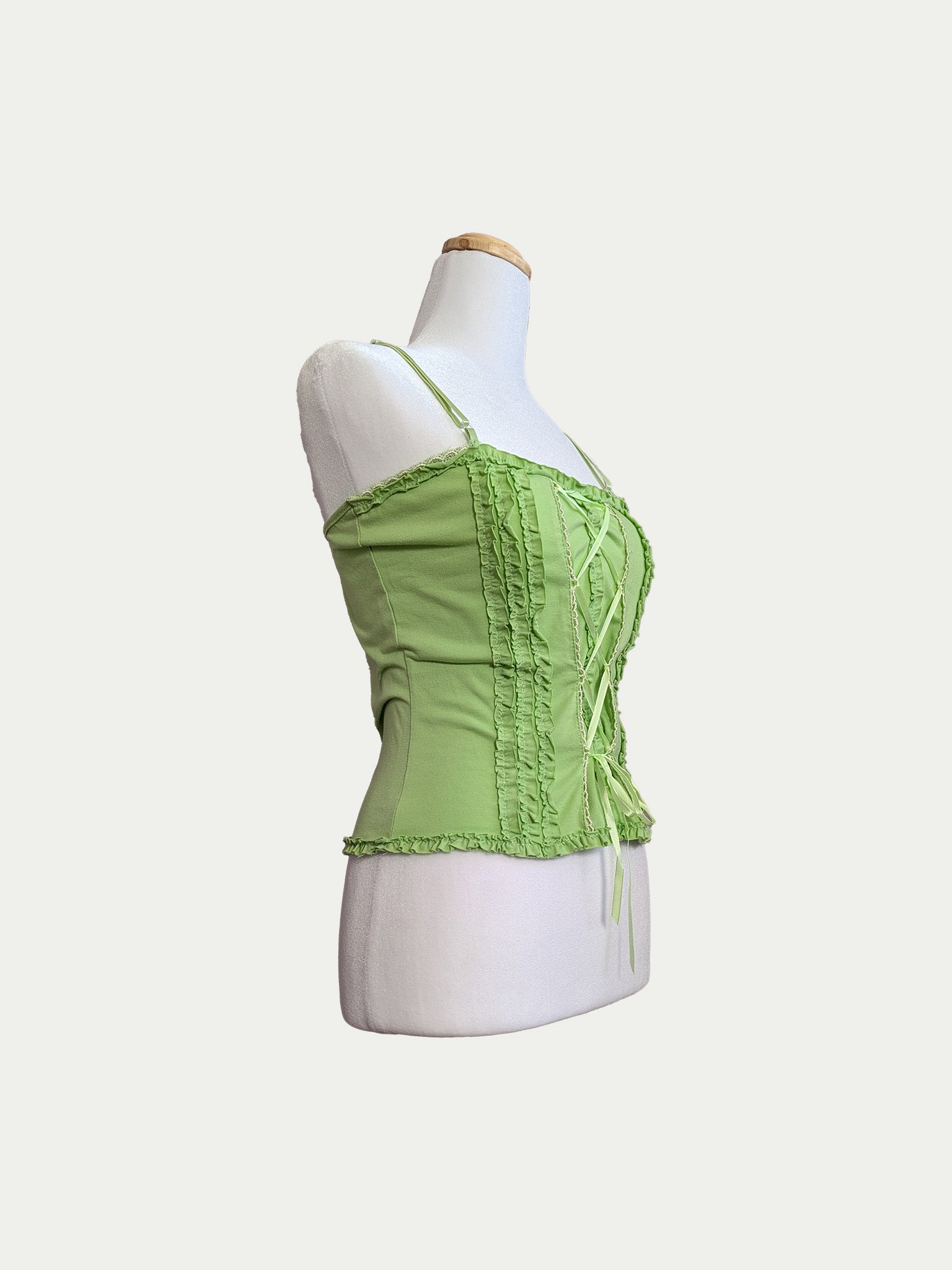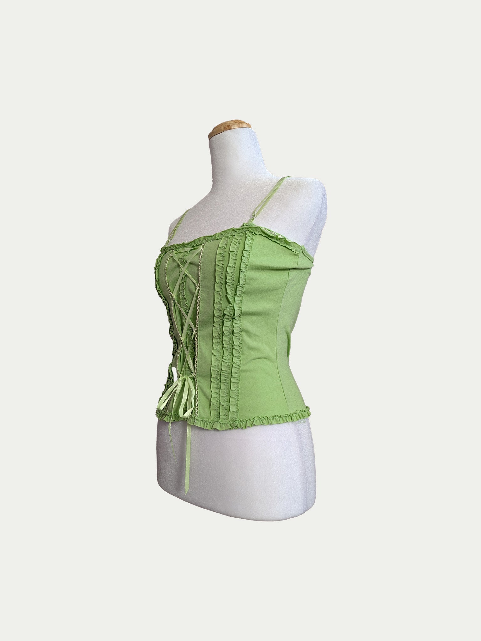 Vibrant green early 2000s top with corset vibes, featuring front lacing and adjustable straps. Stretchy cotton blend for a comfy and flattering feel.