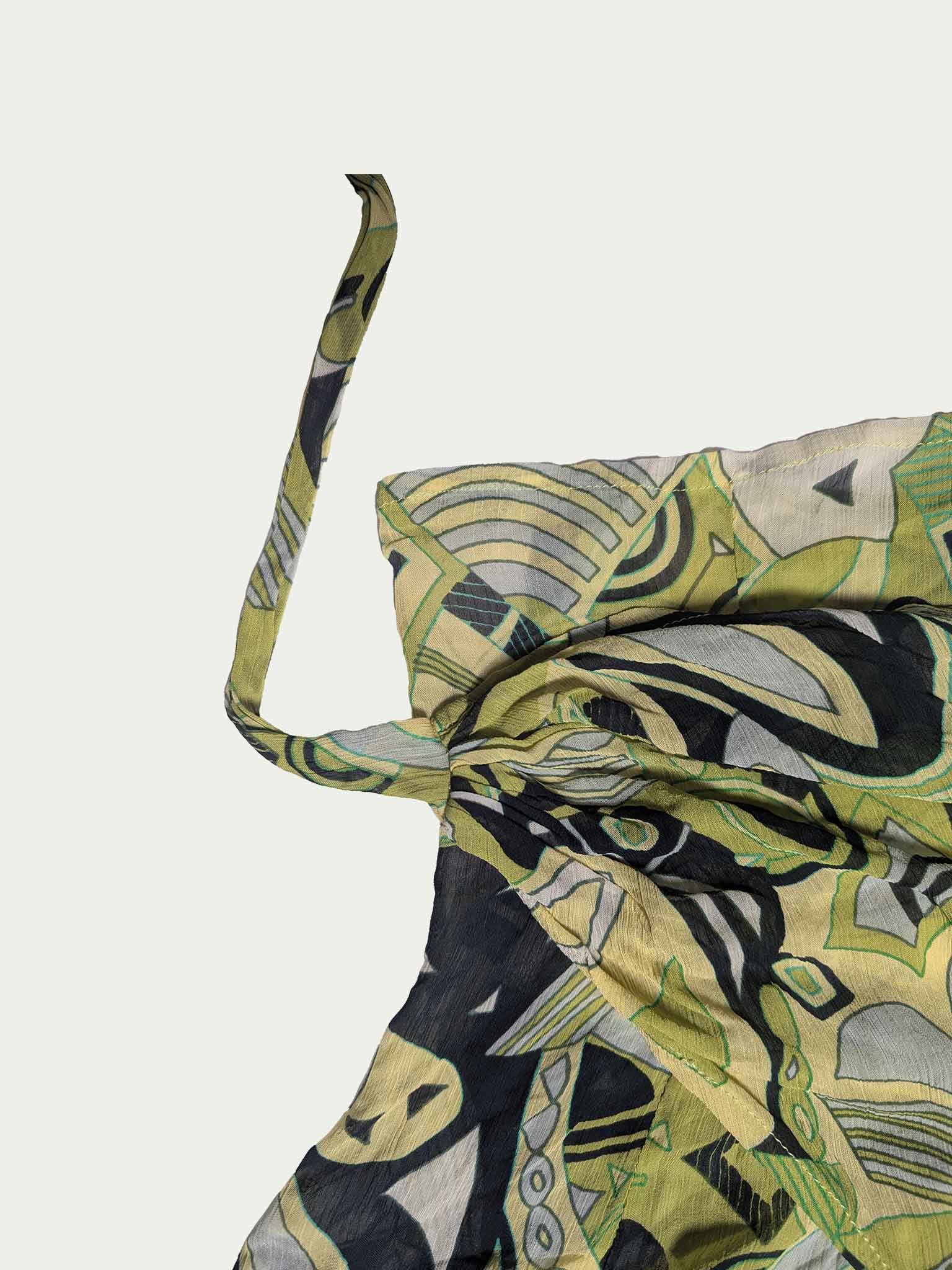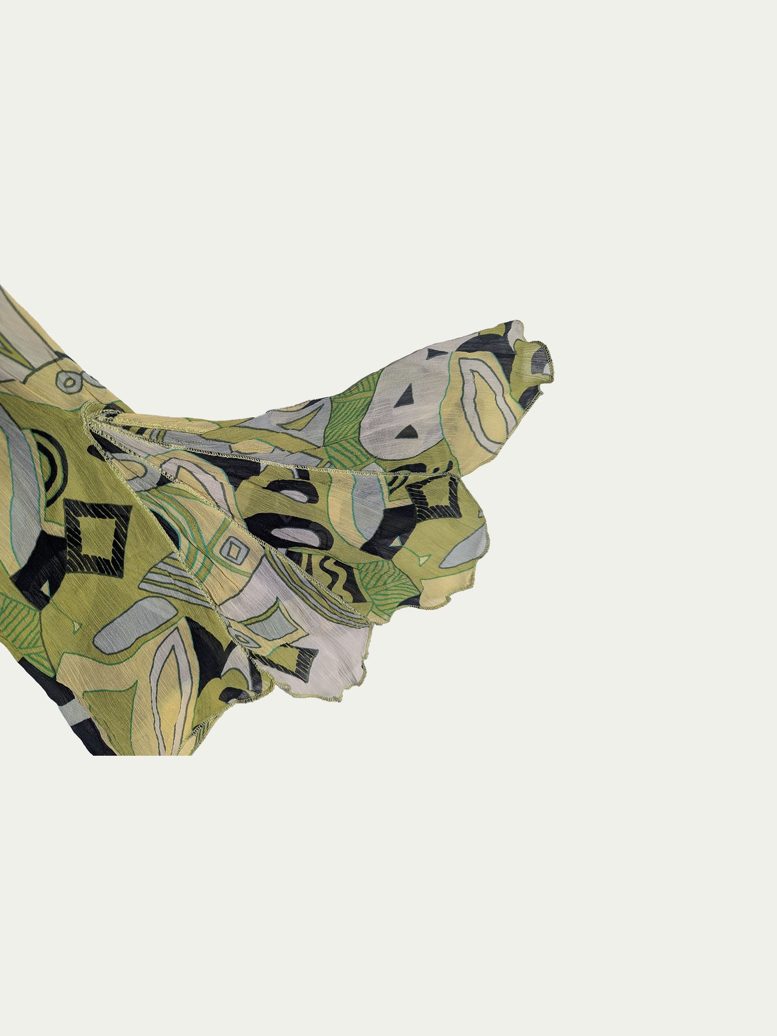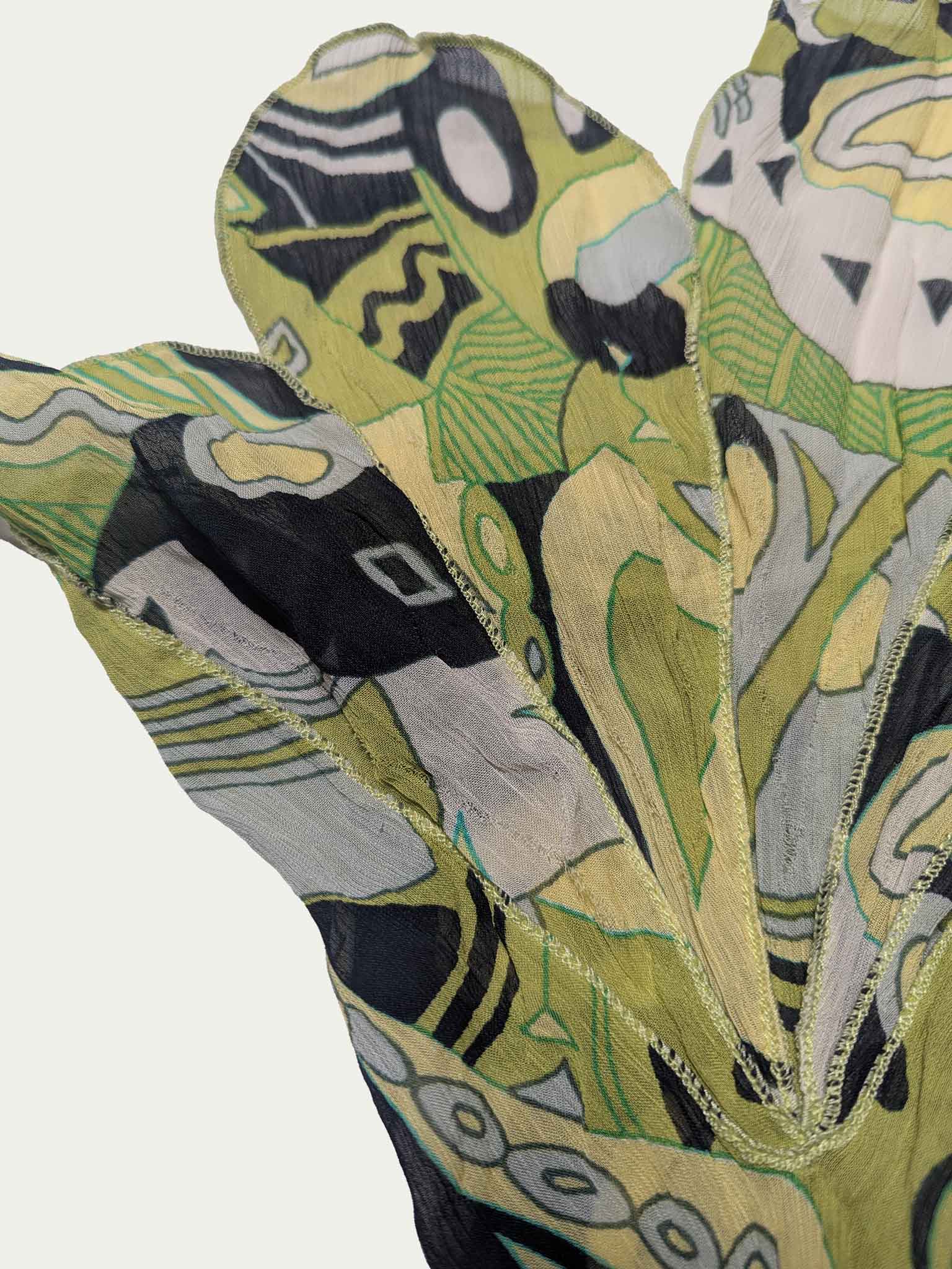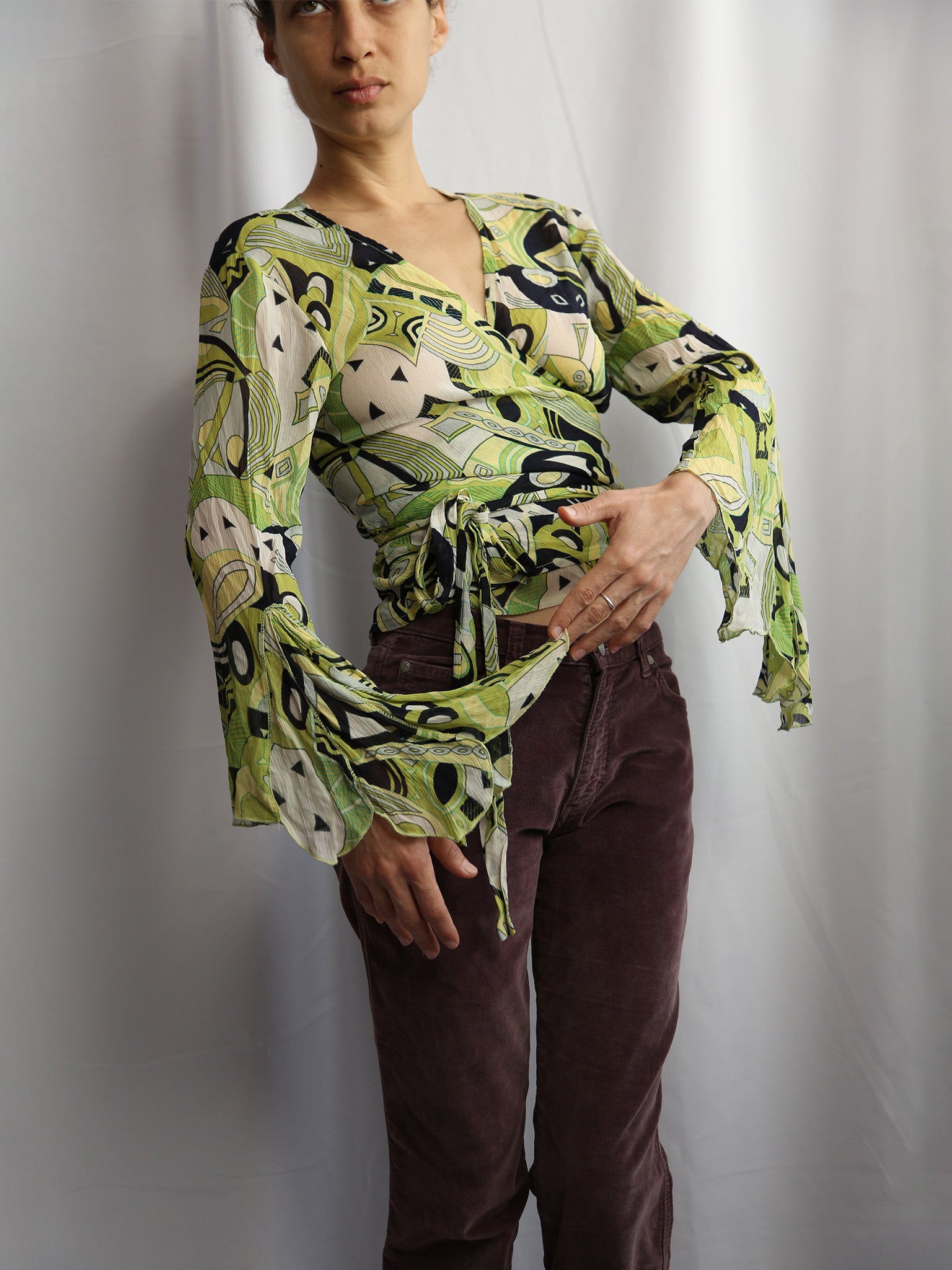 Y2K Chiffon wrap top, in fresh green-lime tones, with beautiful flower-shaped fan sleeves.