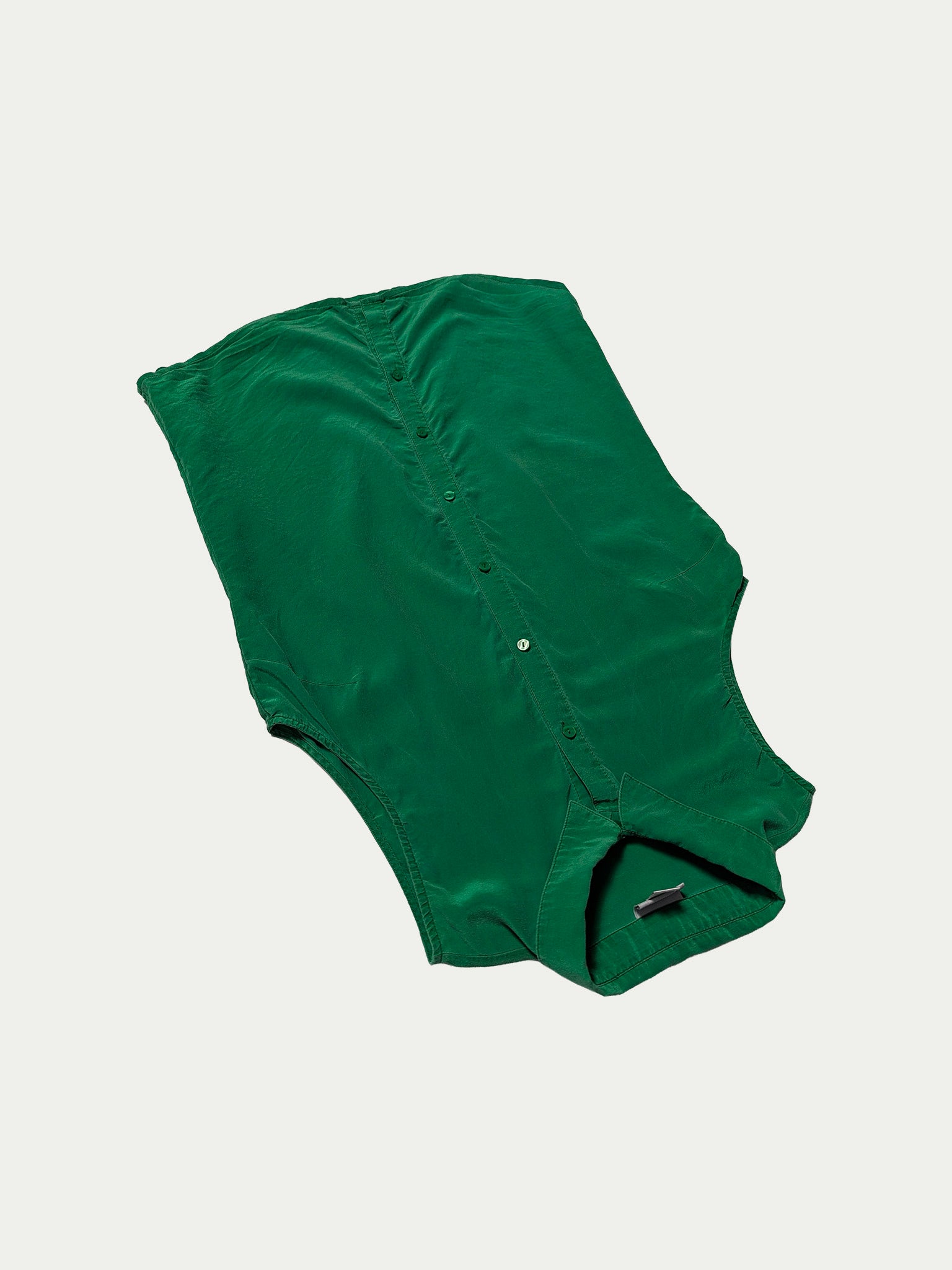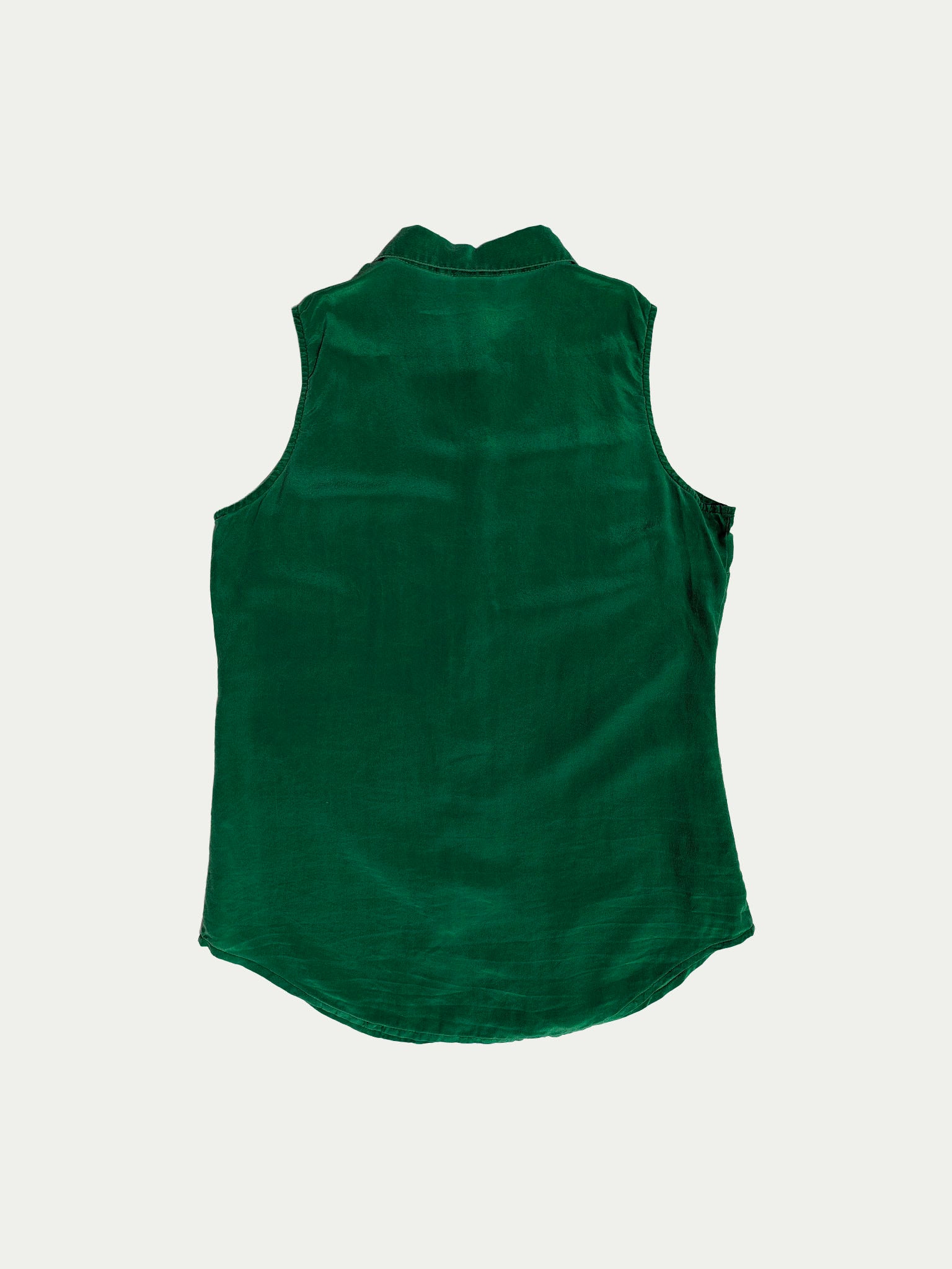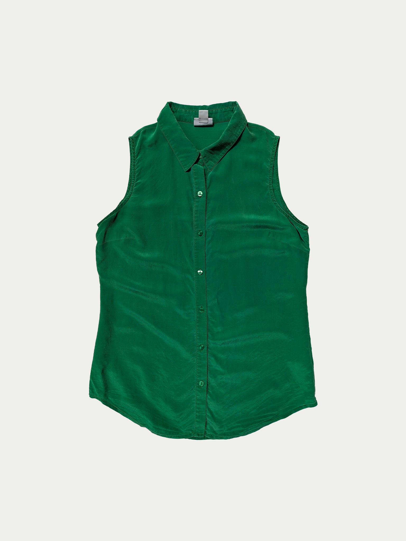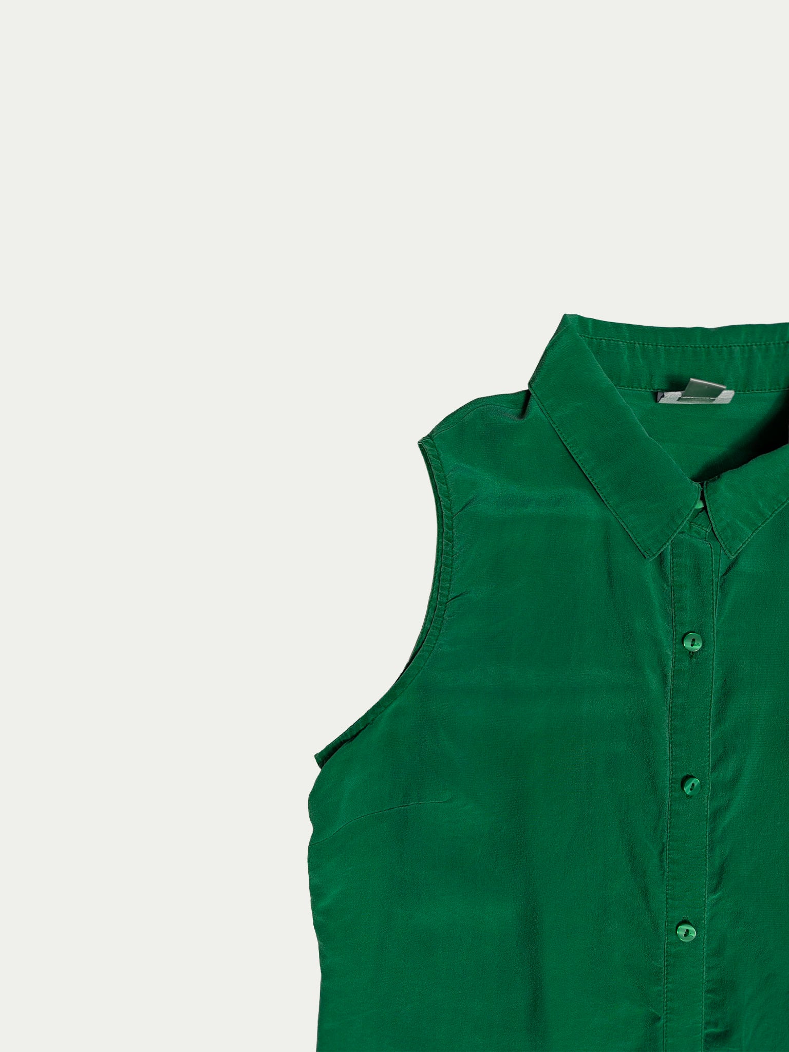 Vintage silk vest-shaped blouse in a bold yet soft green shade. Features small matching buttons and a classic pointed collar. In great condition.