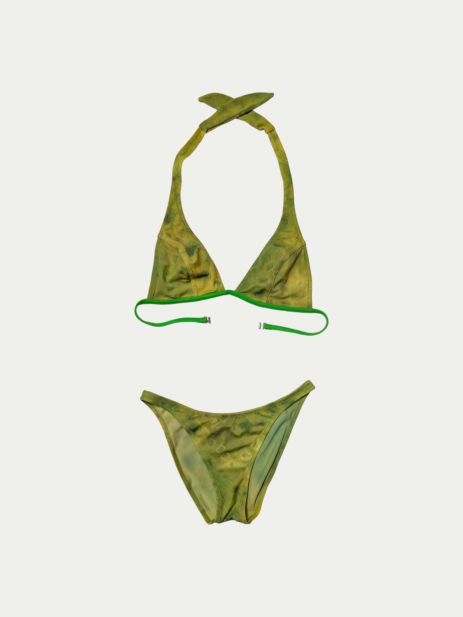 Late 90s bikini in lively green shades with a tie-dye style print. Features a tie-neck bra with a metal back closure and a high-waisted bottom. In great, like-new condition.
