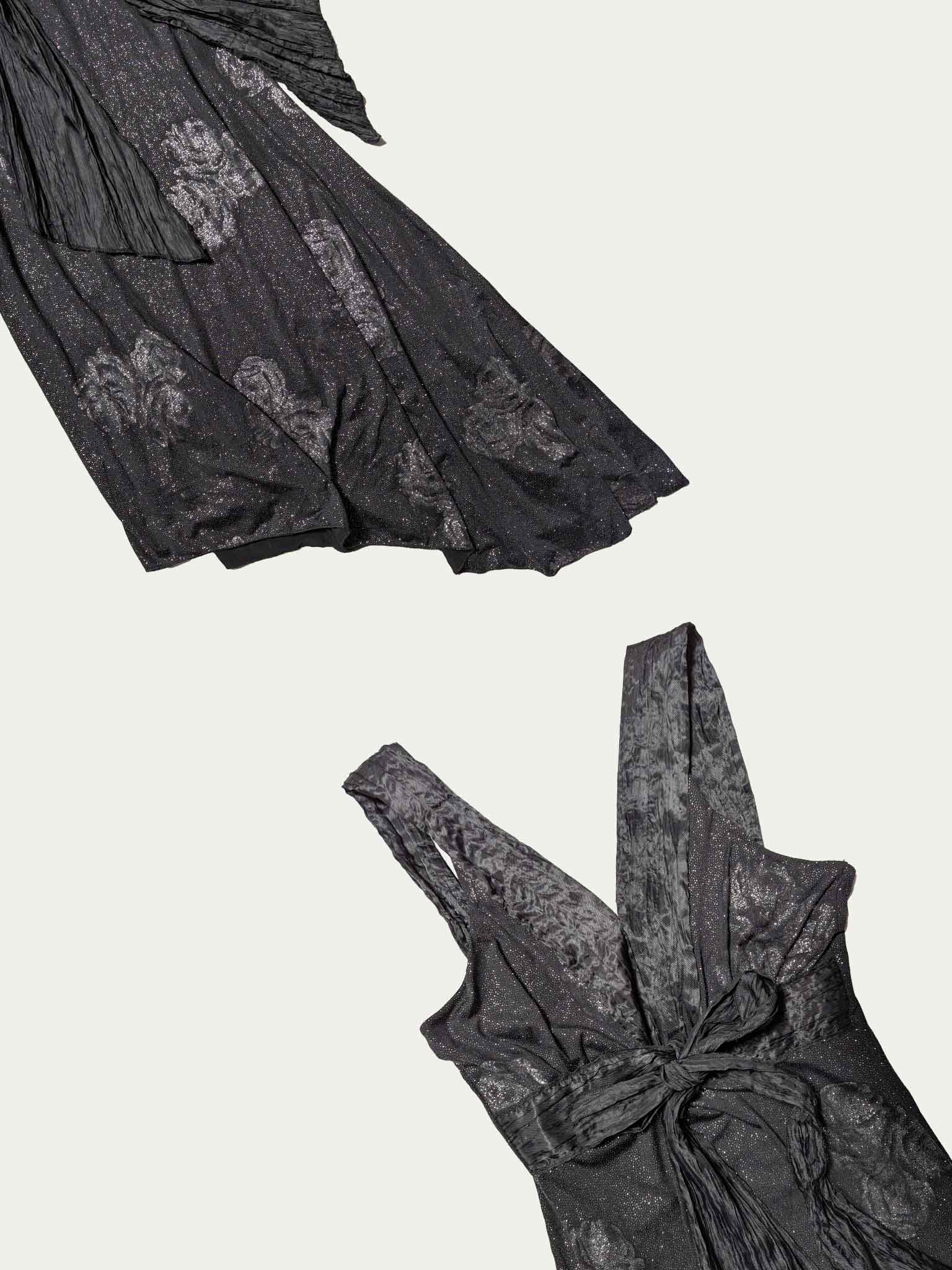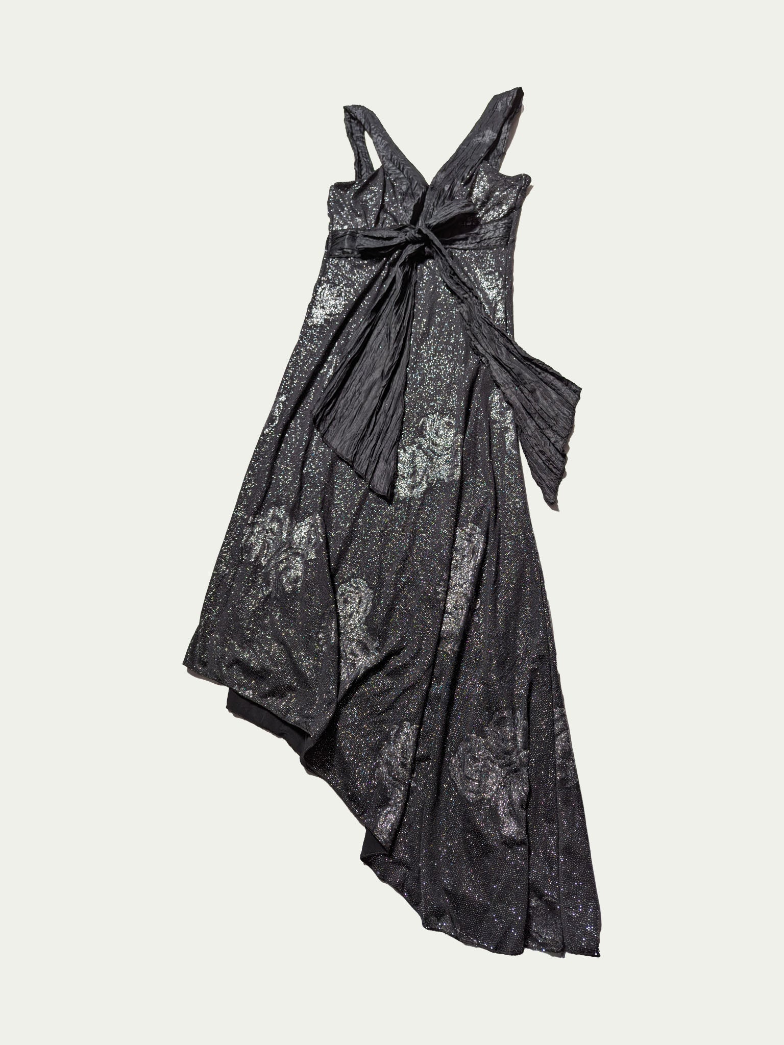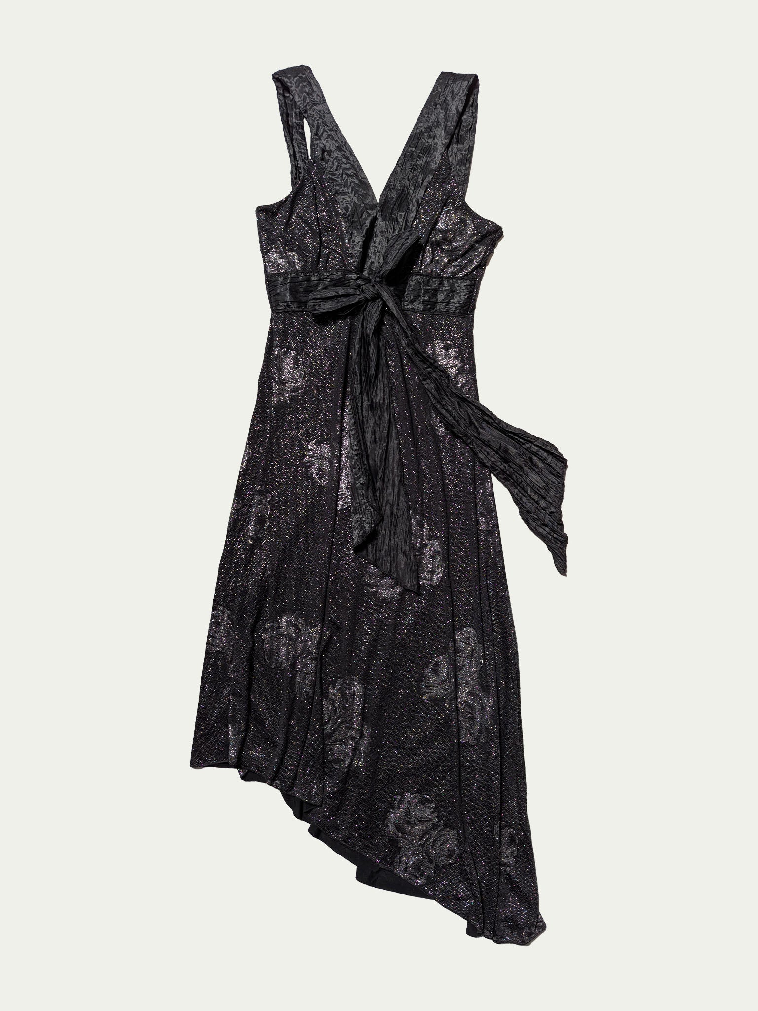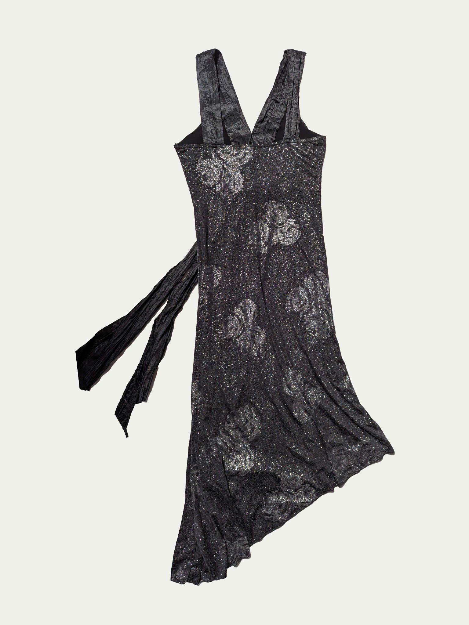 Y2K glittery evening maxi dress, with a diagonal hemline, and extra long under-chest tie ribbons.