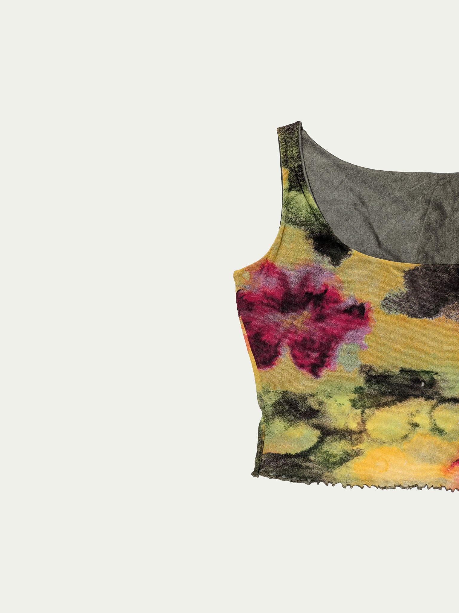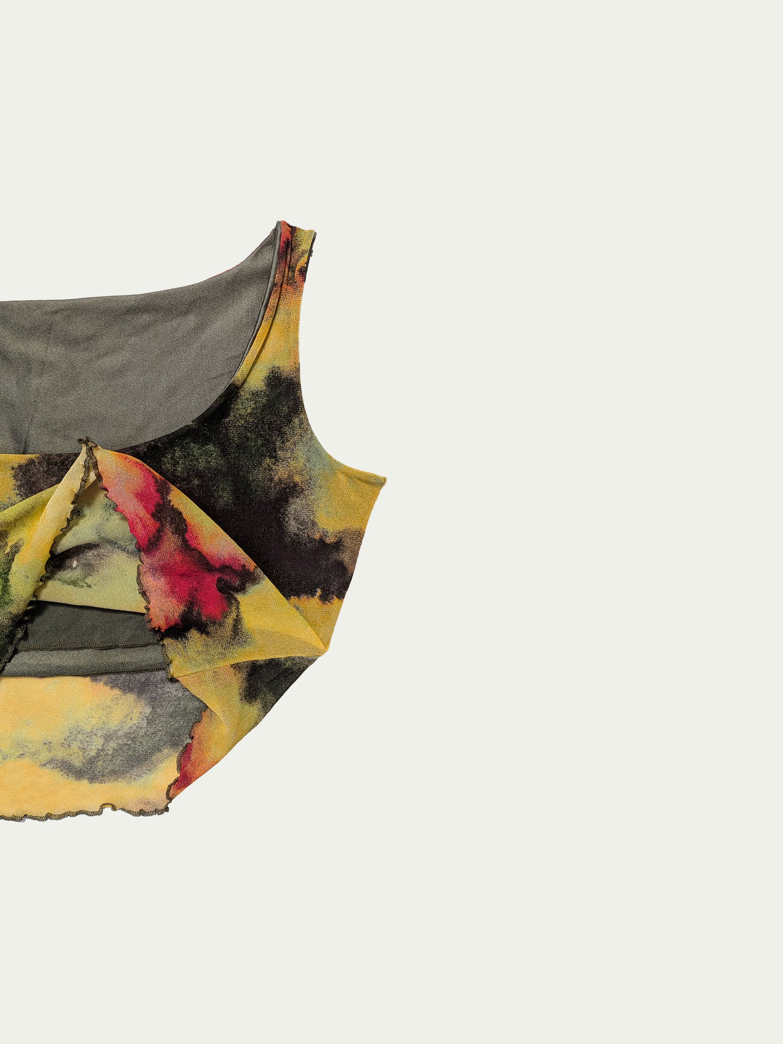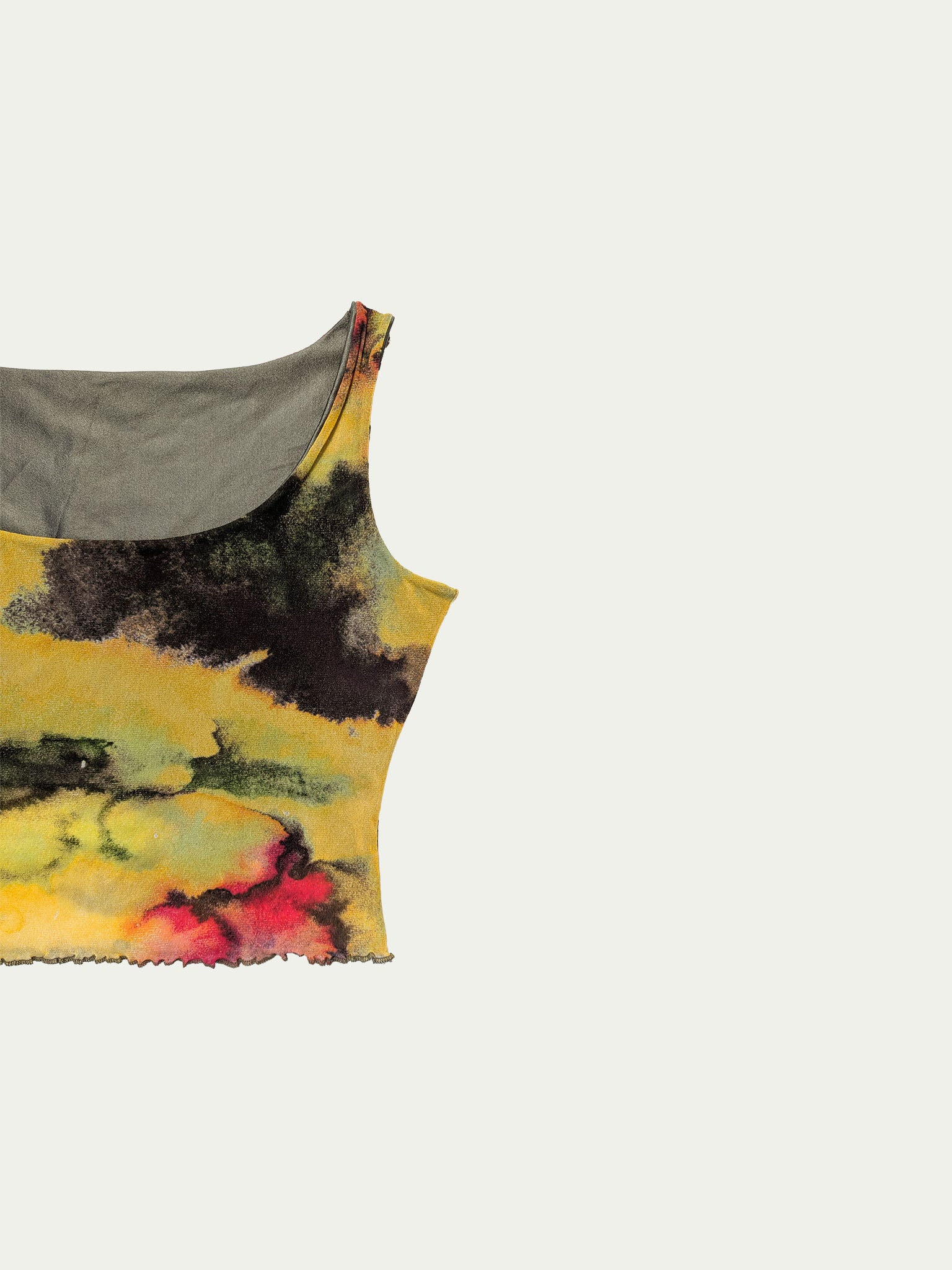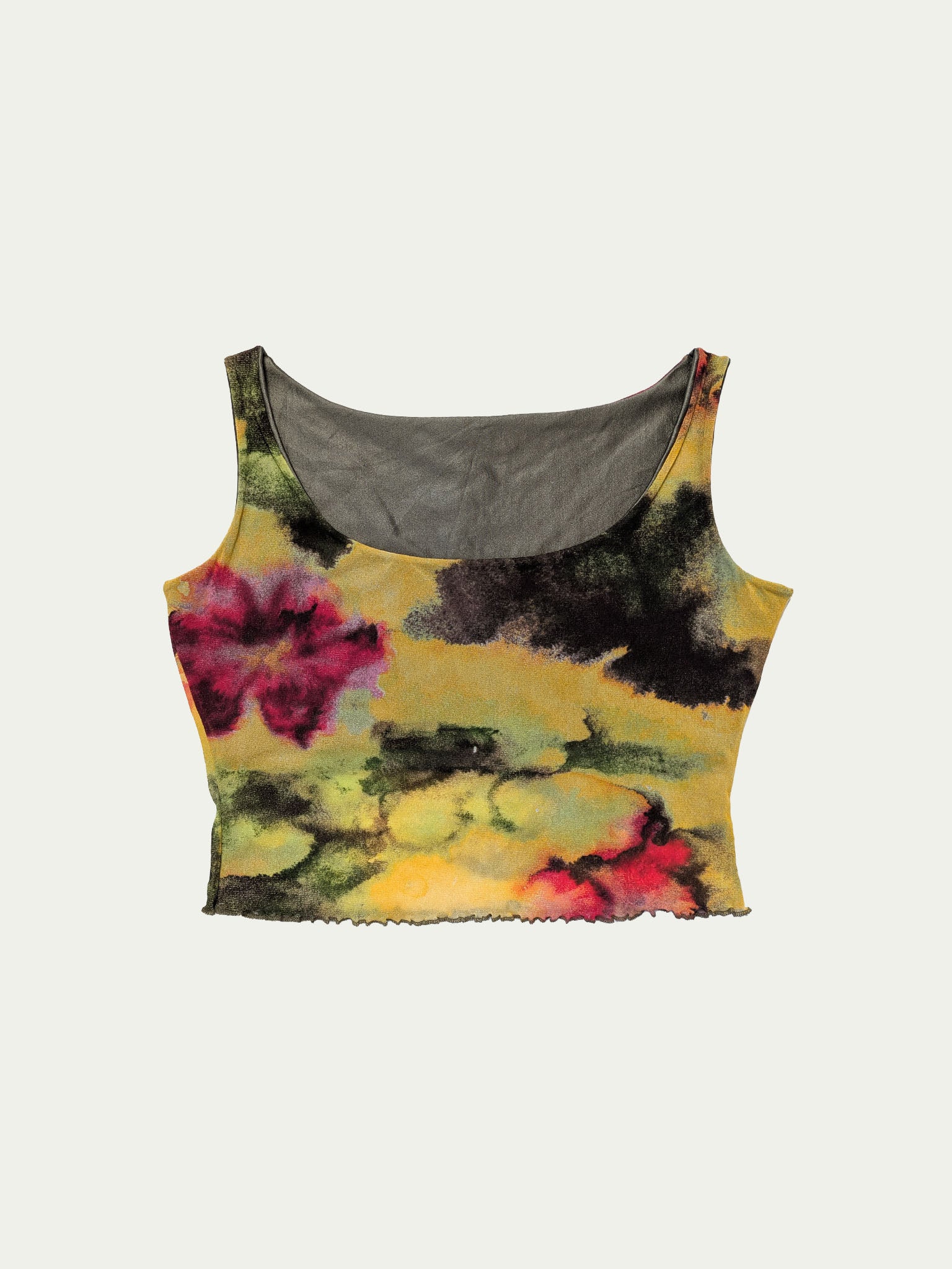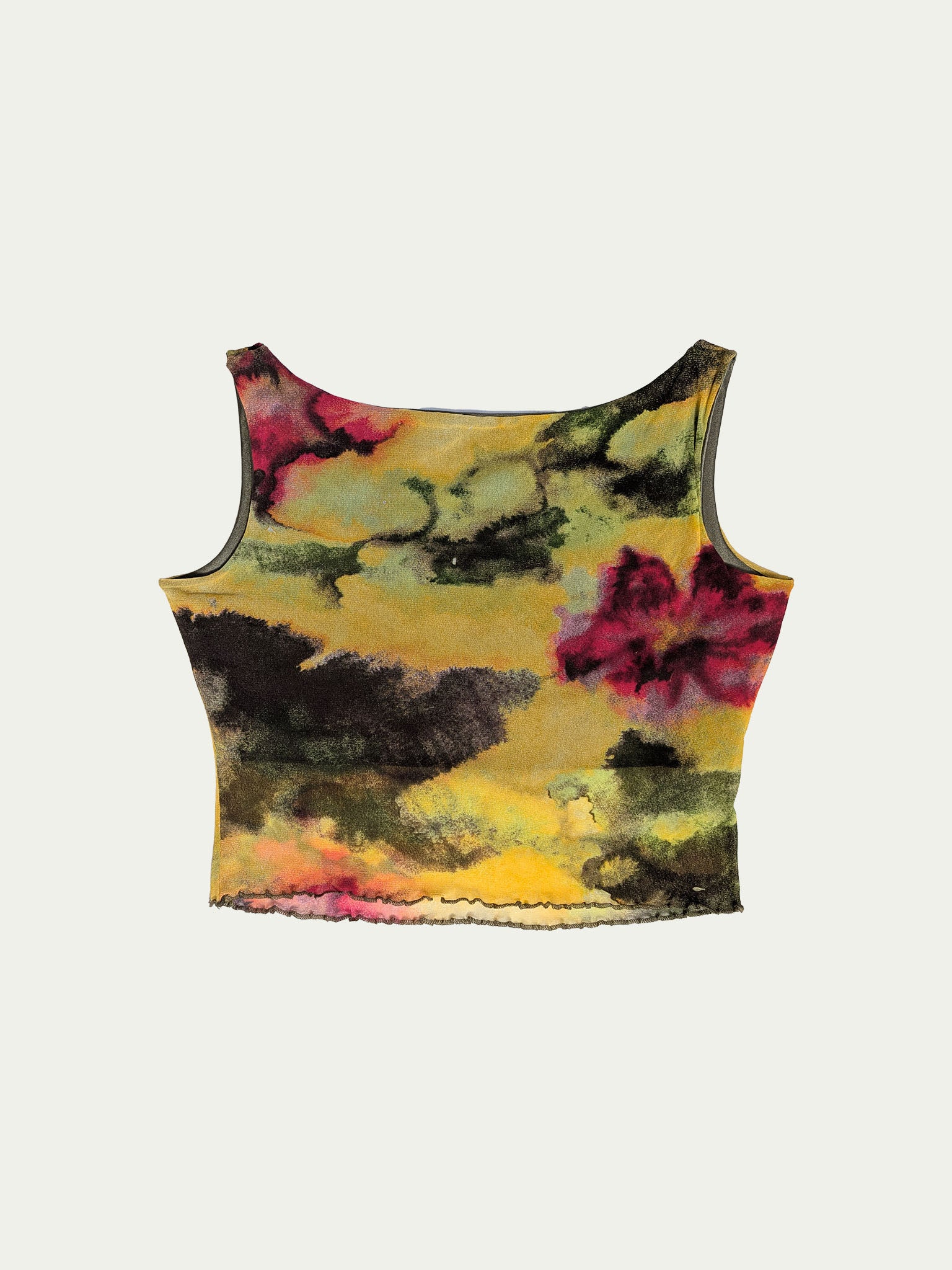 Y2K mesh cropped tank top, with a beautiful unique print in warm shades, an extra-cropped elastic lining, and a wide square cleavage.