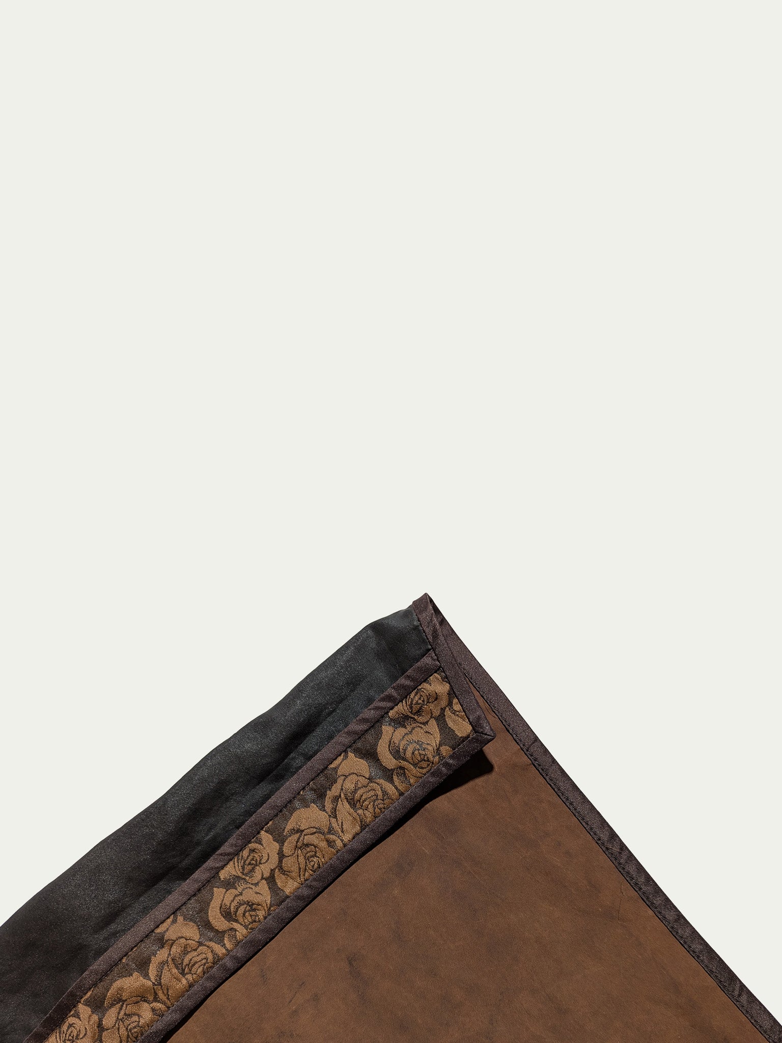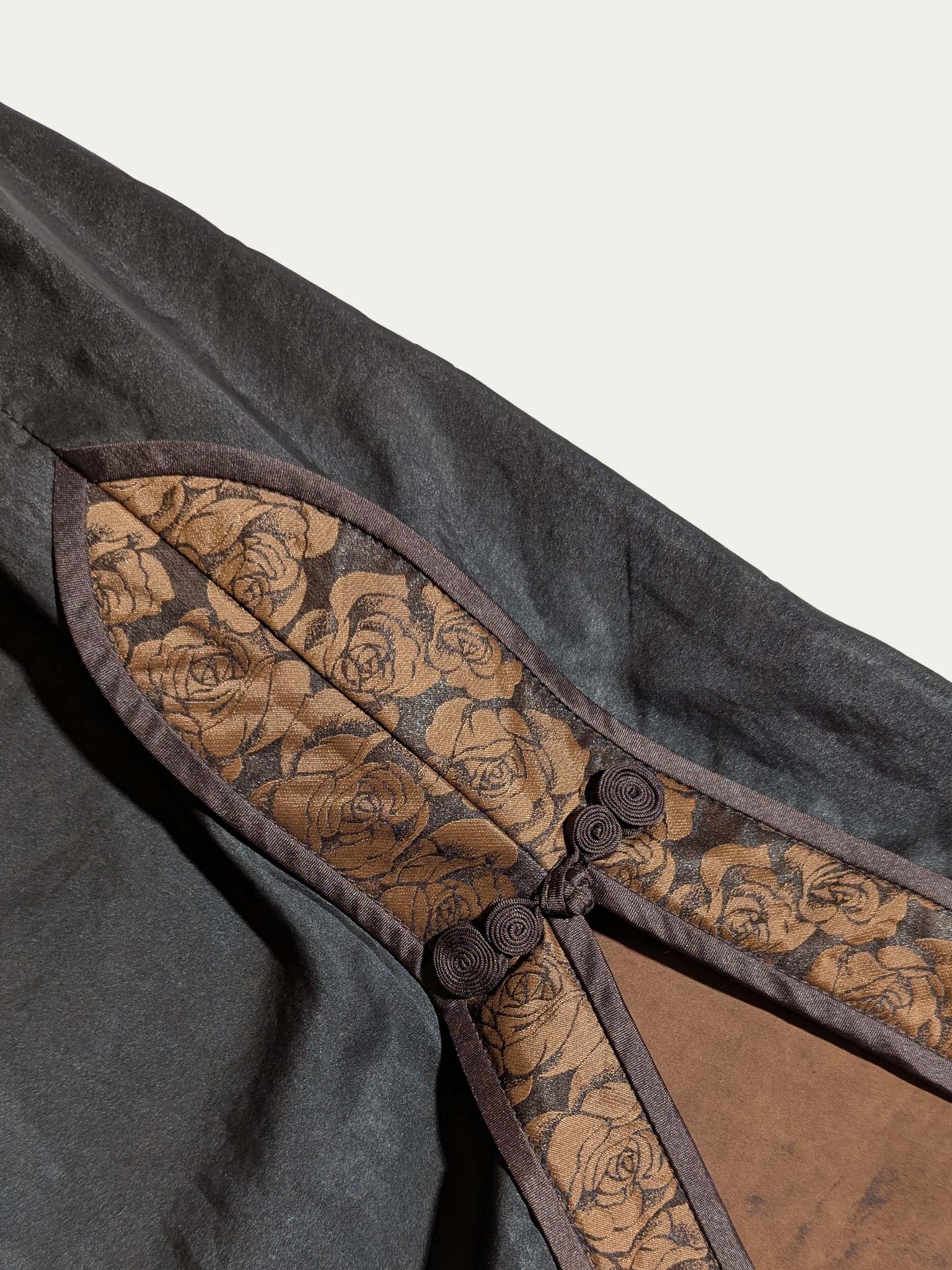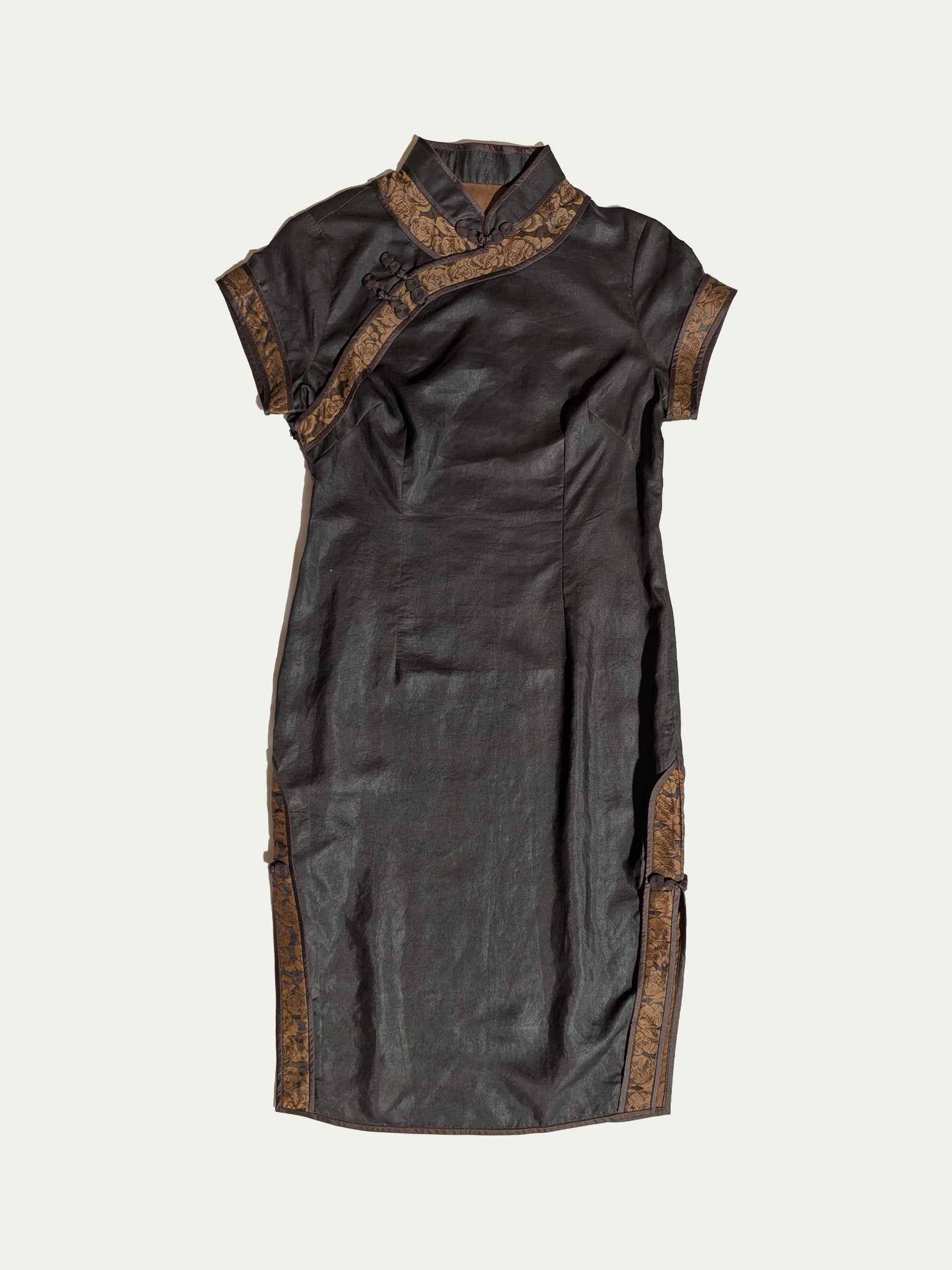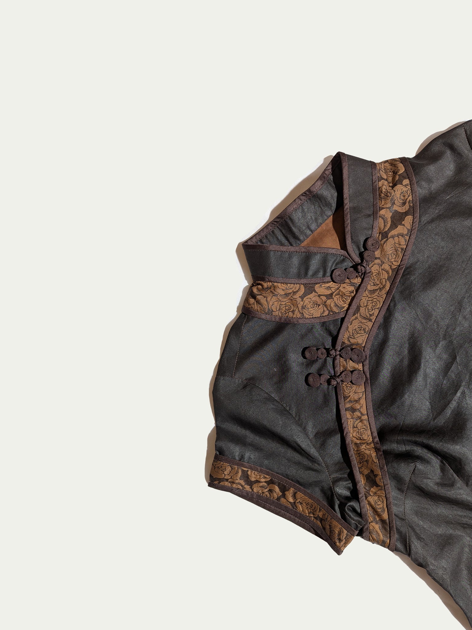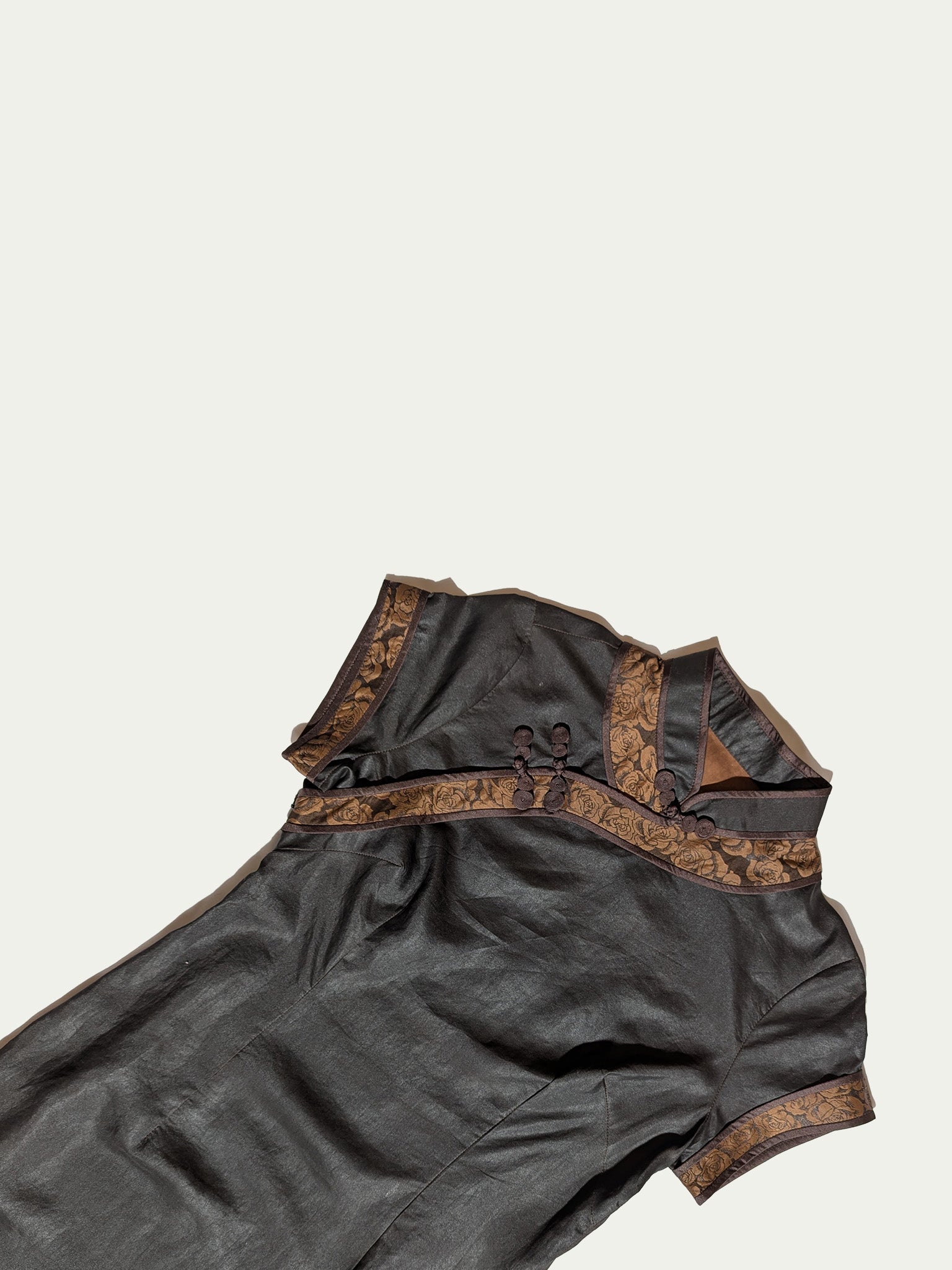 90's Japanese dress in a traditional Chinese cut, made of three different silk fabrics in brown golden shades and a roses texture.