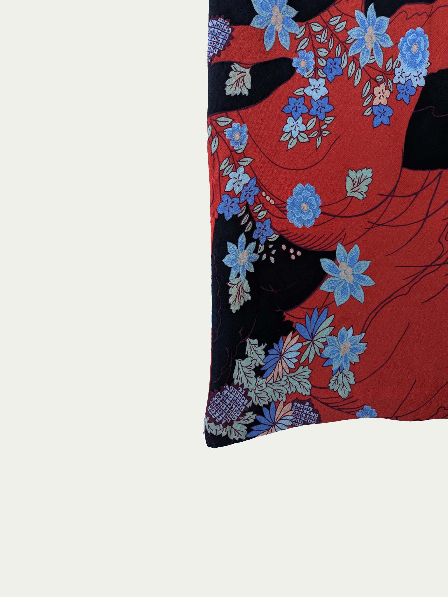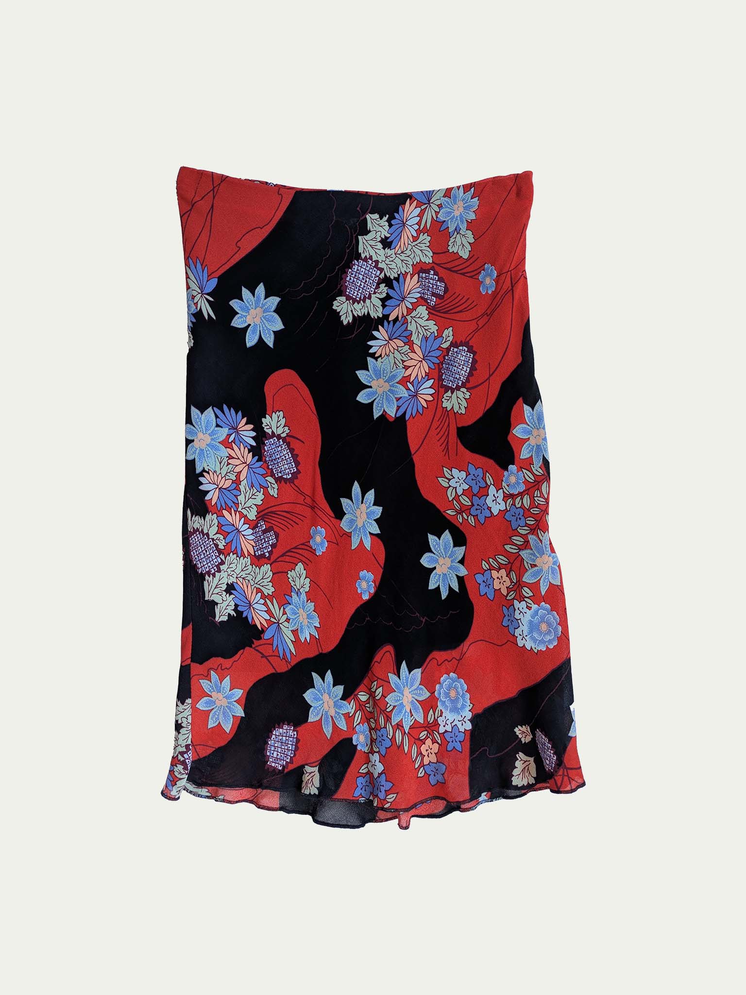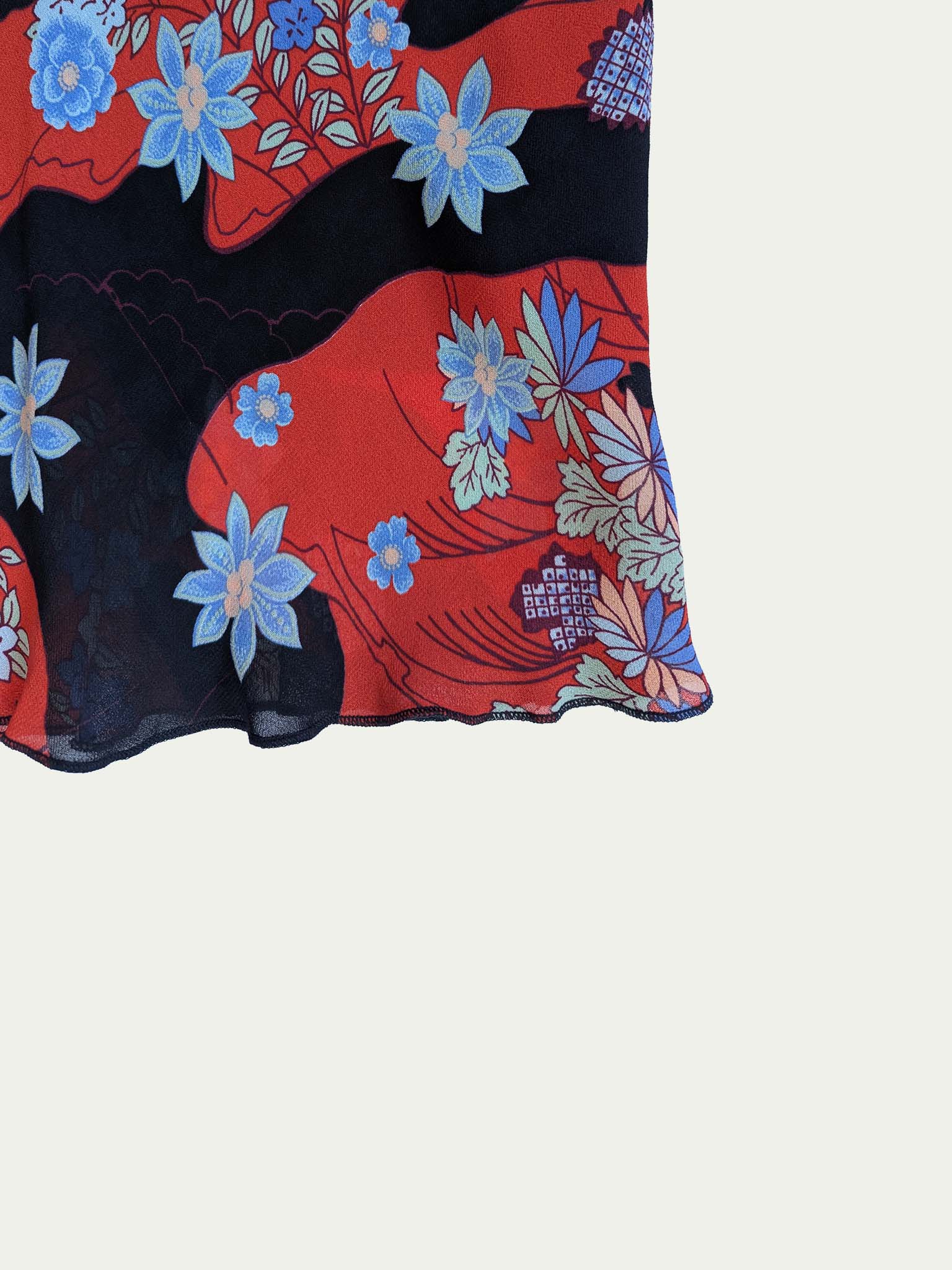 90's chiffon midi skirt, made of a slightly transparent viscose layer with a Japanese-style print, and an opaque lining.