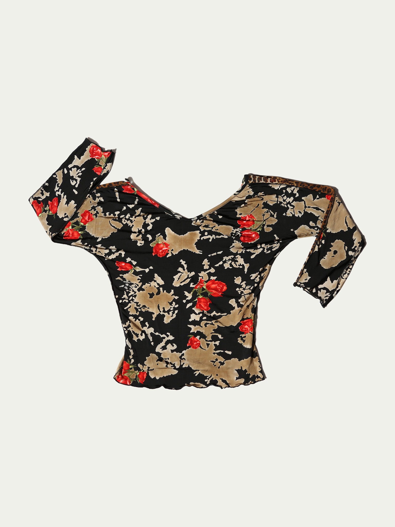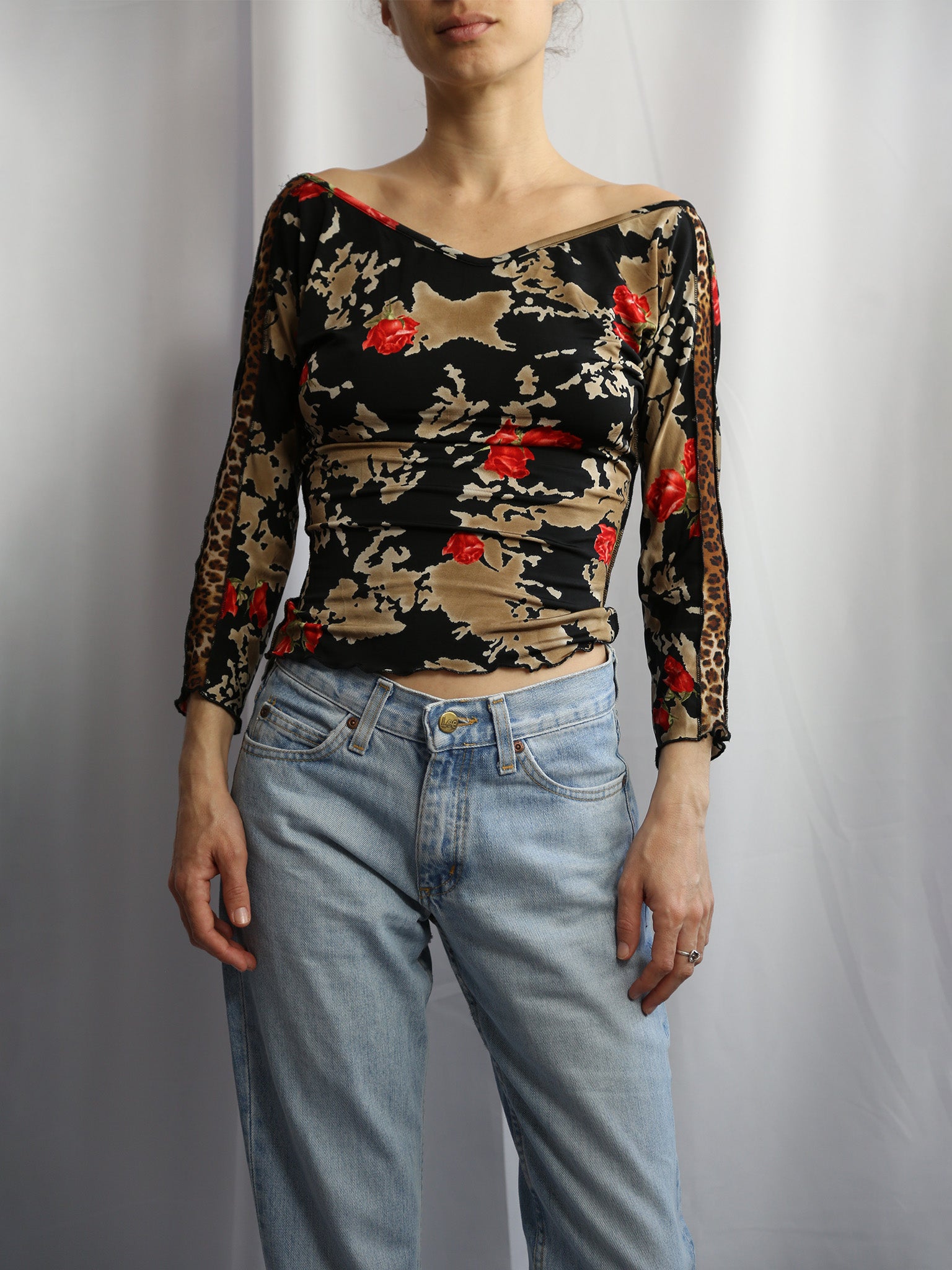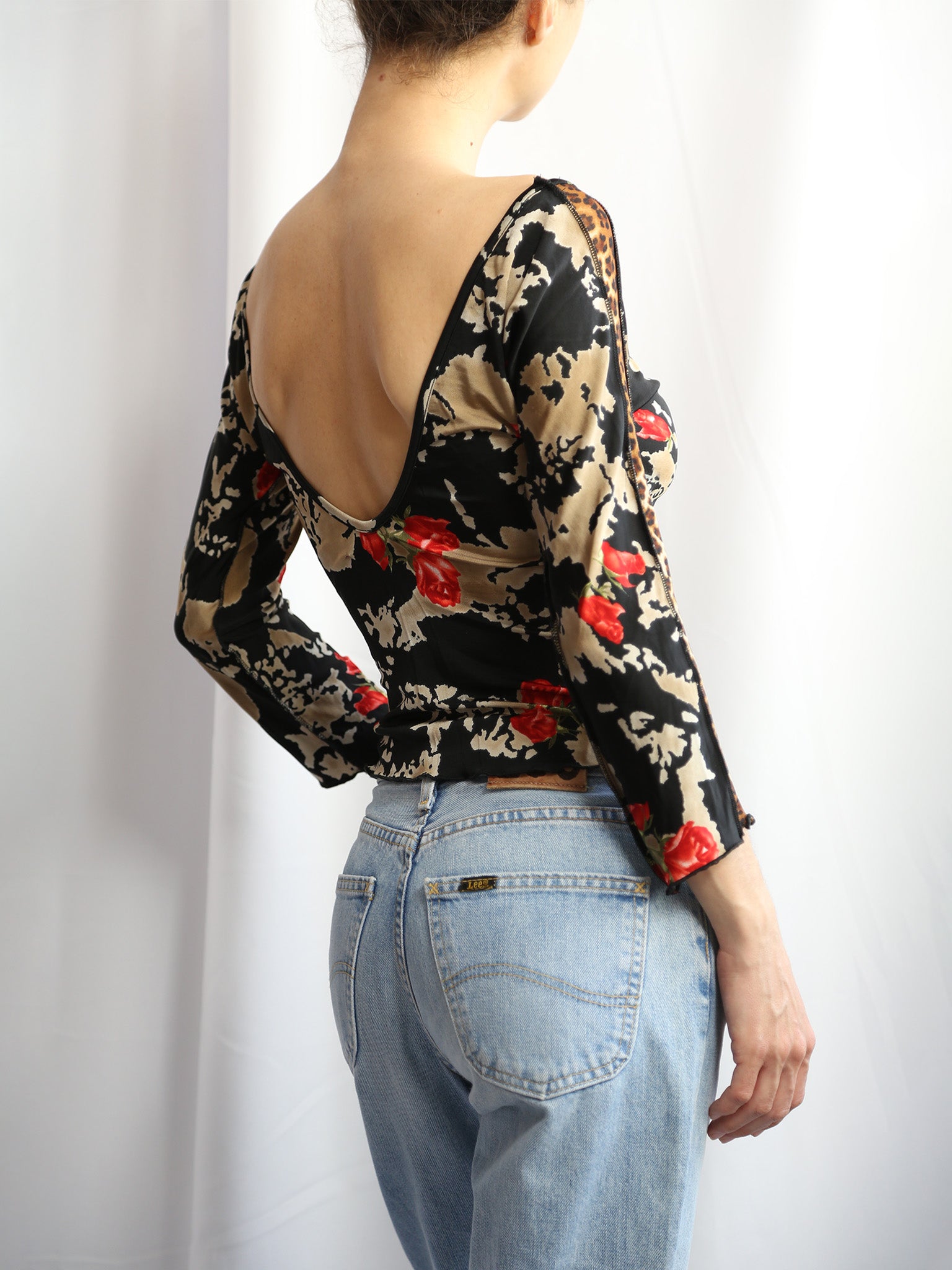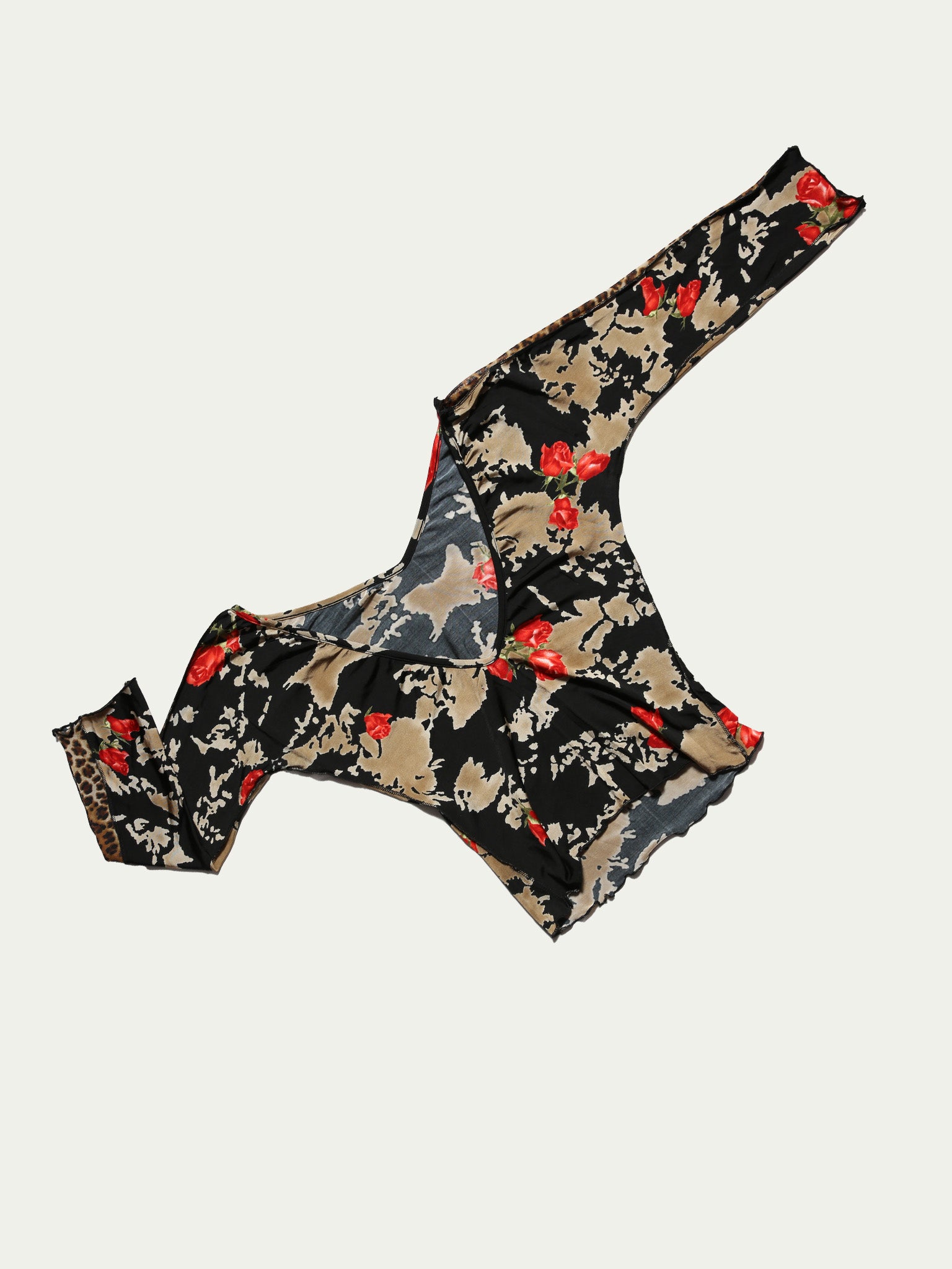 Features a deep back cleavage, and leopard mesh straps along the sleeves.