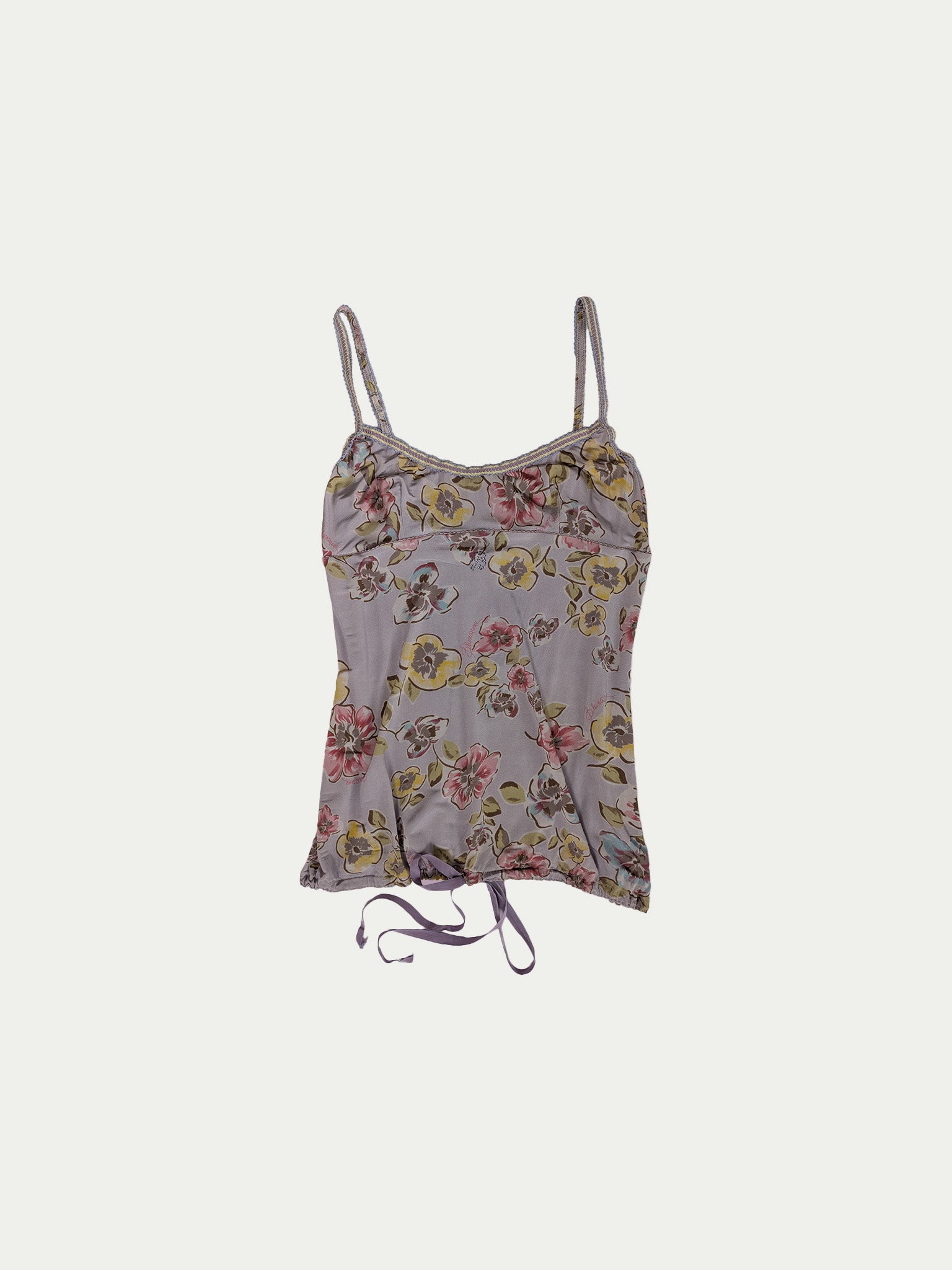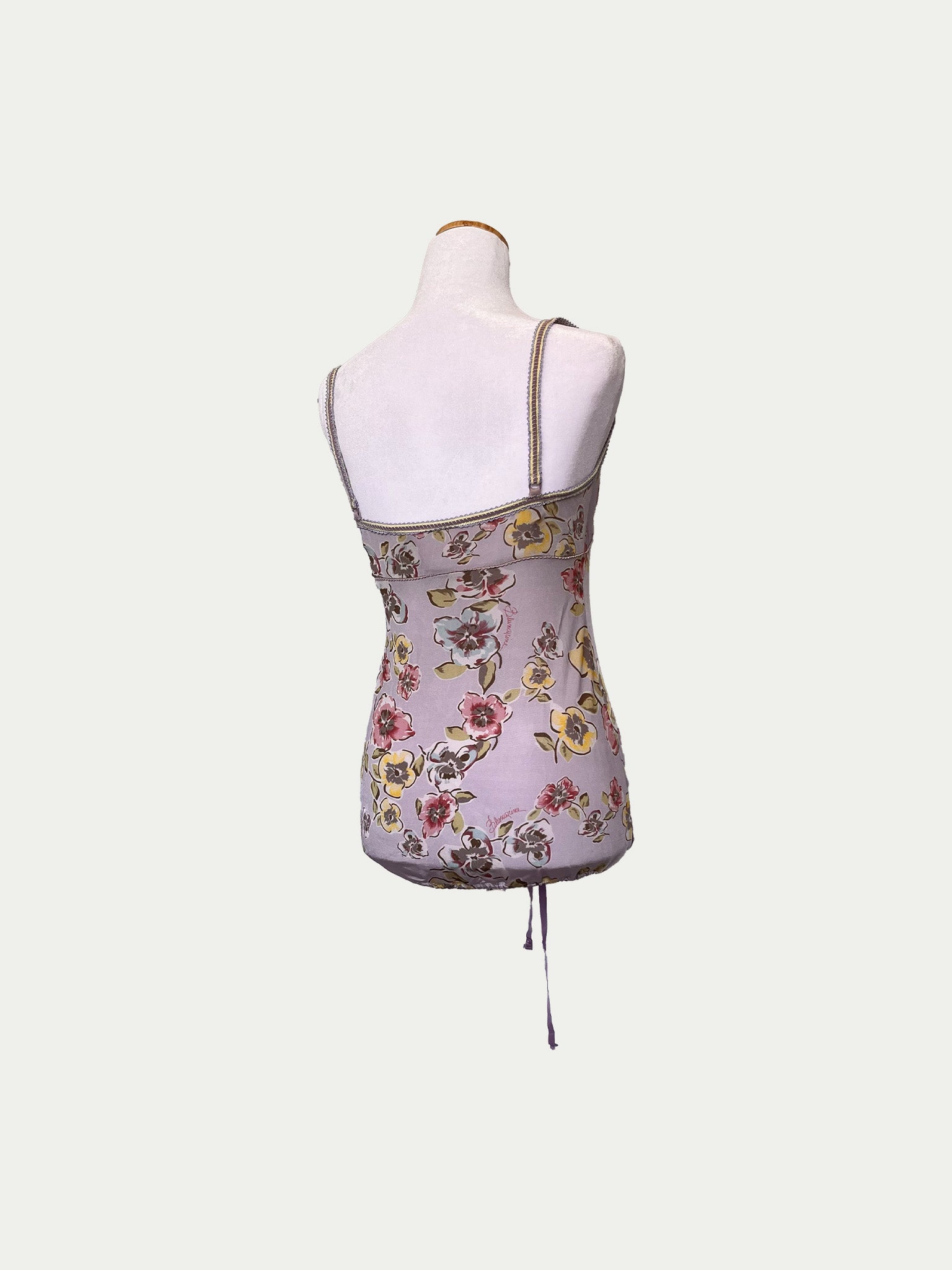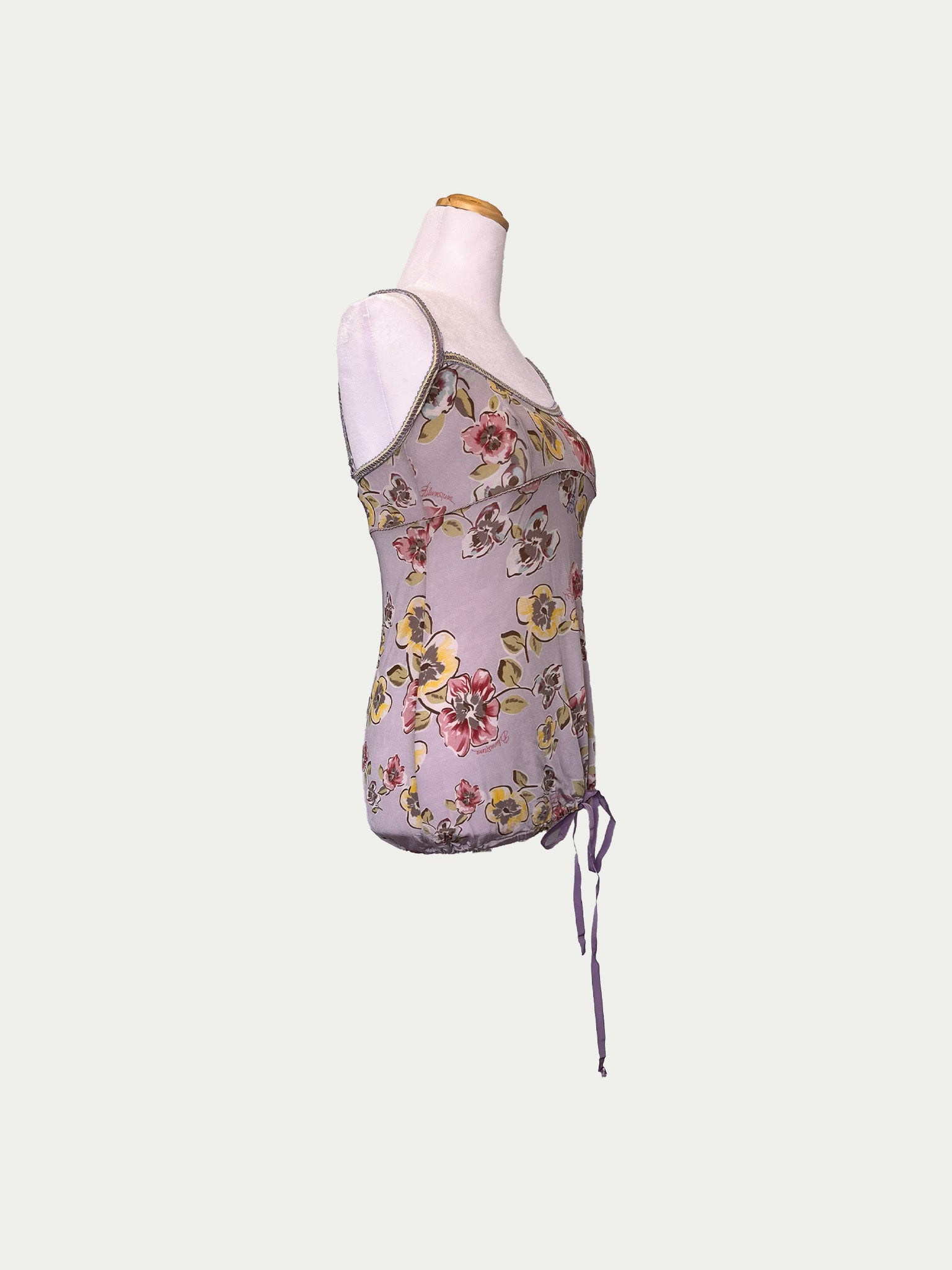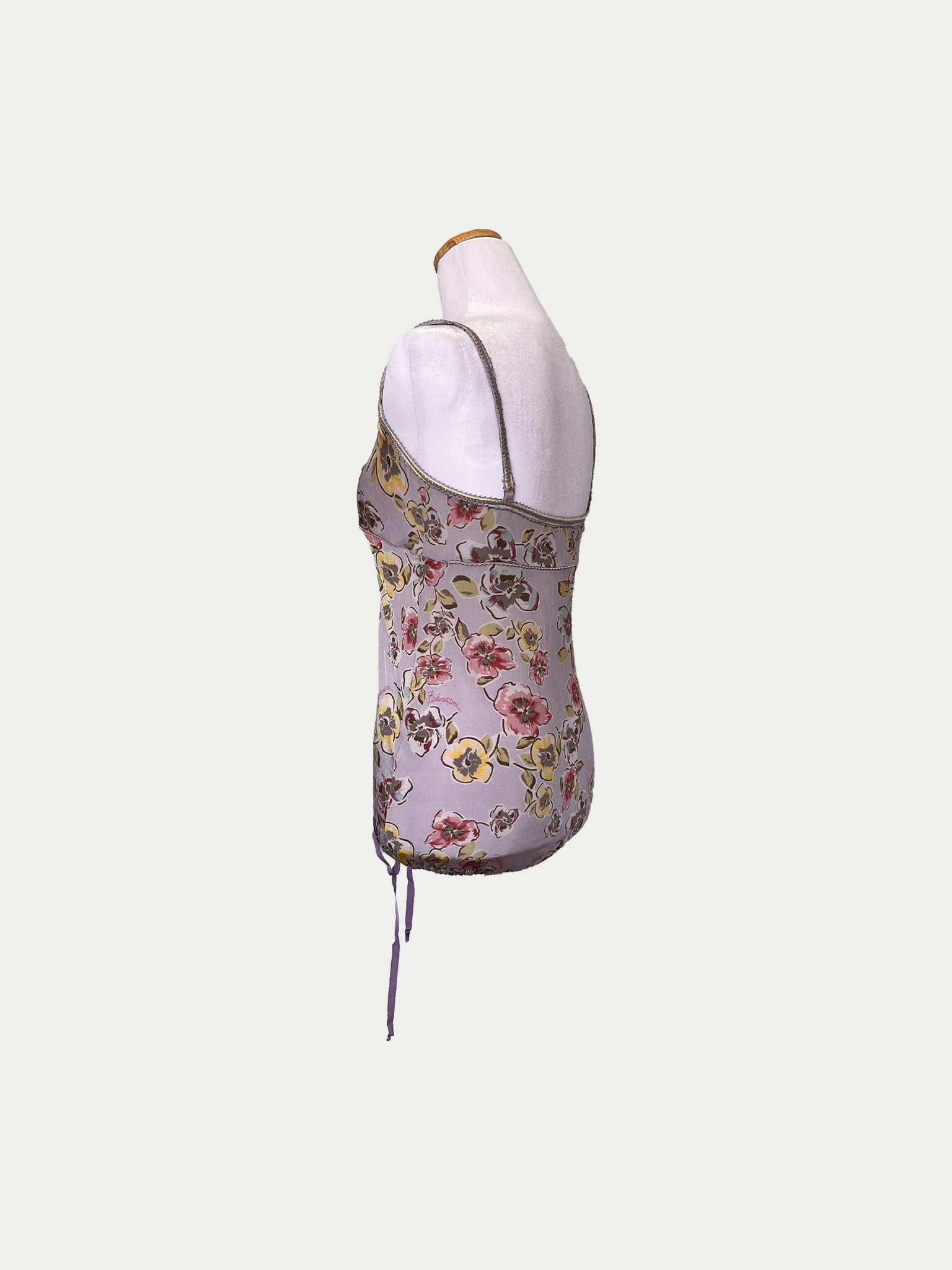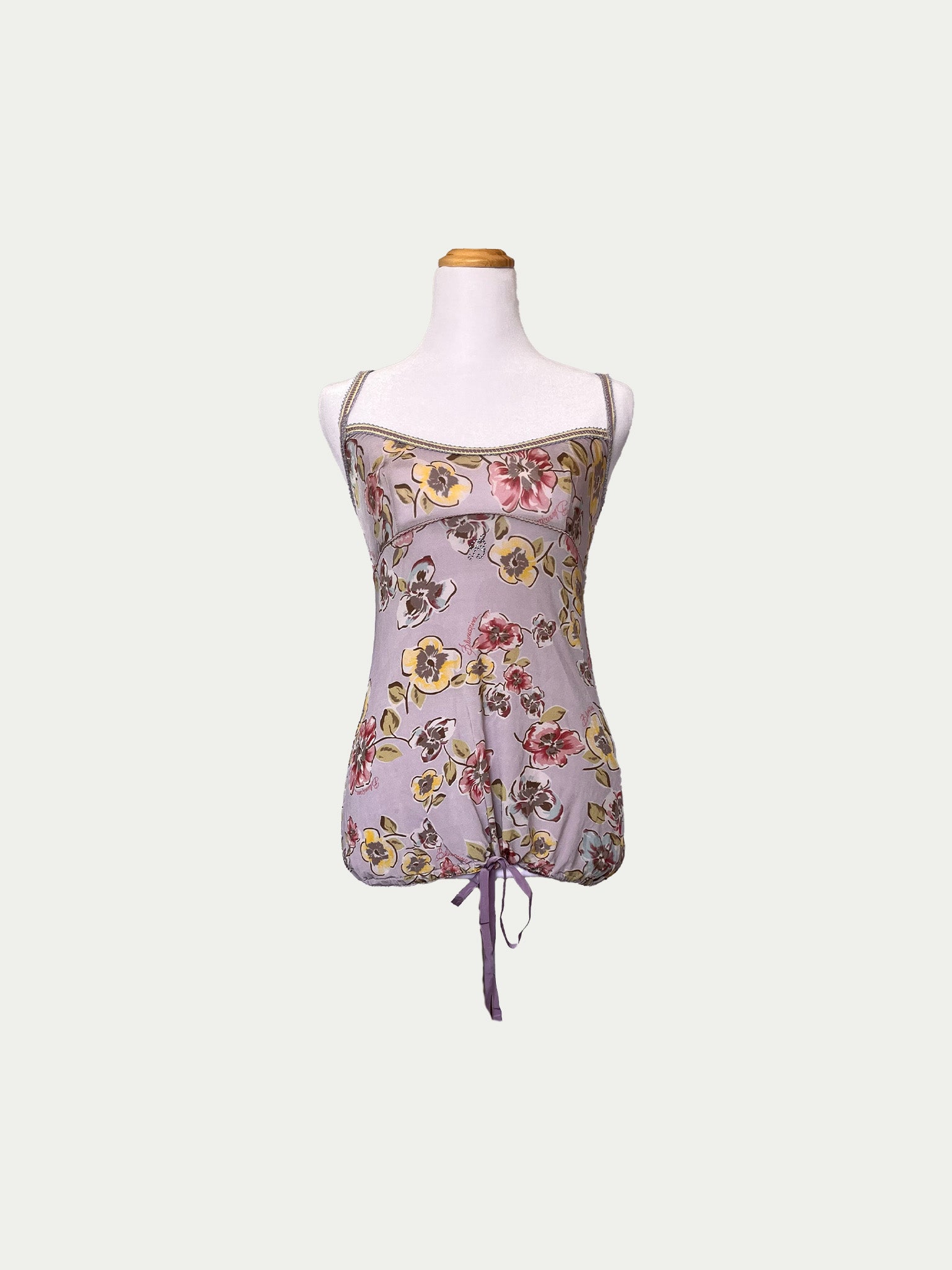 Early 2000s top by Blumarine in a dreamy lilac shade with a unique original floral print. The chest is designed with corset-inspired structure – a wide, deep neckline and a defined underbust line, flattering for both smaller and fuller busts. Features beautifully detailed elastic straps and an elastic hem lacing for a flexible waist fit (higher or lower).