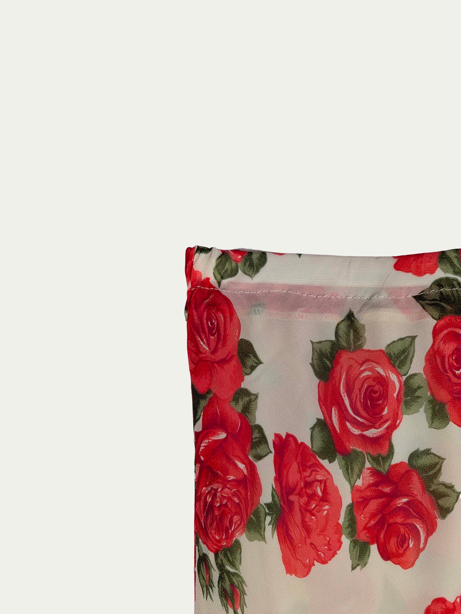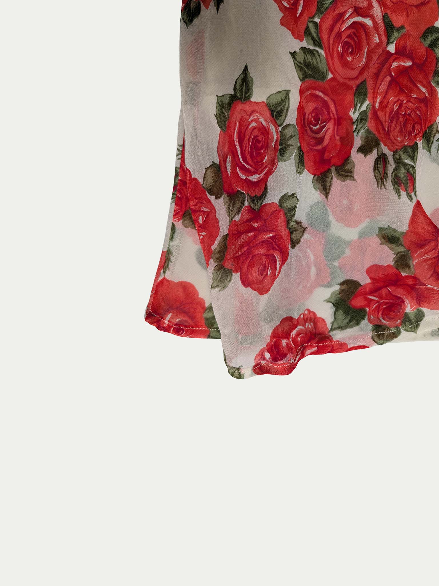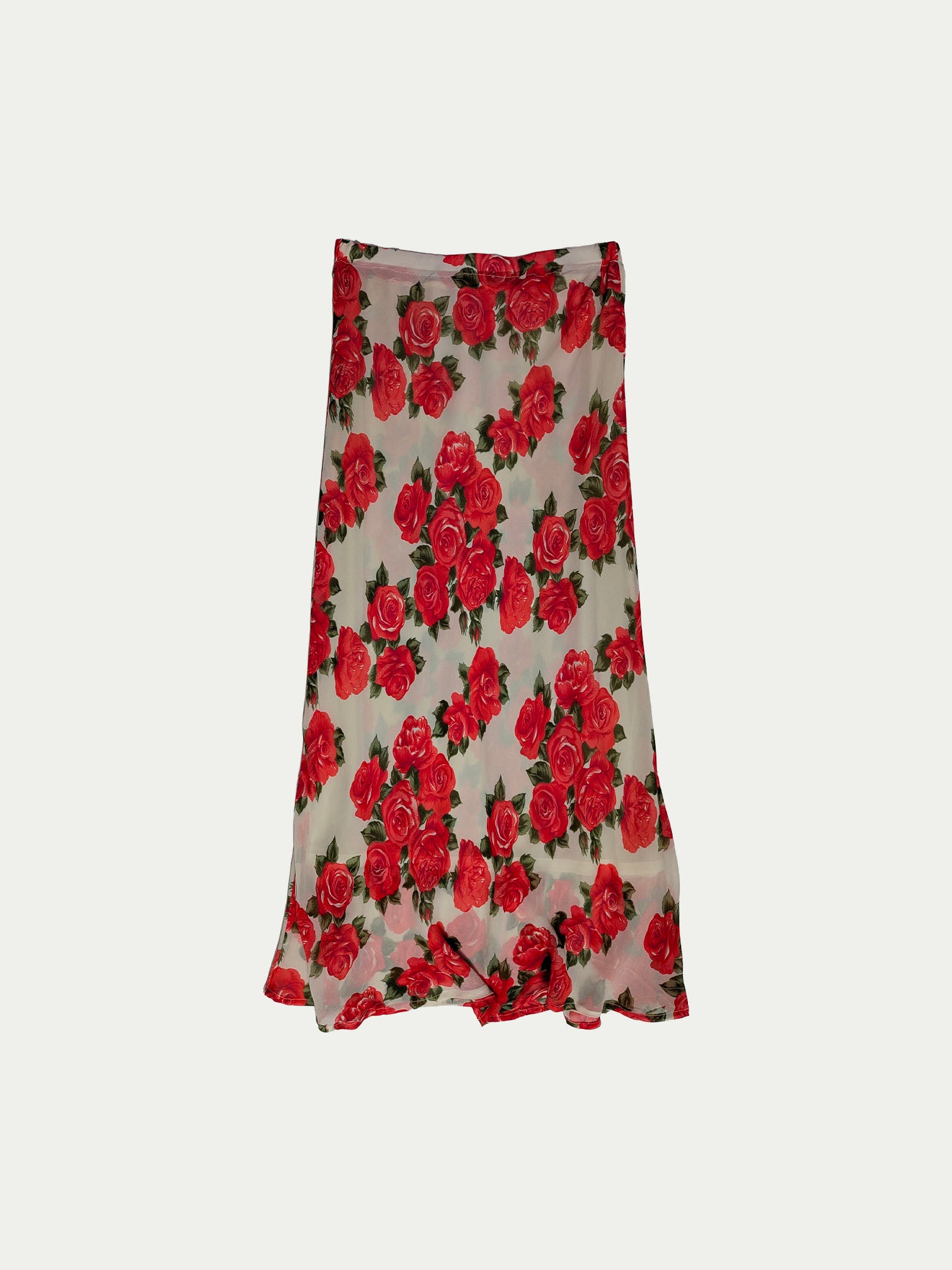90s maxi viscose skirt in cream-white, featuring a beautiful rose print. Mid-low rise with an elastic hidden waistband. Slightly sheer with a lining.