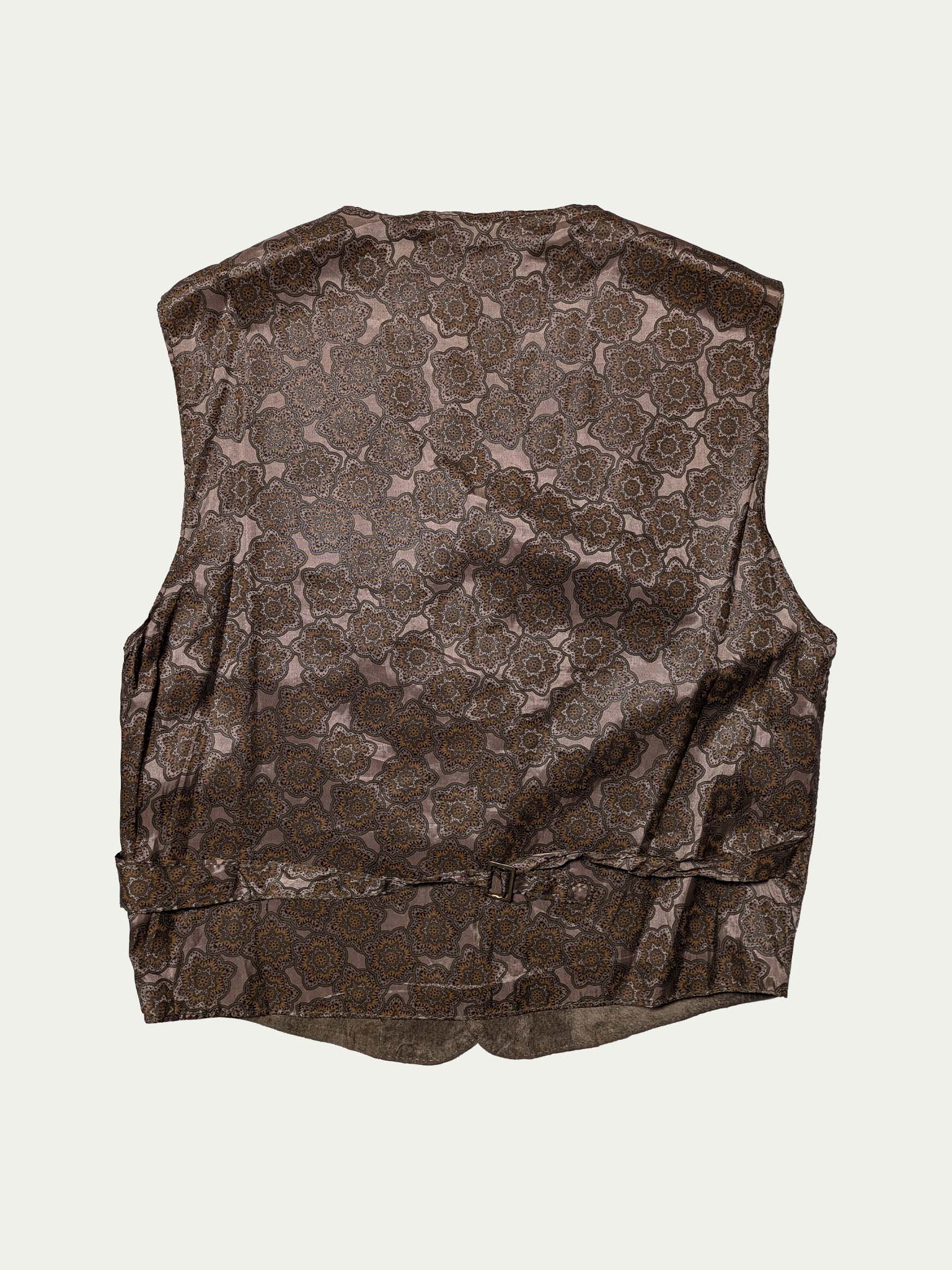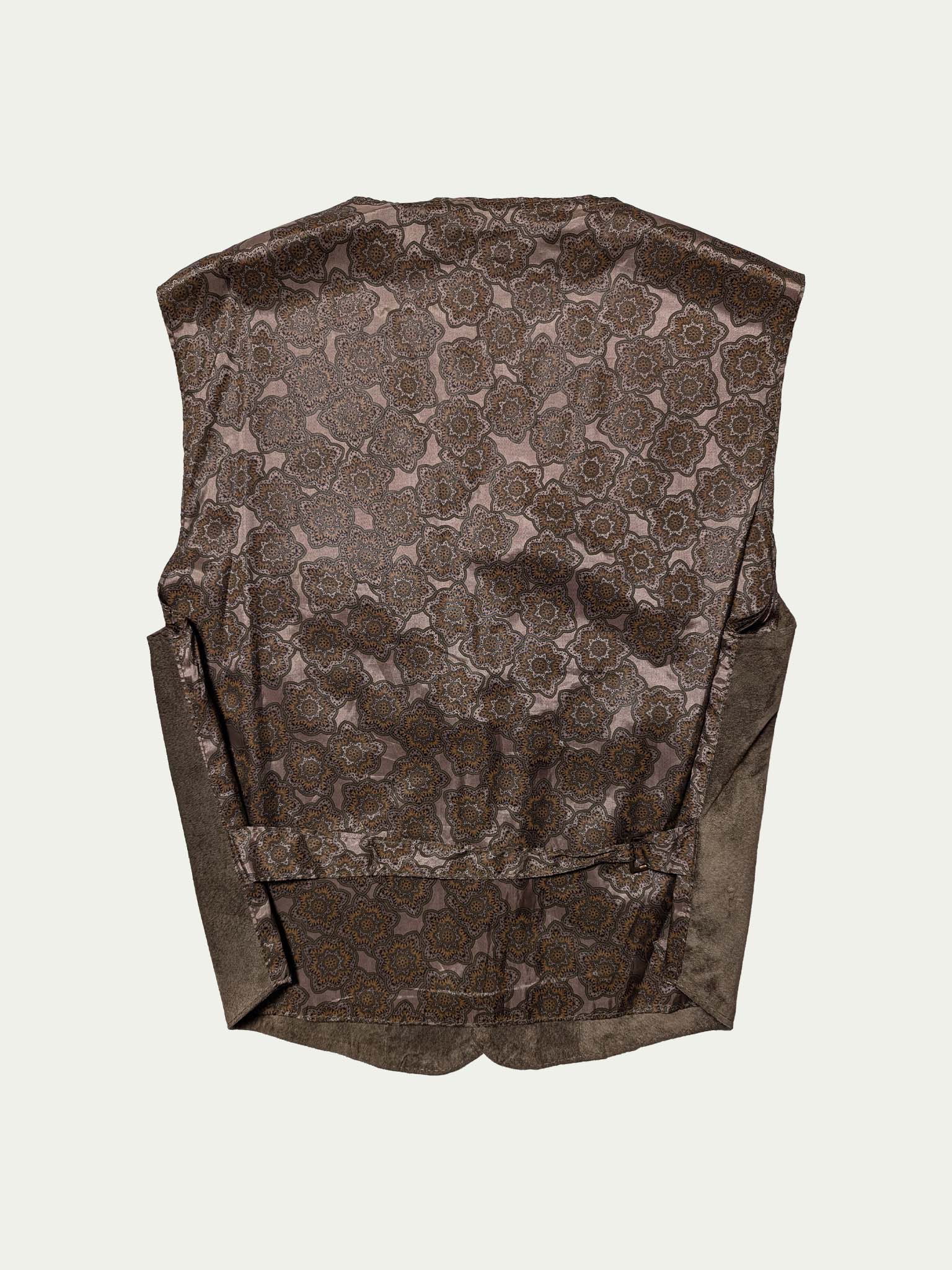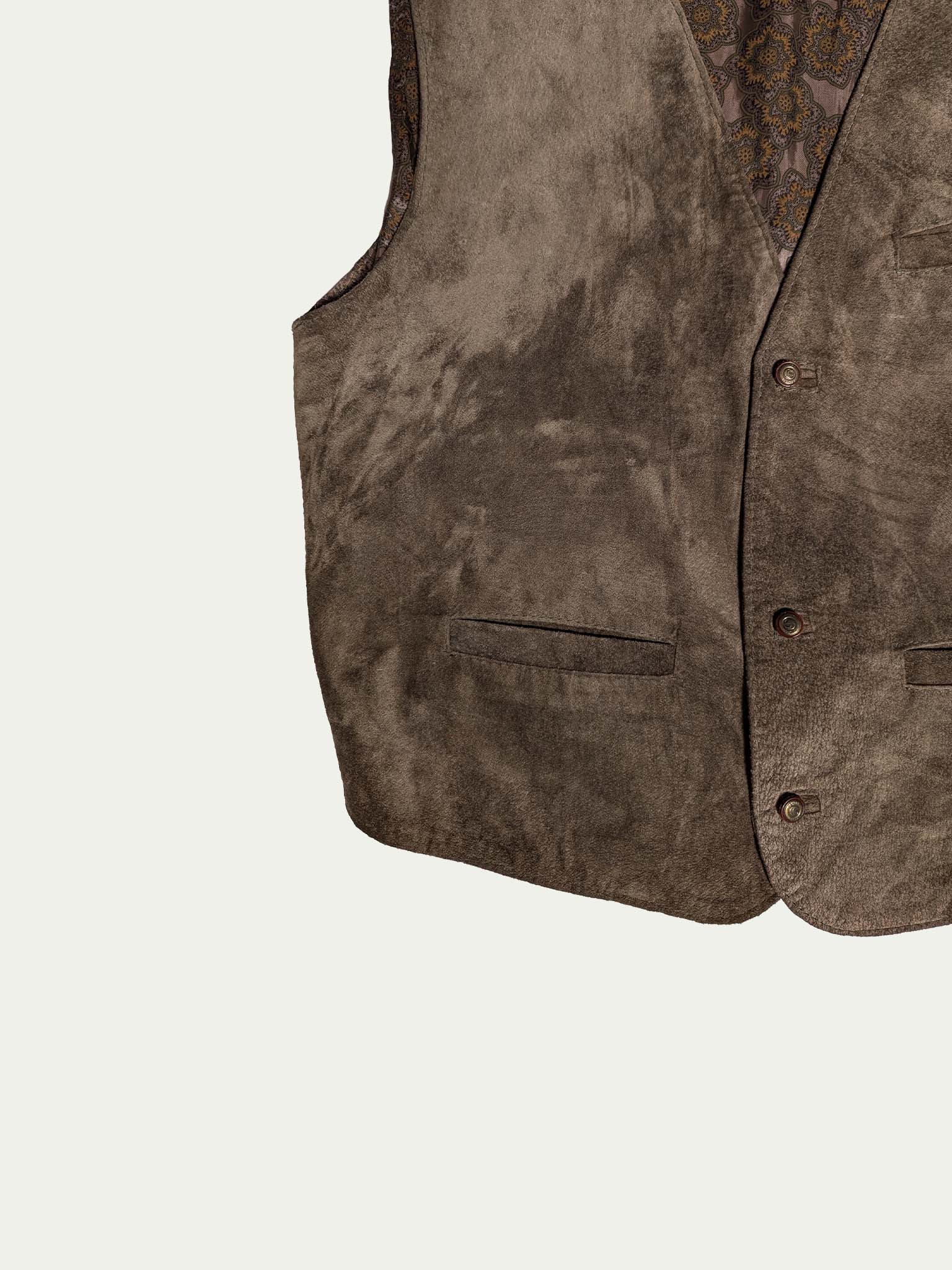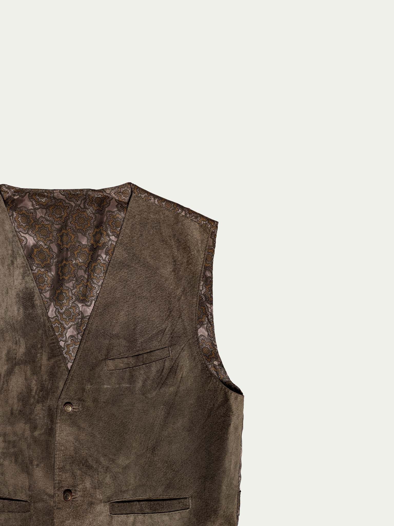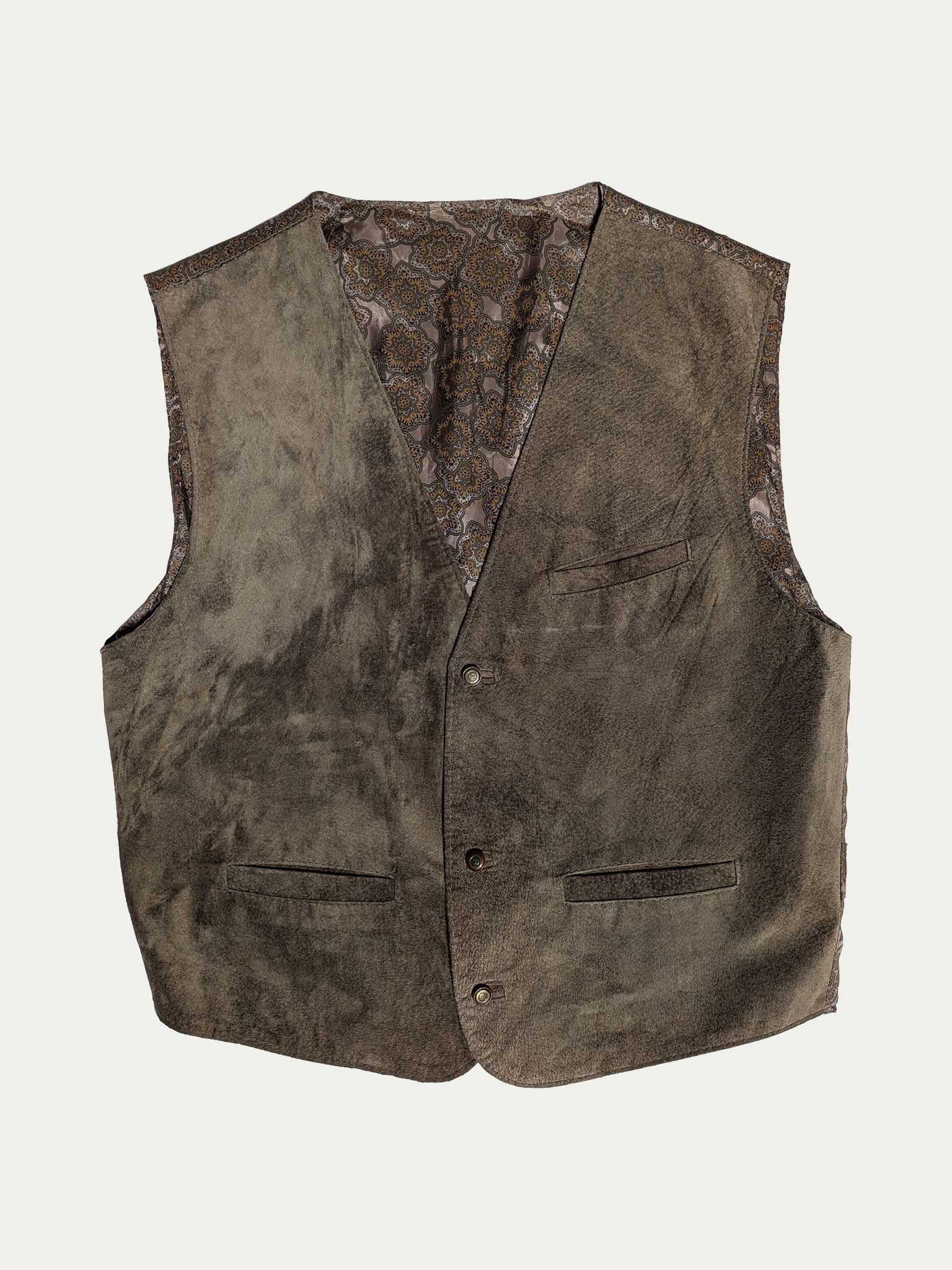 90's Suede vest, in olive-green shade, with a viscose patterned back, and a waist tightening strap, with 3 front pockets, and snap-fasteners closure.
