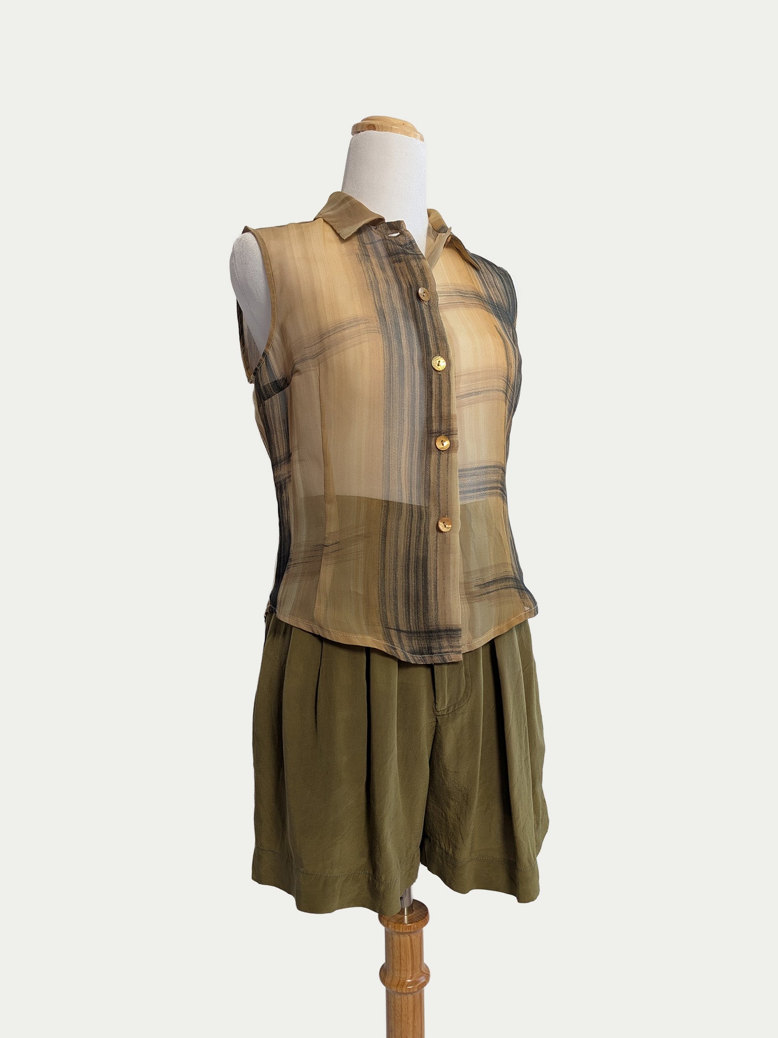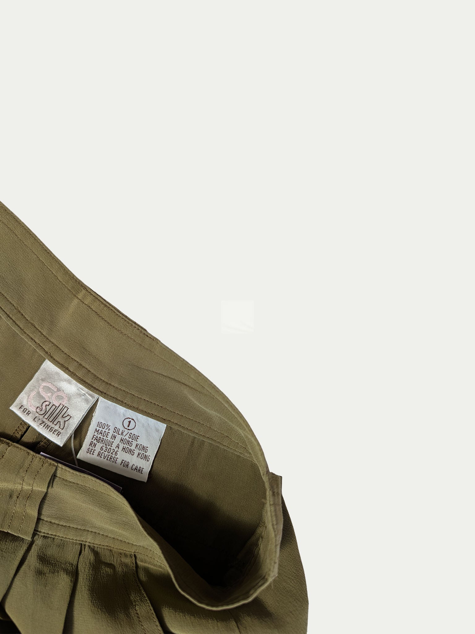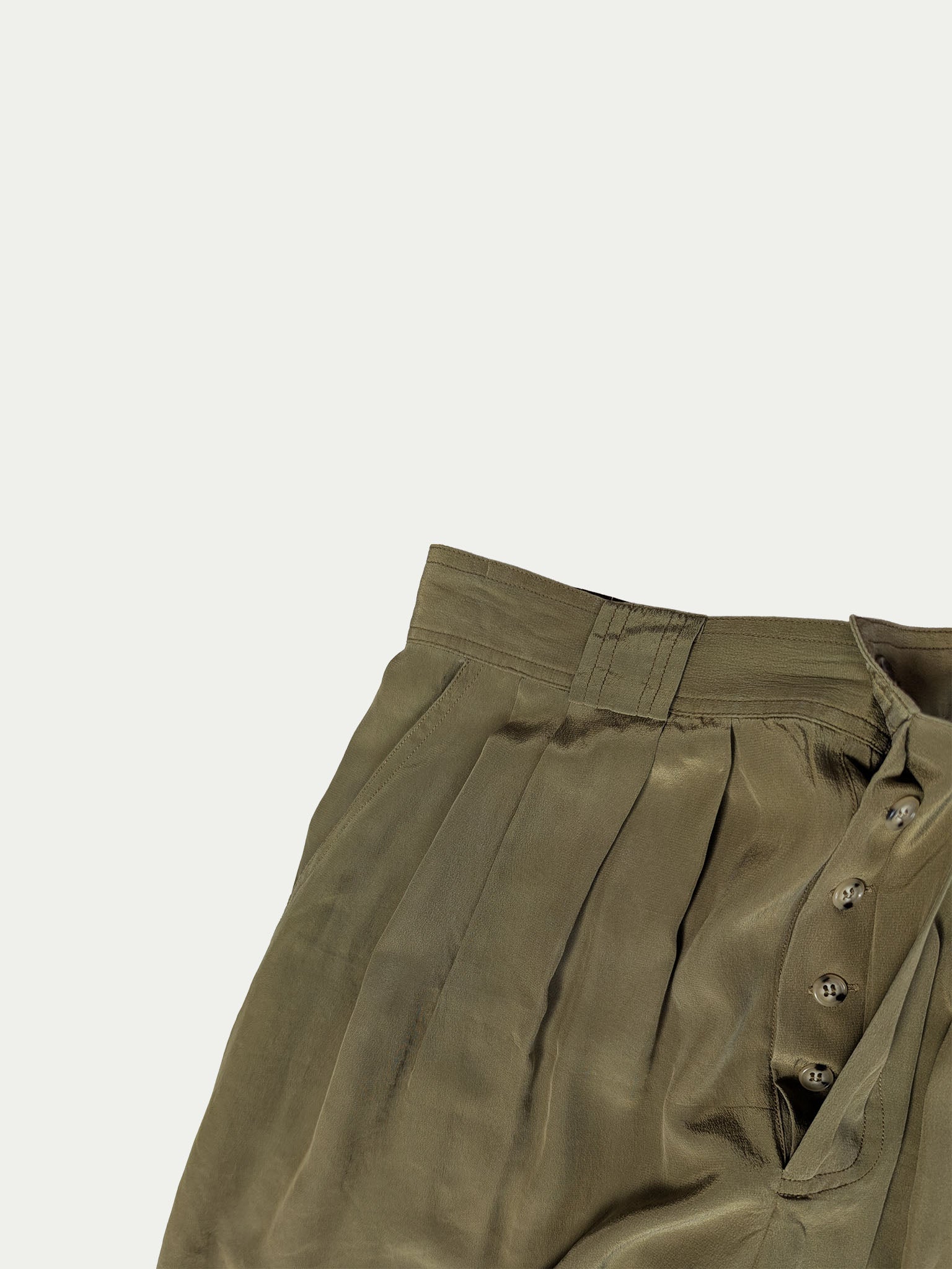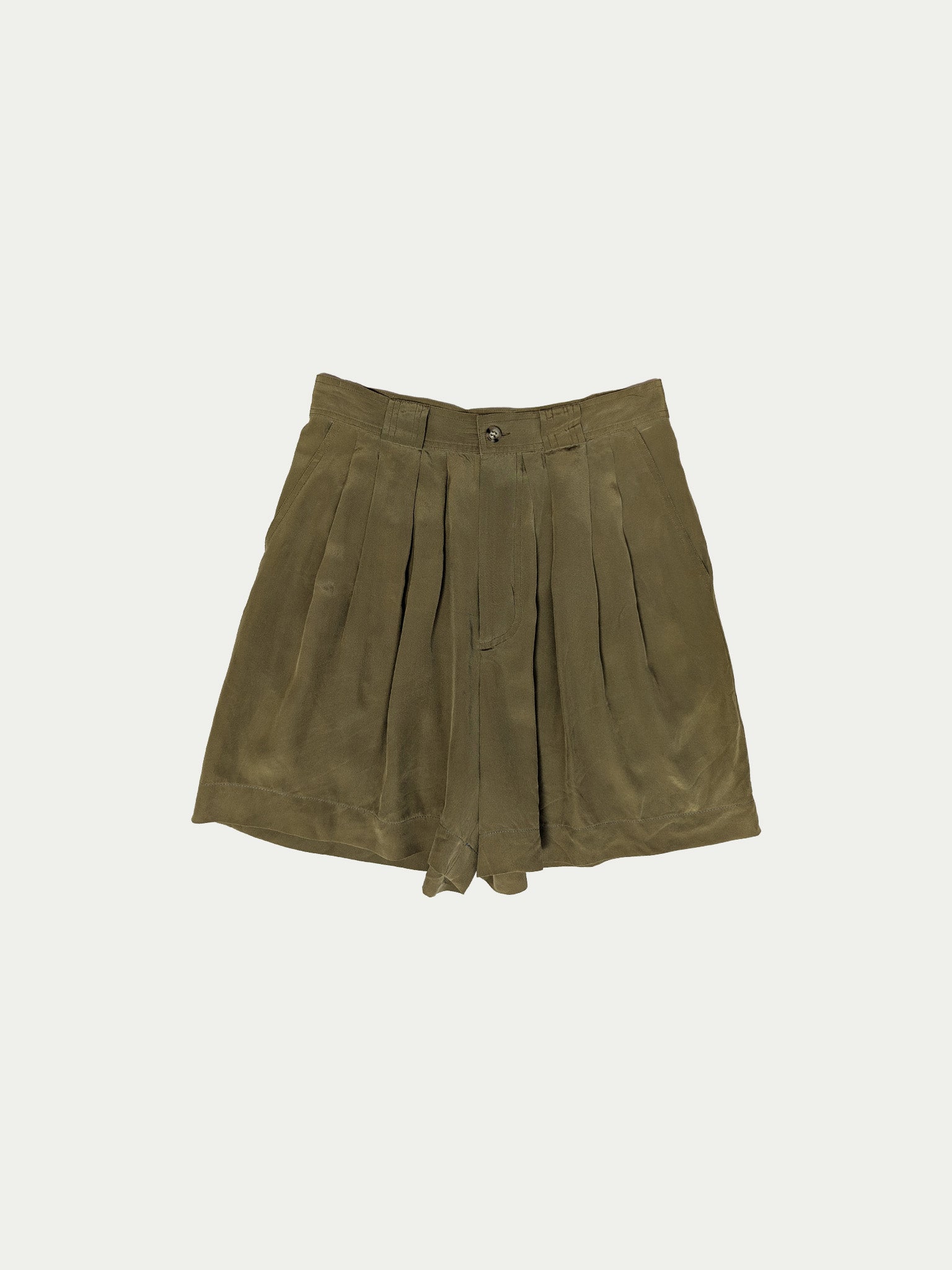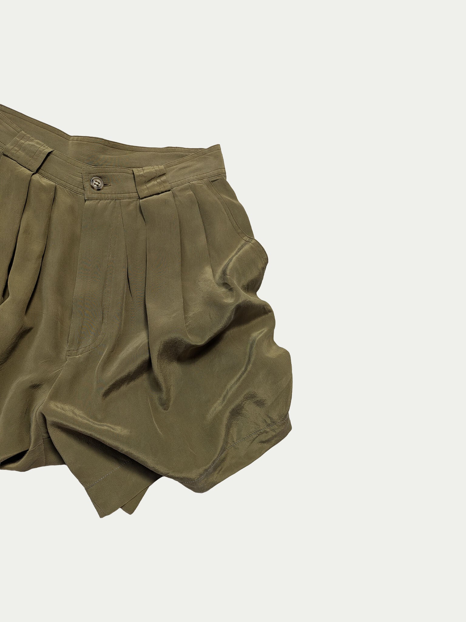 90s silk pleated shorts in olive green, featuring two front and two back pockets.