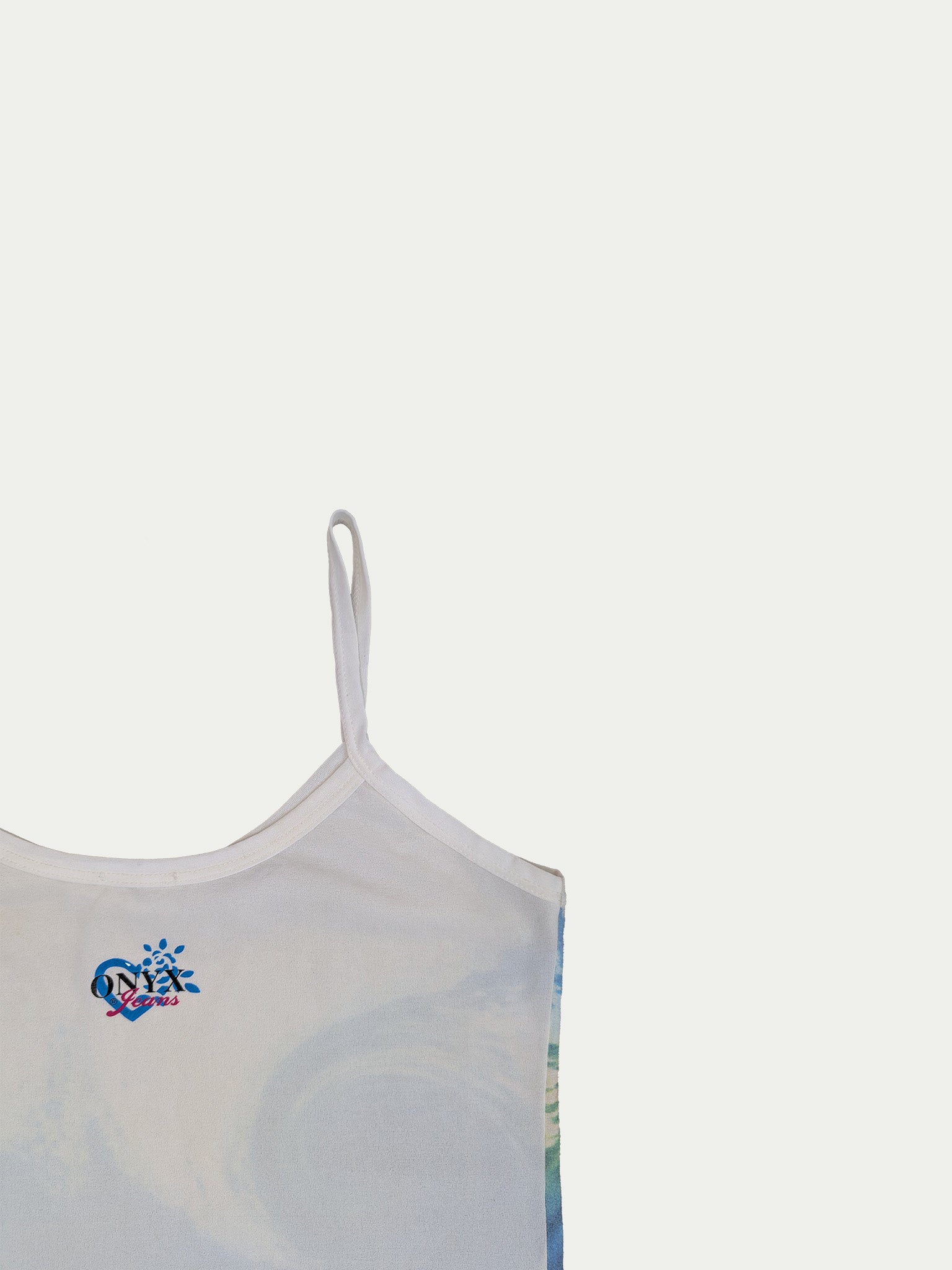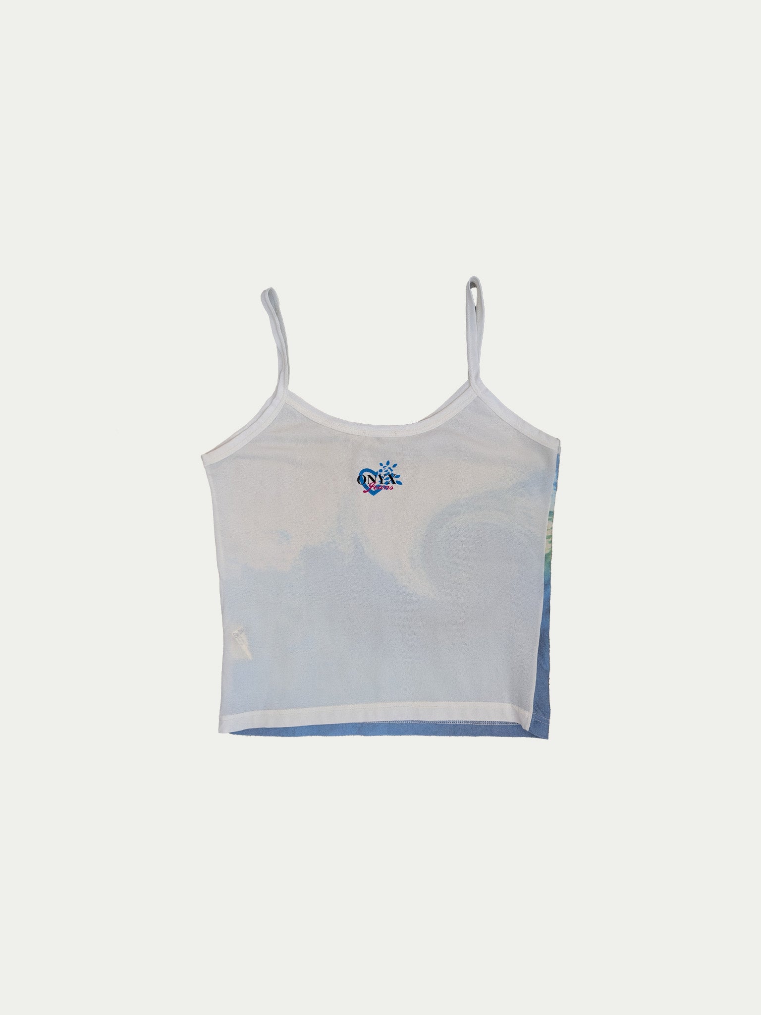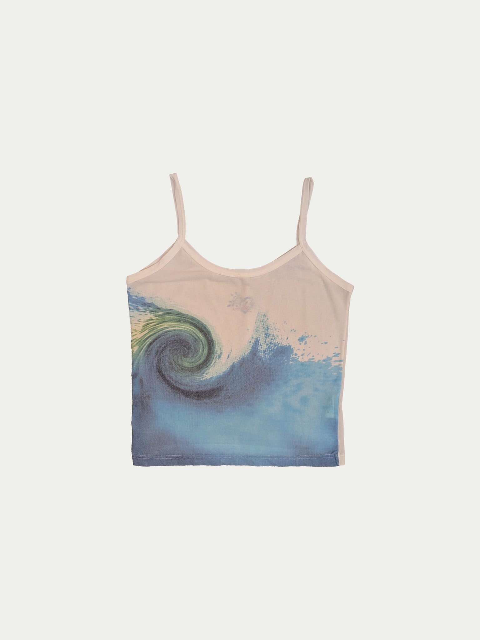 Early 2000s mesh tank top by Onyx, elastic and slightly sheer, featuring a unique wave print.