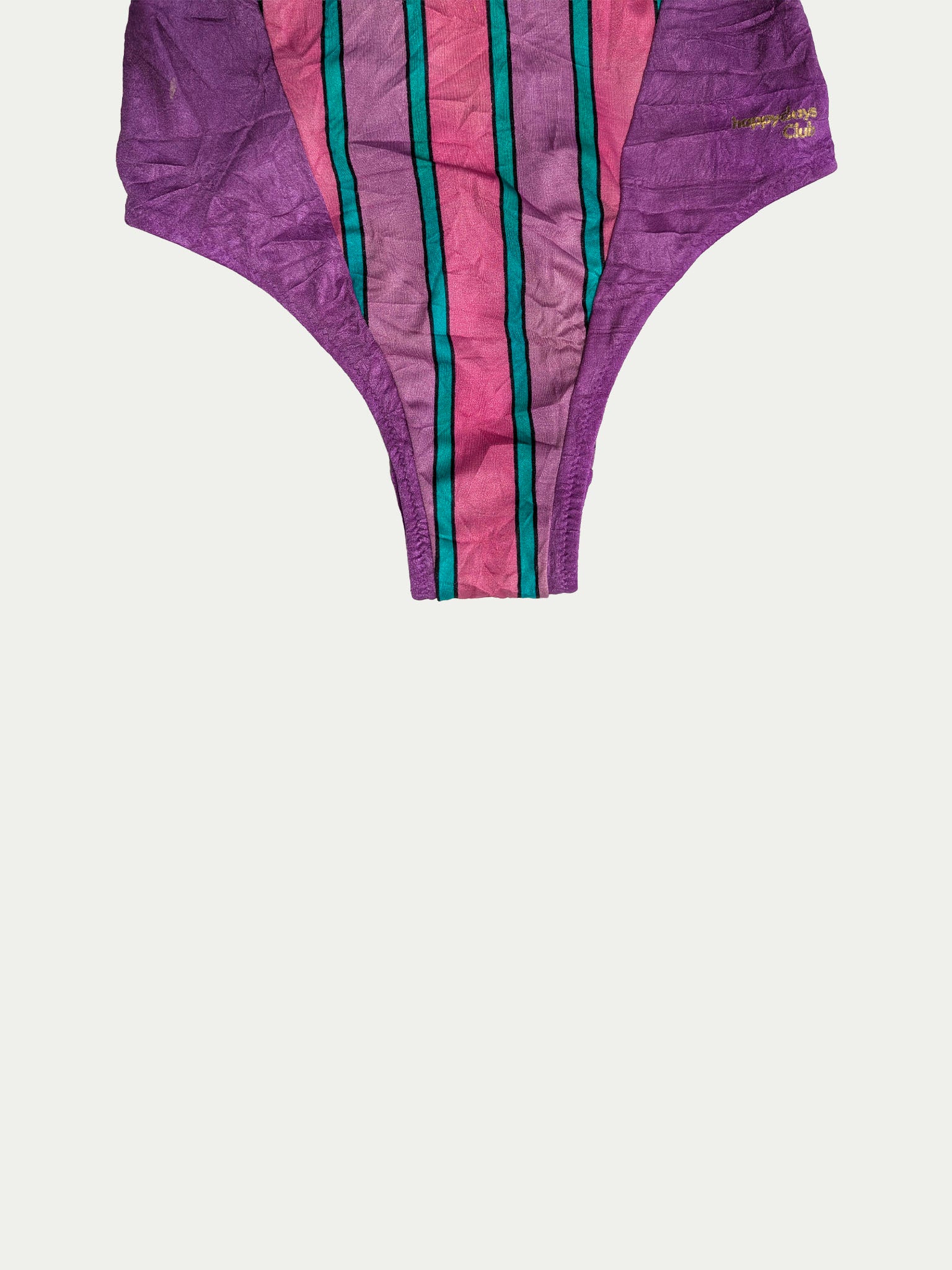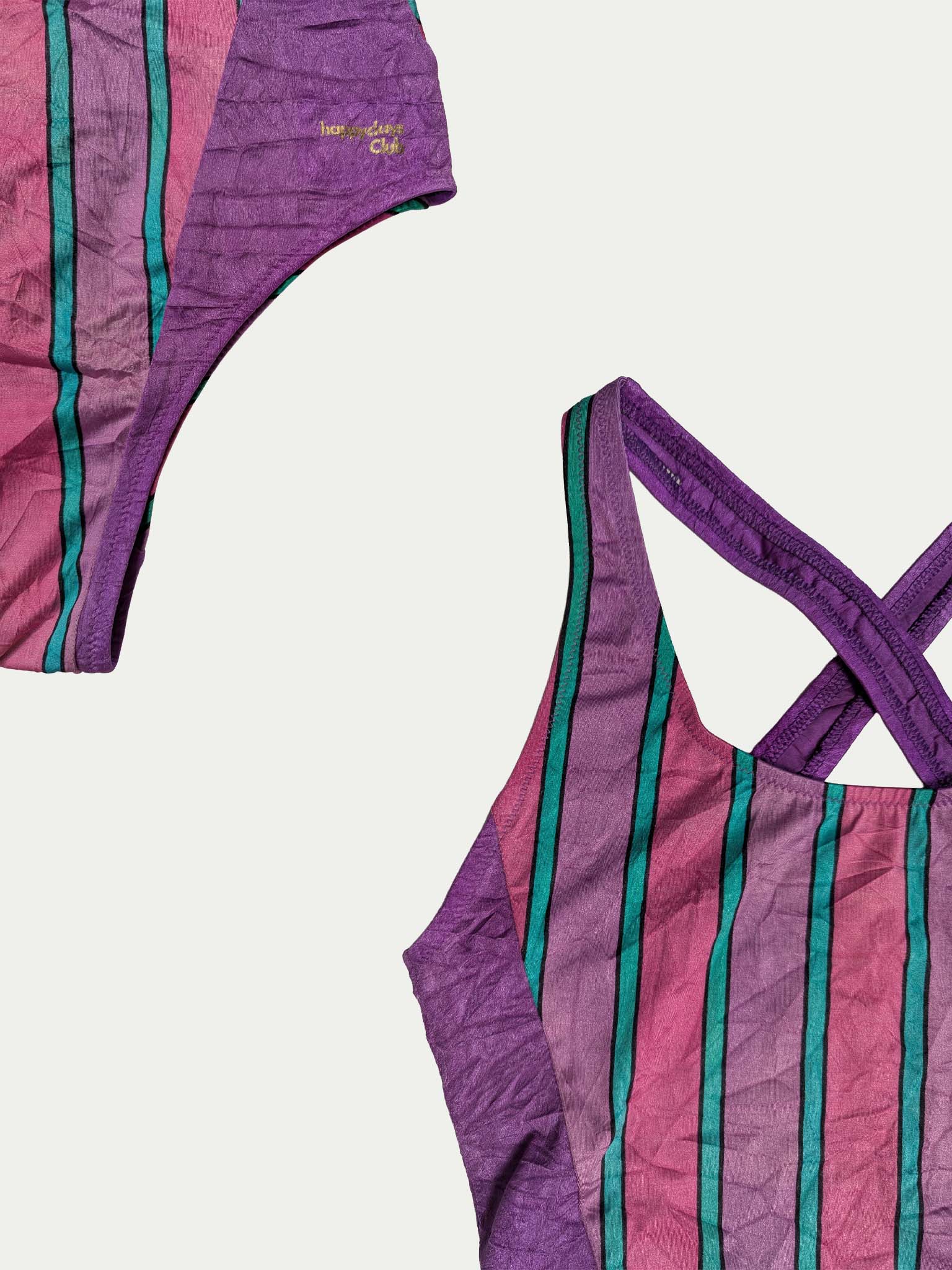 Early 90s one-piece swimsuit by Triumph with a timeless striped print in purple, turquoise, and pink shades. Features criss-cross straps, a deep open back, and a classic high-leg fit.