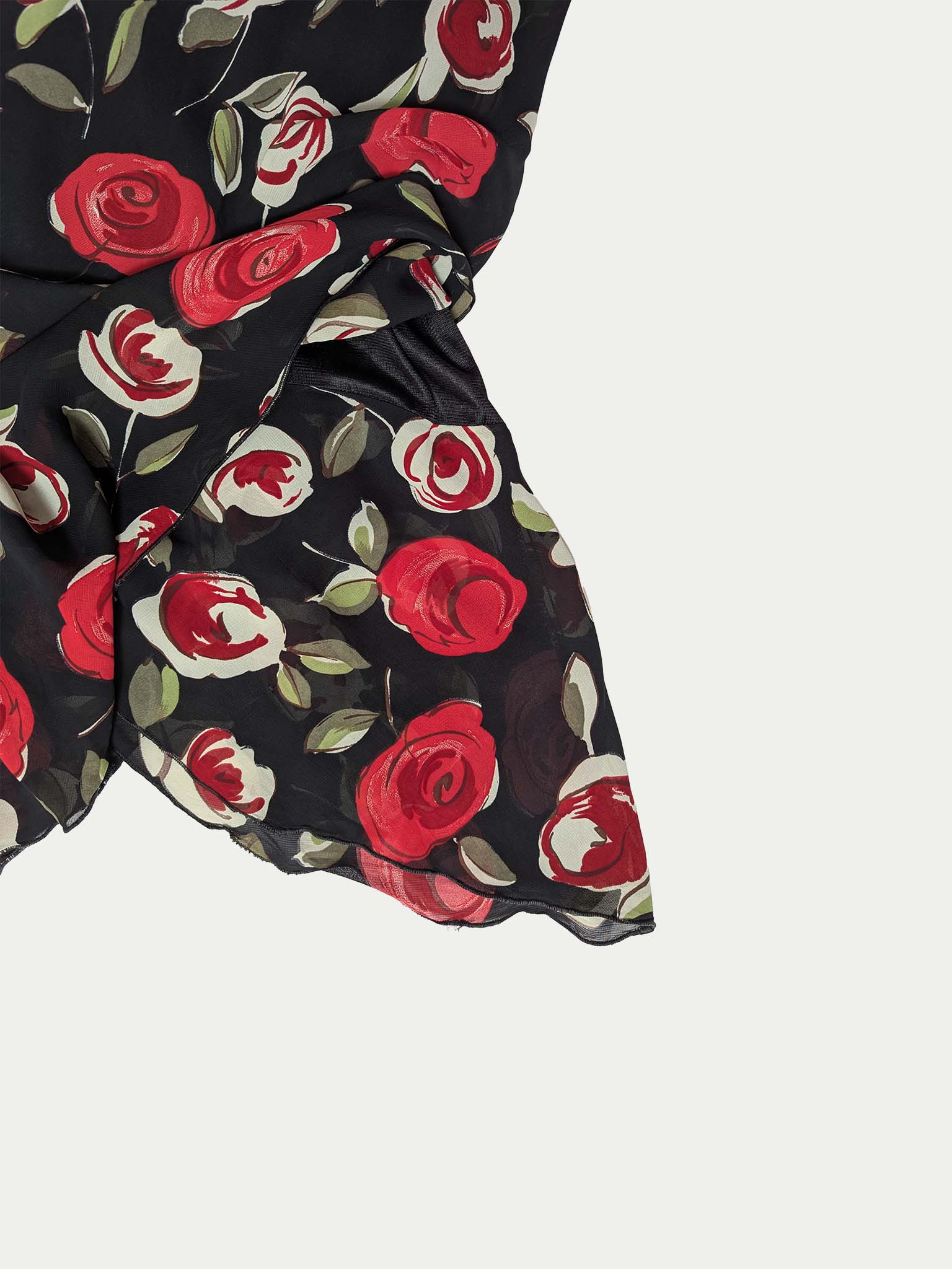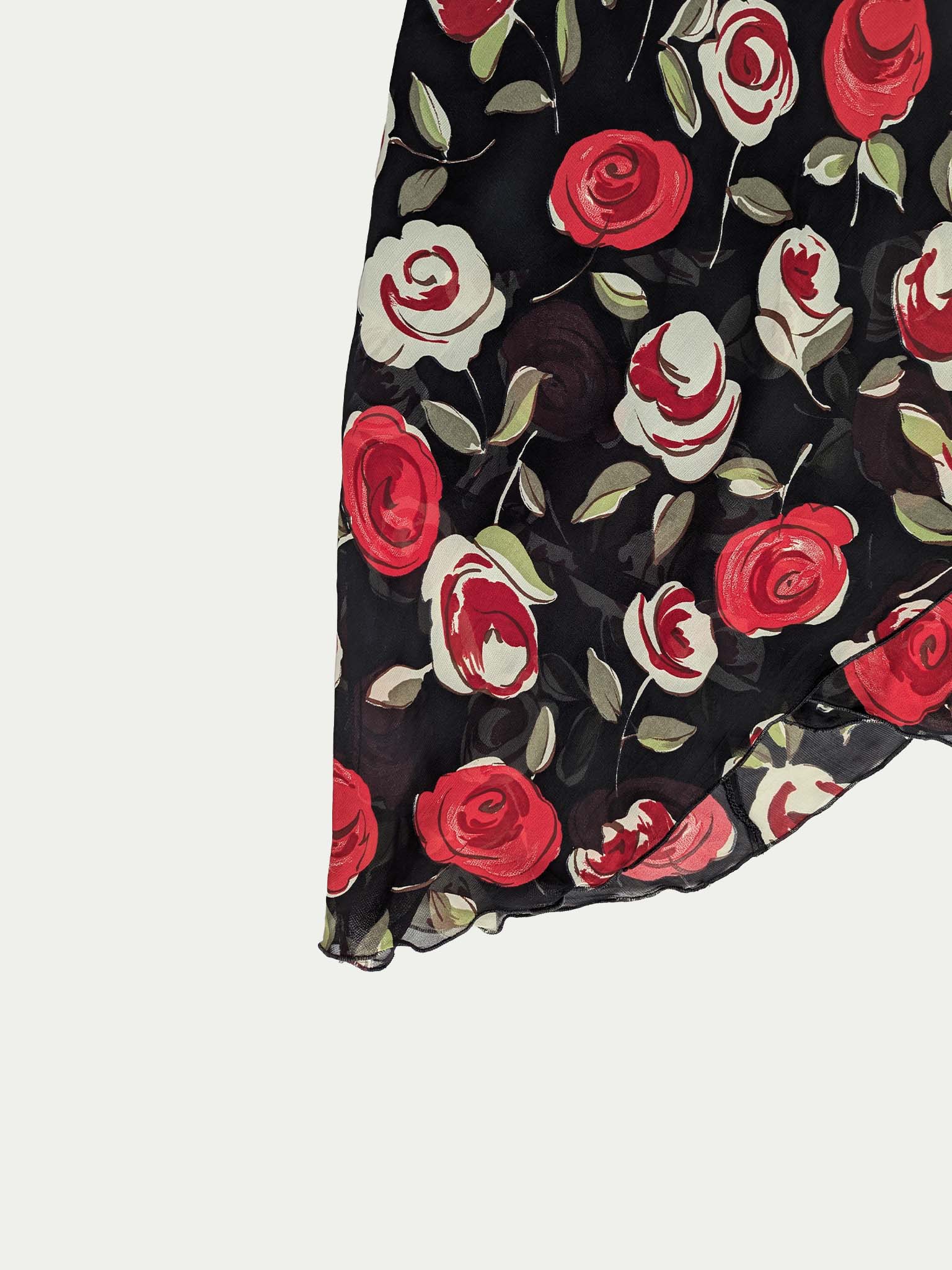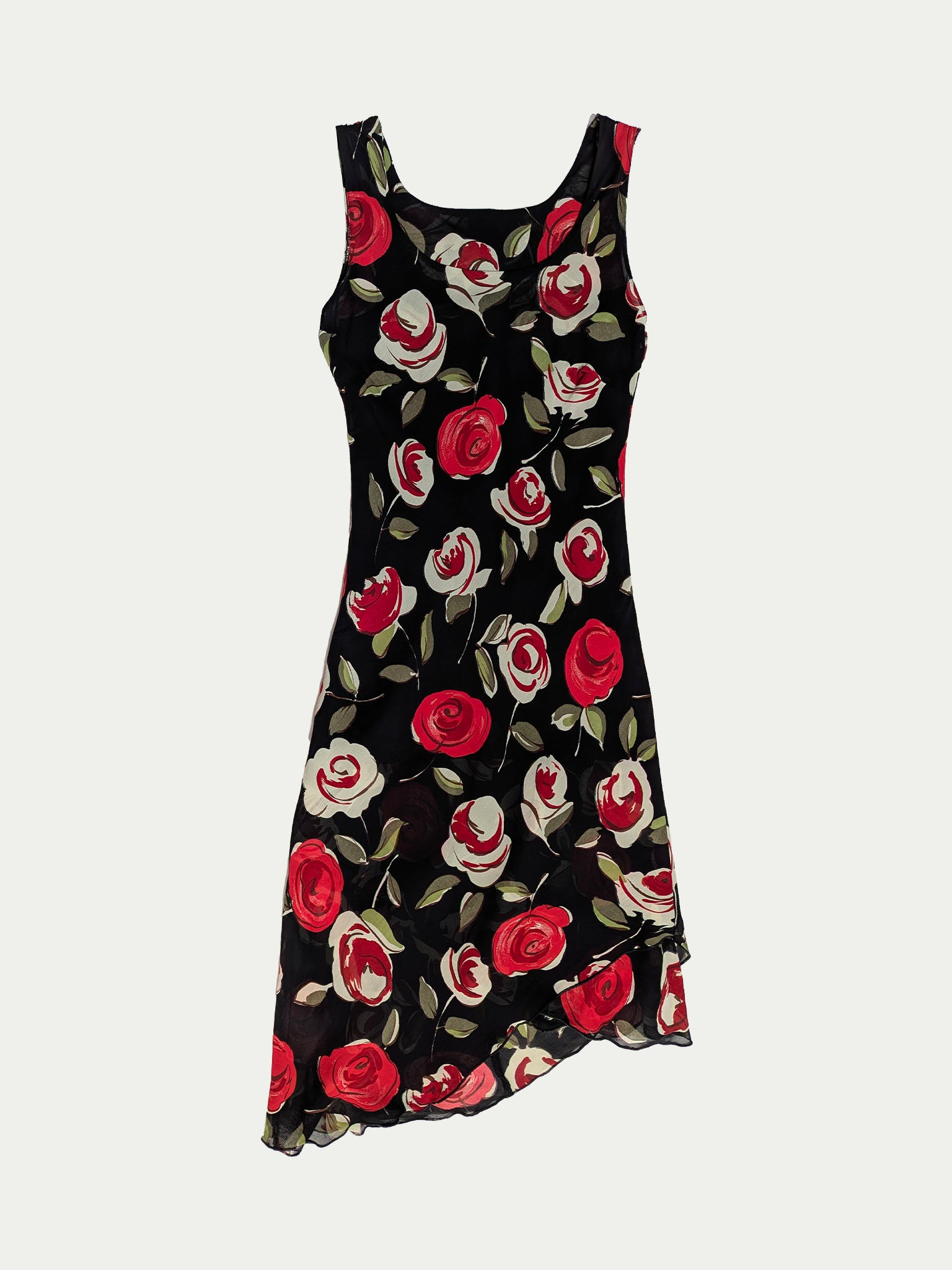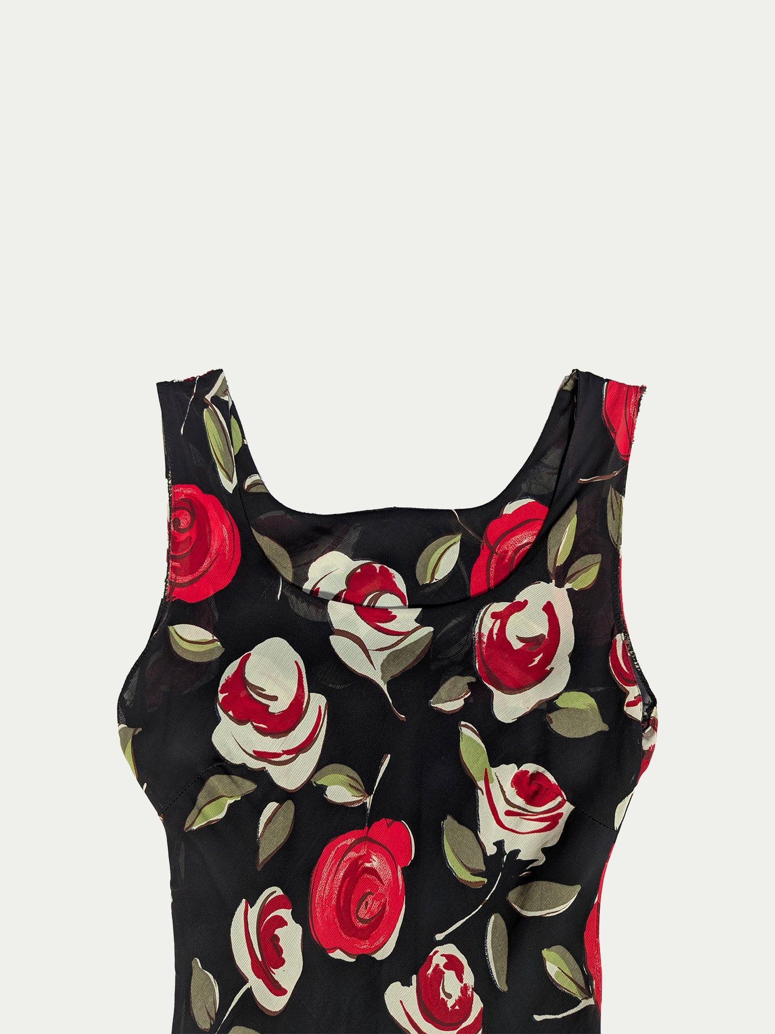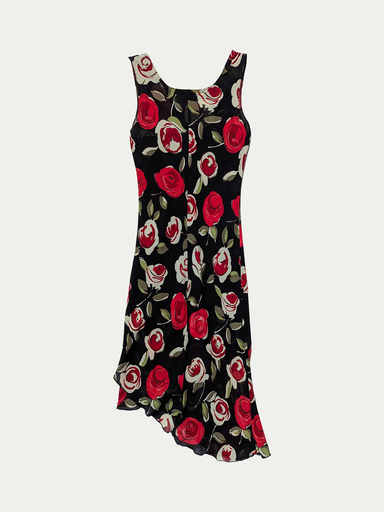 90s black midi dress with a roses print in red, white, and olive green, featuring a sleek body-hugging fit made possible by the diagonal-cut viscose fabric. Slightly sheer with a lining, it has an asymmetrical double hem and a softly square neckline.
