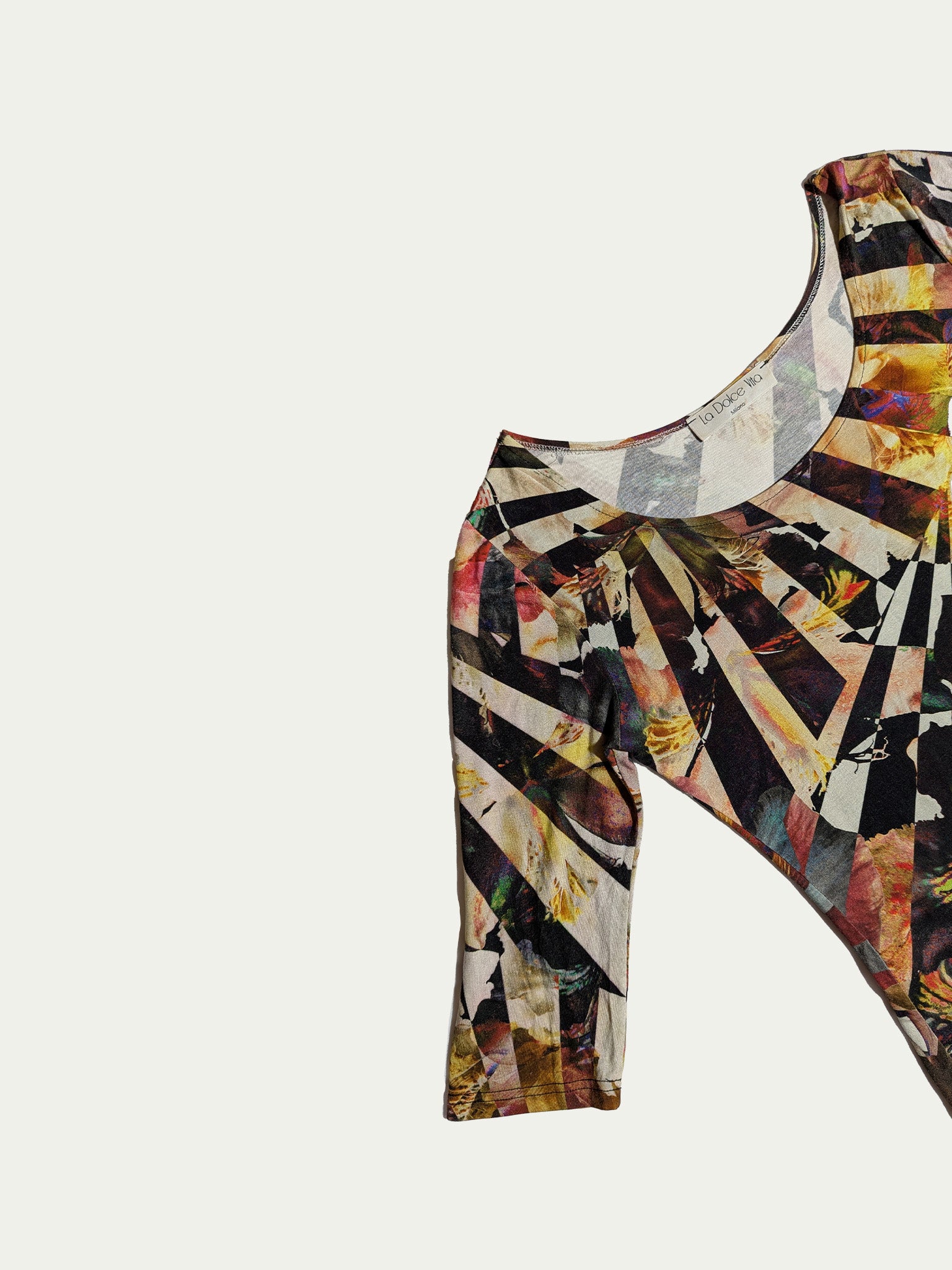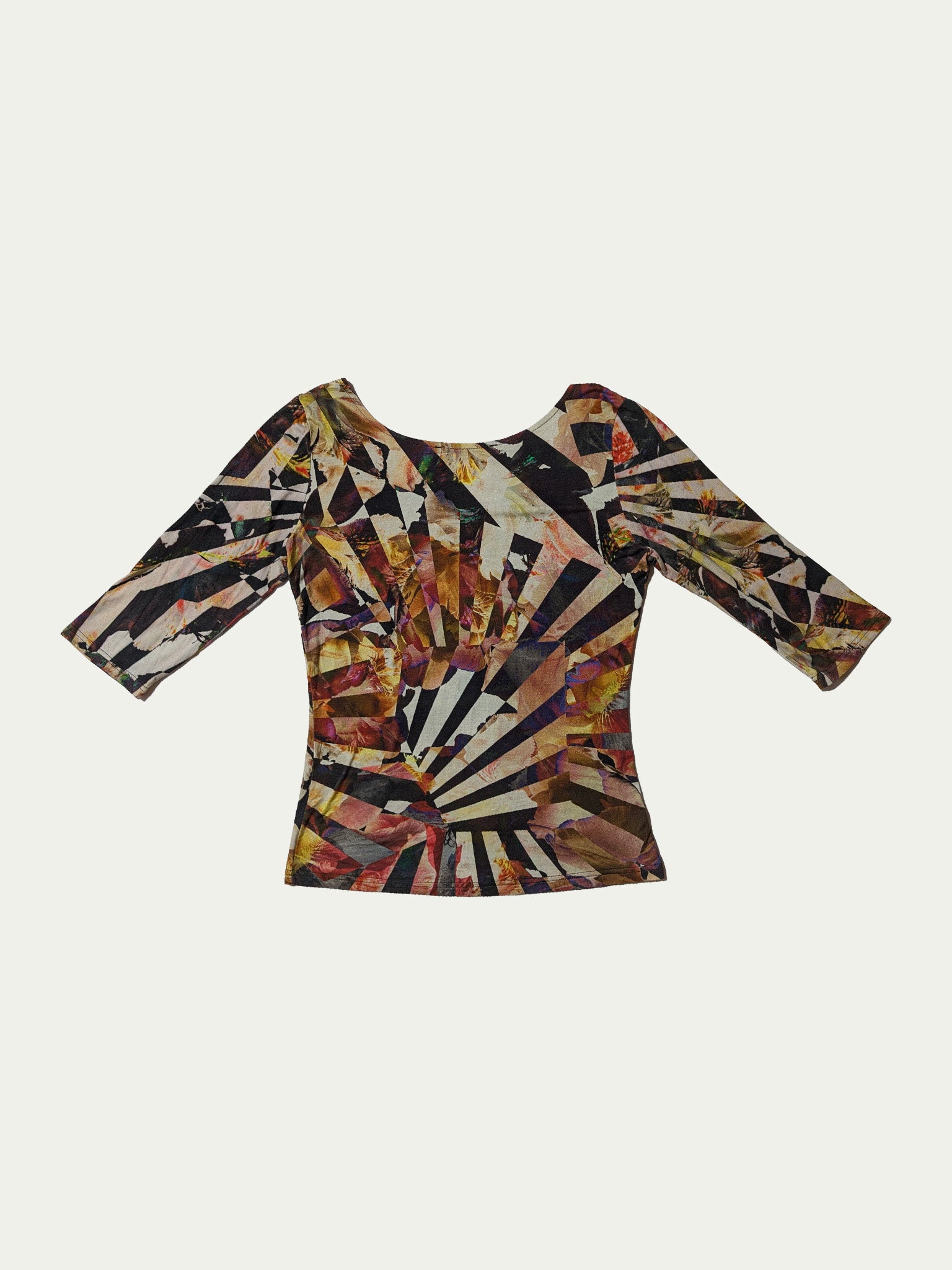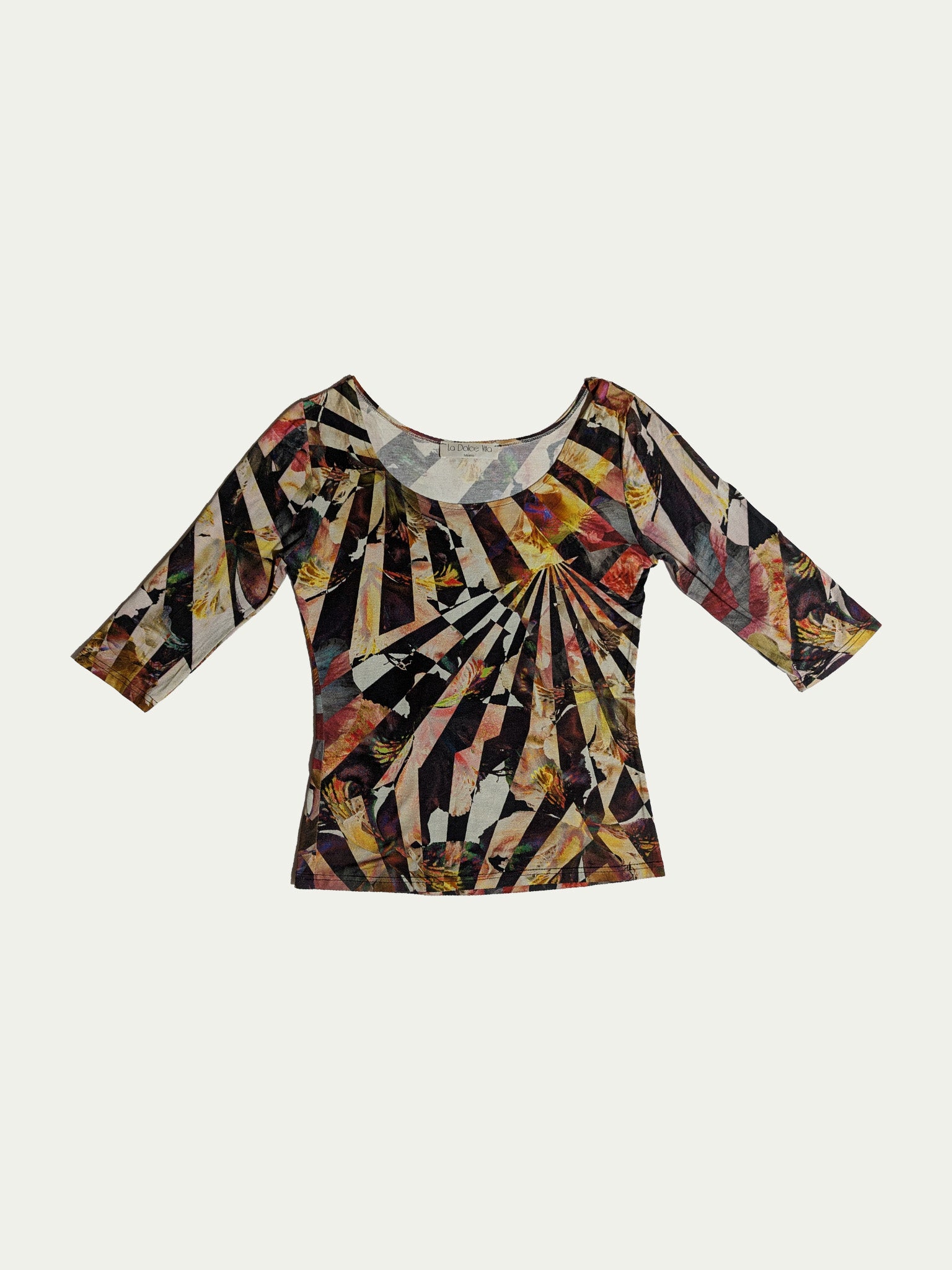 Y2K elastic viscose T, a multi colored psychedelic print at the back & front.