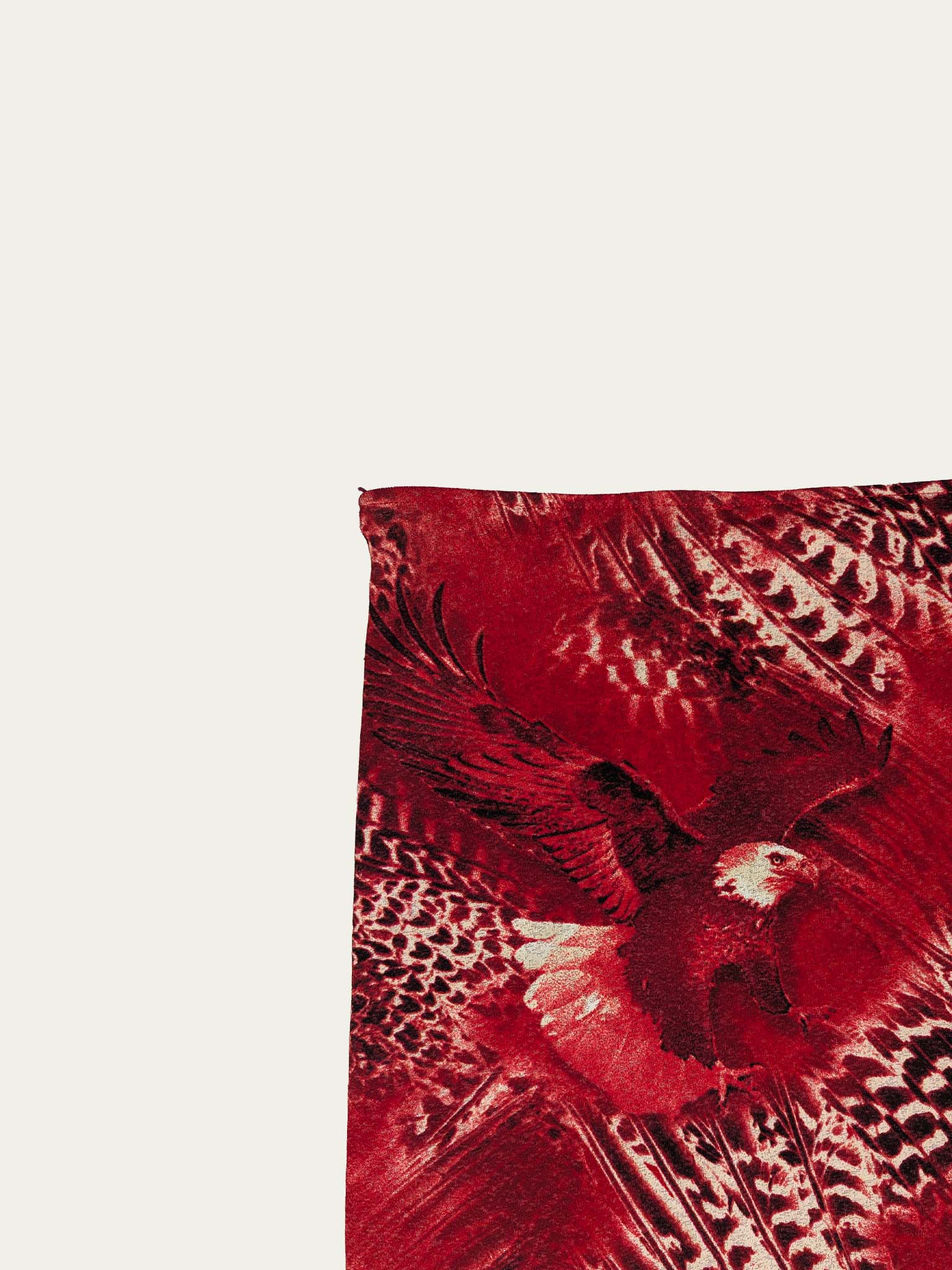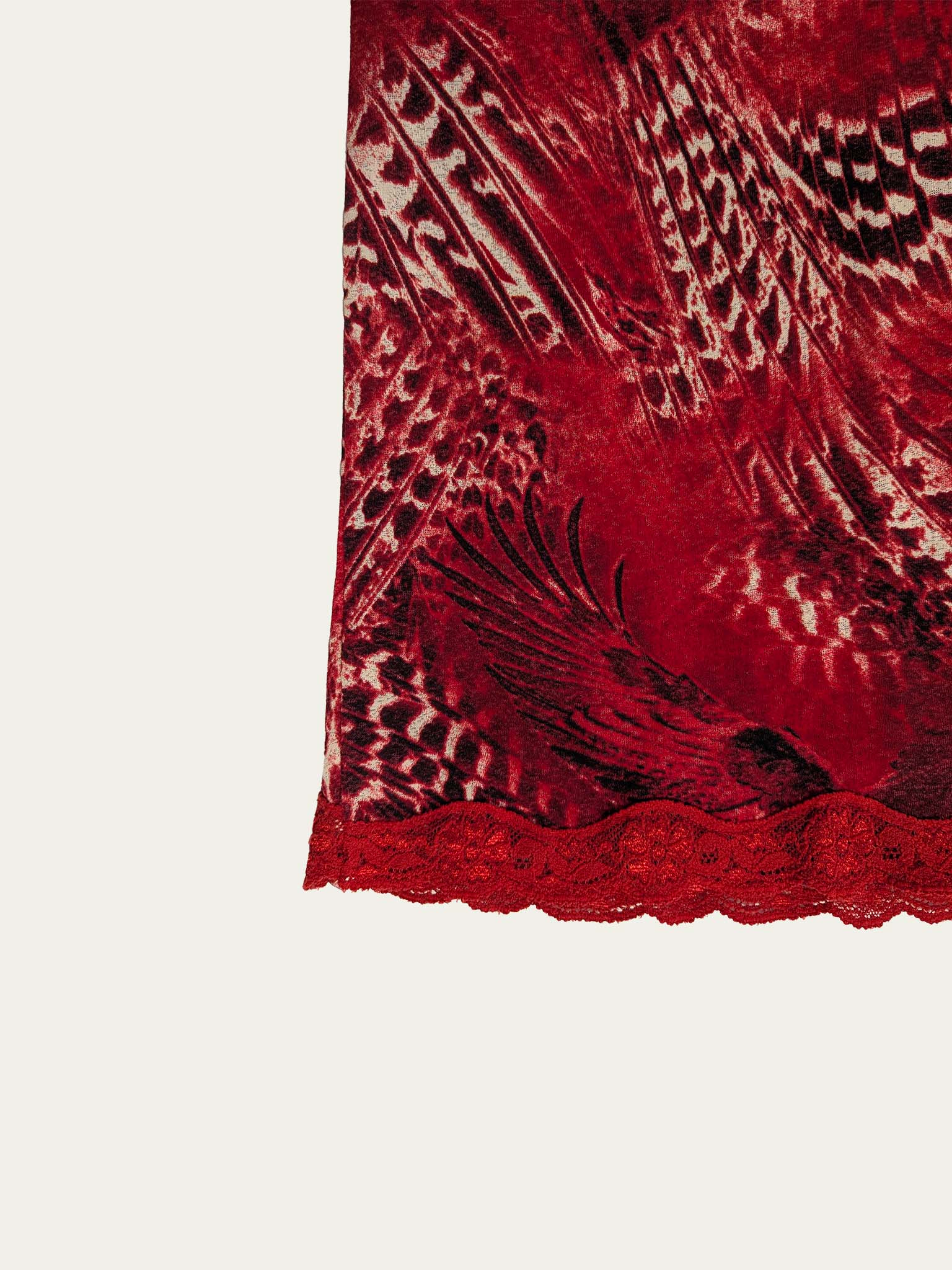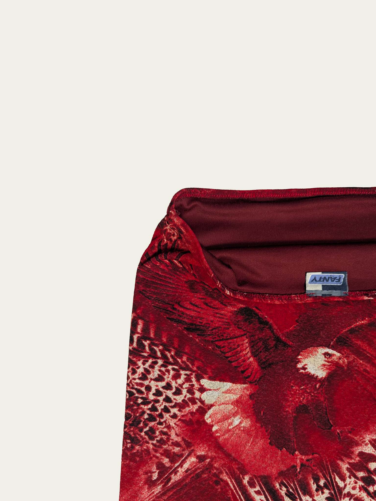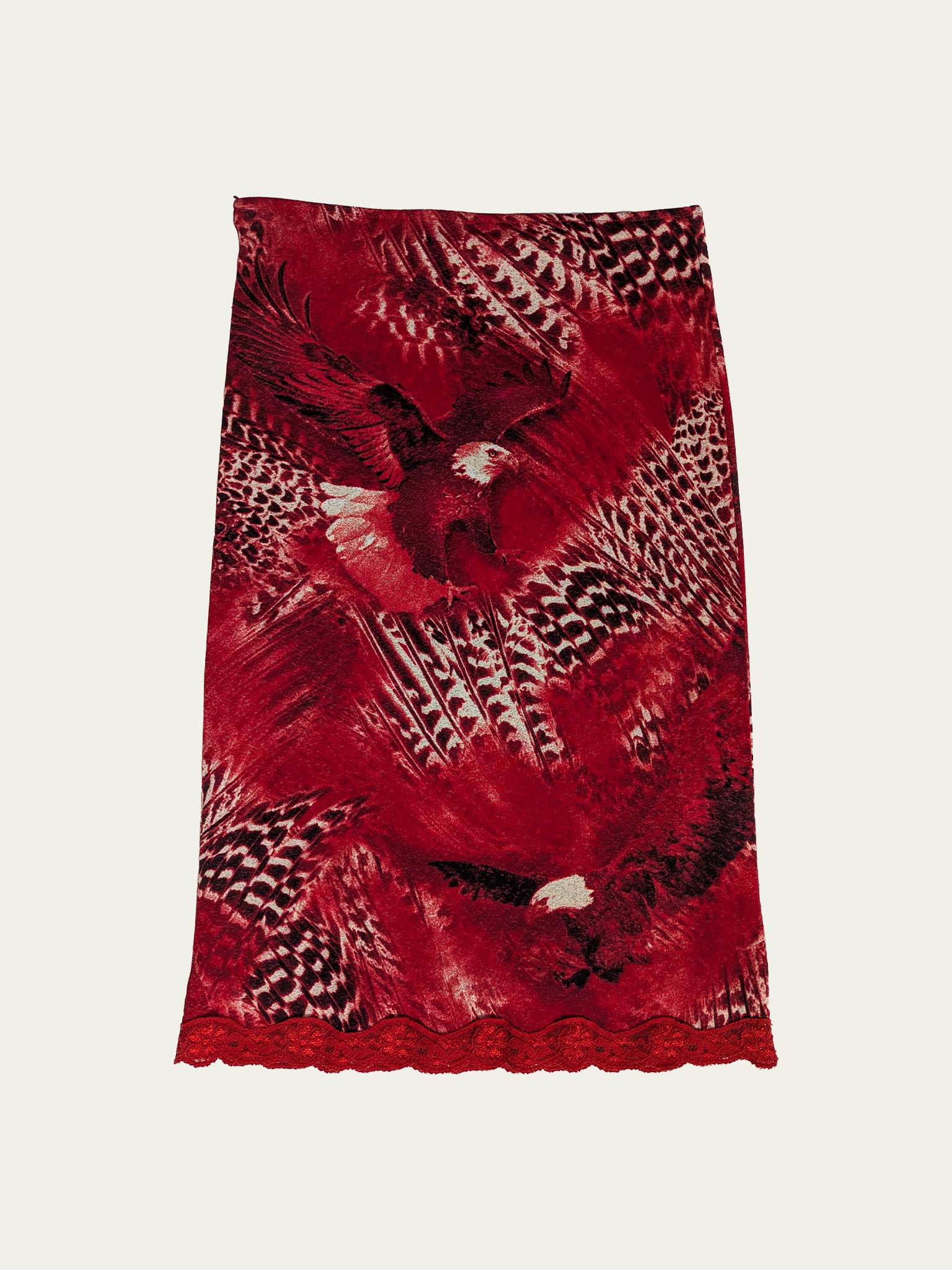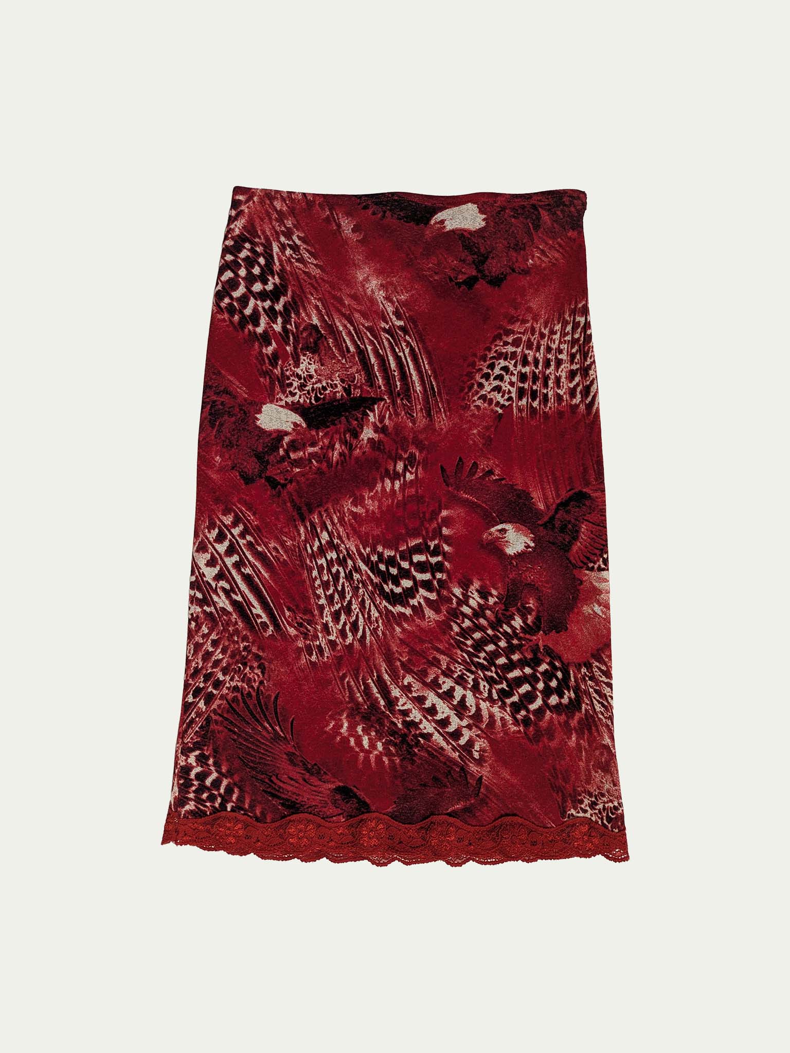 Y2K stretchy mesh midi skirt, low to mid-rise, with a beautiful unique eagles print in deep red shades with a black touch.