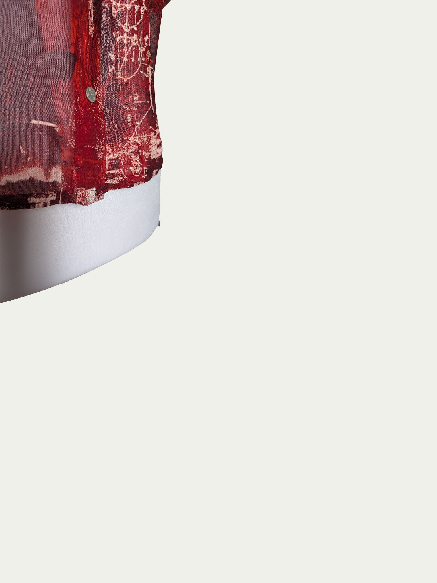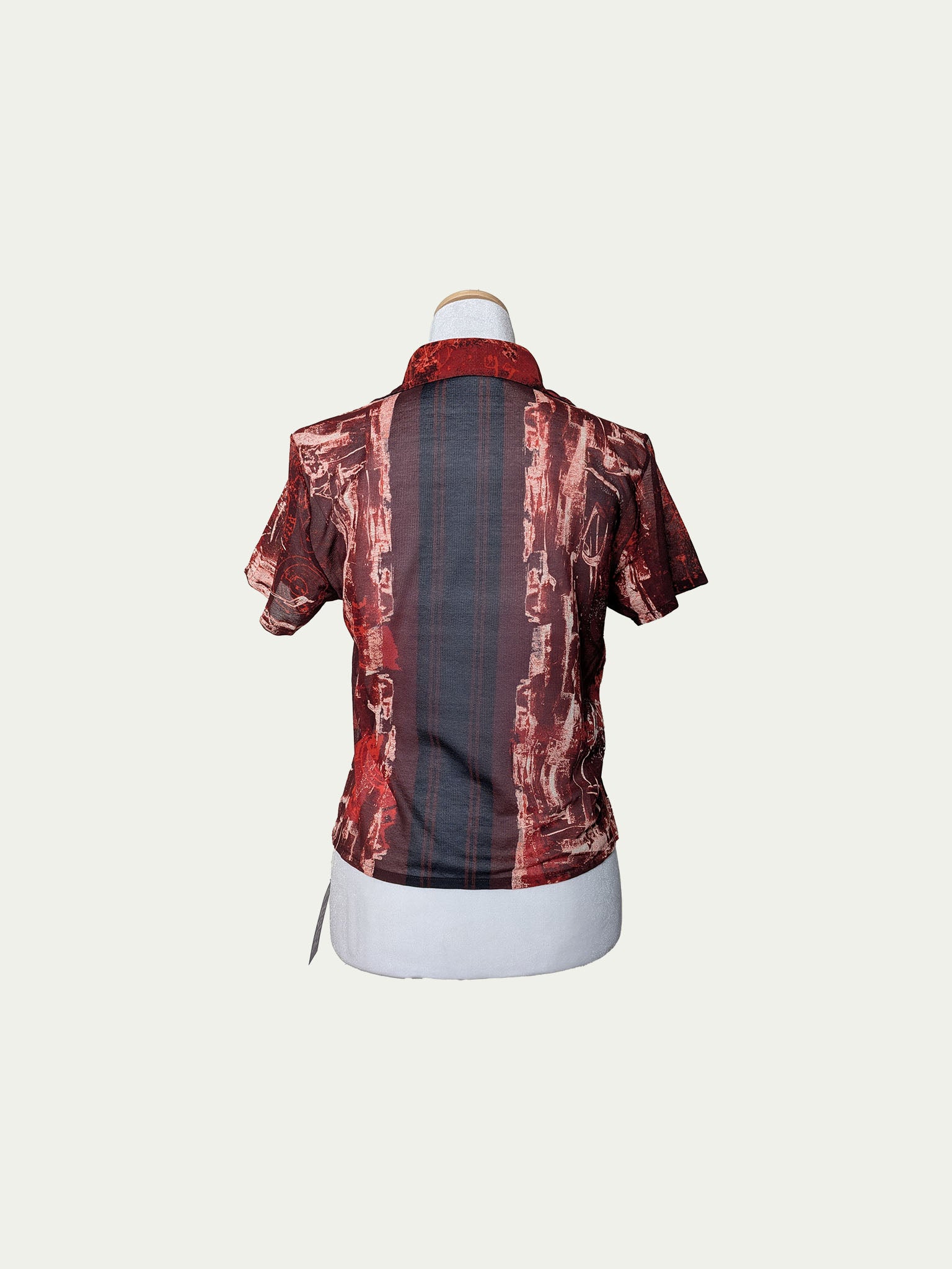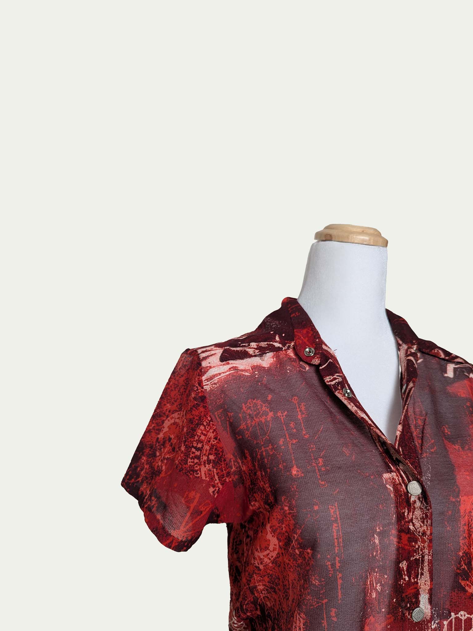 Late 90s mesh button-up T-shirt with snap fasteners and a pointed collar. Features a unique print in red, dark red, and white, with a surprising touch of dark blue at the back.