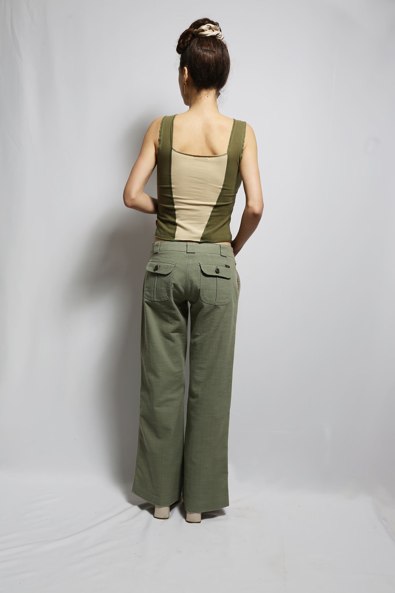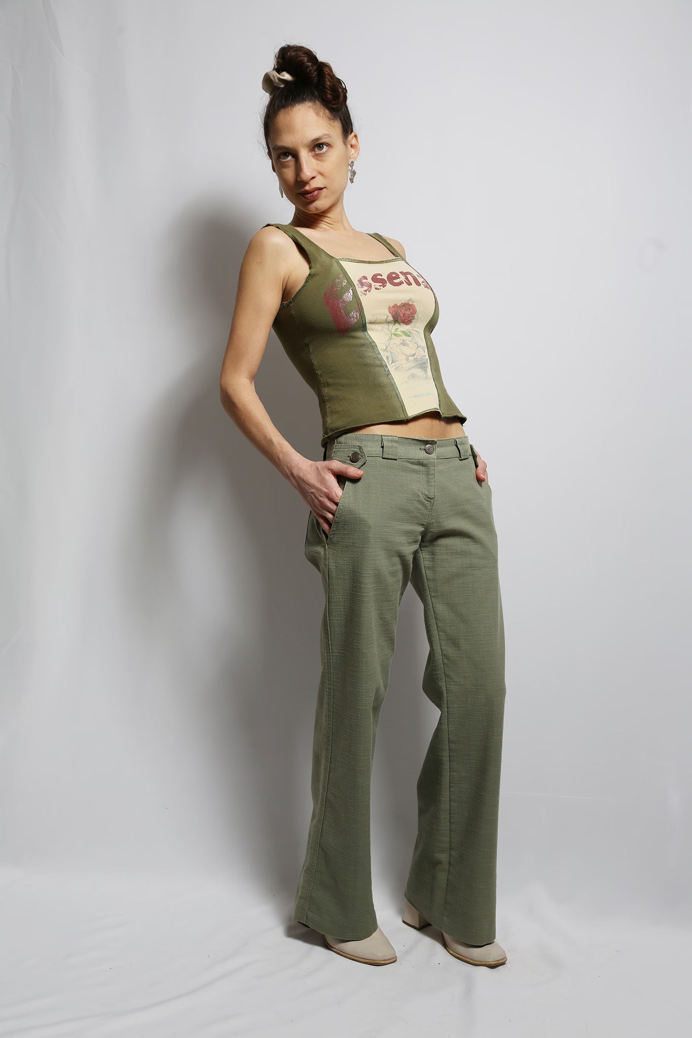 Cotton crop tank top featuring patchwork details, a funky boat and rose print, and bold stitched accents.