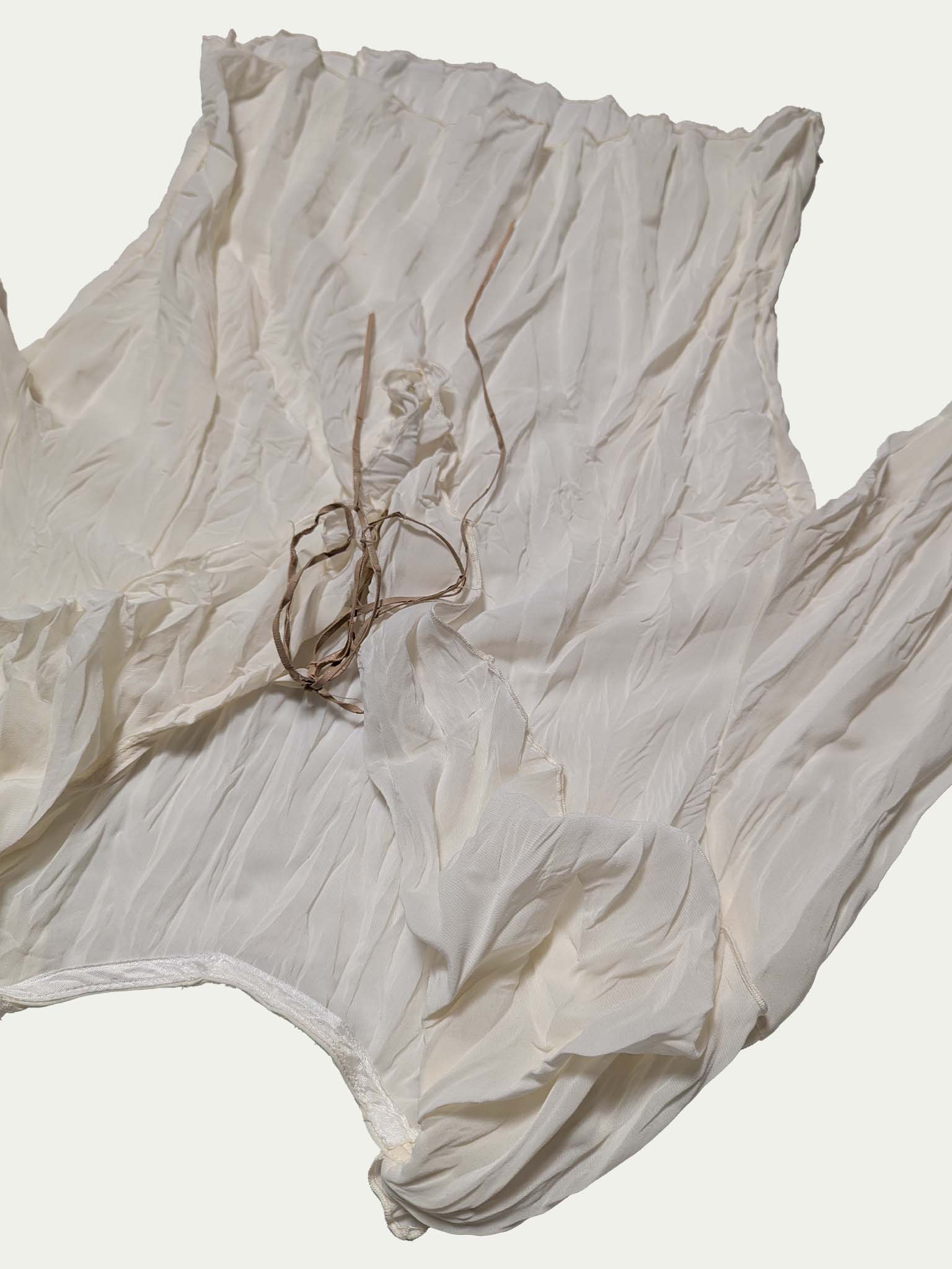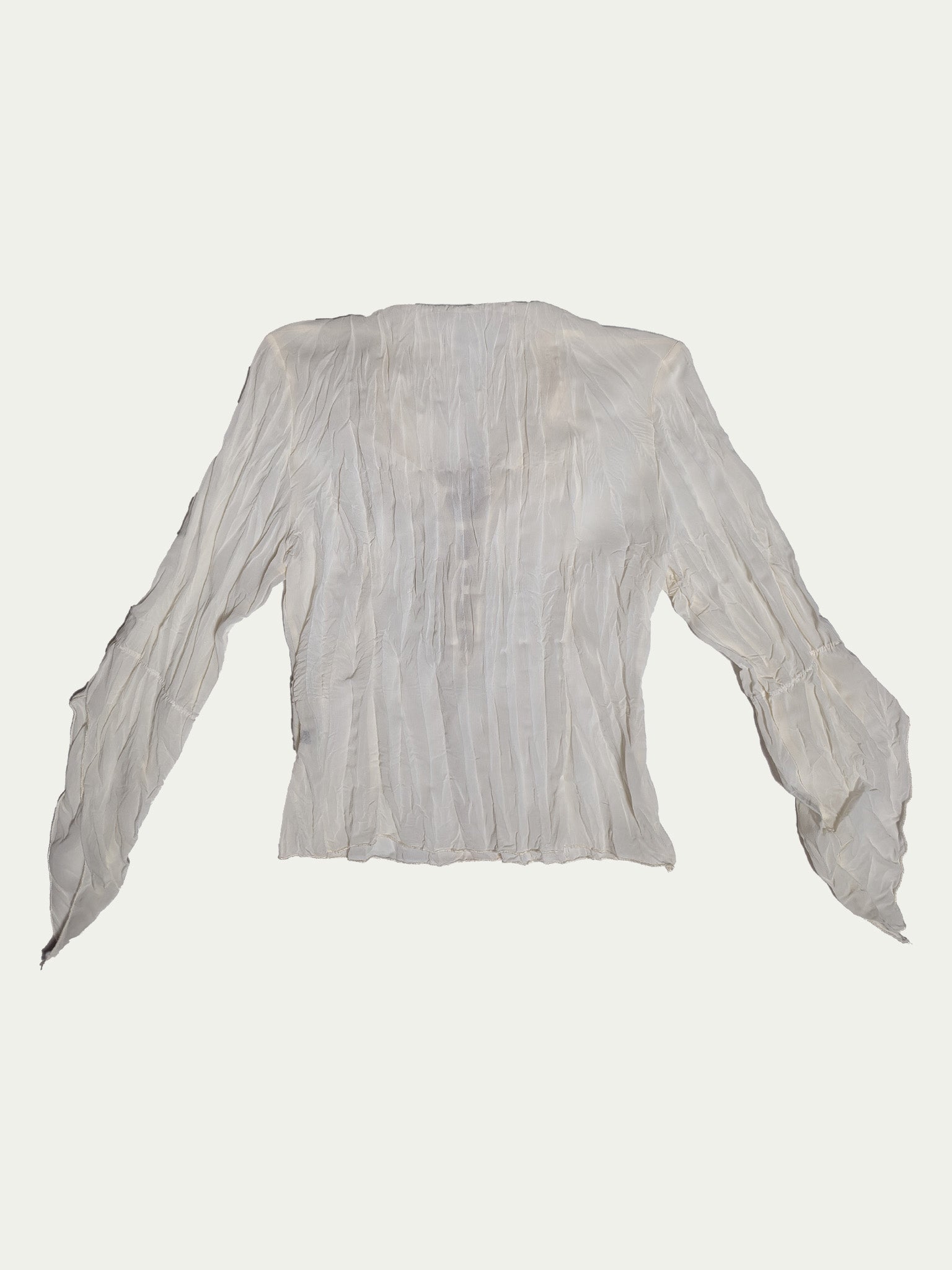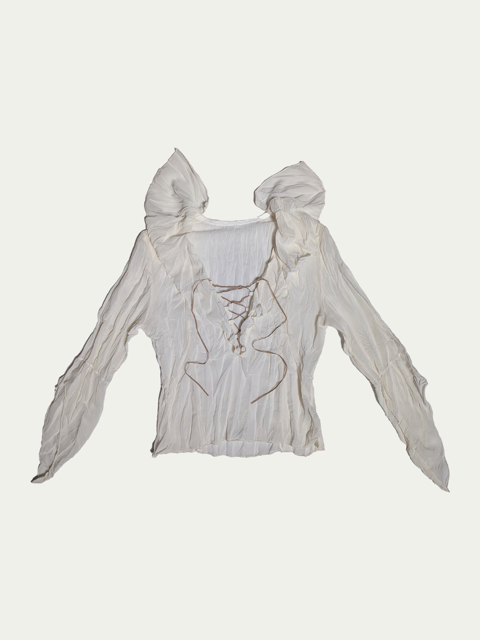 Y2K Cream wrinkled chiffon blouse, with diagonal 3/4 sleeves, a versatile ruffled collar, and suede-like laces at the cleavage.