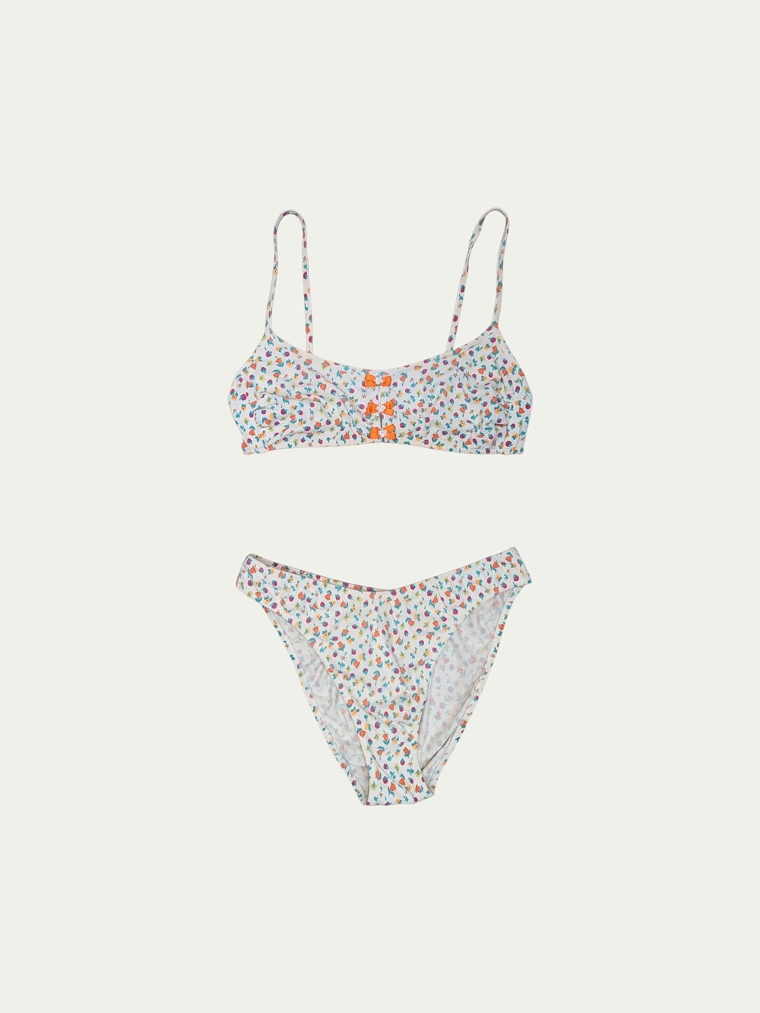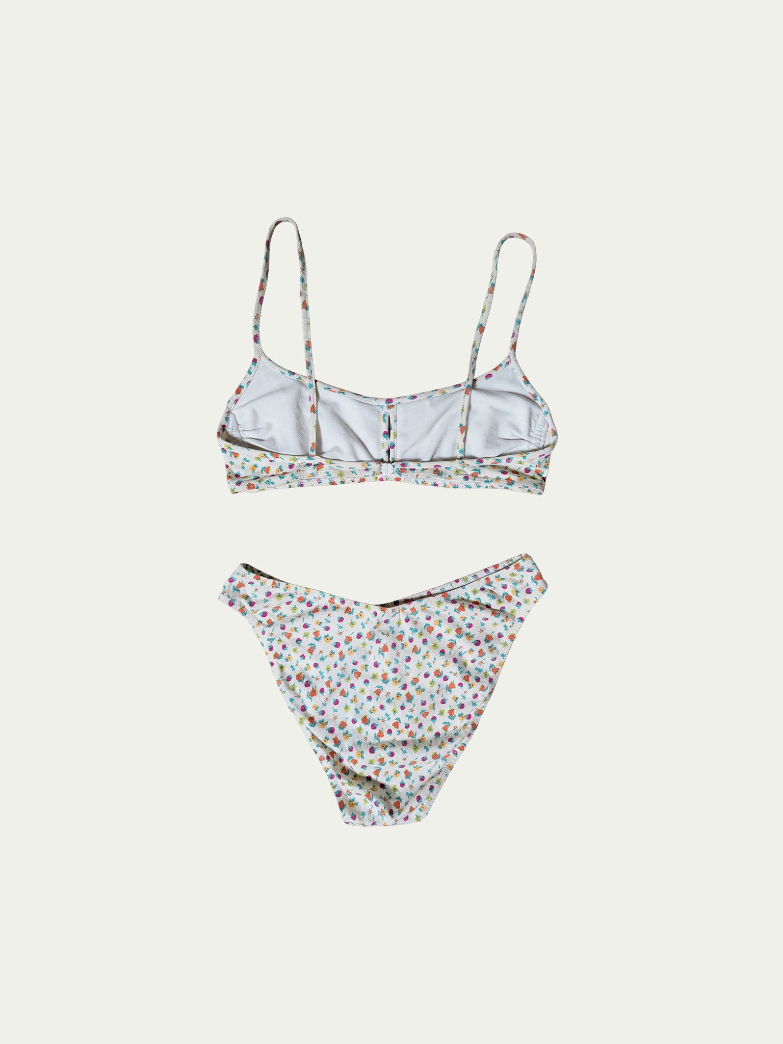 Early 90s bikini made mostly of cotton, featuring a cute print of tiny strawberries and flowers on a creamy background. High-waisted bottom with a comfortable fit. The bra includes two side bones and a back plastic closure.