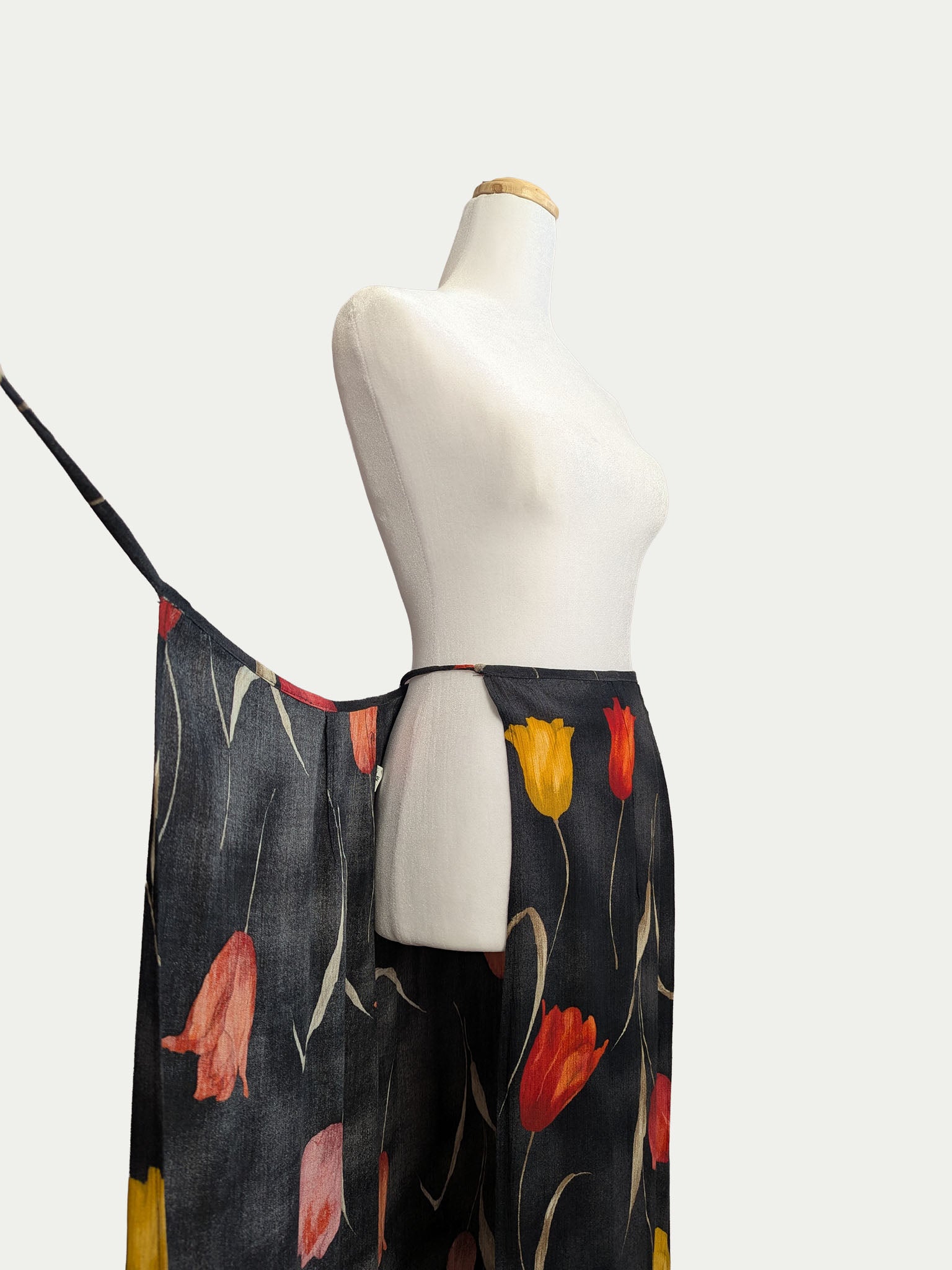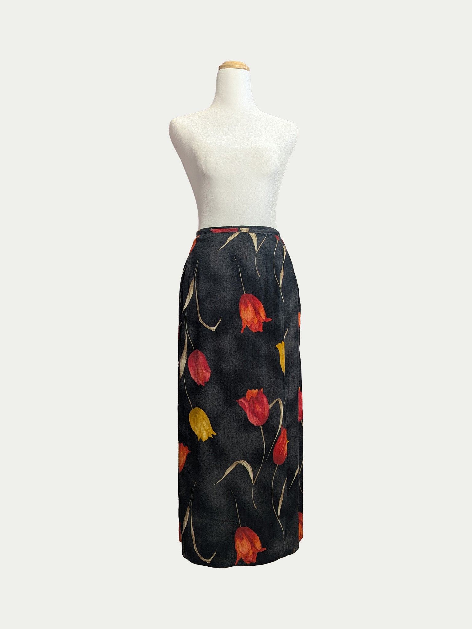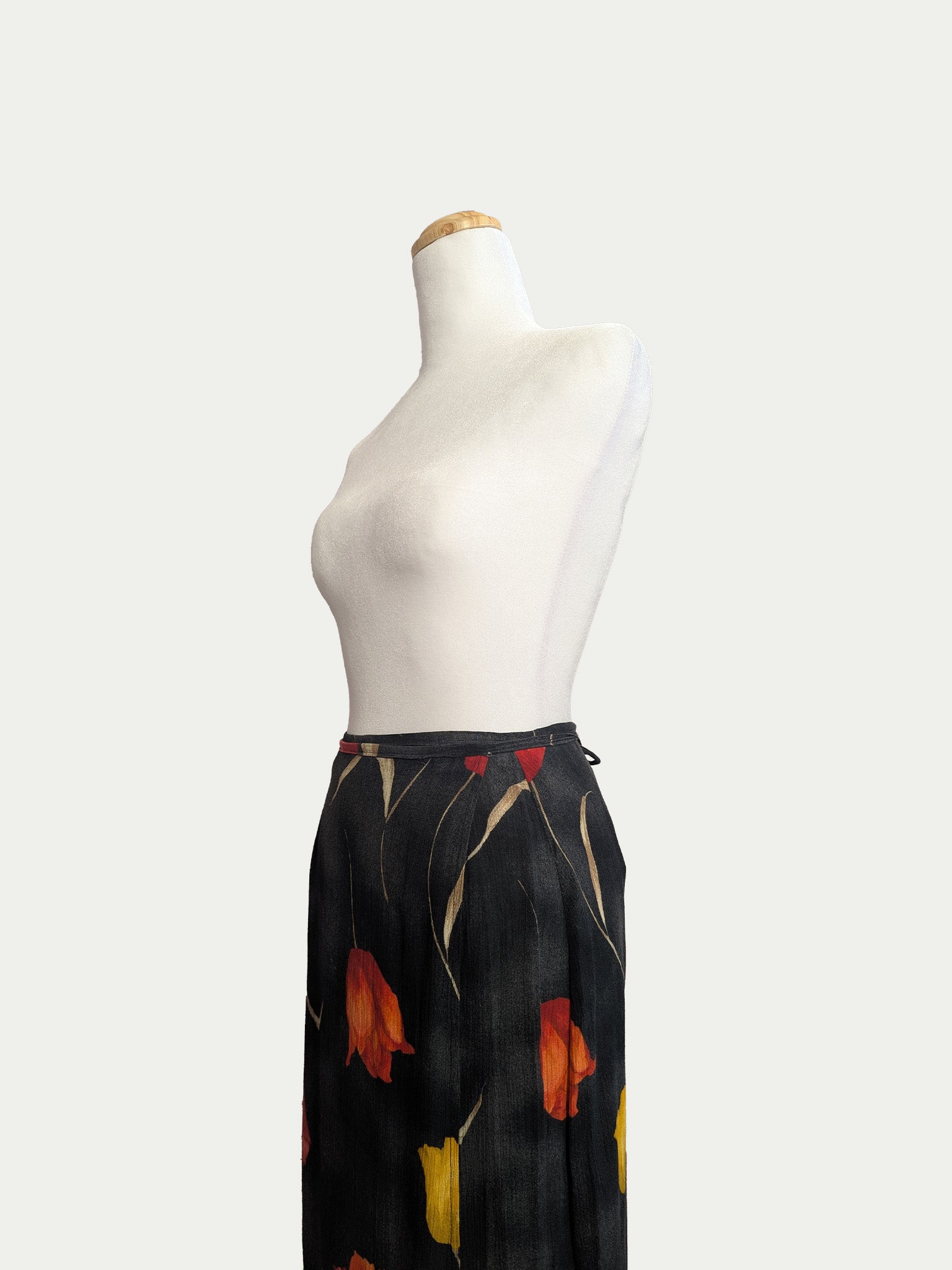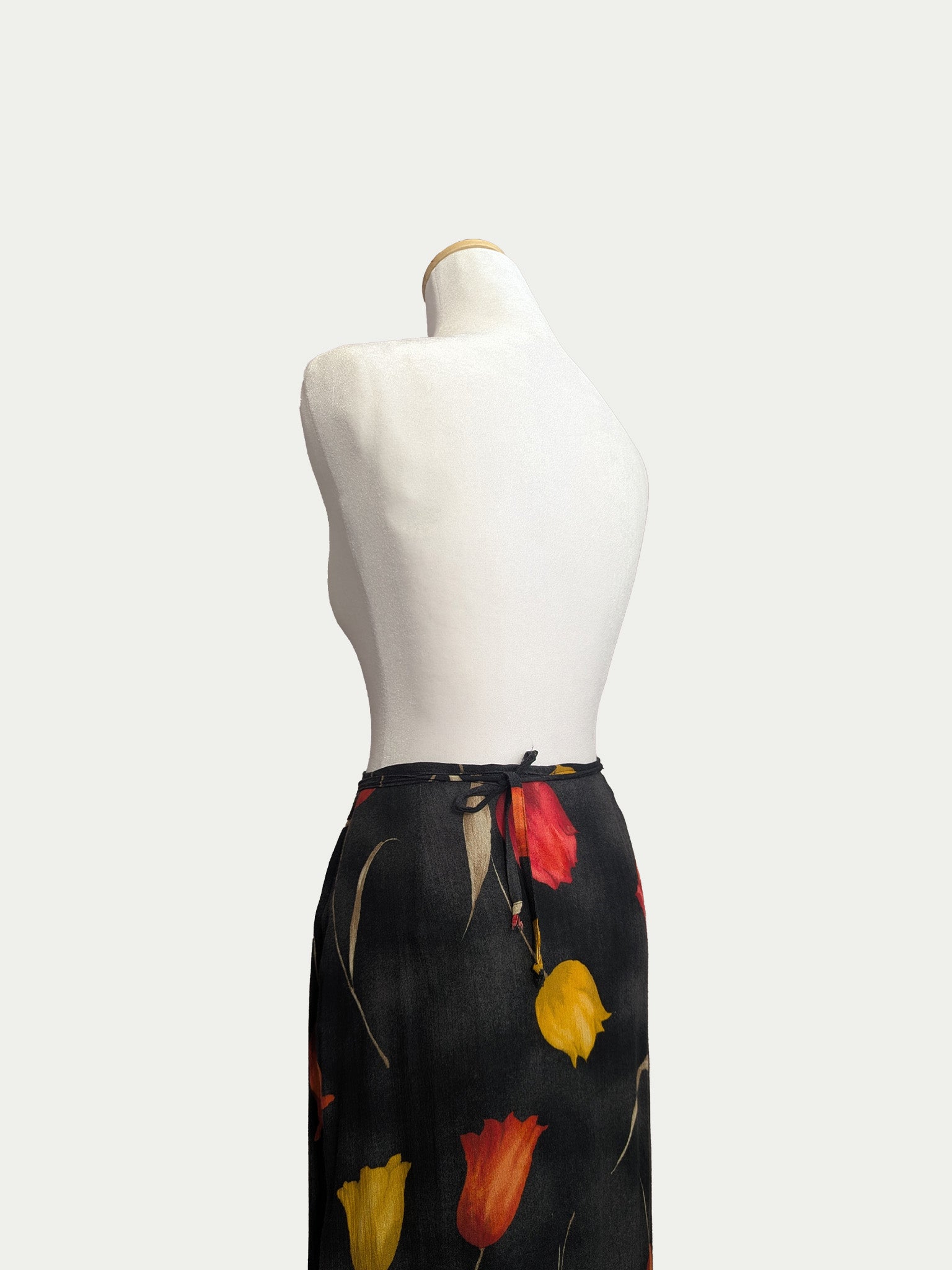 90s maxi wrap skirt made of soft, slightly crinkled viscose with a unique tulip print. Features a lacing wrap closure without eyelet holes for a clean finish.